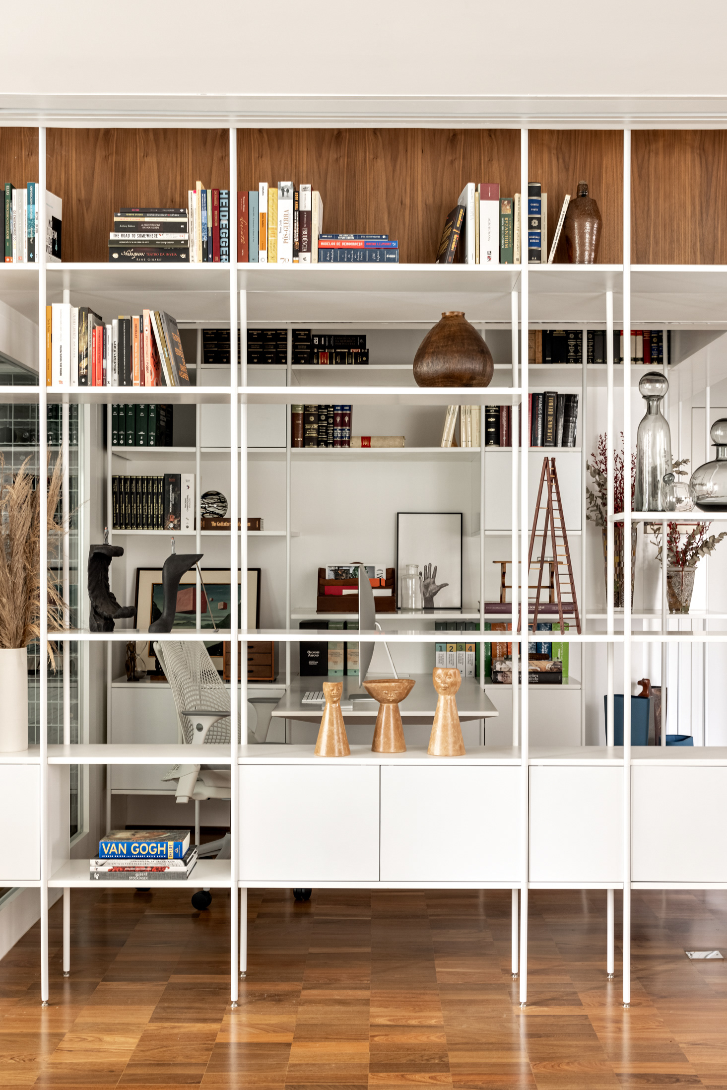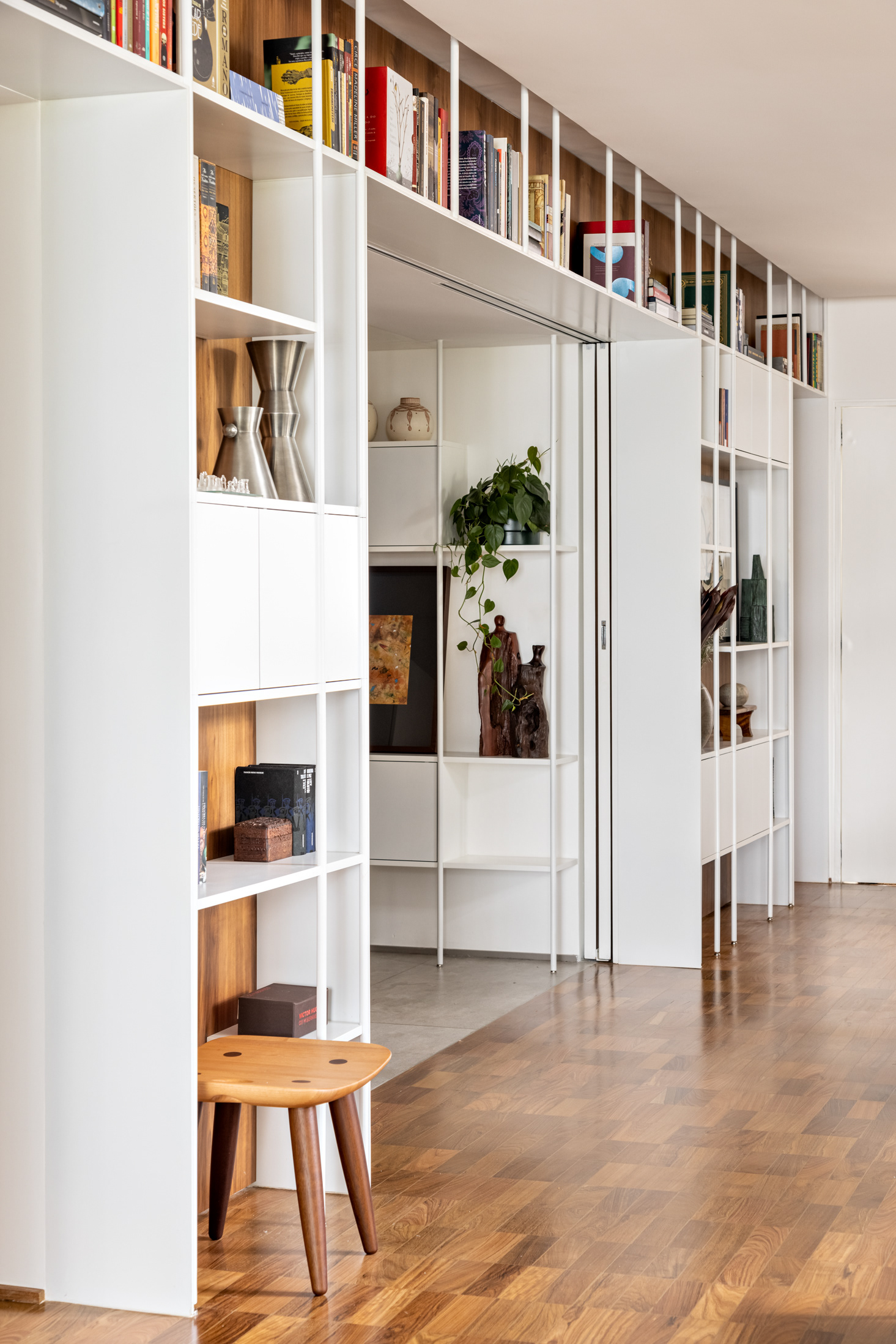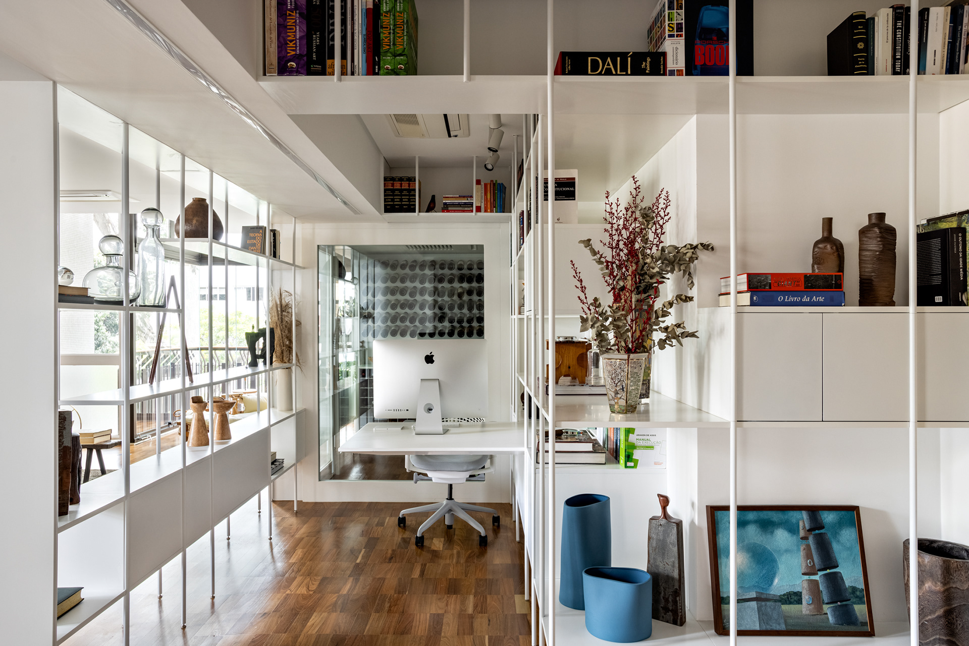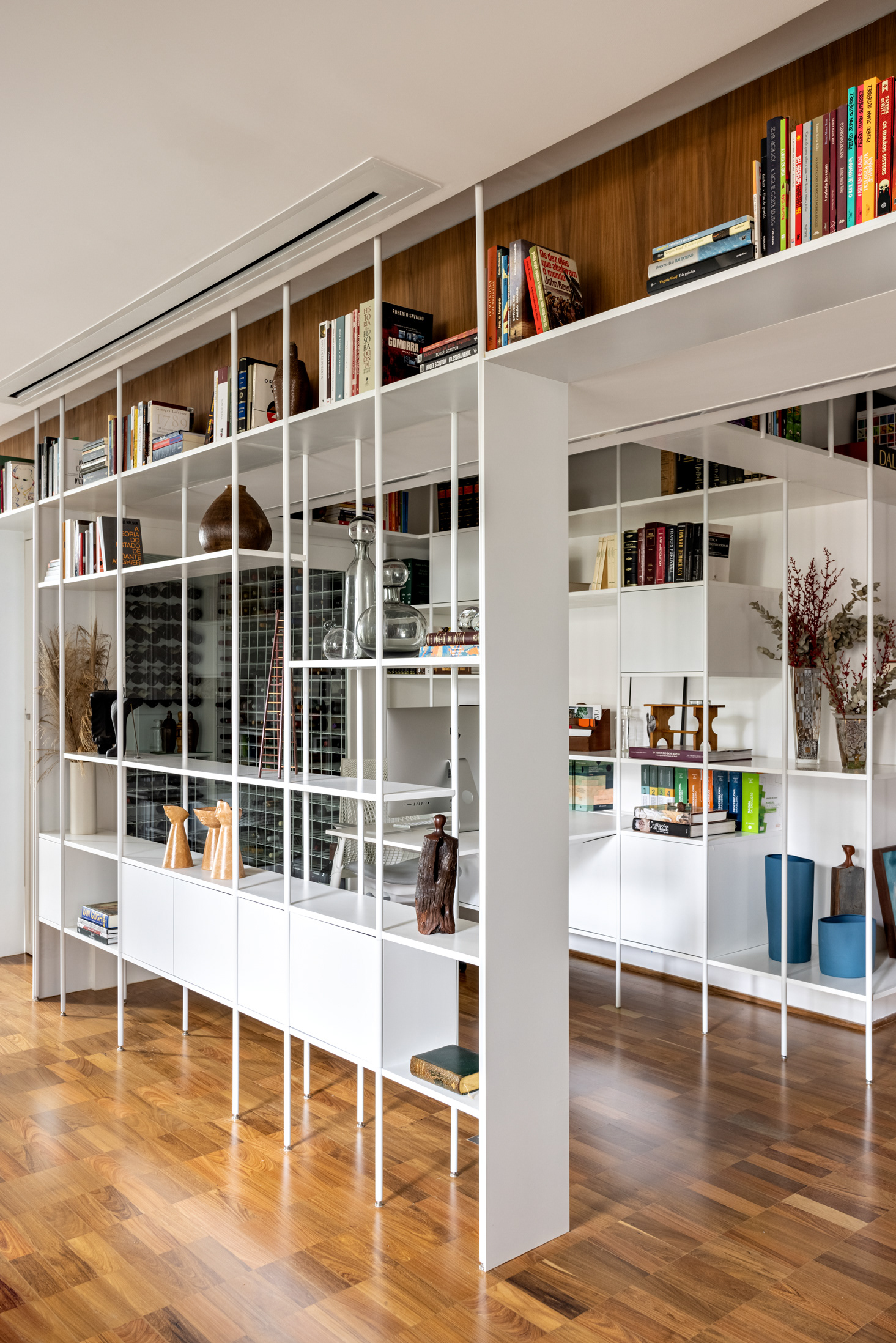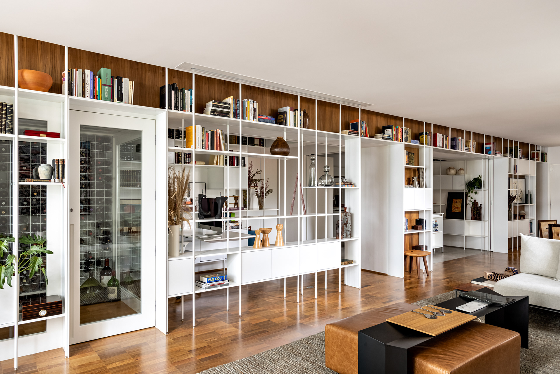 Connecting all these spaces (living room, guest bathroom, kitchen, office, and wine cellar), a large open metal bookshelf accompanies the living room from one side to the other and serves as a support for objects, plants, and books. It houses the sliding doors, opens spaces from time to time for paintings and sculptures, and accommodates the screen and equipment for movie nights. The bookshelf is the most striking element in this space and dialogues with the other furniture and various items of the project.