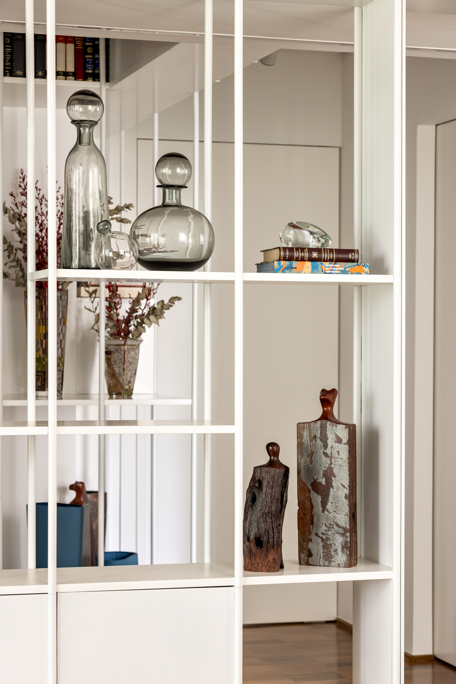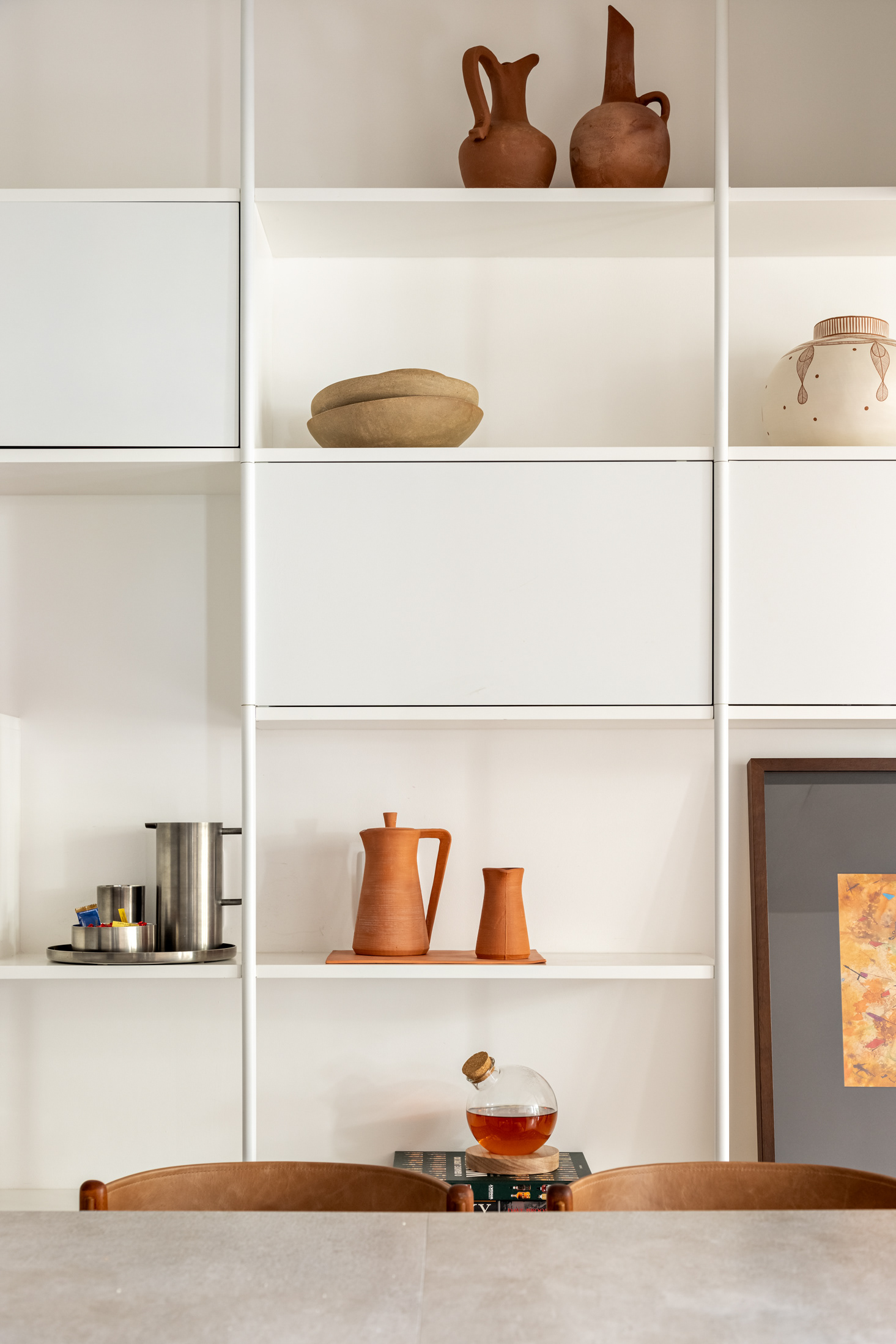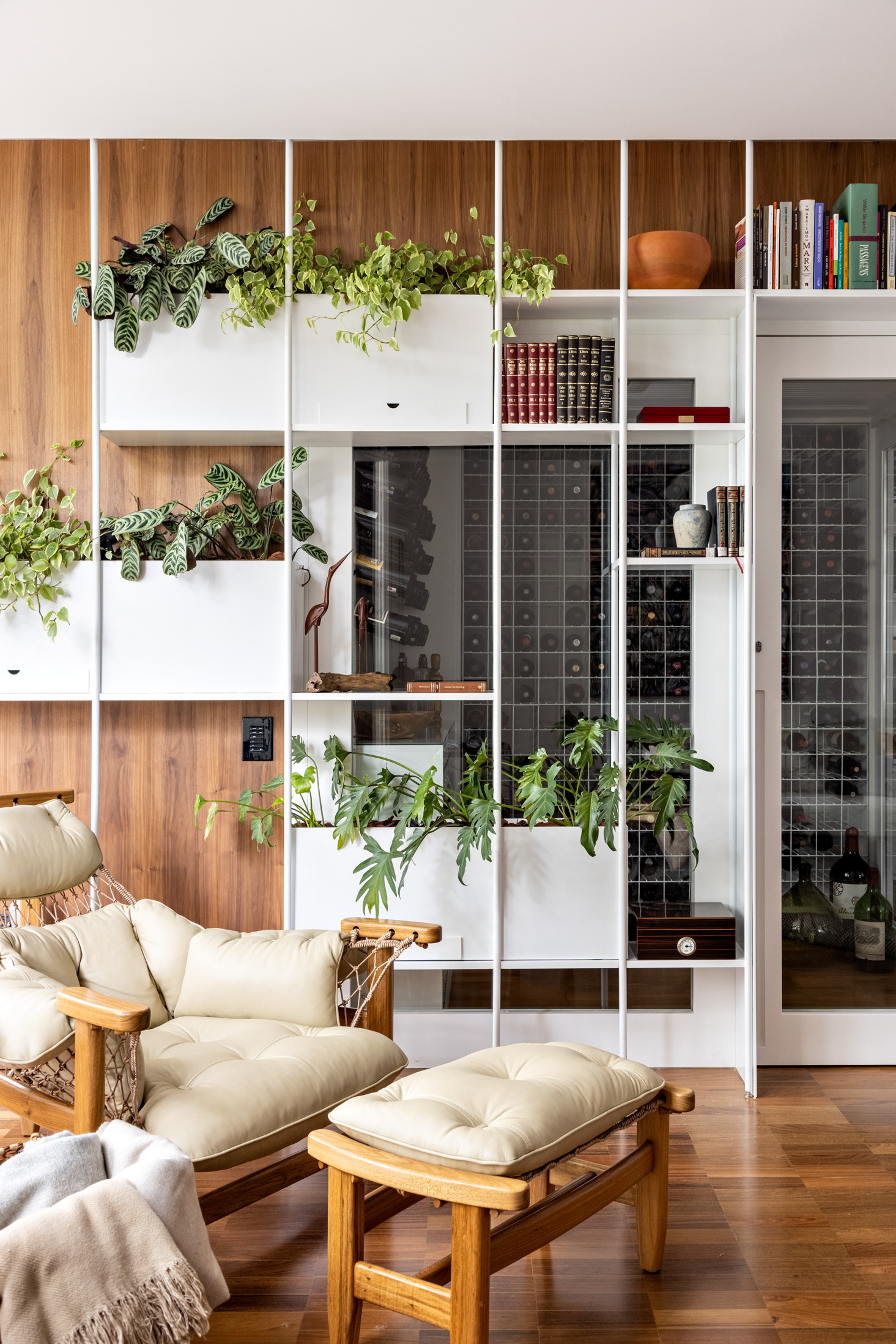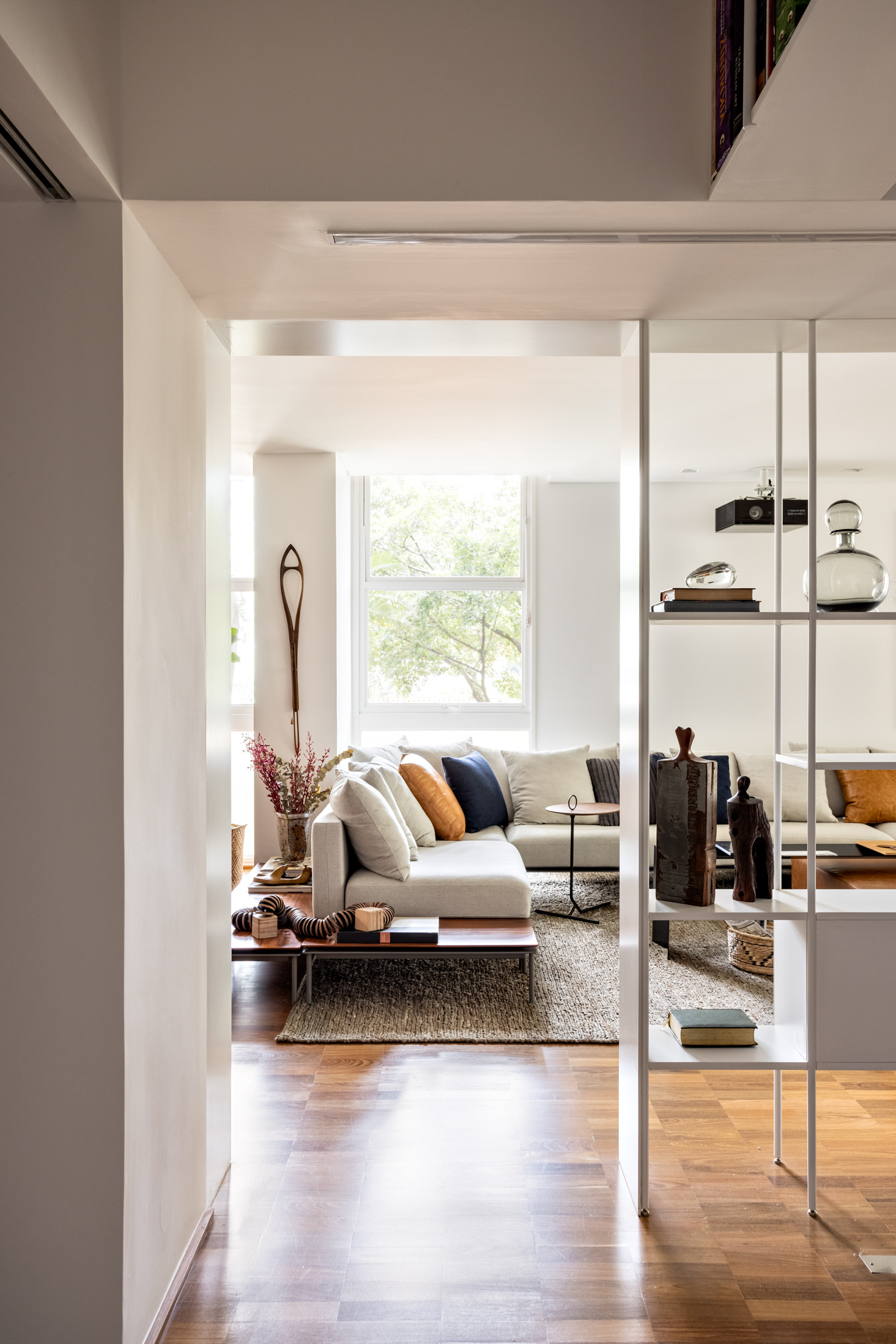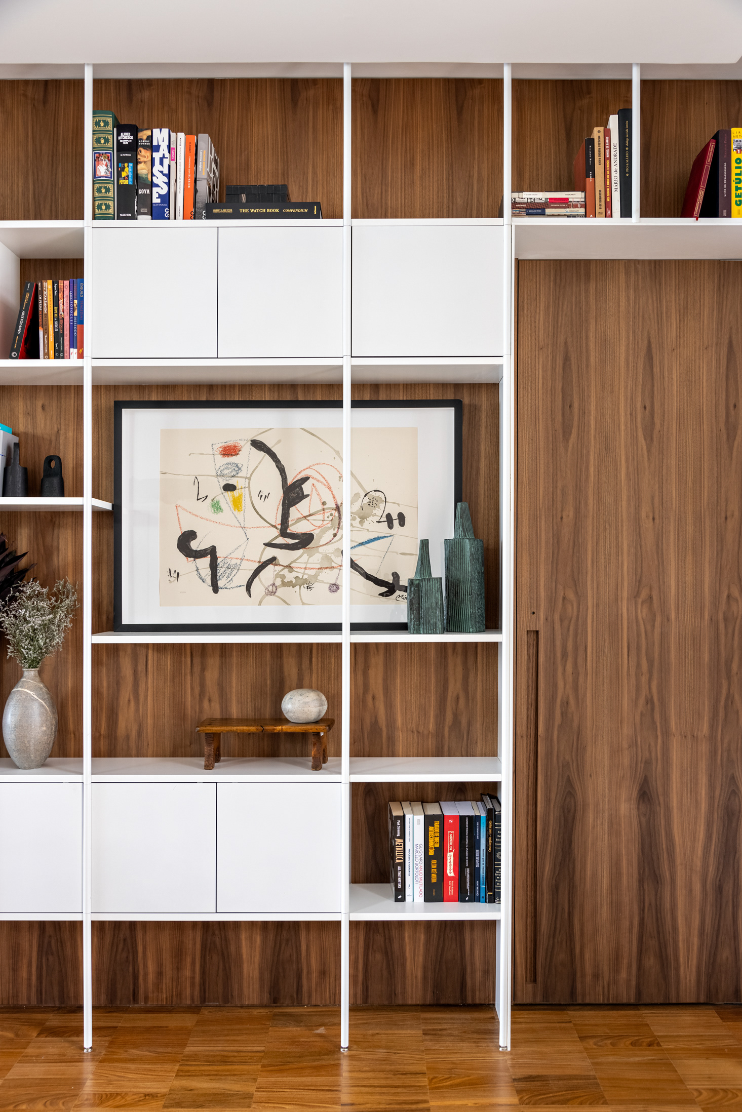 Connecting all these spaces (living room, guest bathroom, kitchen, office, and wine cellar), a large open metal bookshelf accompanies the living room from one side to the other and serves as a support for objects, plants, and books. It houses the sliding doors, opens spaces from time to time for paintings and sculptures, and accommodates the screen and equipment for movie nights. The bookshelf is the most striking element in this space and dialogues with the other furniture and various items of the project.