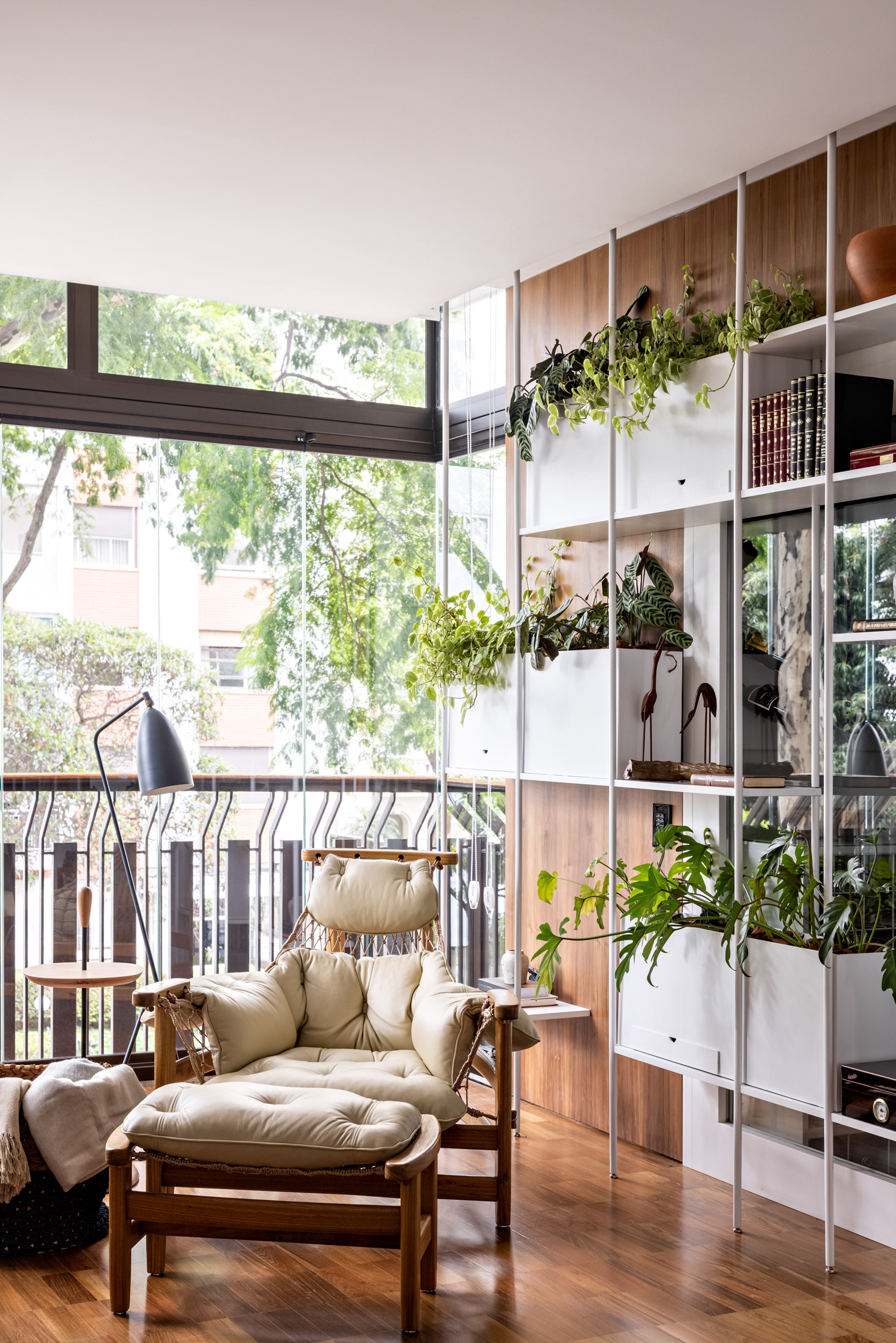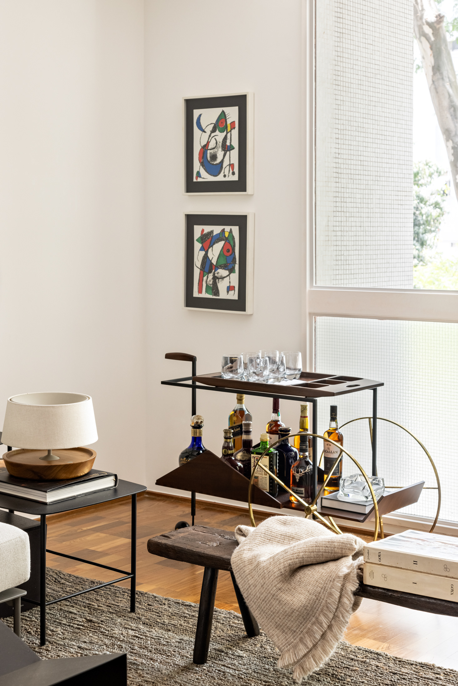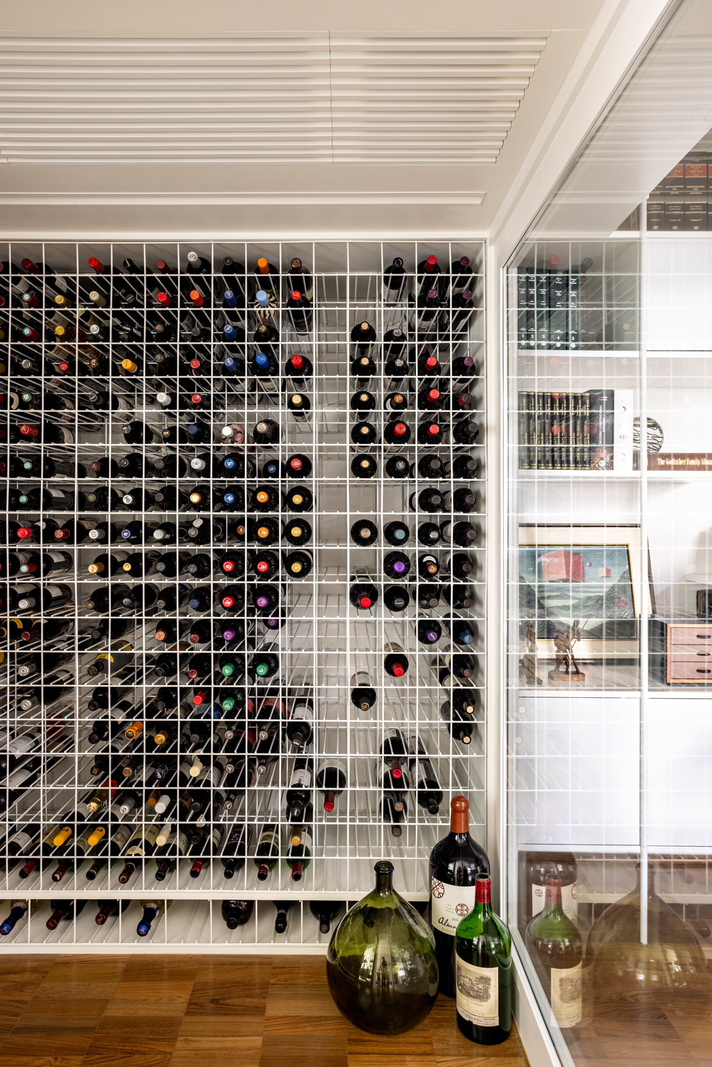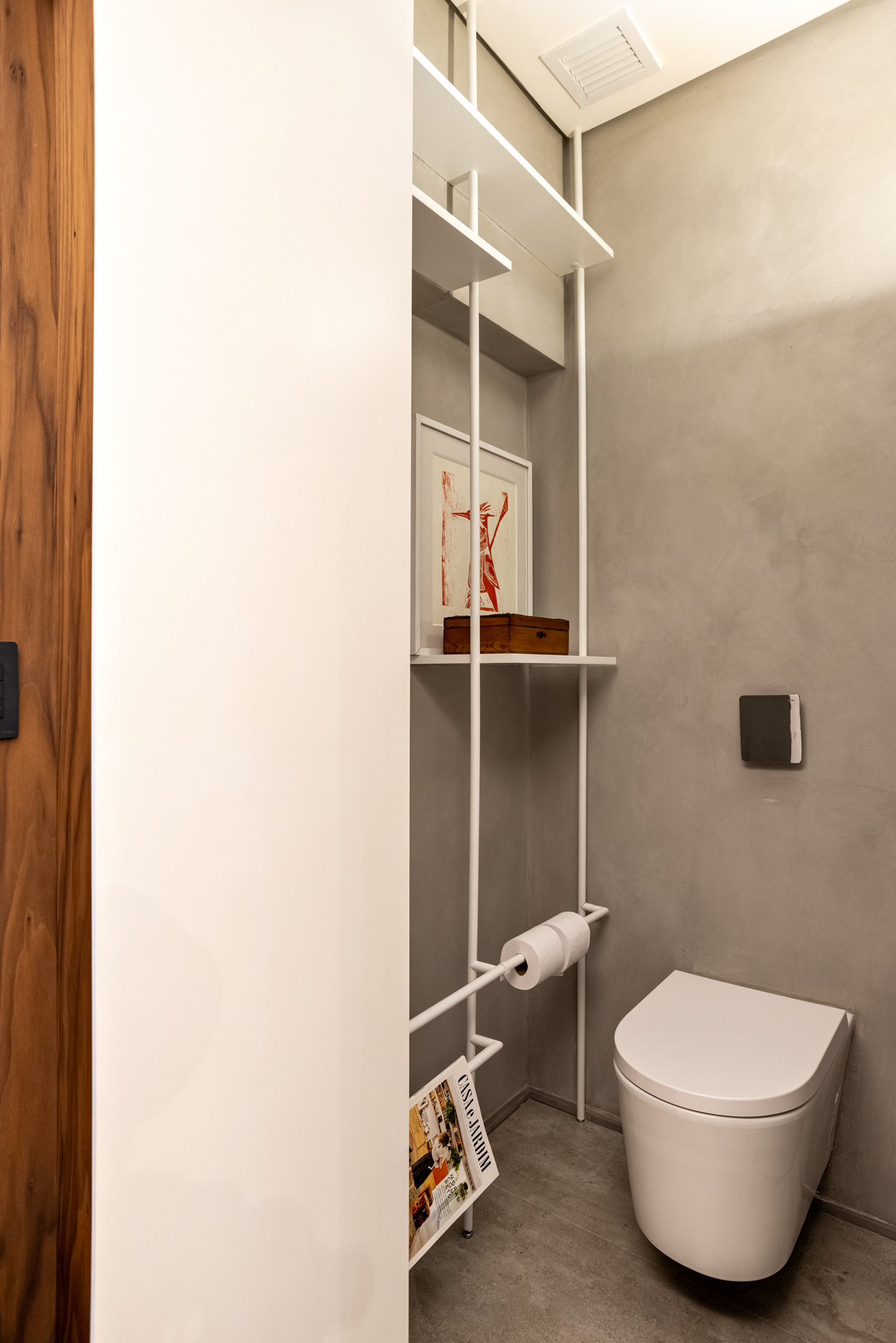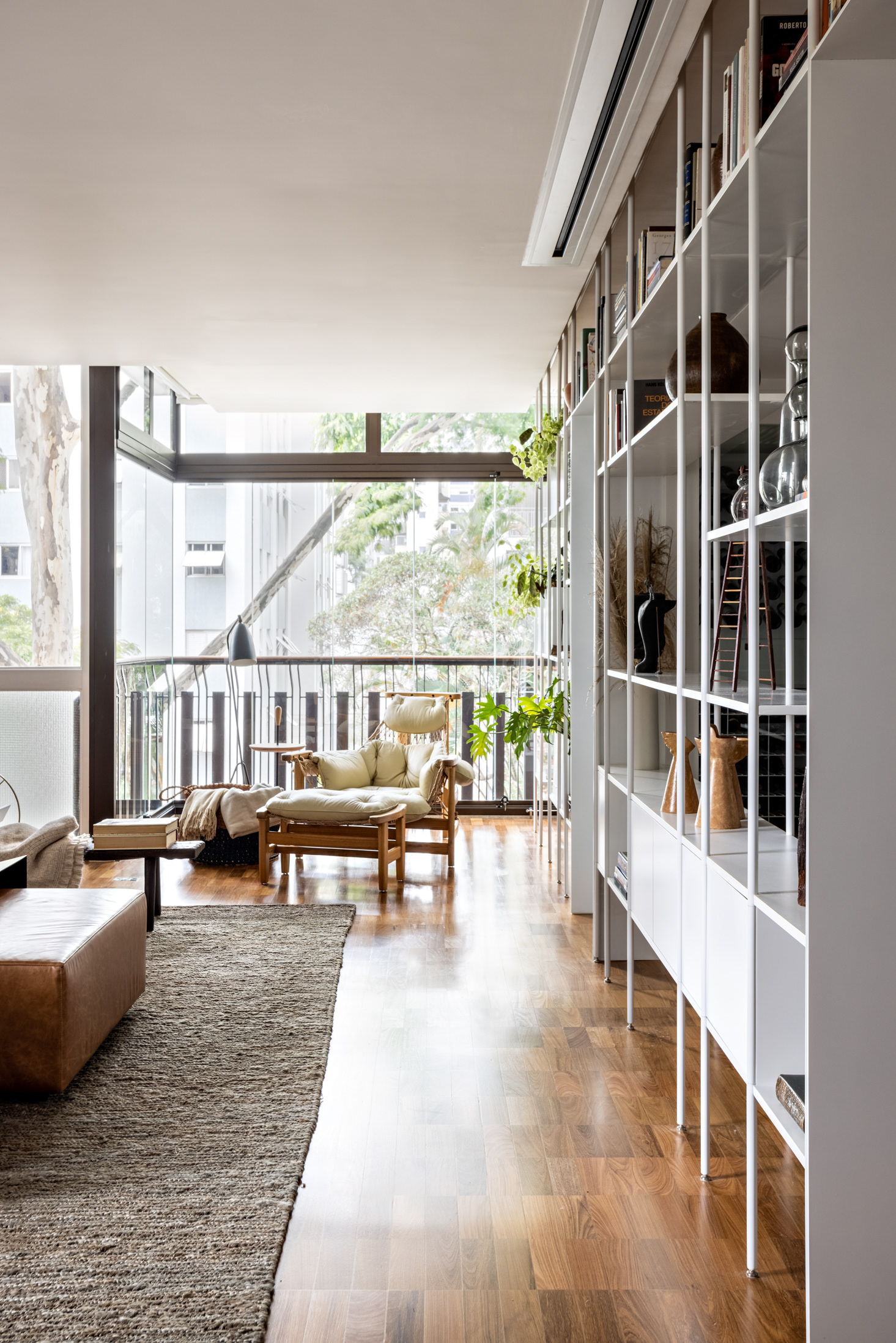 Connecting all these spaces (living room, guest bathroom, kitchen, office, and wine cellar), a large open metal bookshelf accompanies the living room from one side to the other and serves as a support for objects, plants, and books. It houses the sliding doors, opens spaces from time to time for paintings and sculptures, and accommodates the screen and equipment for movie nights. The bookshelf is the most striking element in this space and dialogues with the other furniture and various items of the project.