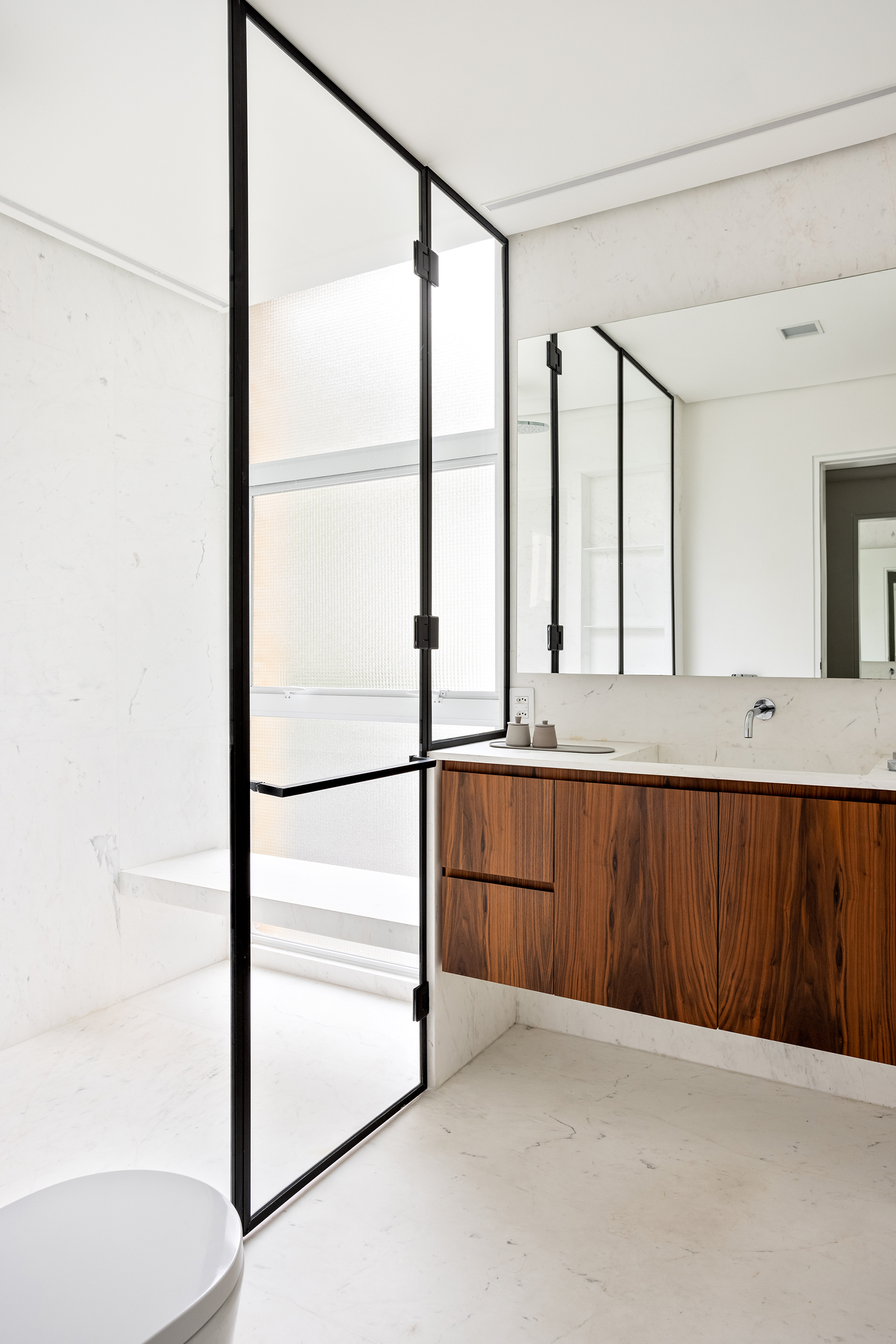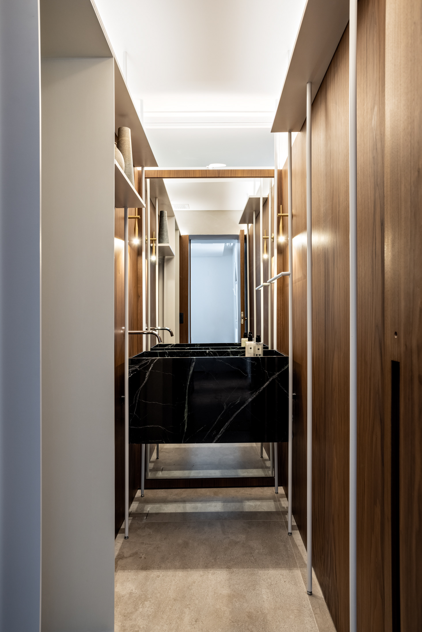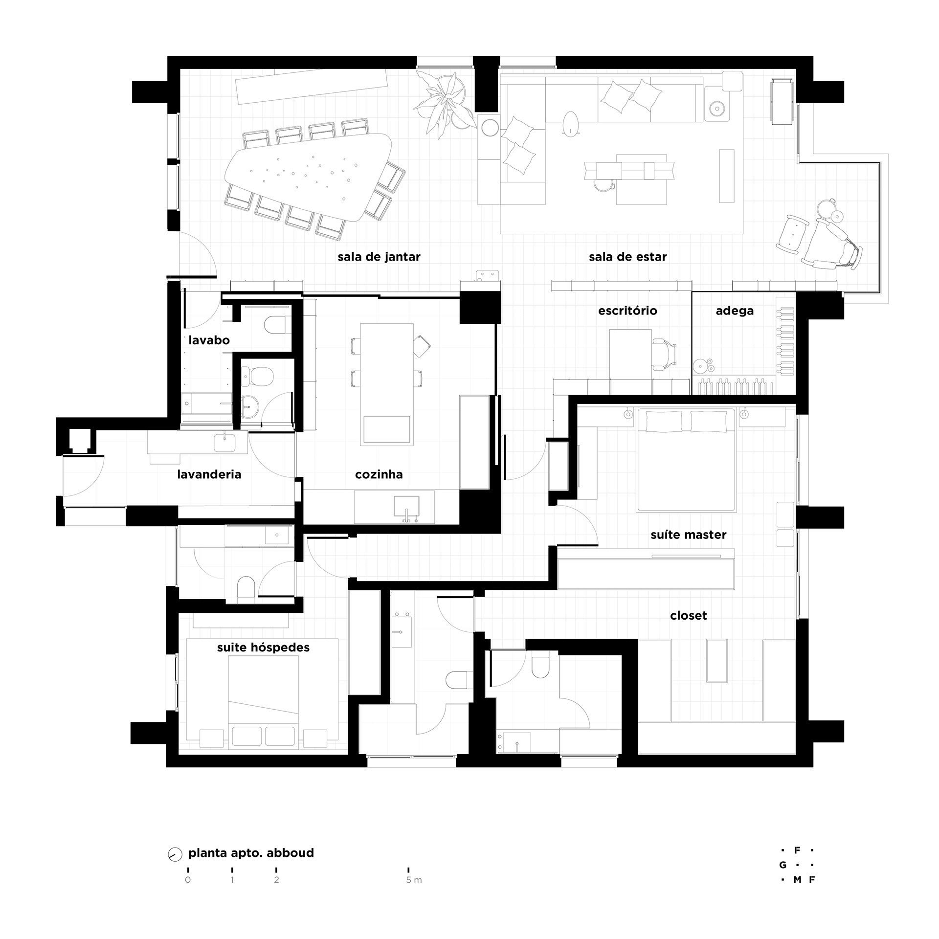 The changes to the floor plan were important. The living room and kitchen were combined through large openings (which can be controlled through sliding doors), as well as part of the first bedroom joining the living room, providing space for an office and a large wine cellar in this multi-functional space. These changes in the social area of the apartment not only contribute to the new functions that are presented but also subvert the original linearity of the living room, creating more fluid and rich spaces.