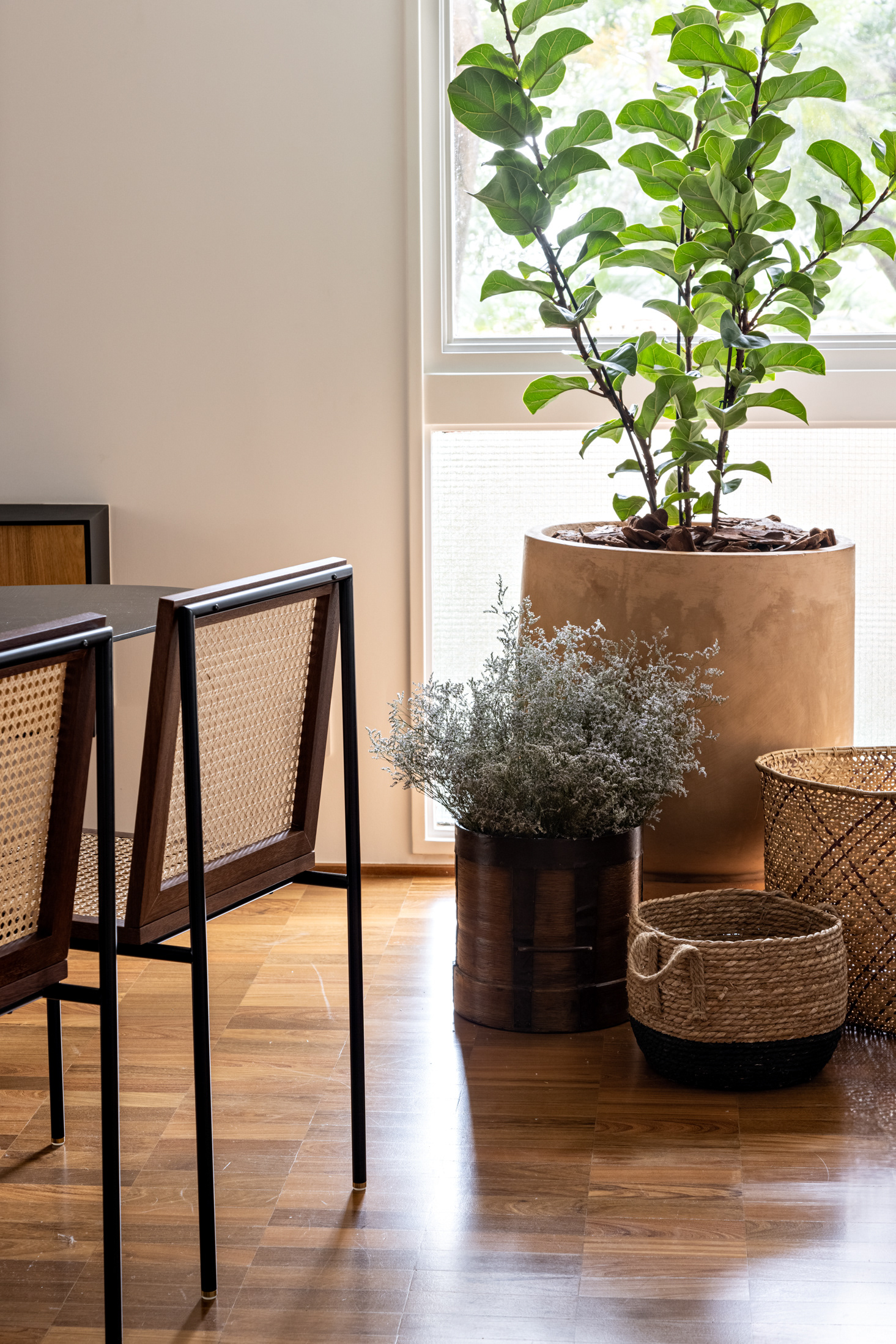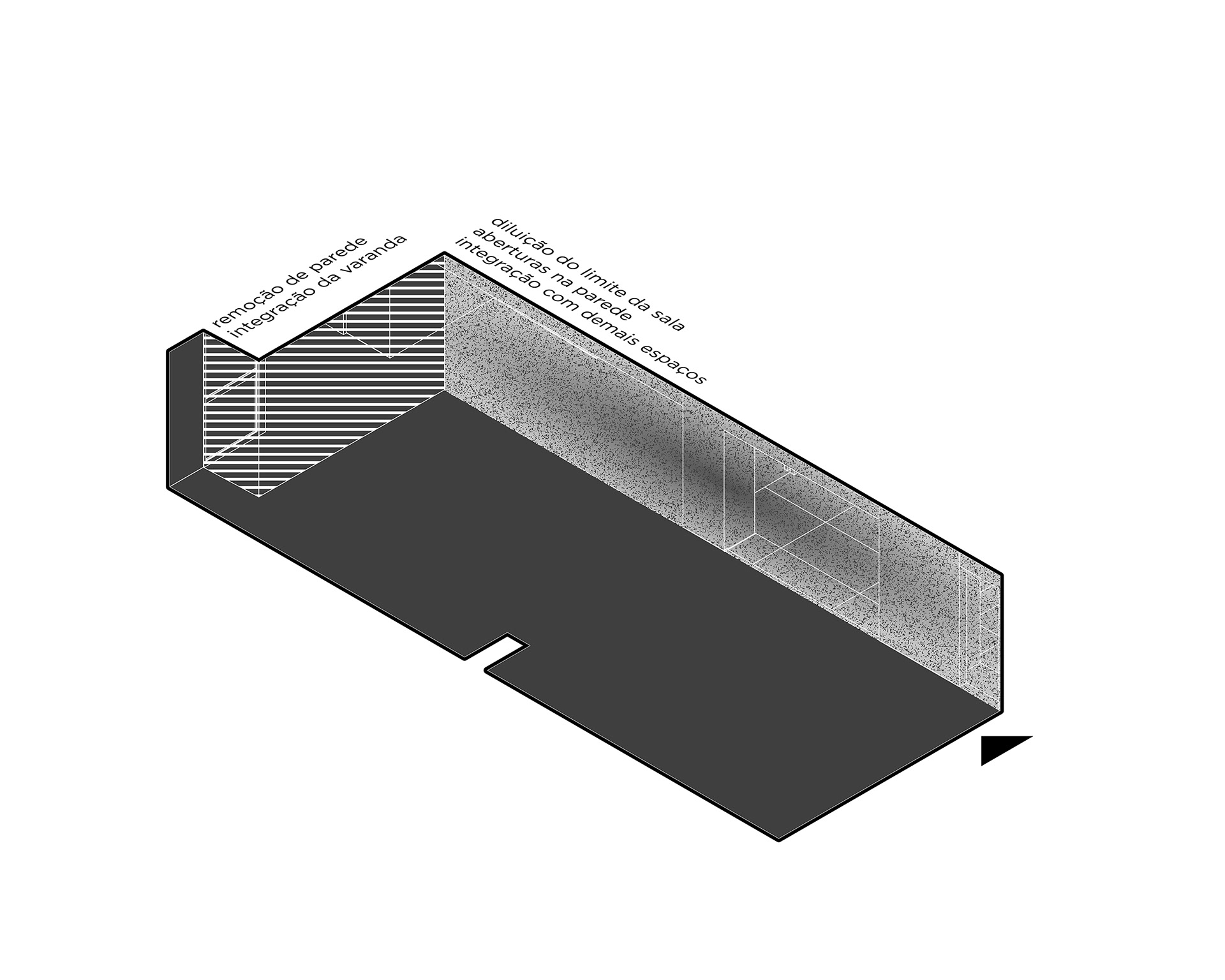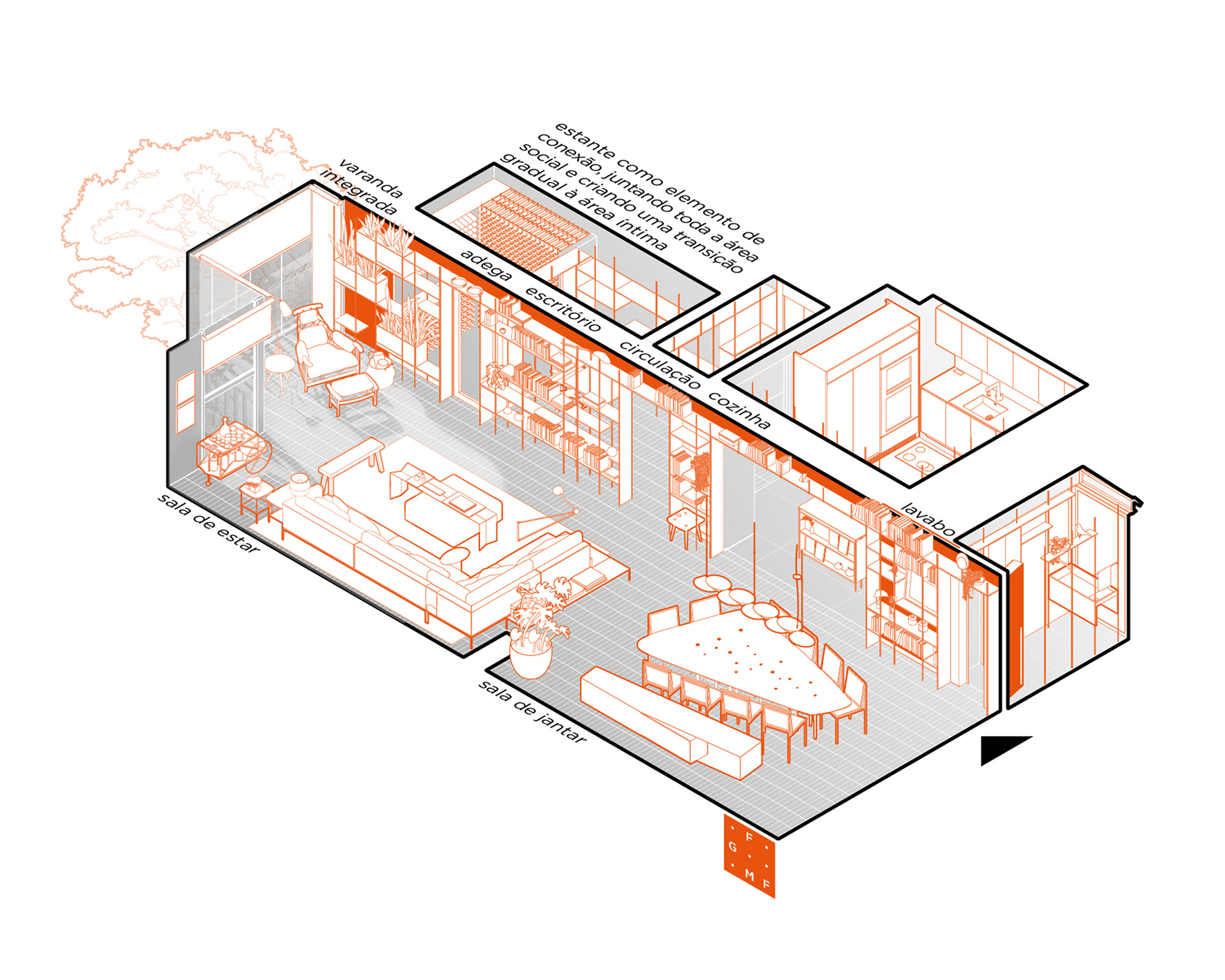 The changes to the floor plan were important. The living room and kitchen were combined through large openings (which can be controlled through sliding doors), as well as part of the first bedroom joining the living room, providing space for an office and a large wine cellar in this multi-functional space. These changes in the social area of the apartment not only contribute to the new functions that are presented but also subvert the original linearity of the living room, creating more fluid and rich spaces.