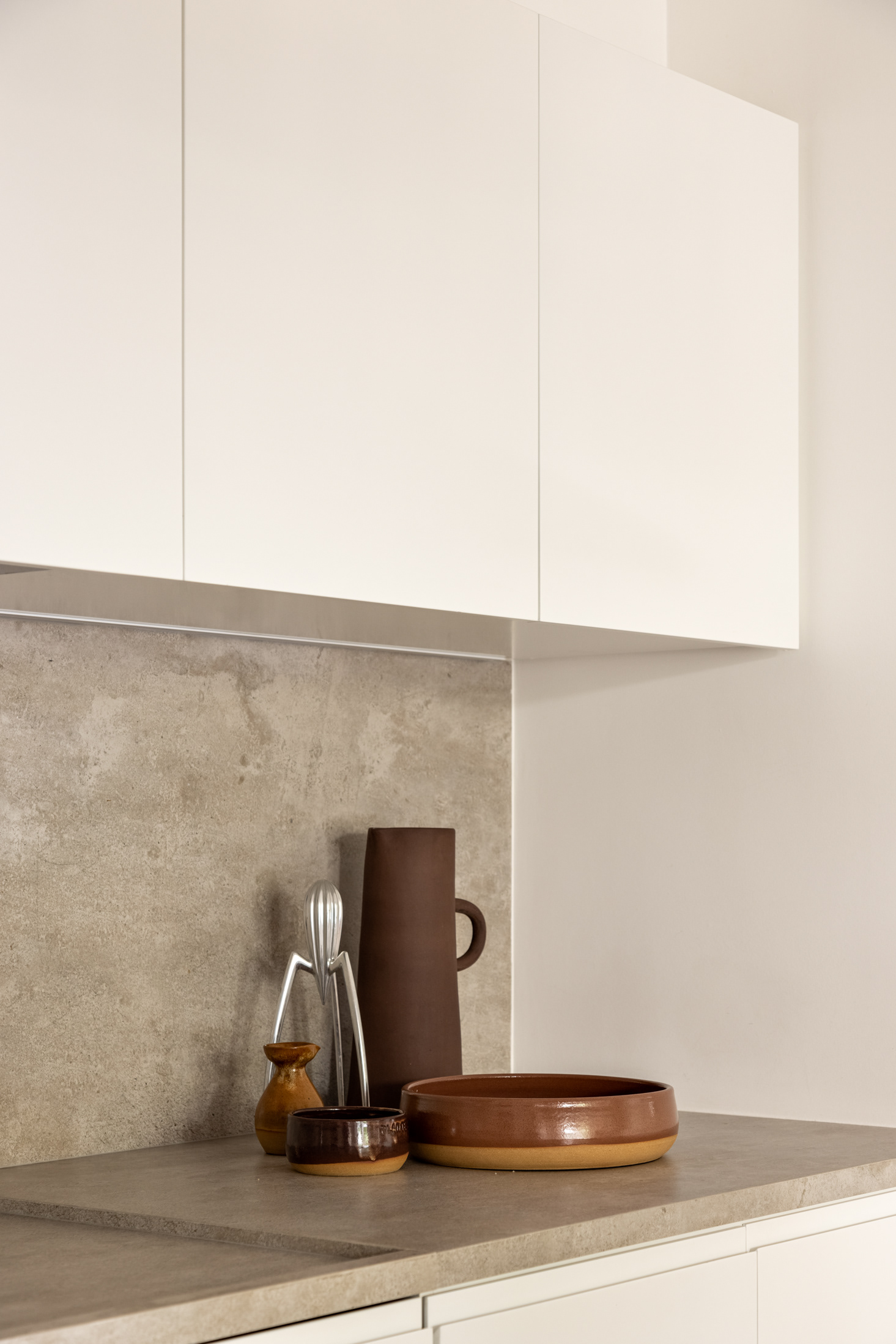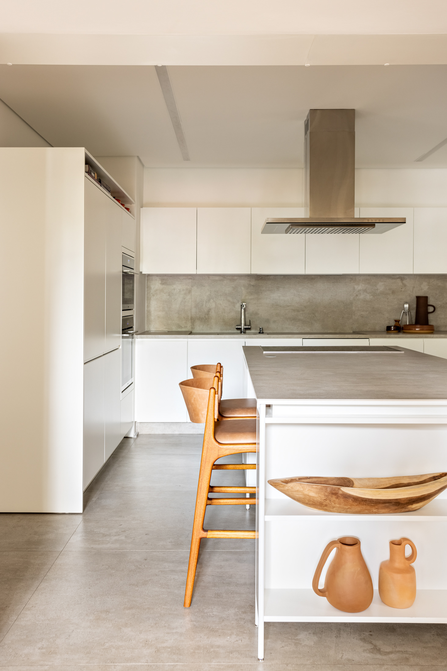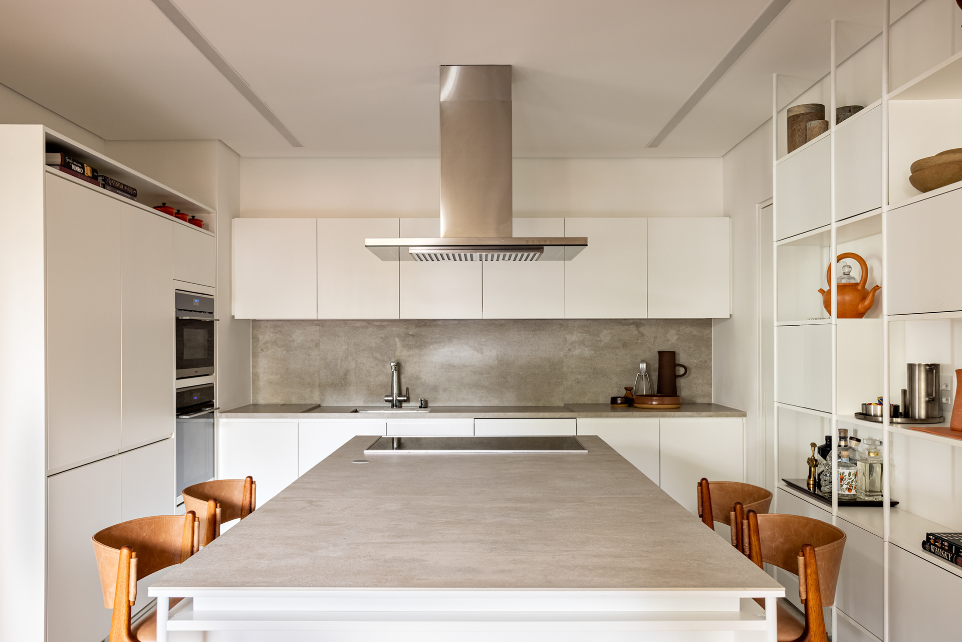 The kitchen, complete with equipment and with an island in the center, is quite neutral to give all the protagonism to the living room, the bookshelf, and the large wine cellar, the owner's desire since the beginning of the project.