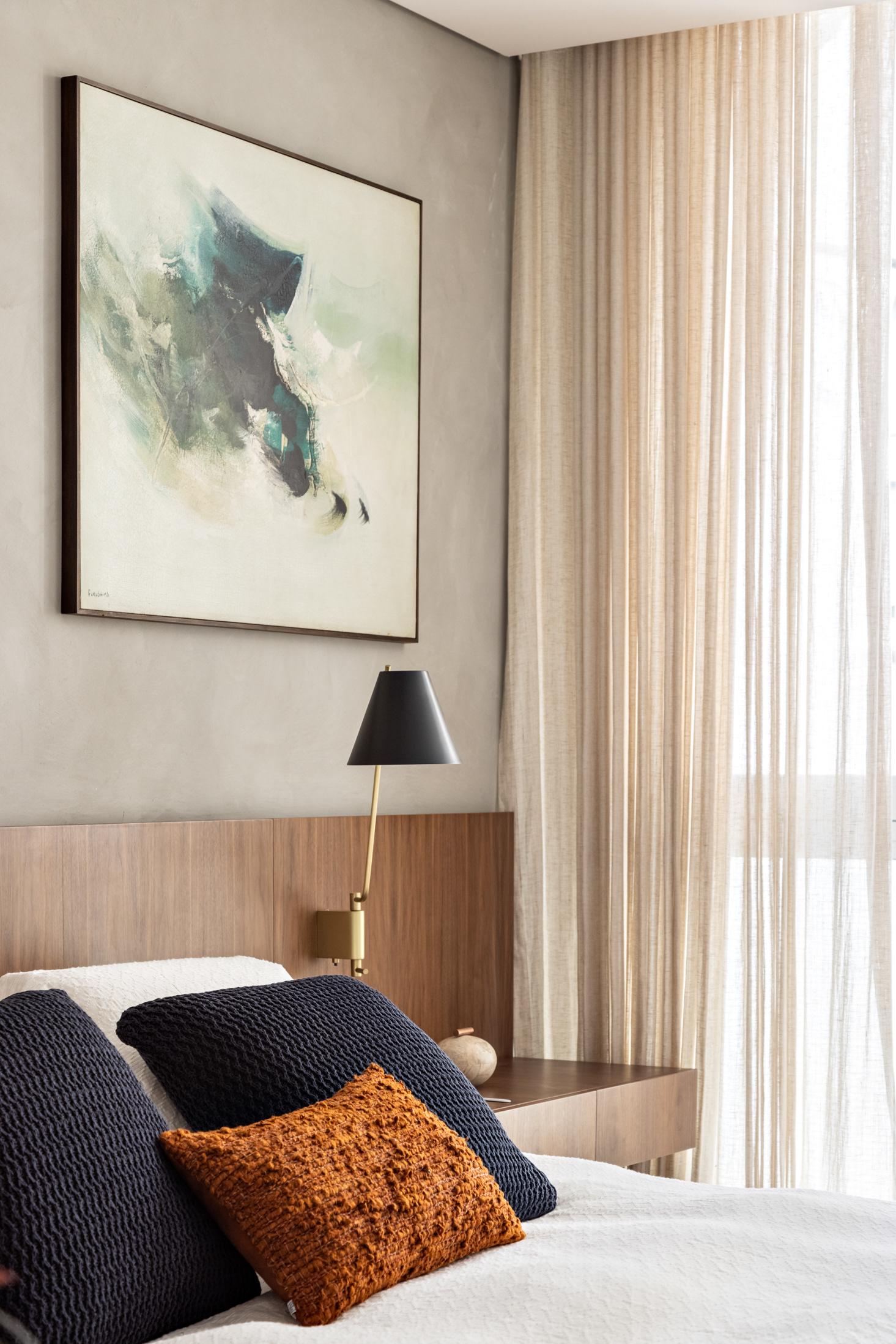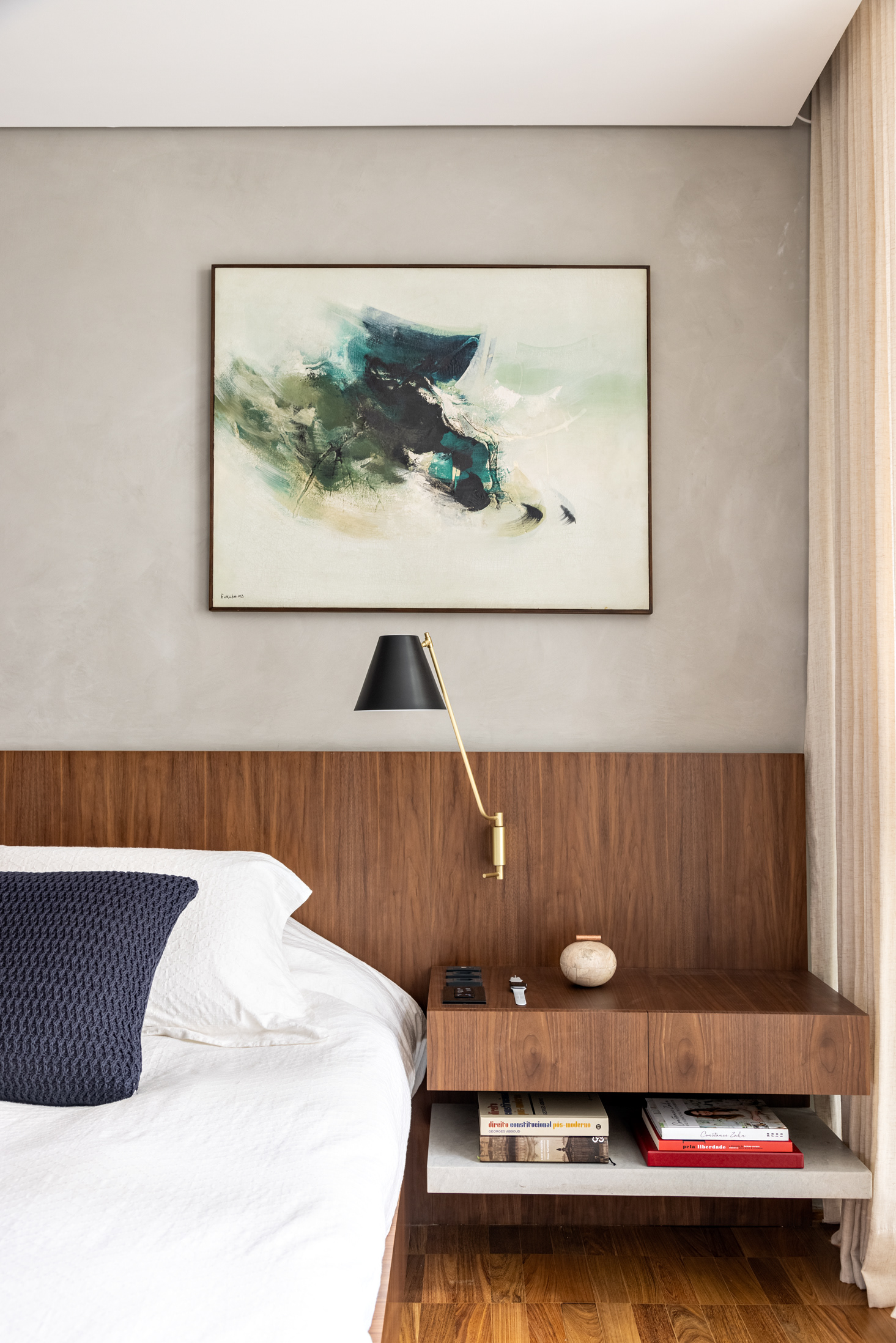 The private area also changed, and two bedrooms were joined to form a large space for the couple. This new room has a spacious closet and two bathrooms. Completing the private area, a second bedroom for guests and a future child has a similar language to the rest of the apartment.