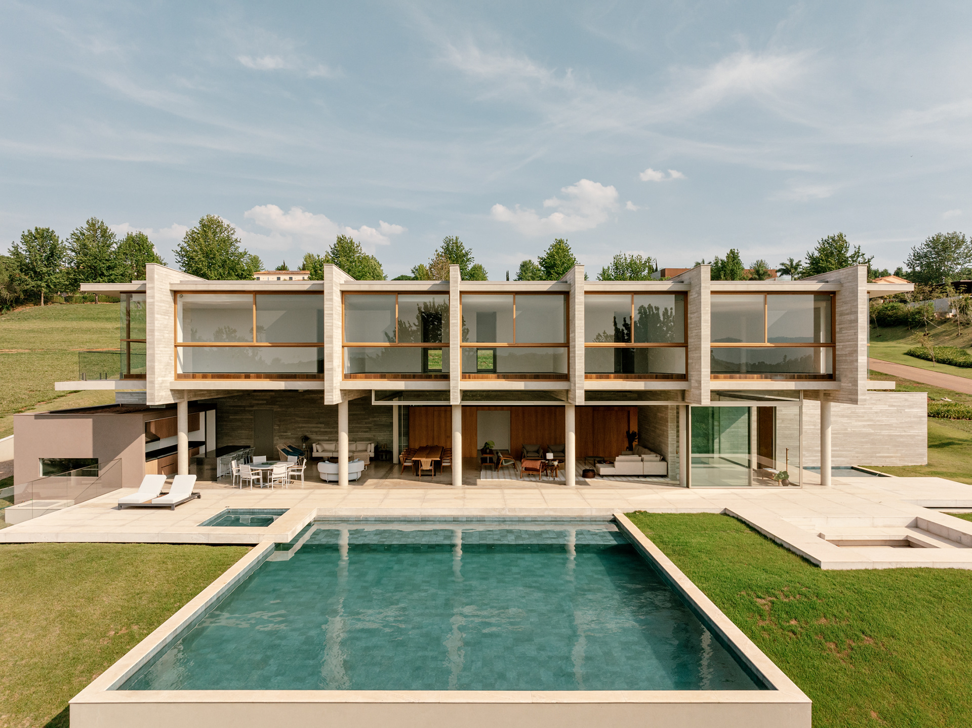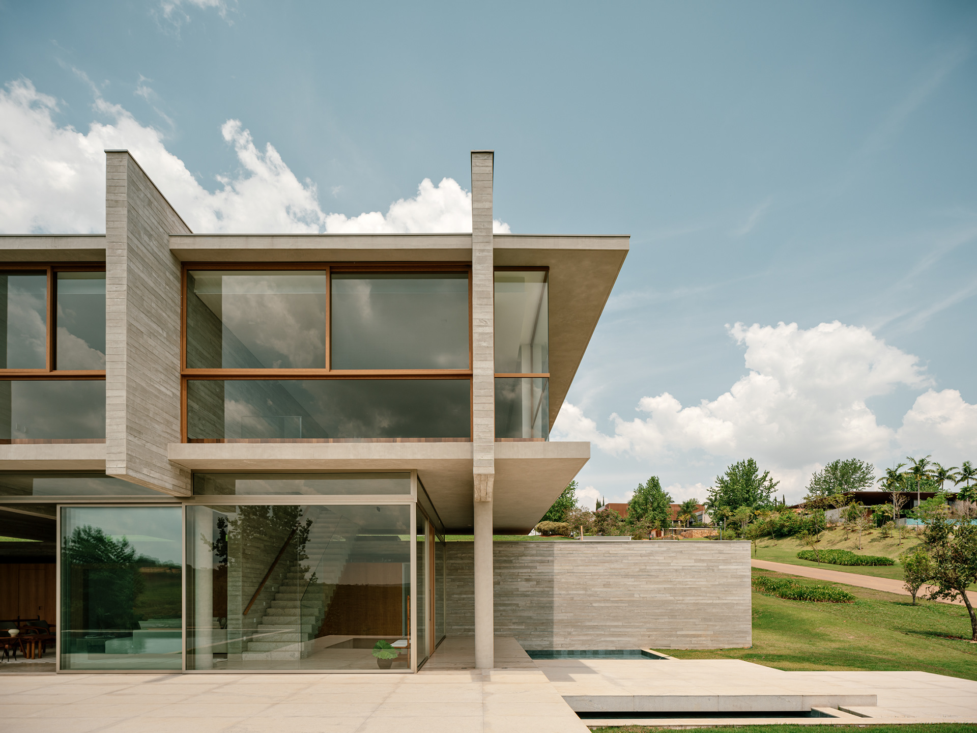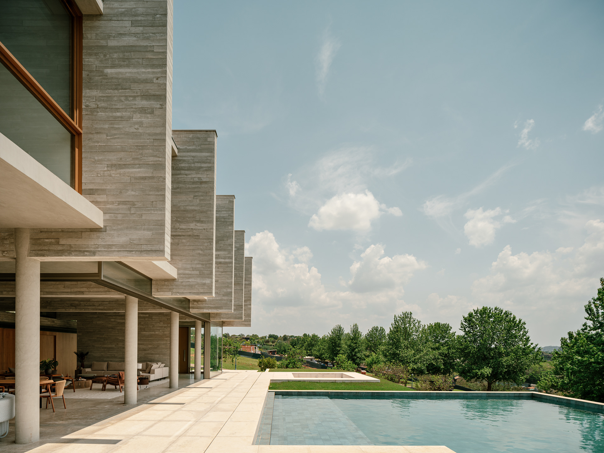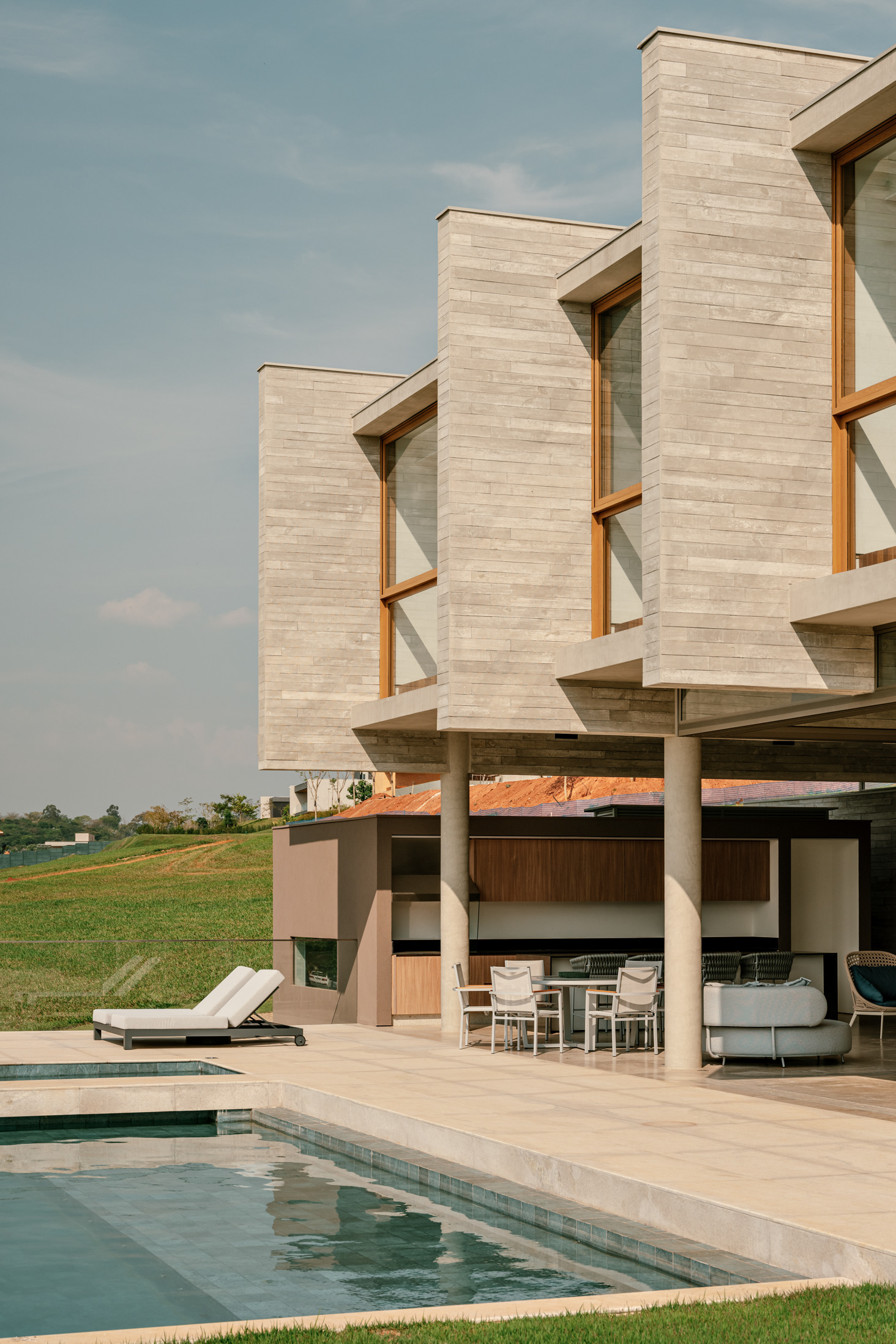 The design concept is quite straightforward and begins with the structural conception. In this project, the structure is the house, composed almost entirely of a layering of columns, beams, and slabs. A sequence of exposed round concrete columns forms porticos with a concrete wall and a series of 4-meter-tall concrete gables that support the upper floor, suspend the floor slab of this level, and separate the home’s main suites. This set of columns and gables is the project’s most prominent element, visible both up close and from afar. It covers the house’s social level, which is enclosed only by sliding glass panels that separate the living room from the verandas. Standing out from the sloped terrain, the external floors are composed of staggered horizontal planes that define the entrance, reflecting pool, verandas, and terraces, while also integrating with the semi-suspended volume of the house’s large pool.