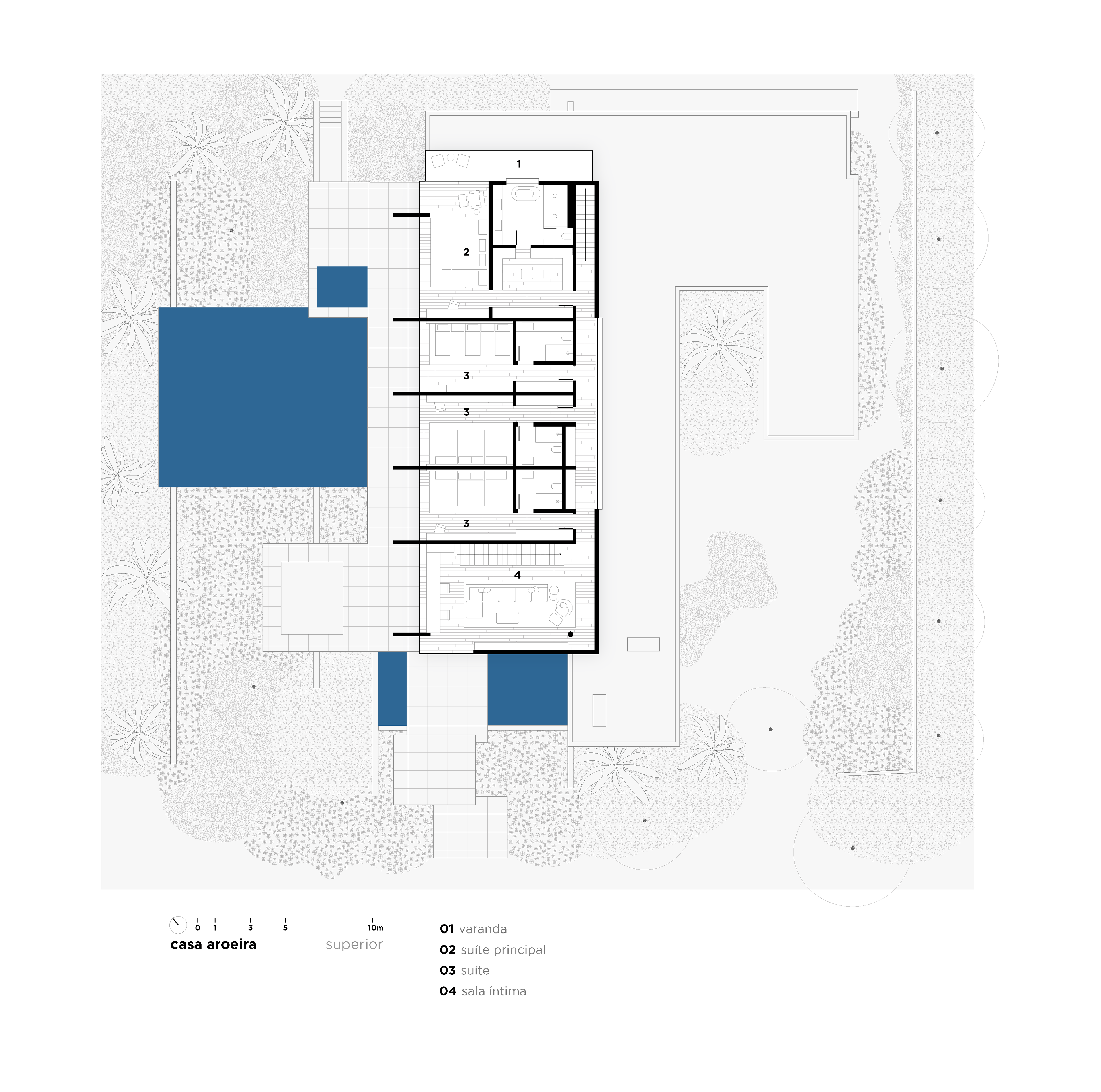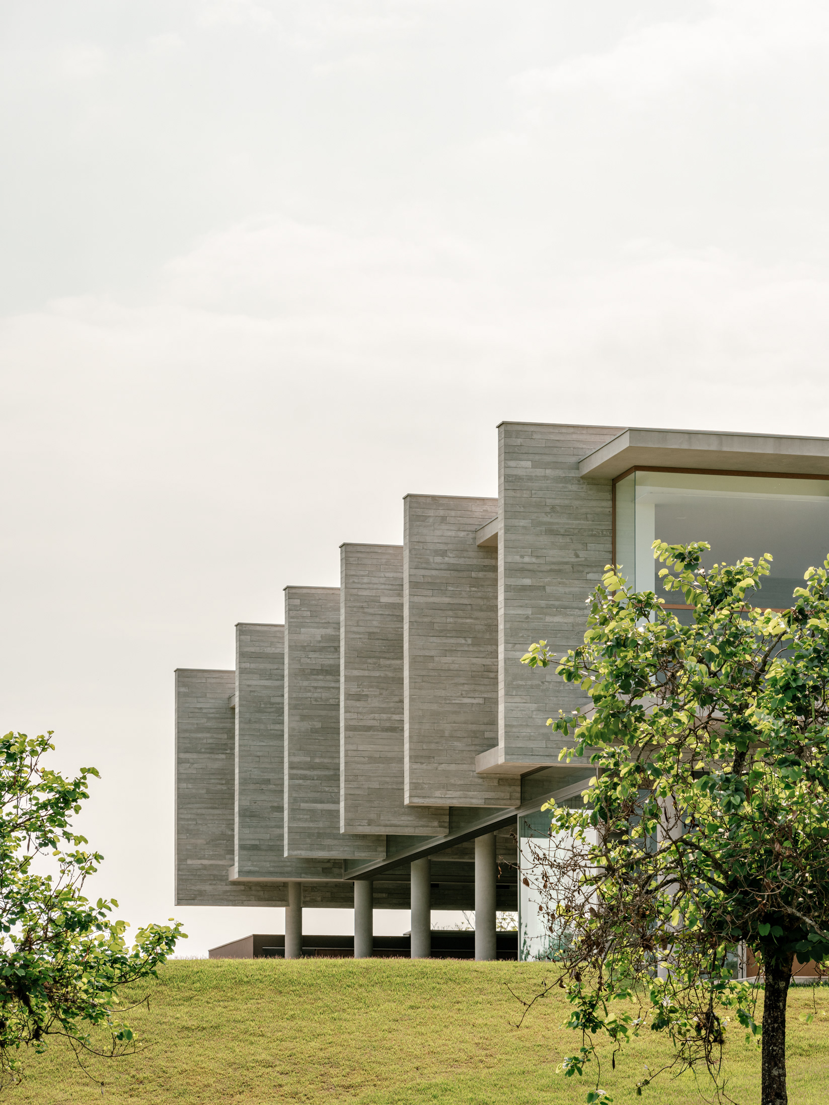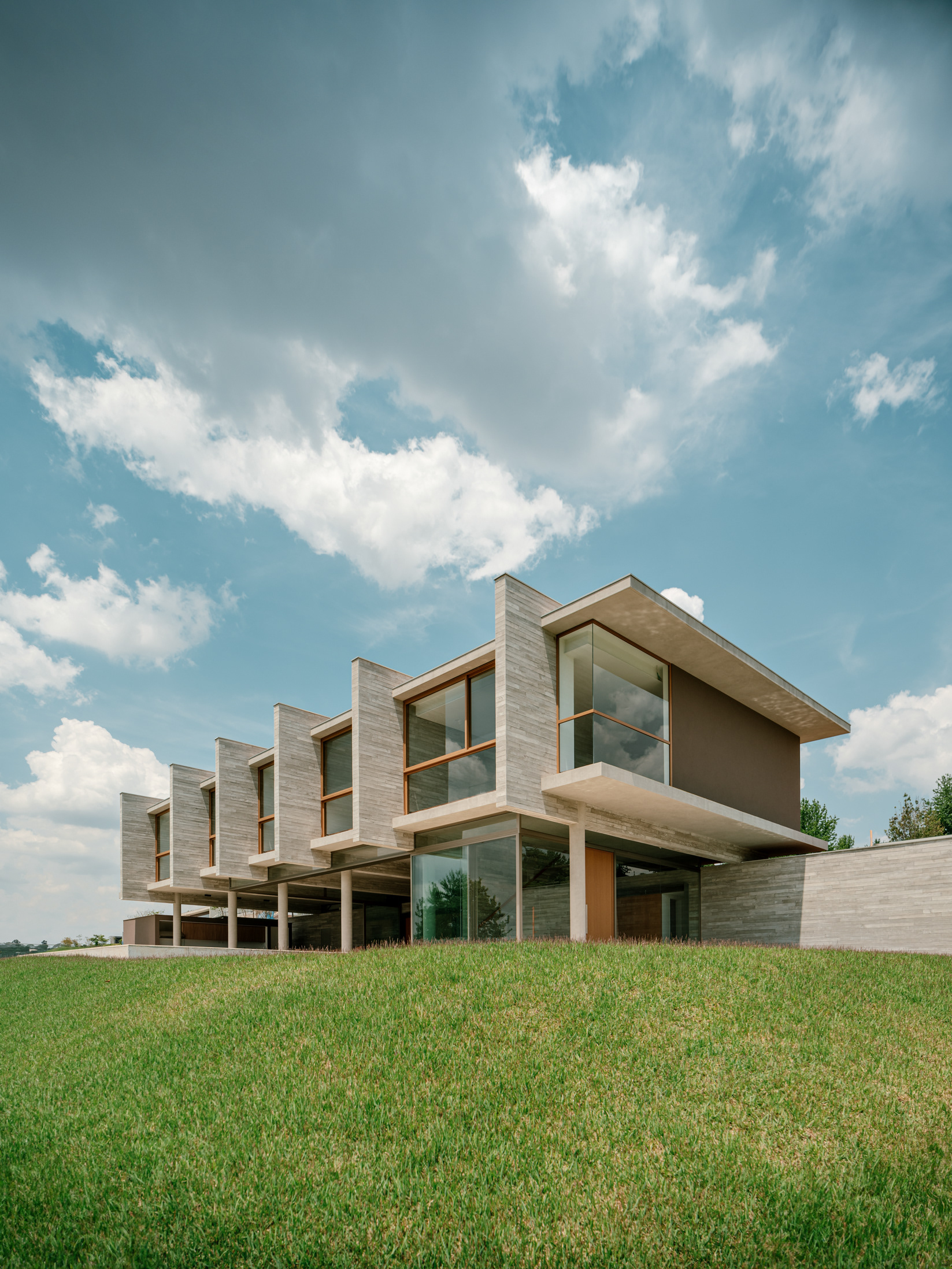 The design concept is quite straightforward and begins with the structural conception. In this project, the structure is the house, composed almost entirely of a layering of columns, beams, and slabs. A sequence of exposed round concrete columns forms porticos with a concrete wall and a series of 4-meter-tall concrete gables that support the upper floor, suspend the floor slab of this level, and separate the home’s main suites. This set of columns and gables is the project’s most prominent element, visible both up close and from afar. It covers the house’s social level, which is enclosed only by sliding glass panels that separate the living room from the verandas. Standing out from the sloped terrain, the external floors are composed of staggered horizontal planes that define the entrance, reflecting pool, verandas, and terraces, while also integrating with the semi-suspended volume of the house’s large pool.