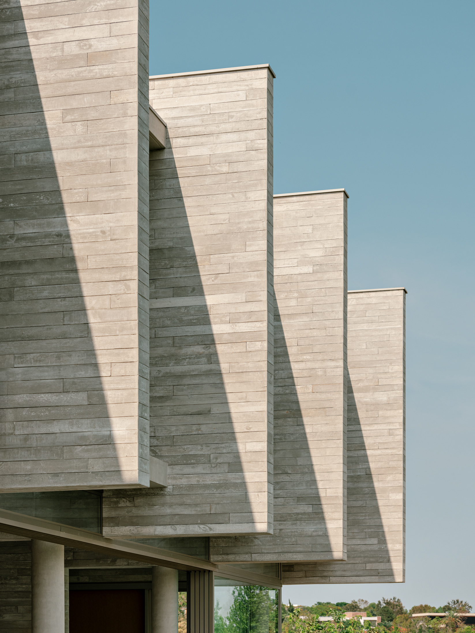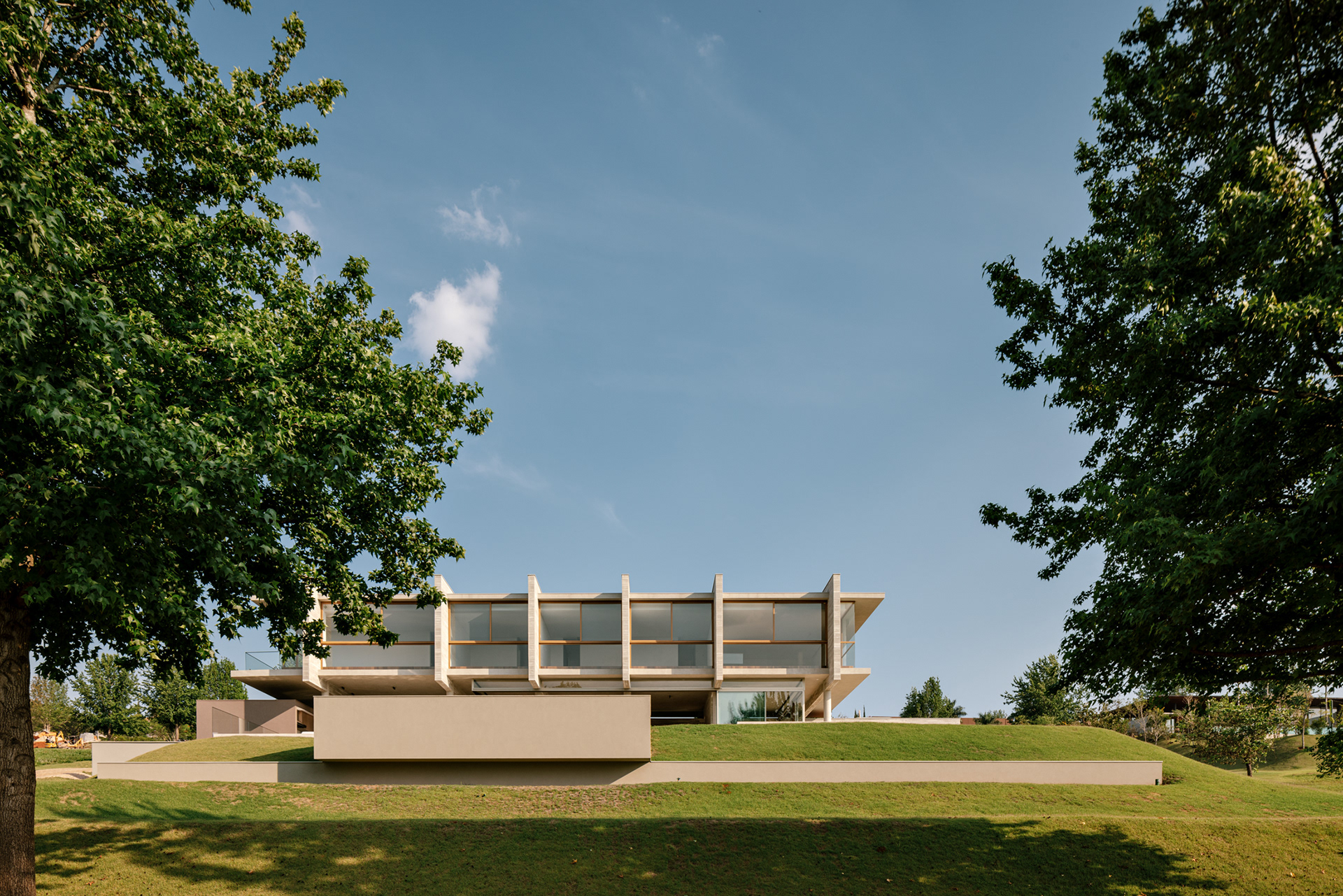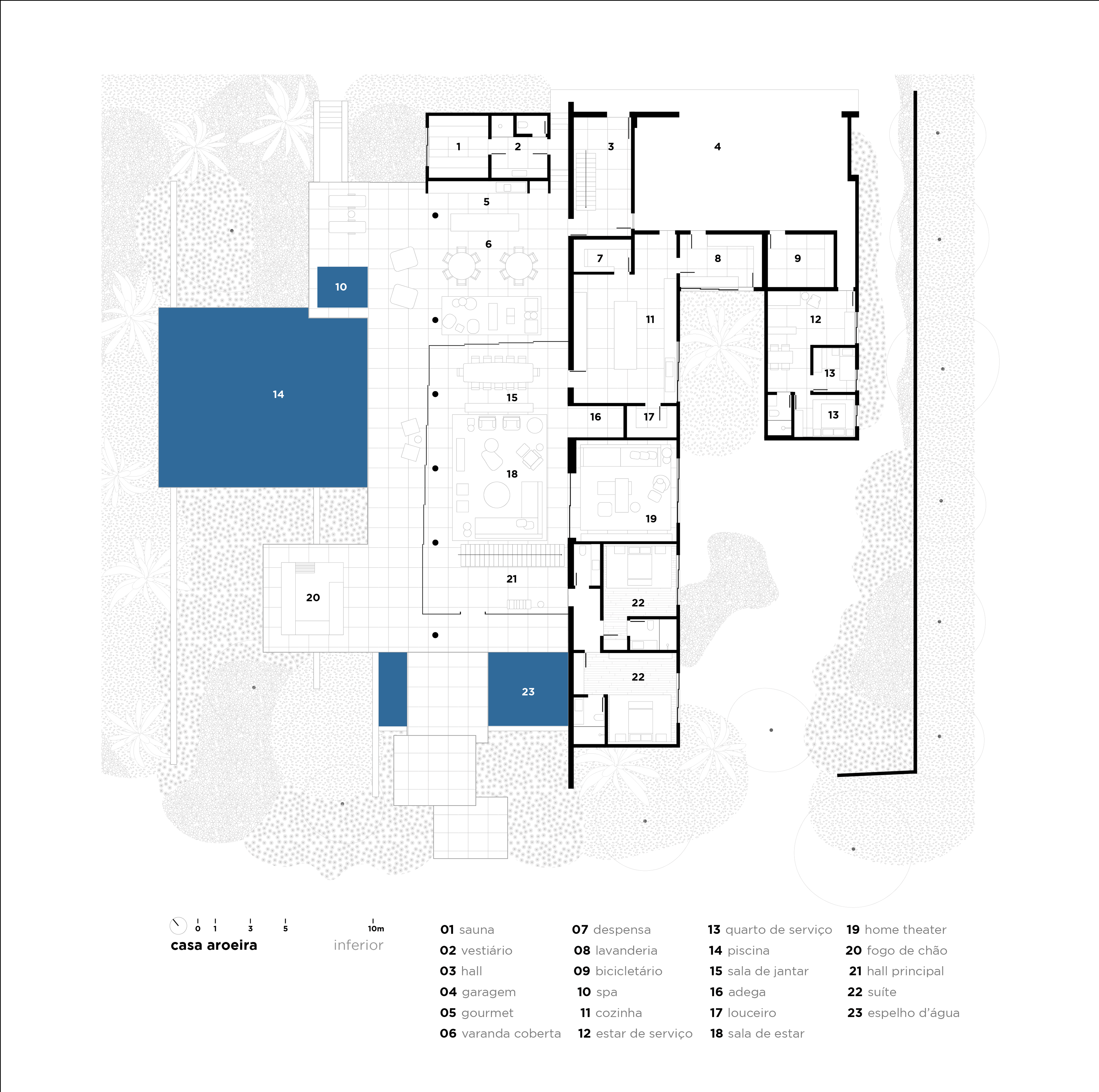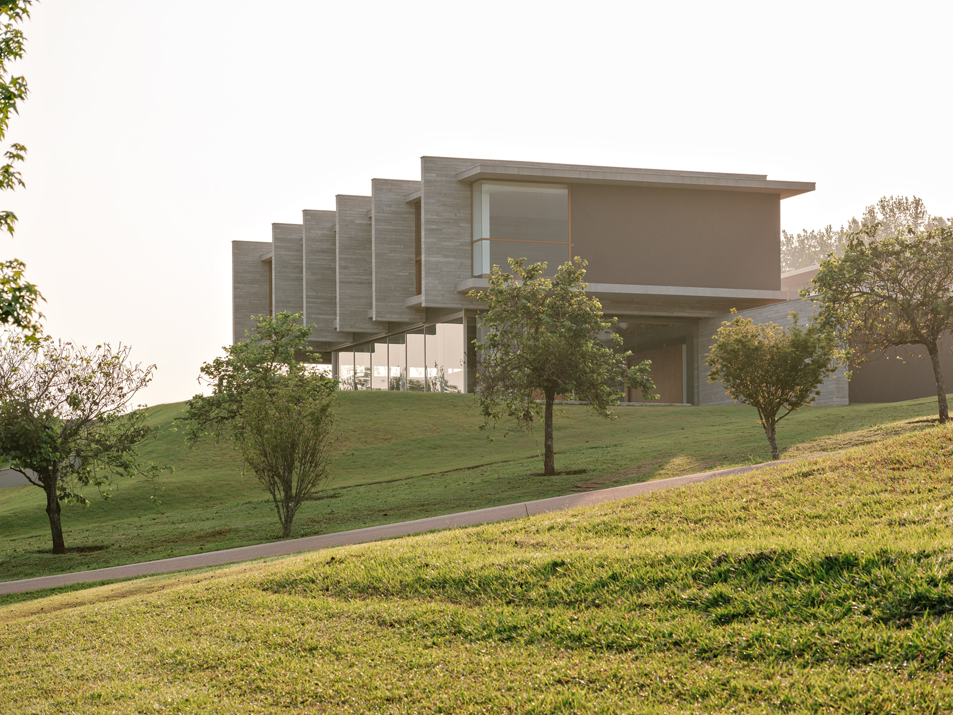 The design concept is quite straightforward and begins with the structural conception. In this project, the structure is the house, composed almost entirely of a layering of columns, beams, and slabs. A sequence of exposed round concrete columns forms porticos with a concrete wall and a series of 4-meter-tall concrete gables that support the upper floor, suspend the floor slab of this level, and separate the home’s main suites. This set of columns and gables is the project’s most prominent element, visible both up close and from afar. It covers the house’s social level, which is enclosed only by sliding glass panels that separate the living room from the verandas. Standing out from the sloped terrain, the external floors are composed of staggered horizontal planes that define the entrance, reflecting pool, verandas, and terraces, while also integrating with the semi-suspended volume of the house’s large pool.