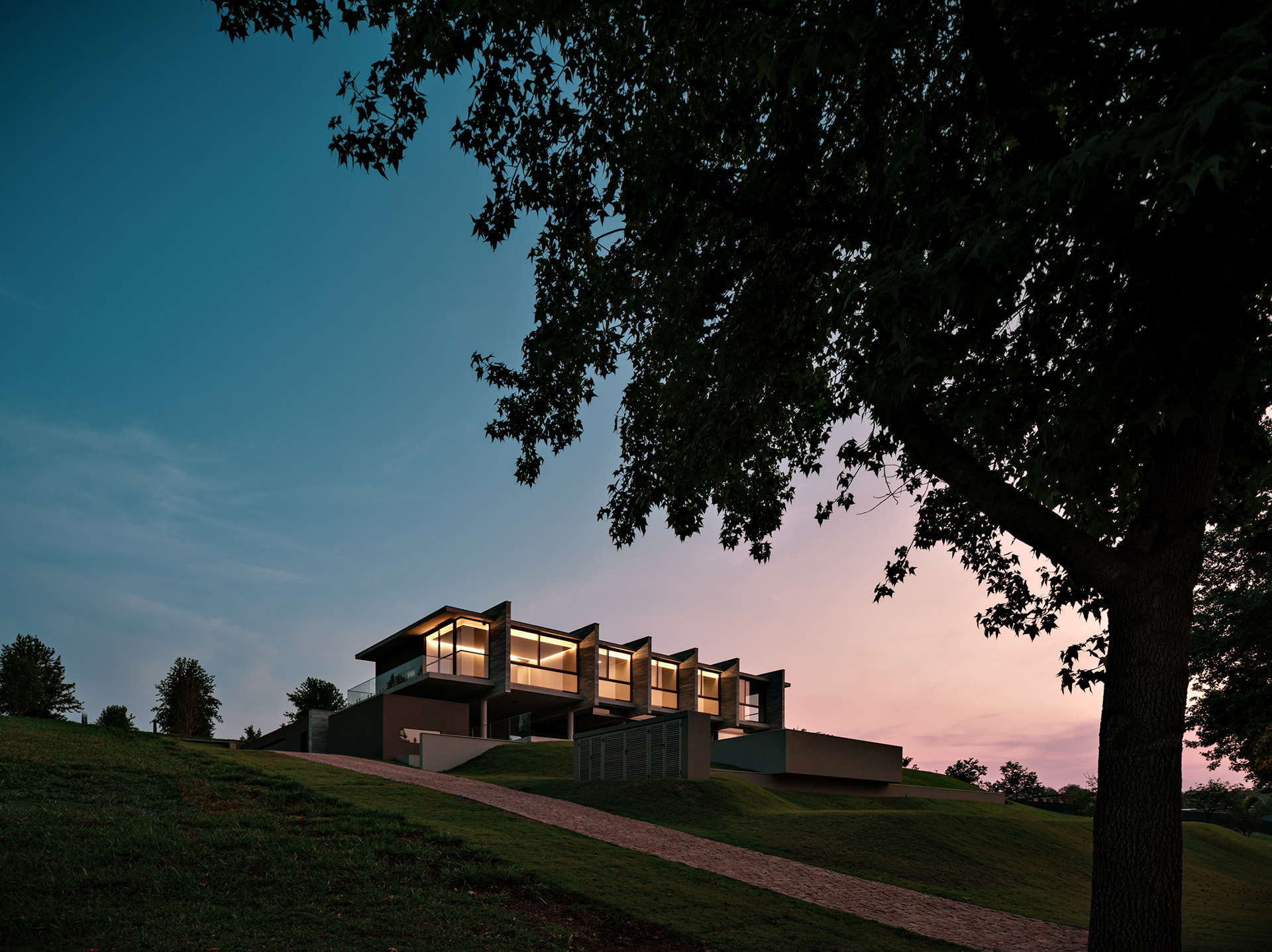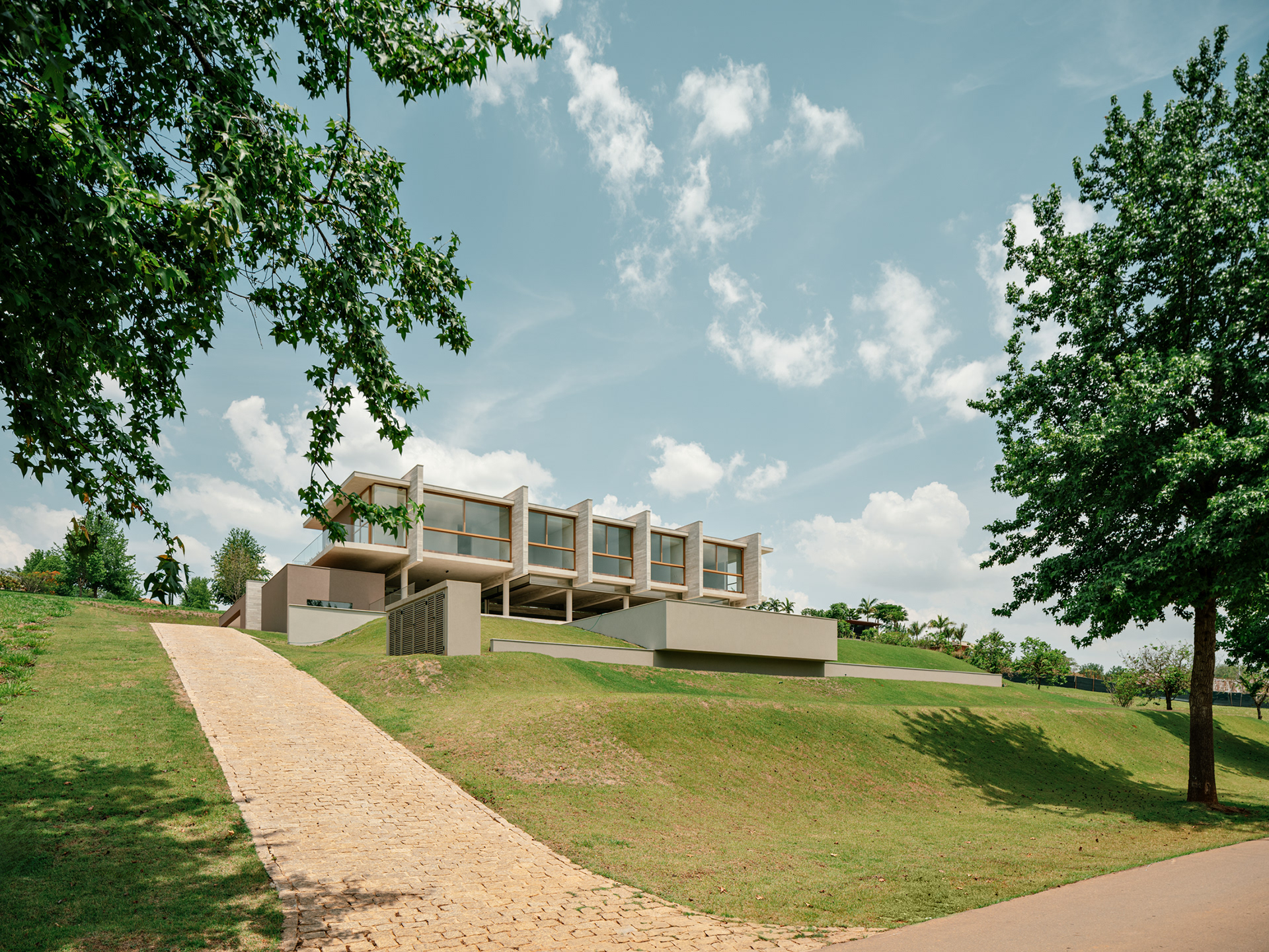 The design for the Aroeira House stems from an observation of the characteristics of the sloped plot, located on the corner of a block within a gated community in the interior of São Paulo. The house is positioned to take full advantage of the stunning views and to ensure the best placement of the residence on the site. Due to the steep slope of the land, the house sits at the upper portion of the lot, offering the best views and using the corner location to provide level pedestrian access via the side street, while vehicles access the garage from the lower street.