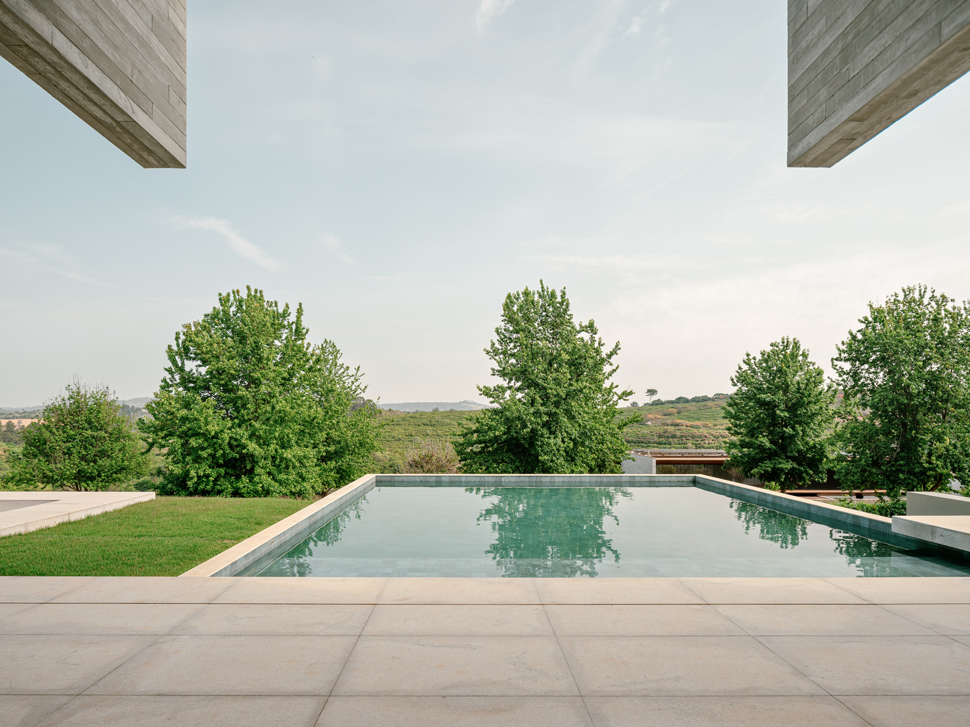 From a construction and finishing standpoint, the intention was to work with materials in their natural state — extensive use of glass for enclosures, exposed concrete for the structure, stone and wood for the indoor and outdoor flooring, and for the pool — creating a design that is both visually striking and chromatically neutral, allowing the surrounding natural landscape to take center stage.