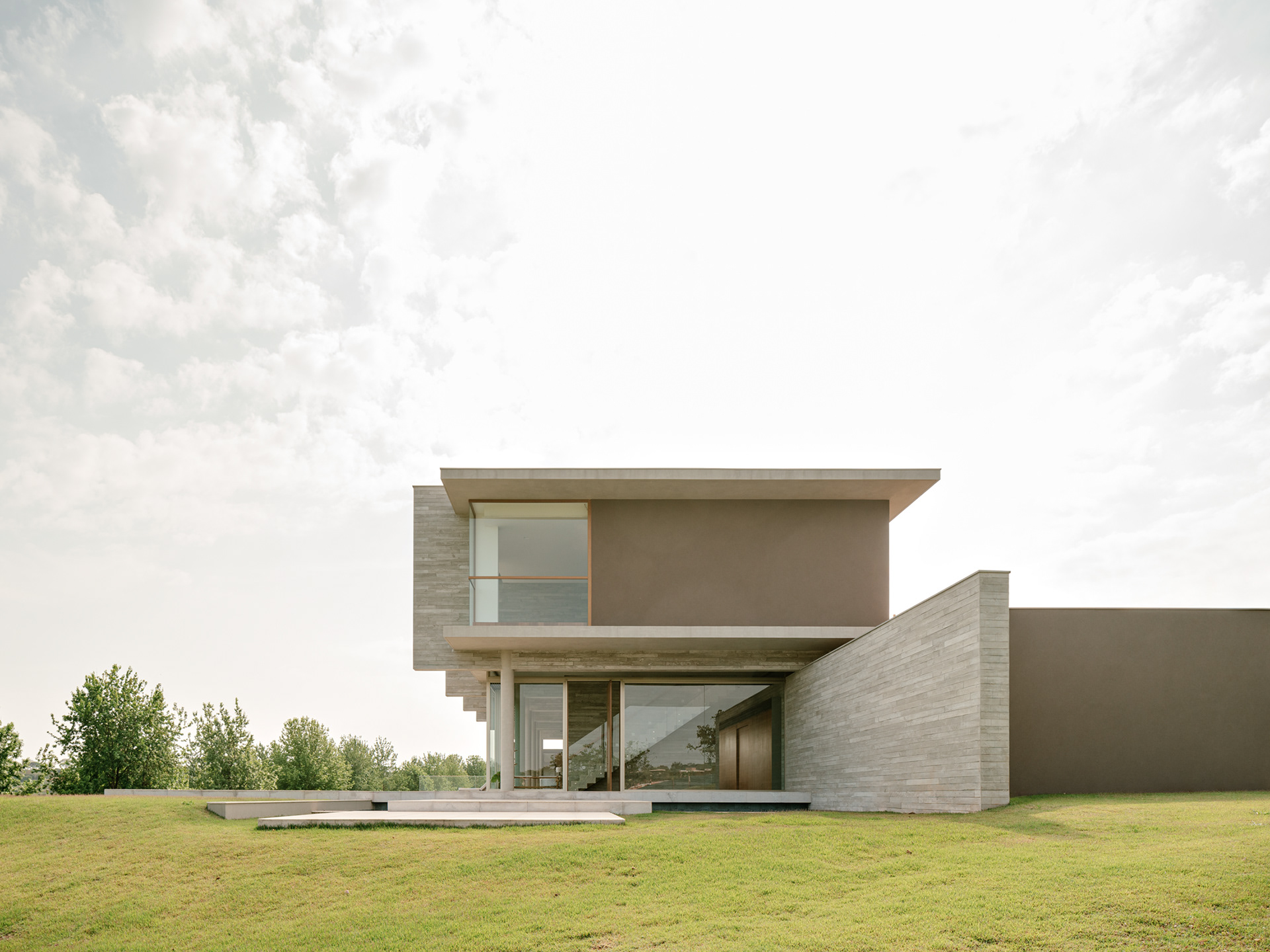 The extensive program of over 1000 m² is laid out across two linear floors. The ground floor is primarily dedicated to social and service areas — including two guest bedrooms — while the upper floor is reserved for the private quarters of the residence. All the main rooms face the lot’s main view, the pool, and the neighboring farmland.