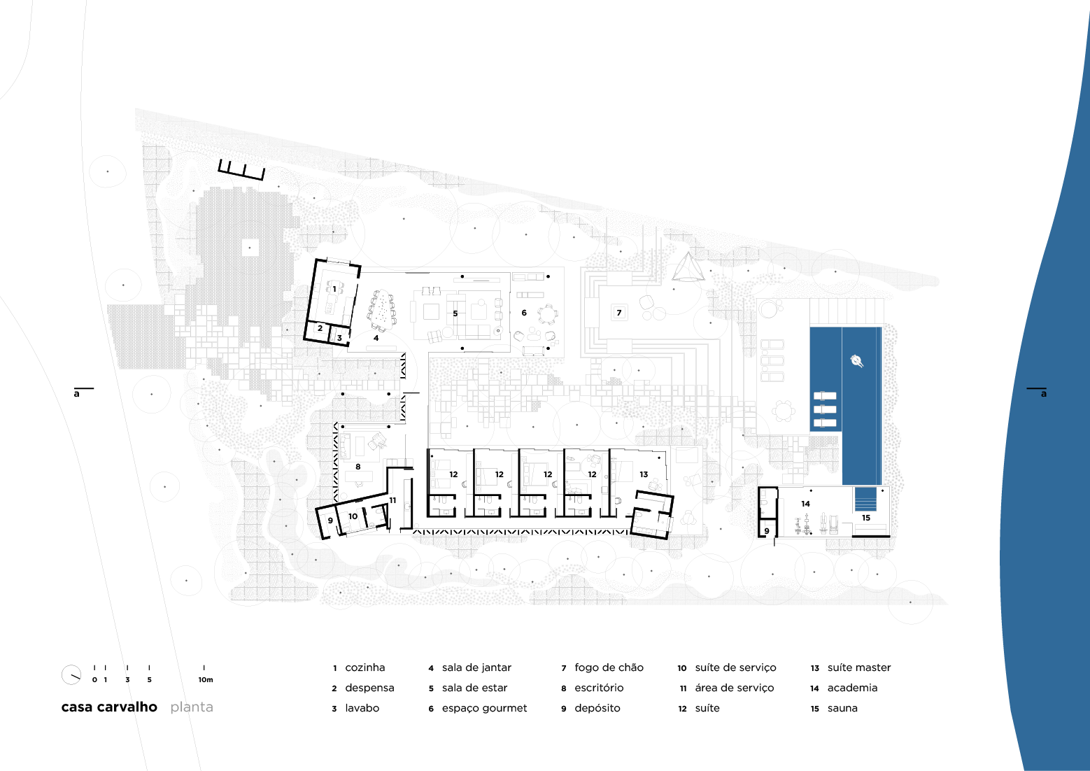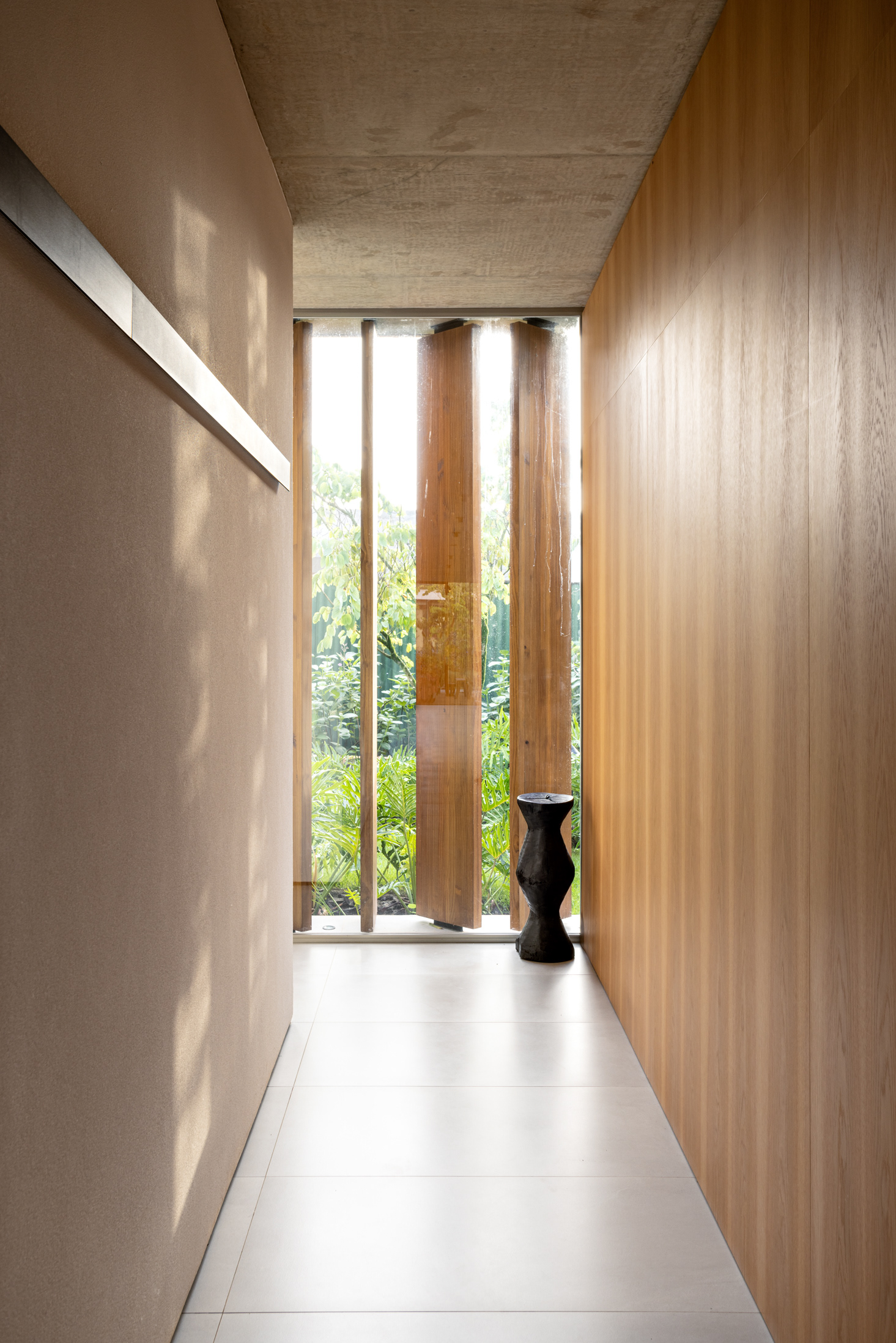 The design is very synthetic: two parallel slabs of exposed concrete (one on the floor and one on the roof) enclose the glazed areas. Additionally, some sections are treated in a more opaque way, given their internal program, and are carefully inserted between the two slabs, angled in relation to the Cartesian system of the general plan of the house and coated with copper in oxidized strips. Other elements that feature extensively in the architecture are the MLC wooden brises, which provide both sunlight control, where necessary, and privacy in relation to the outside area. The office is responsible for everything from architectural design to interior details.