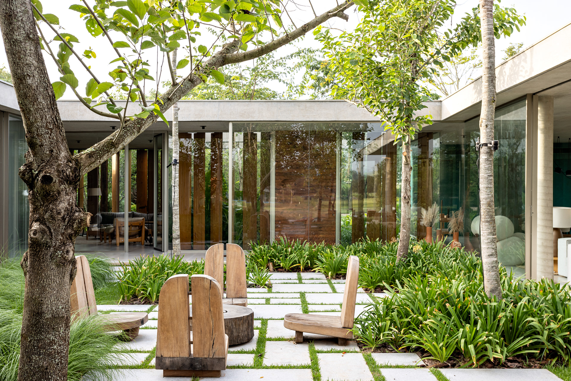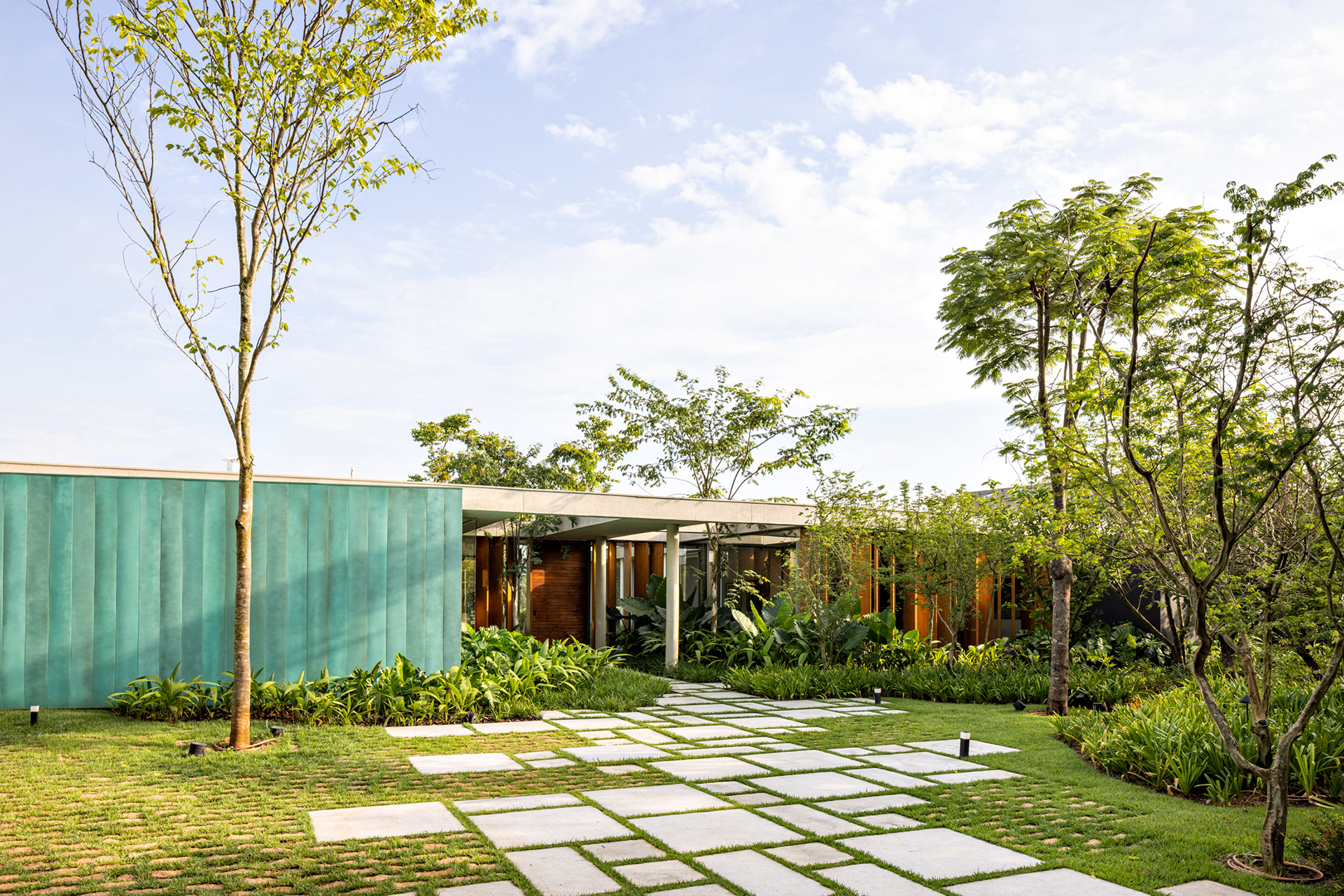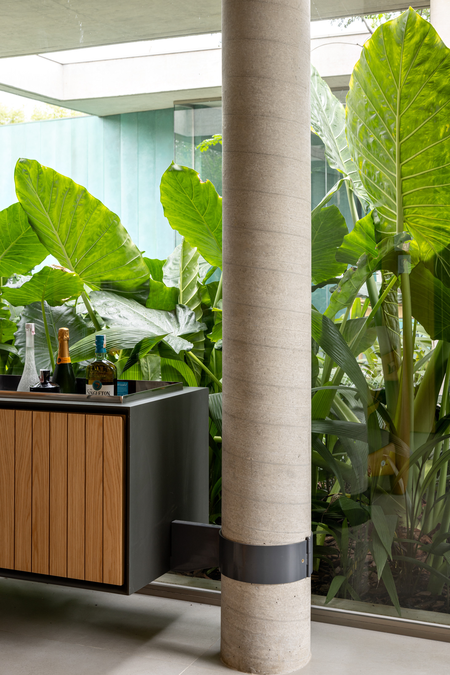 The house is very well connected to the gardens, designed by landscaper Alex Hanazaki. The flooring is very impressive, with concrete slabs of different shapes and sizes, as well as lush vegetation made up of pata-de-vaca (Brazilian orchid tree), jabuticaba (Brazilian grapetree) trees and other species.