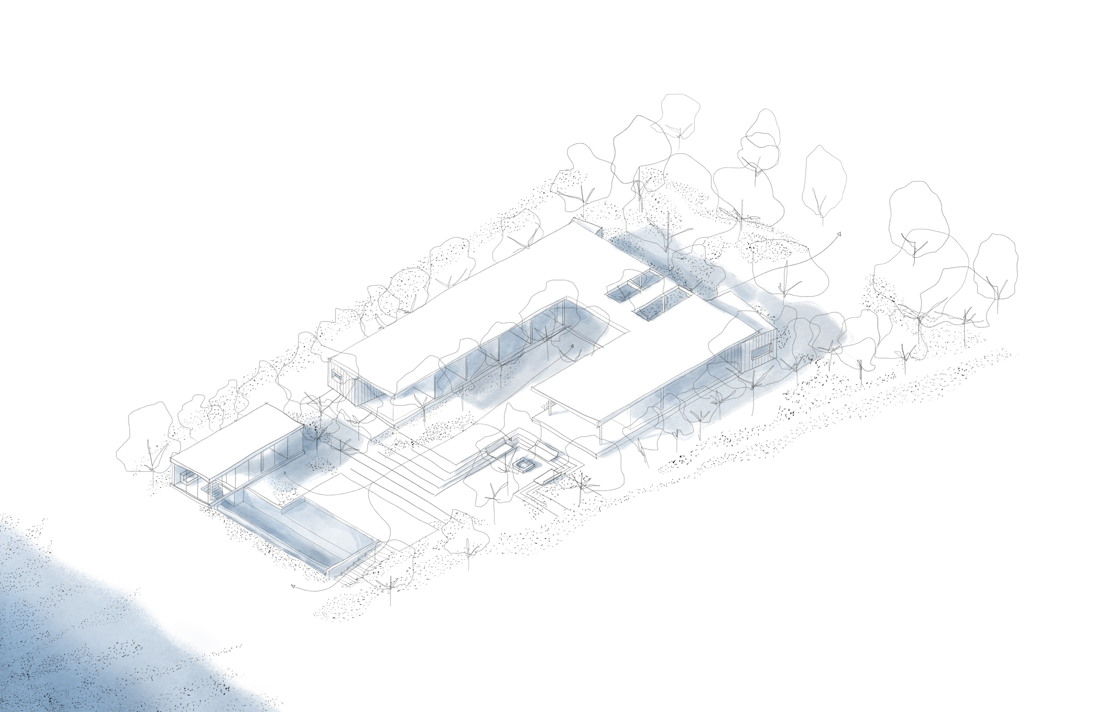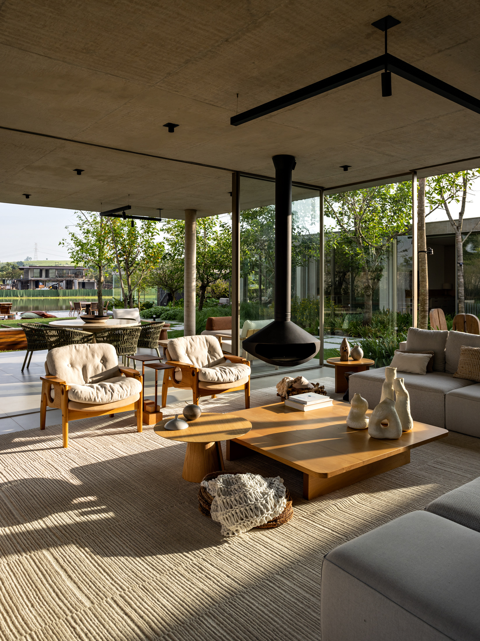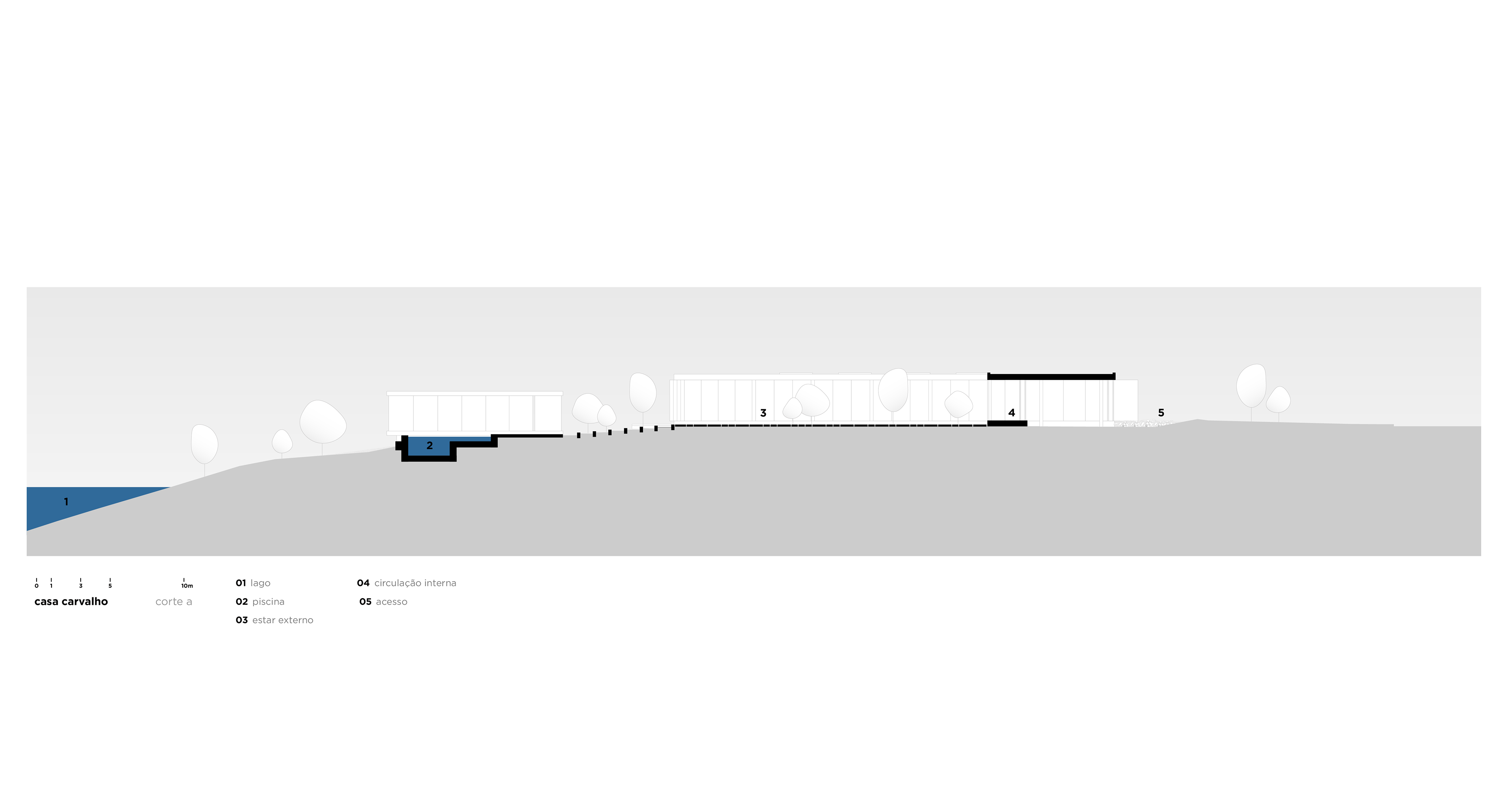 Casa Carvalho is based on a very objective investigation into the organization of a weekend house program on a large, flat plot of land facing a lake. Given such a special condition, the vast majority of spaces are made up of large glass panes, as in classic modernist houses, connecting internal and external spaces.