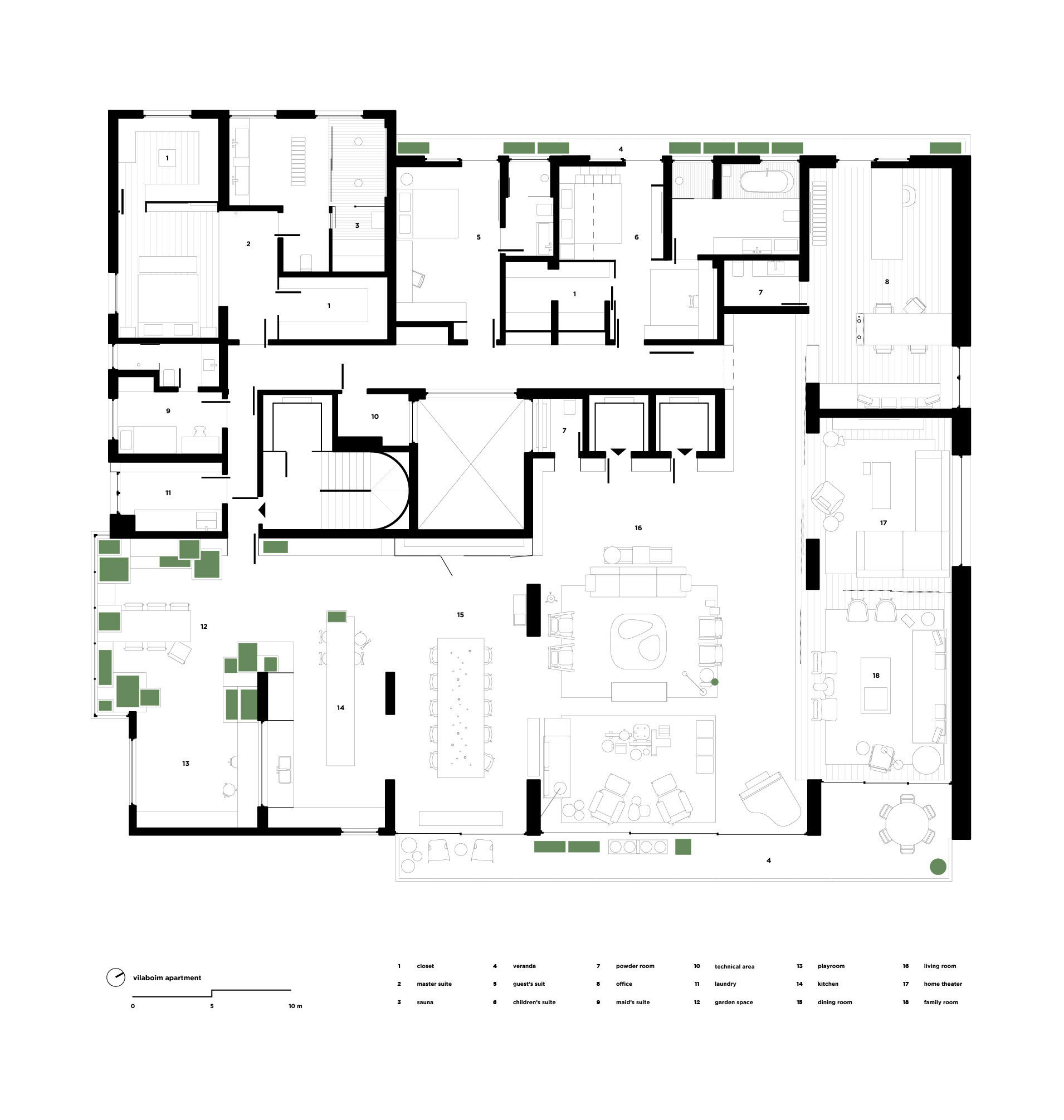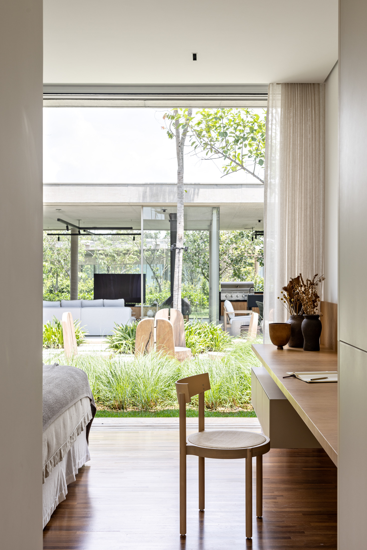 The family program, consisting of a couple with a pre-teen daughter, was reasonably simple considering the dimensions of the property – guest bedroom, couple’s and daughter’s bedrooms, integrated living rooms, office and a comfortable space for the family piano.