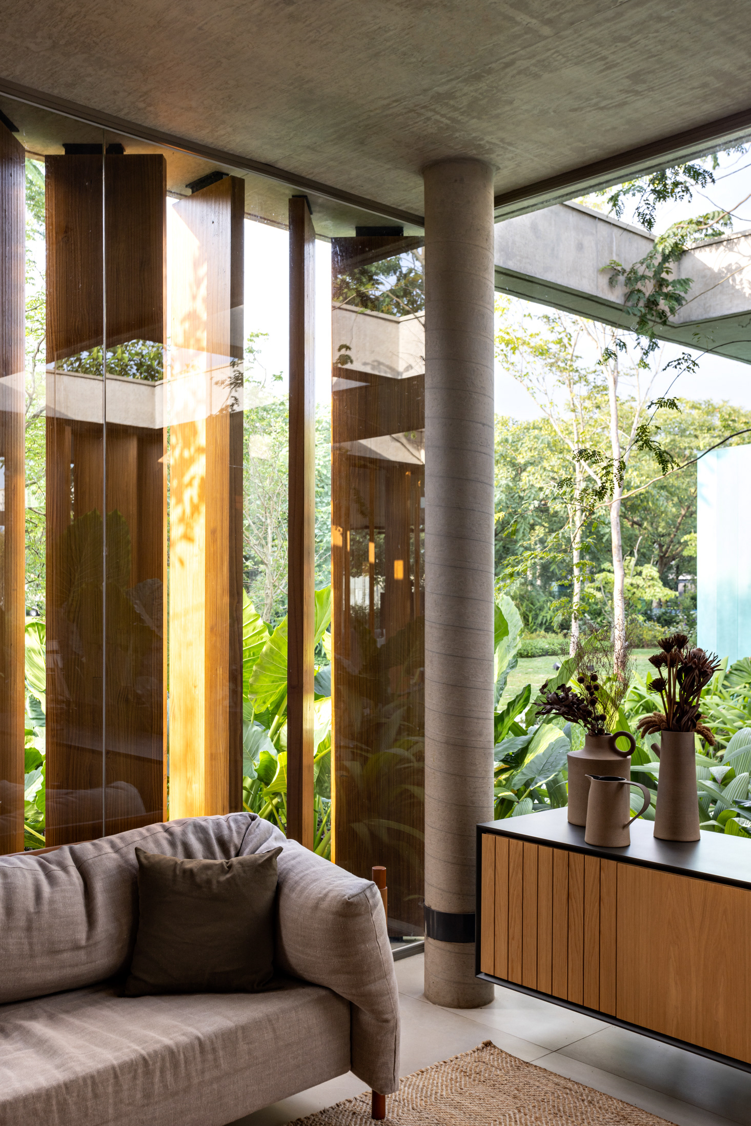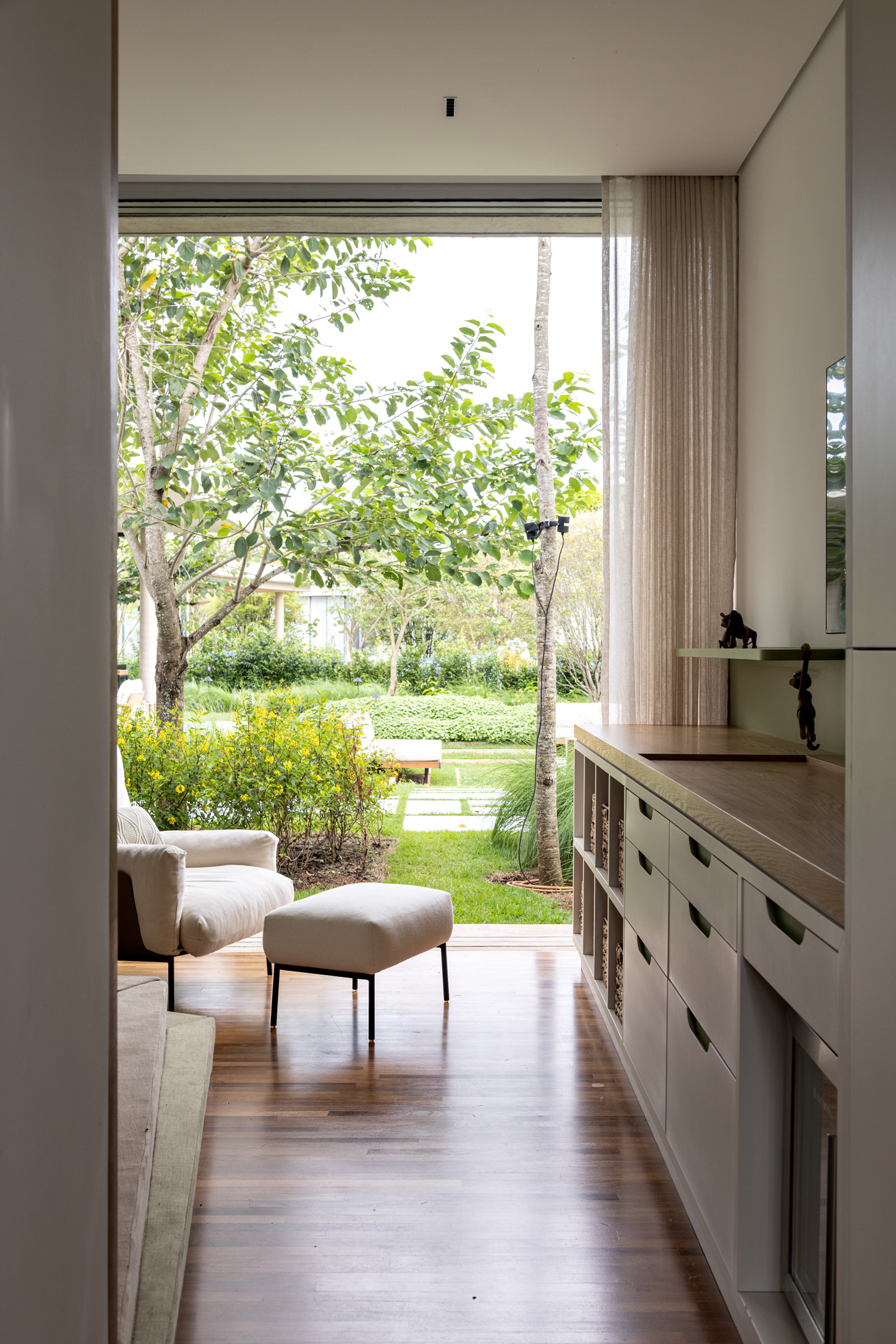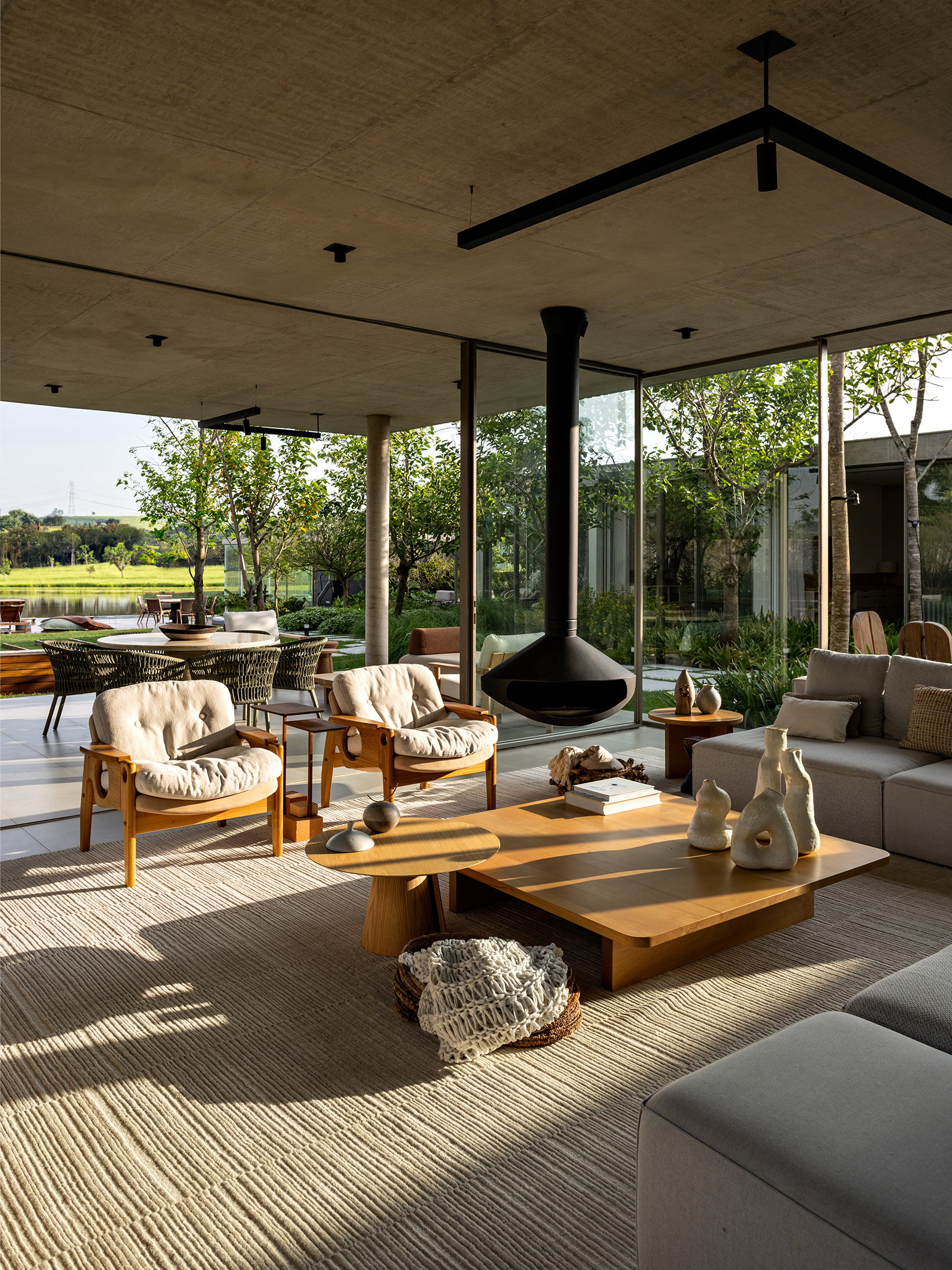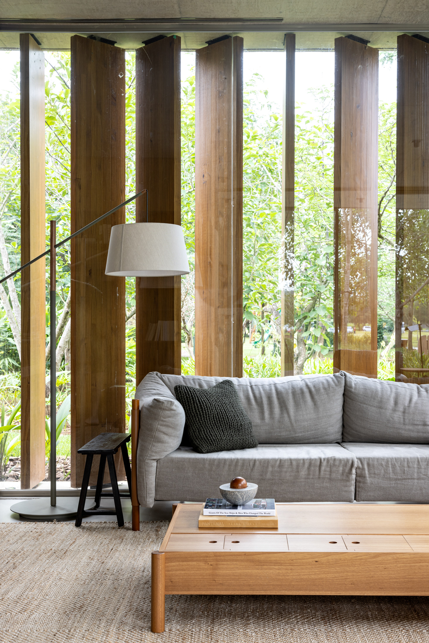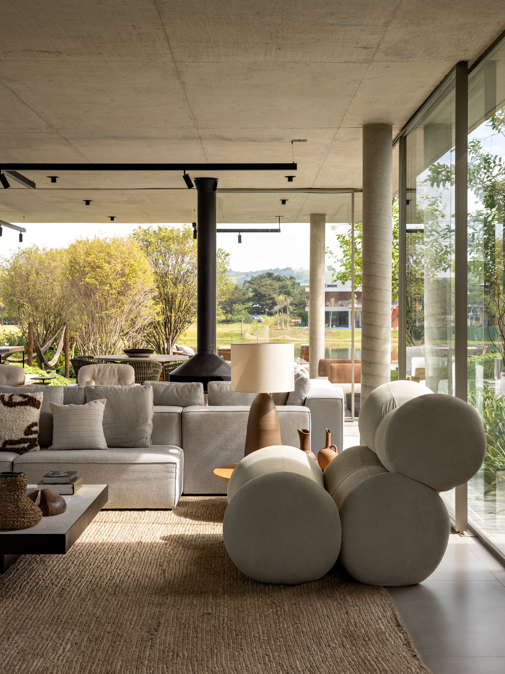 Some pieces were also created by the architects especially for this project, such as the marble coffee table of the intimate room or the Crest sideboard, all in cast glass, for specific project locations. Secondary layers such as luminaires, objects and compositions followed the same reasoning, as it is possible to observe on the coffee table composed of traditional Brazilian stools in a kind of artistic-functional installation.