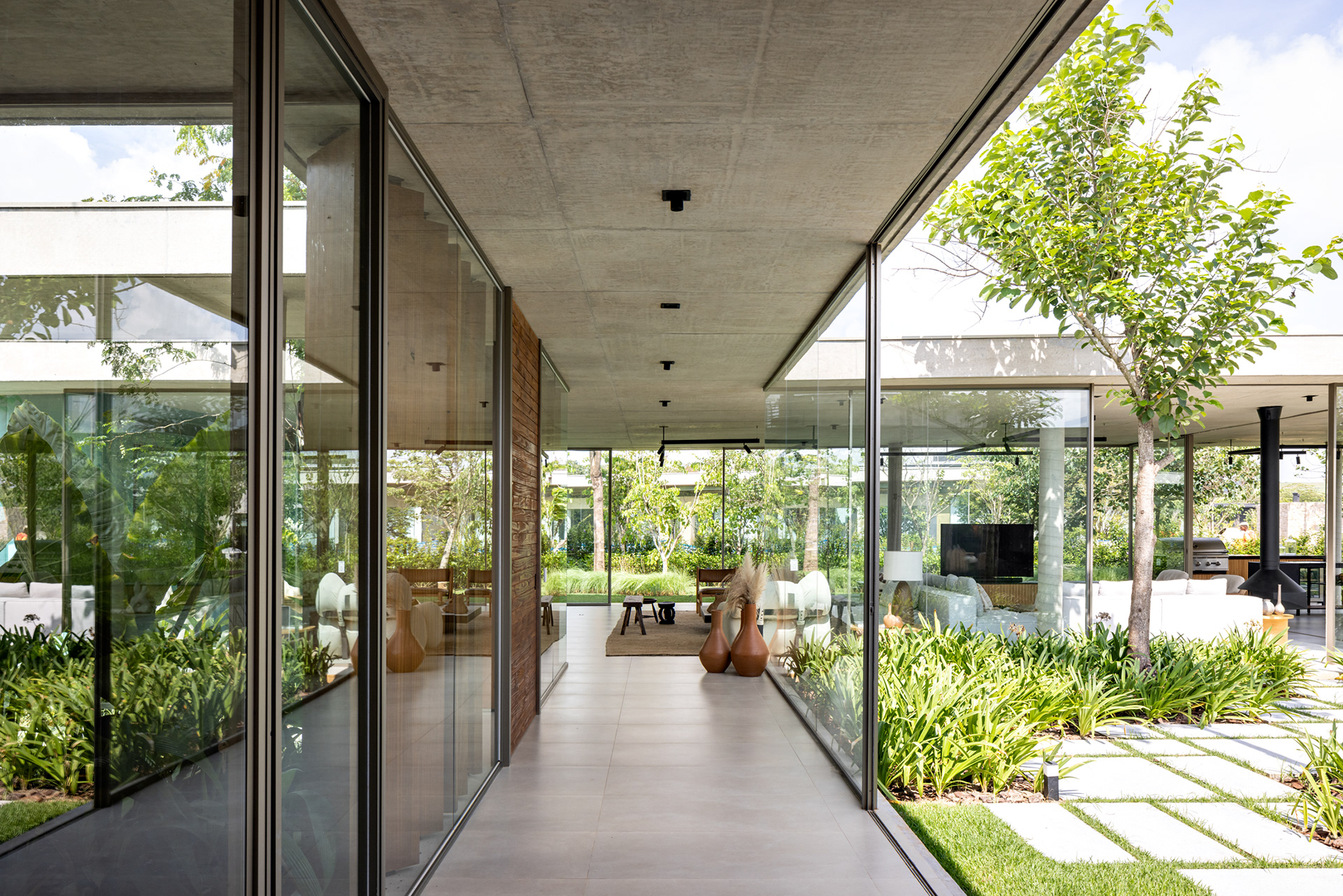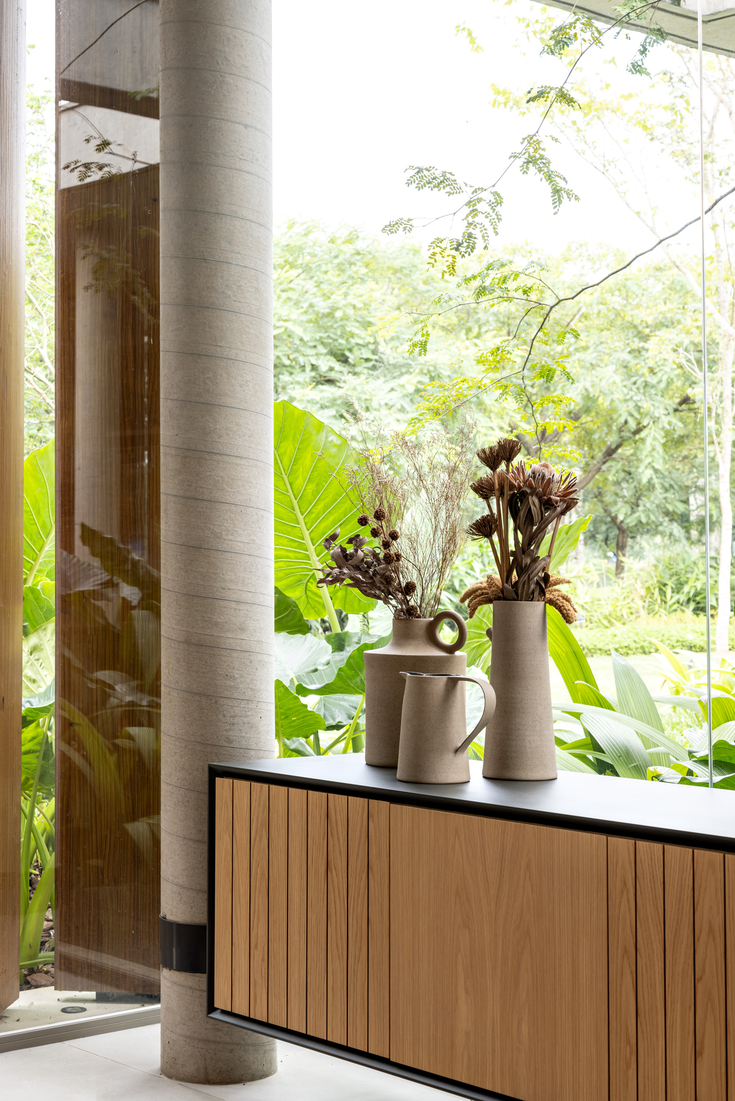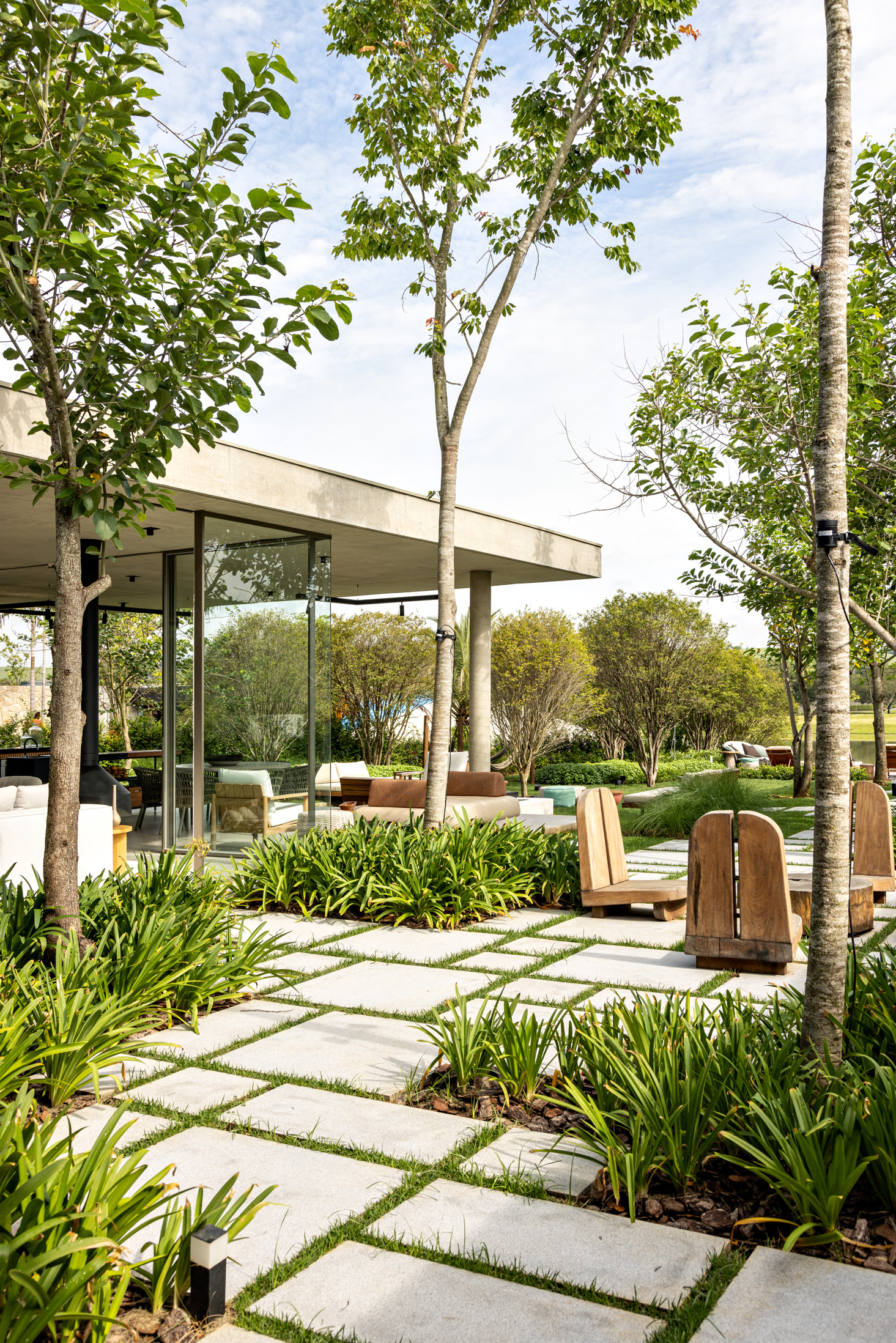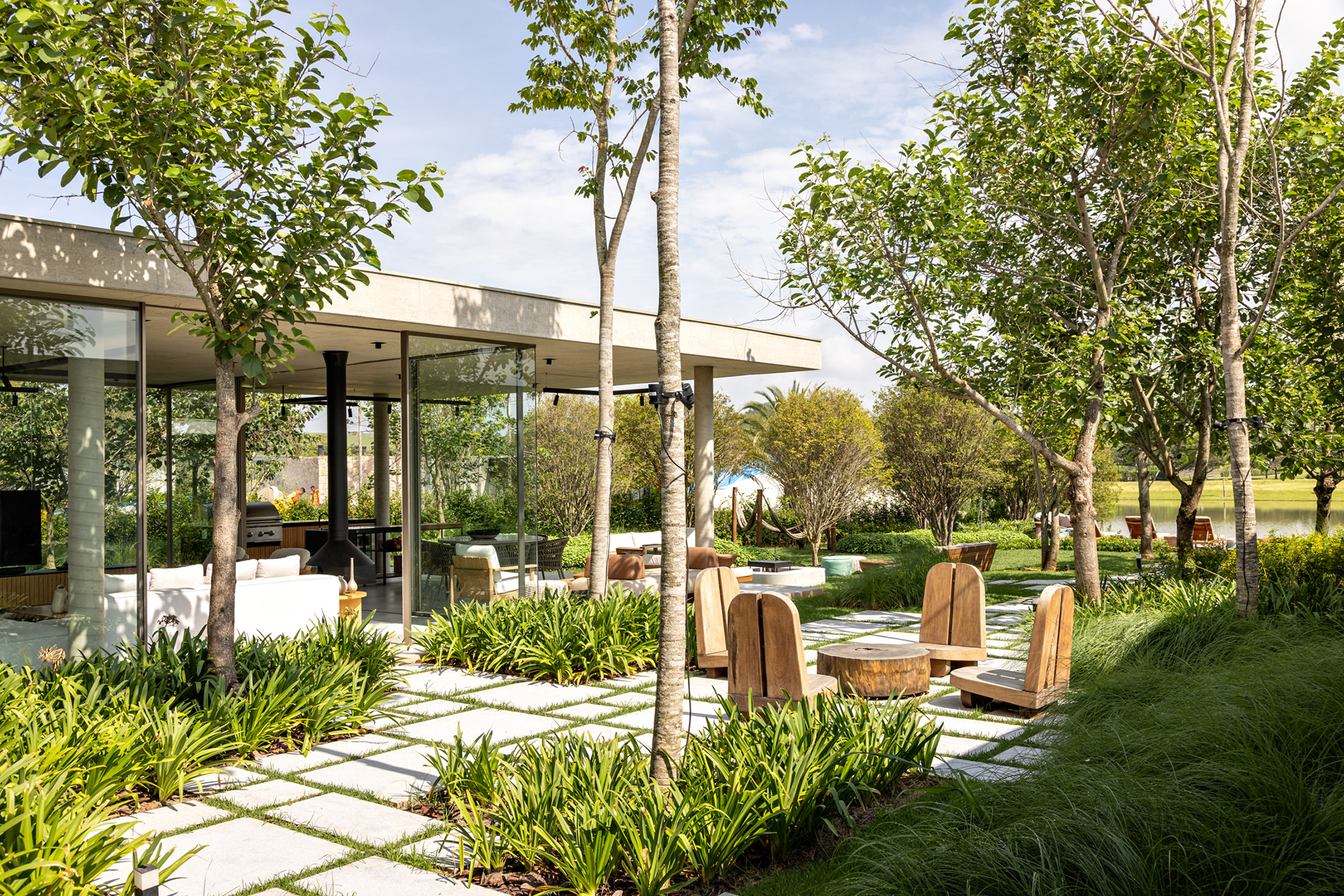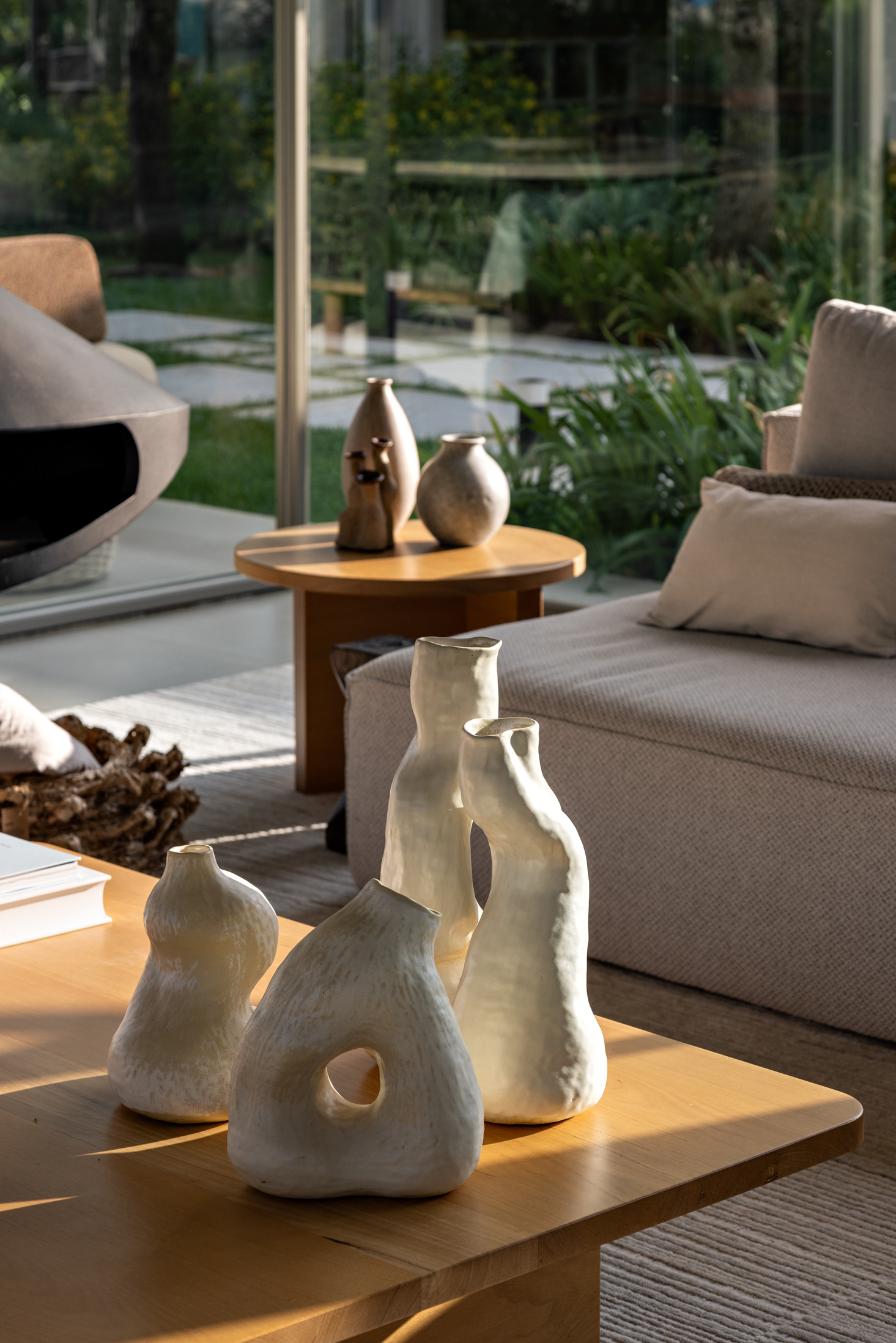 Some pieces were also created by the architects especially for this project, such as the marble coffee table of the intimate room or the Crest sideboard, all in cast glass, for specific project locations. Secondary layers such as luminaires, objects and compositions followed the same reasoning, as it is possible to observe on the coffee table composed of traditional Brazilian stools in a kind of artistic-functional installation.