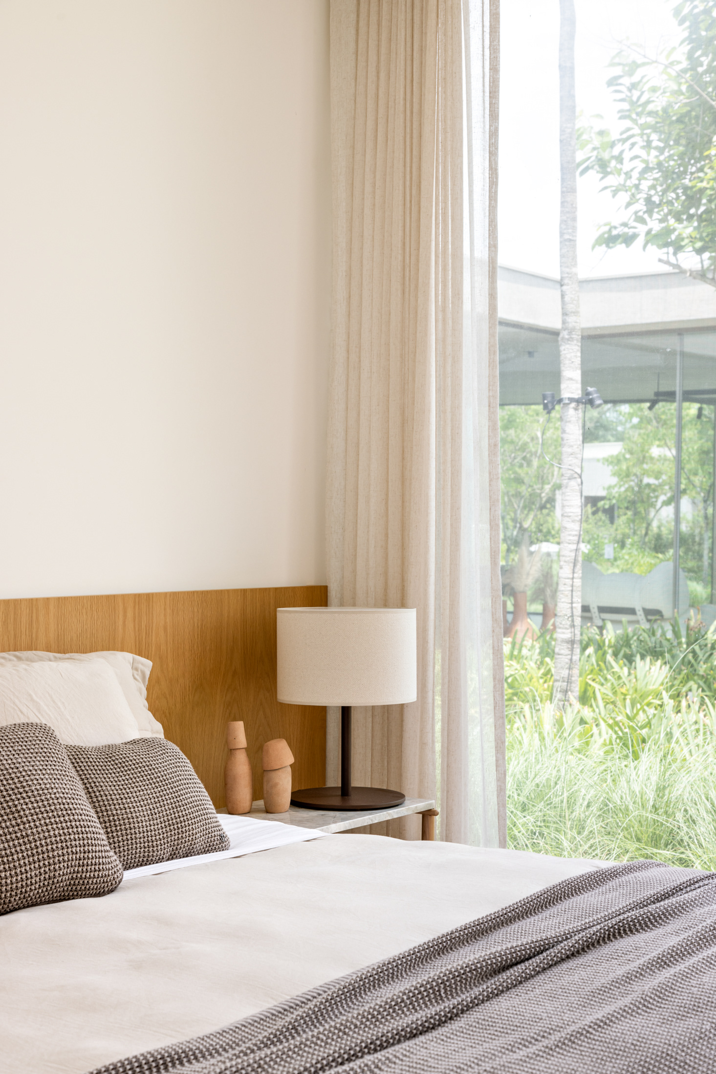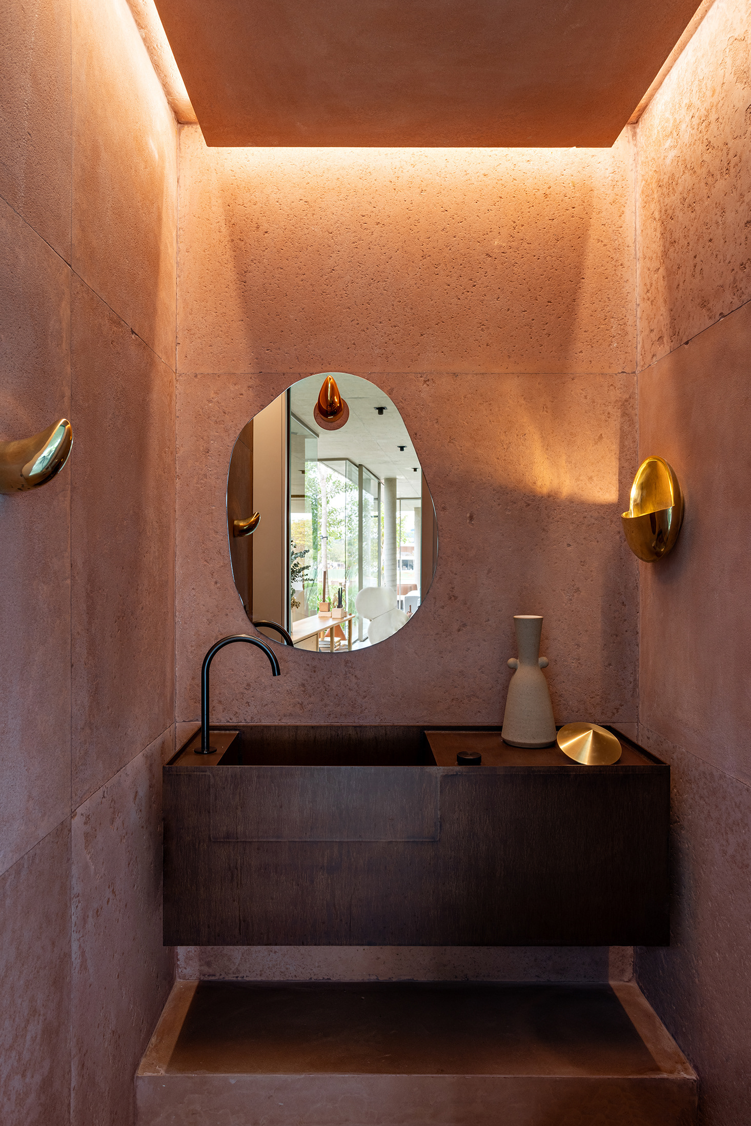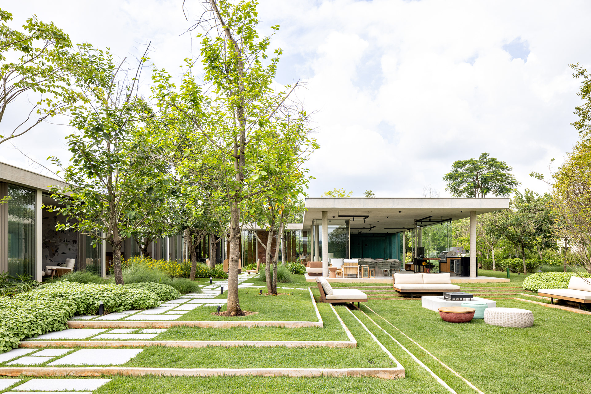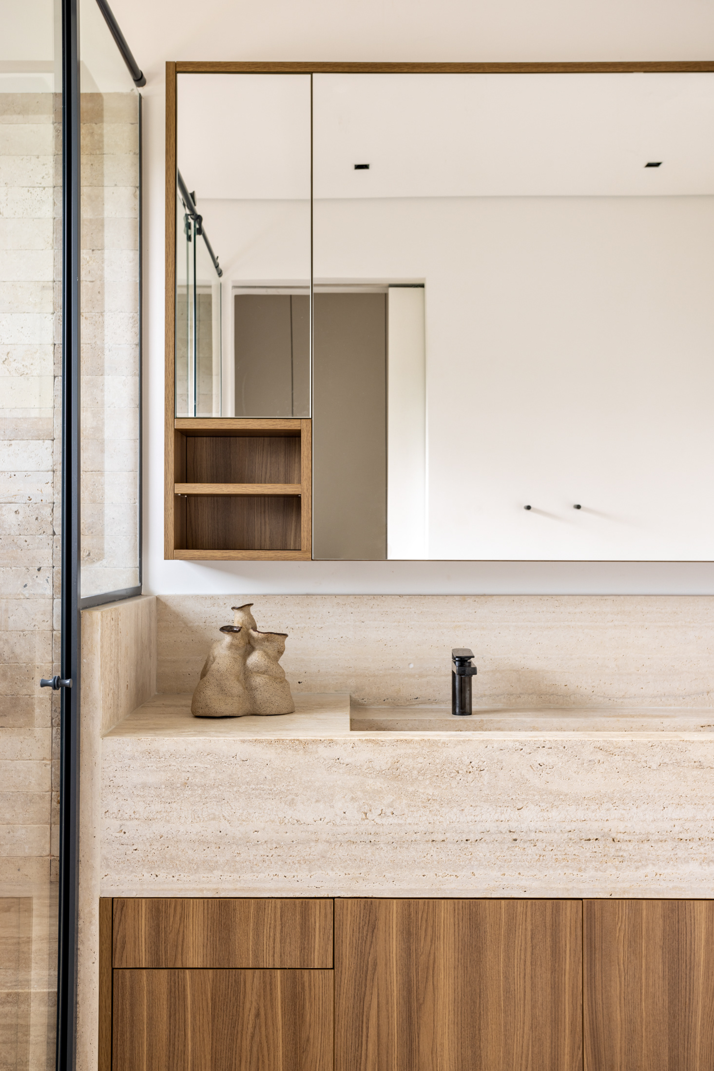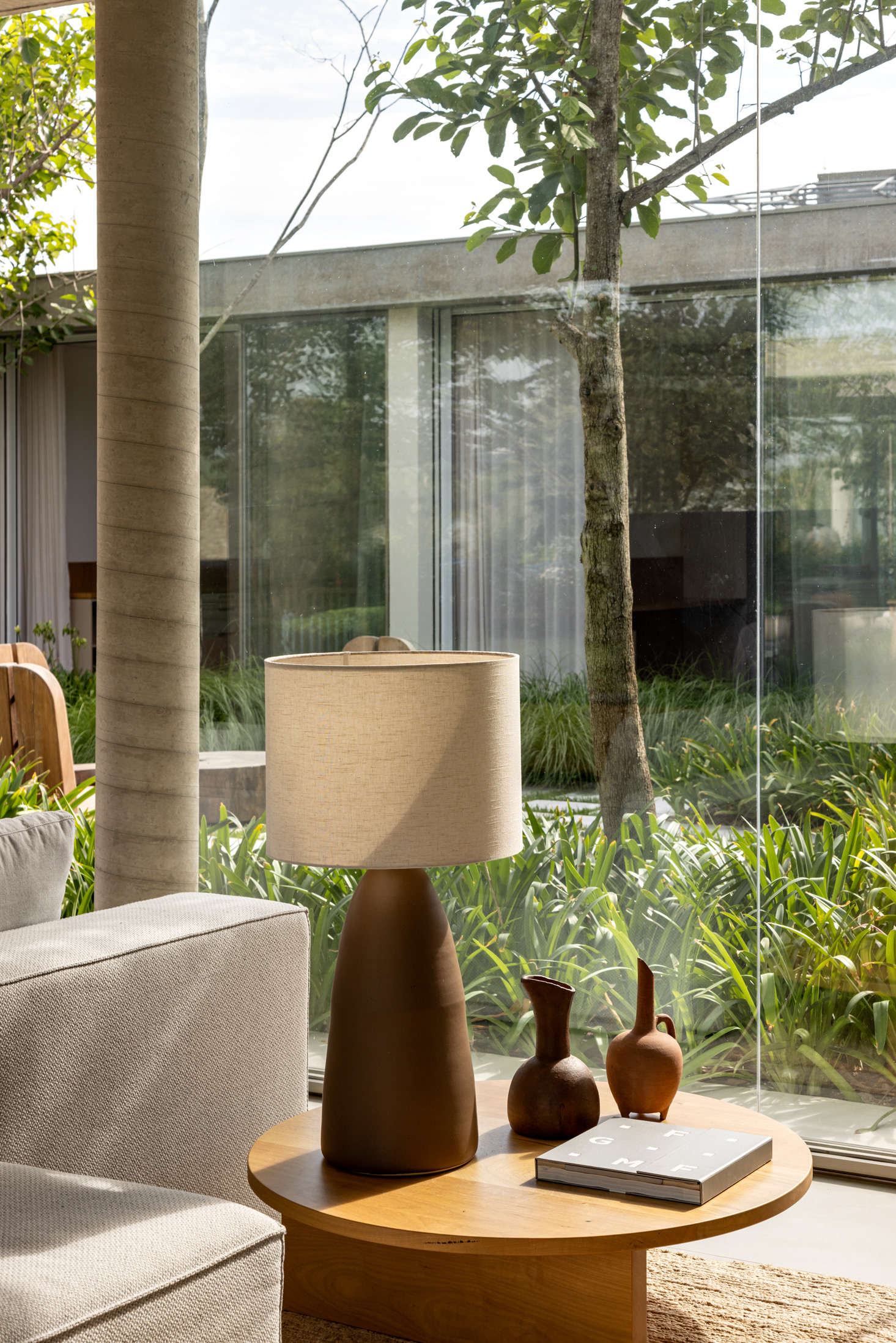Some pieces were also created by the architects especially for this project, such as the marble coffee table of the intimate room or the Crest sideboard, all in cast glass, for specific project locations. Secondary layers such as luminaires, objects and compositions followed the same reasoning, as it is possible to observe on the coffee table composed of traditional Brazilian stools in a kind of artistic-functional installation.