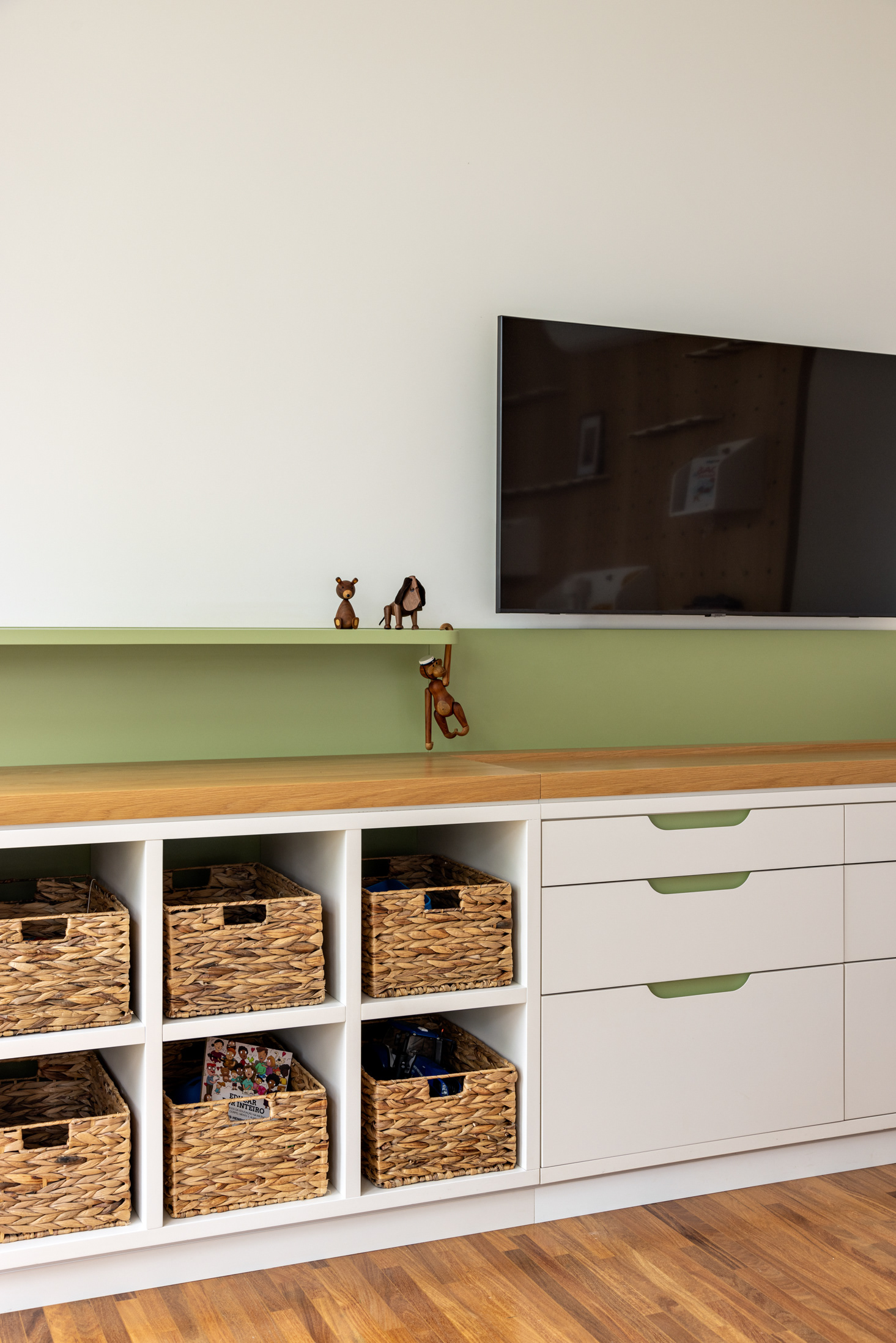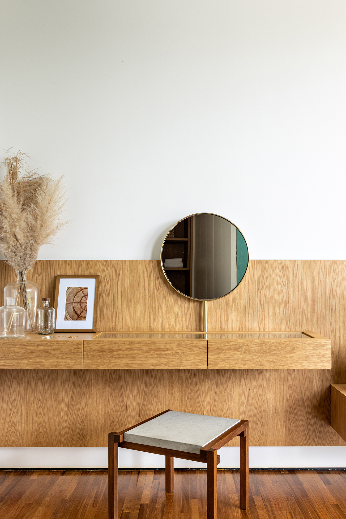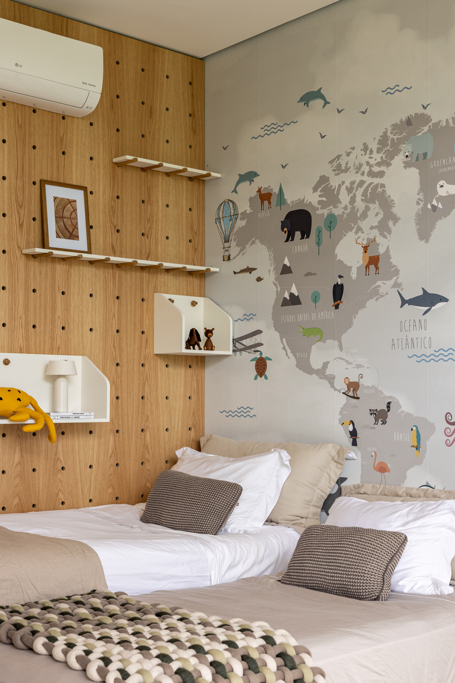 A large wooden element, with unevenness, as a “volume within the apartment space” was designed to organize office, TV room and intimate room for the daily life of the family. This volume, fully clad in oak, has sliding doors in Freijó muxarabi that can be fully opened or closed depending on the occasion and create an everyday dynamic that changes the appearance of the social area.