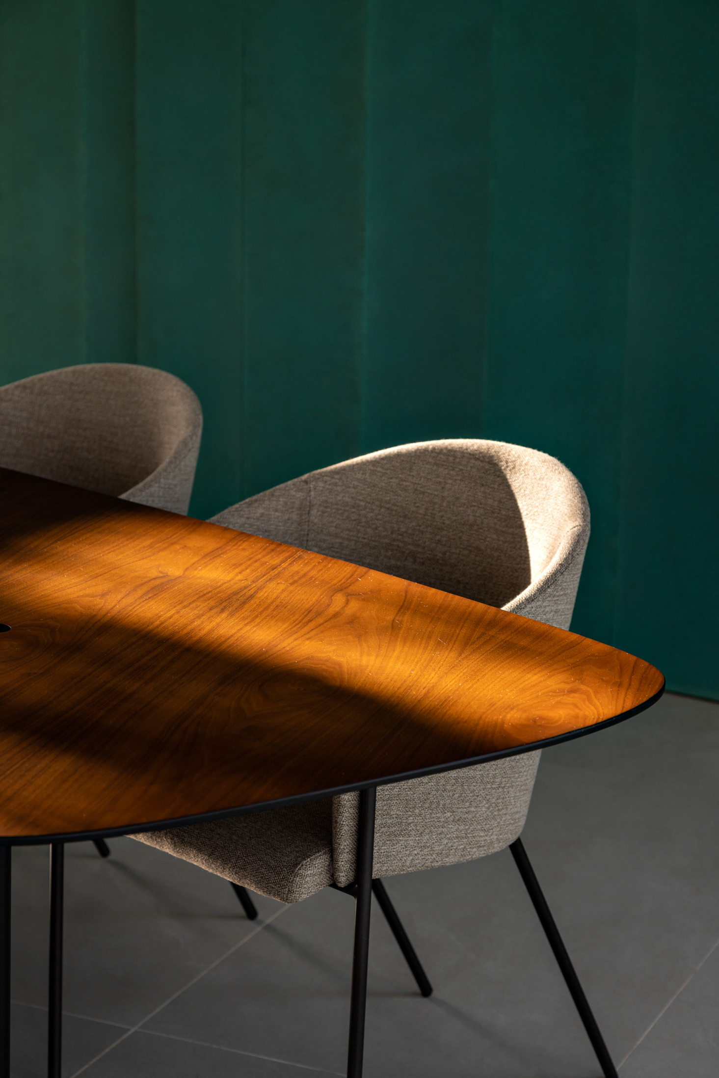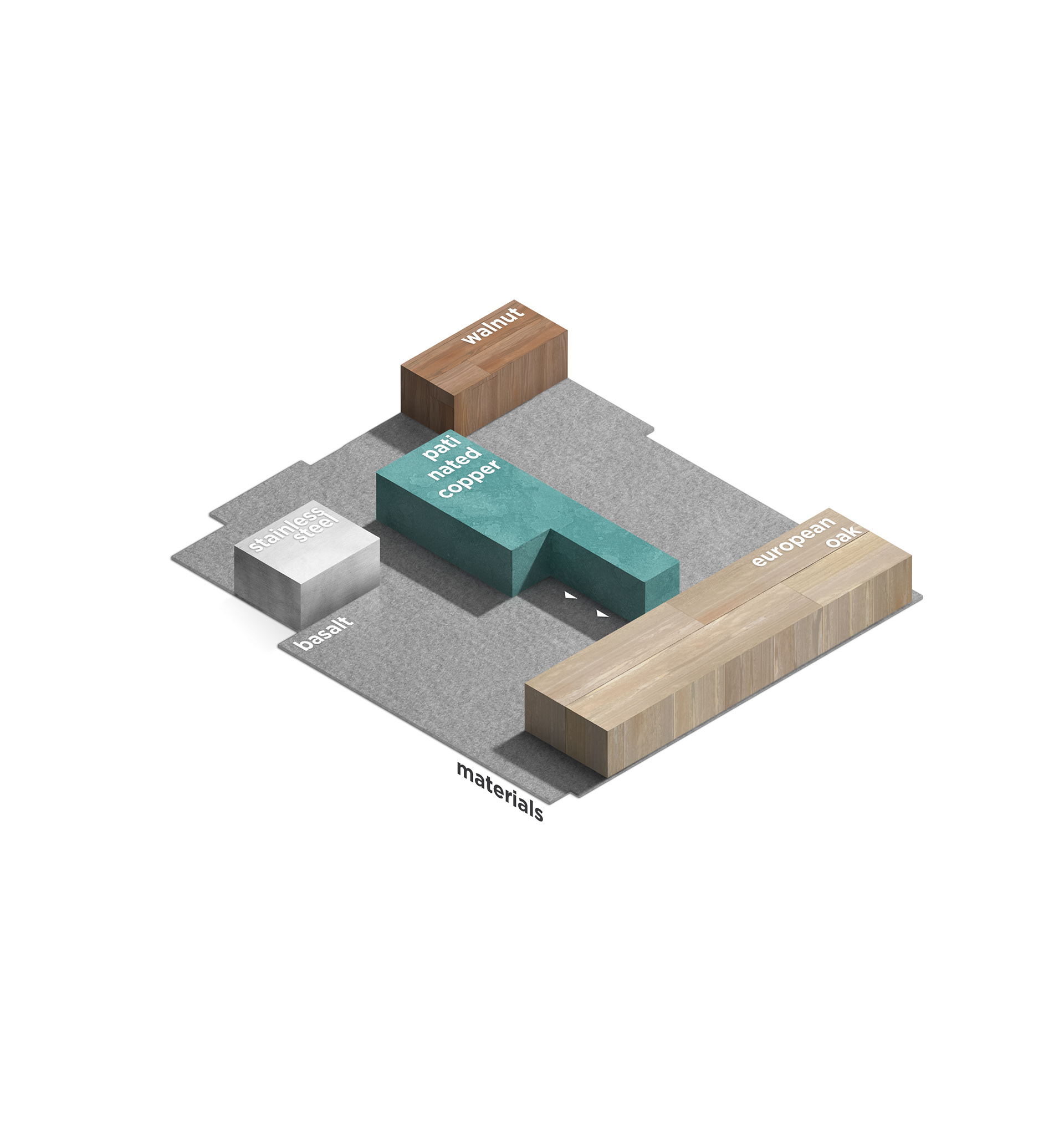 The rest of the social area, kitchen and multipurpose space is finished in basalt plates that surround the pillars and protrude from the floor creating volumes with landscaping that embrace the dining room. These volumes also arrange the large open central island of the kitchen which is finished with planned stainless steel furniture.