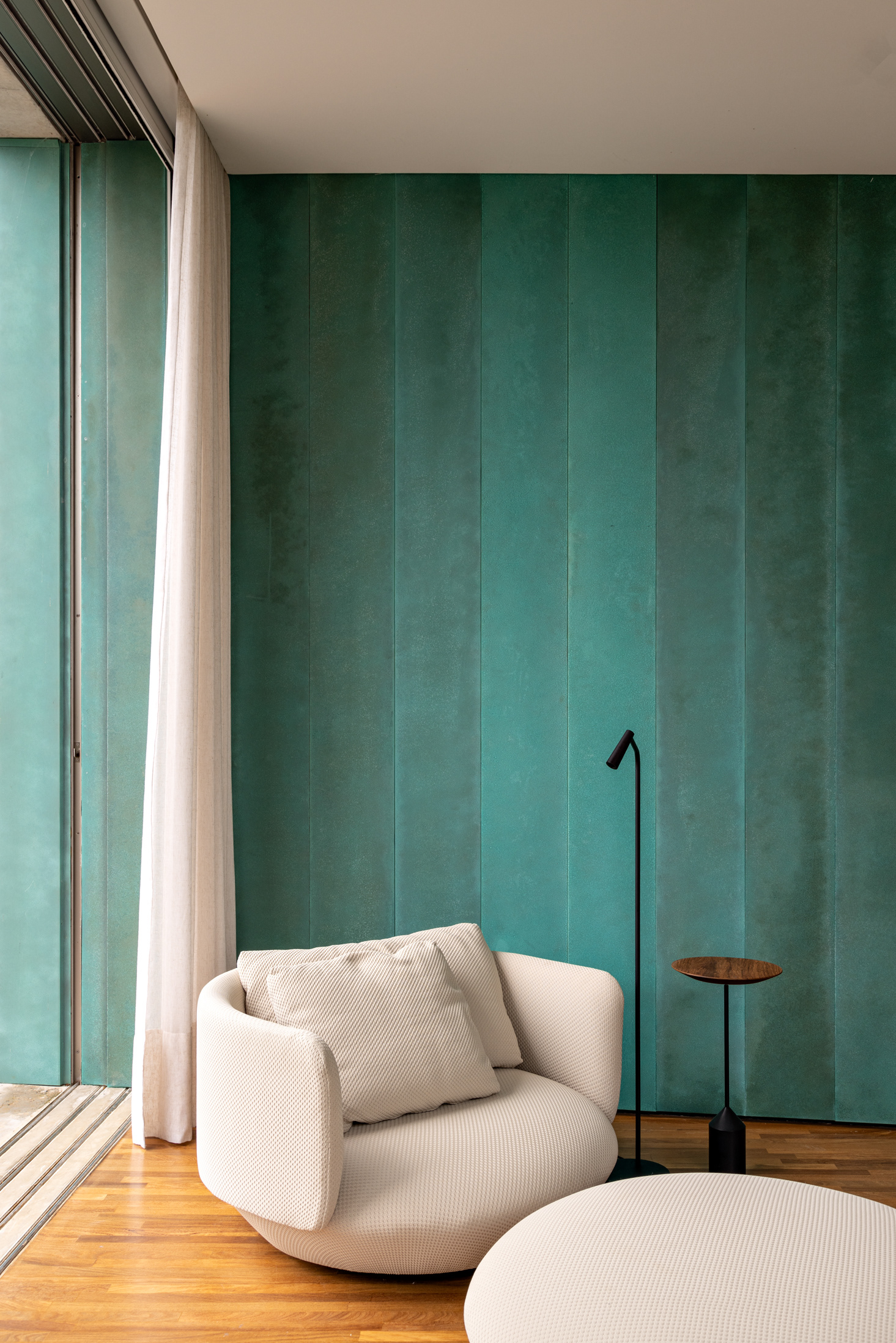There is, in the building, a kind of “core” composed of social elevators, toilet, service circulation and central ventilation and lighting well. The main circulation of the apartment occurs naturally around this central “core”, and because of the importance of this element in everyday life, we began to think about the composition of materials of the place by this element, coating it with greenish patinated copper plates. Between the plates, thin metal plates anchored to the walls and inserted between the copper plates become a bookcase that runs through the social and service area, organizing the doors of elevators, toilet, encompassing the wine cellar and becoming a support furniture of the kitchen area.