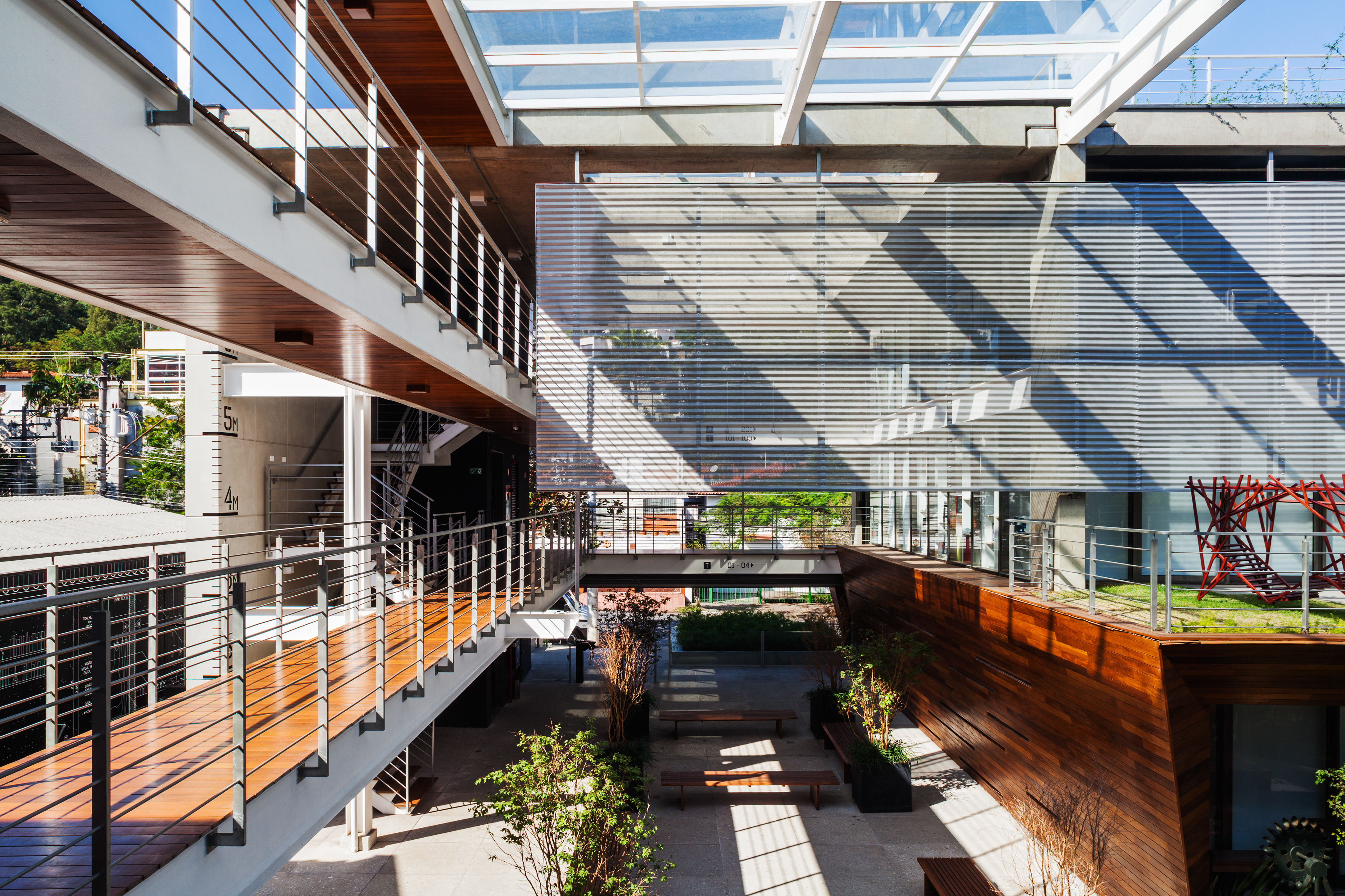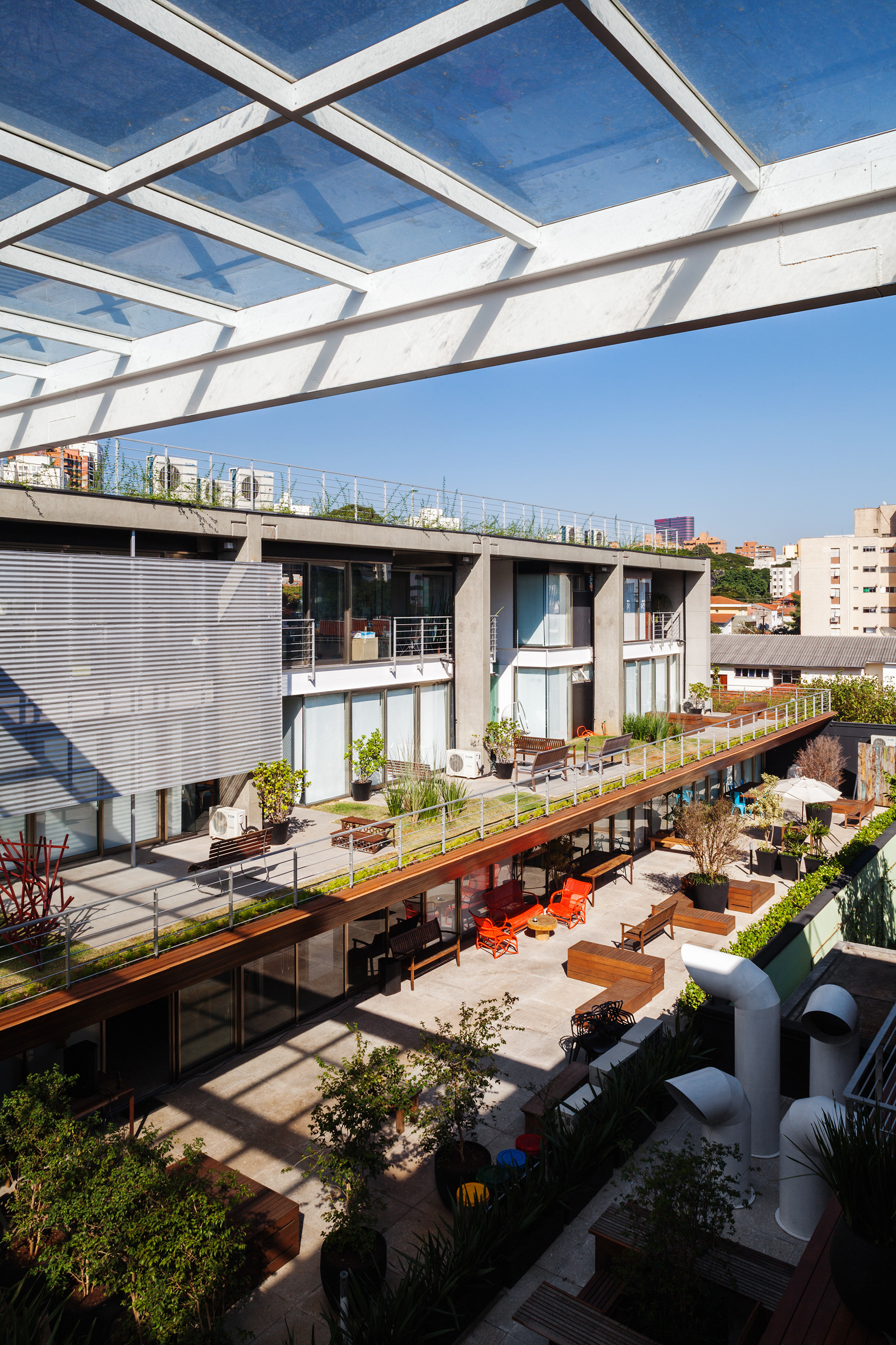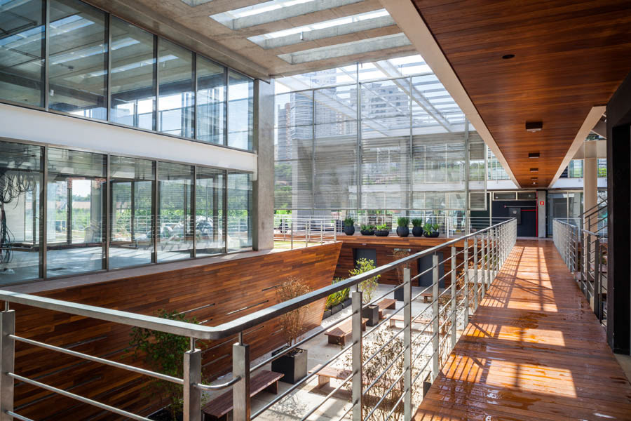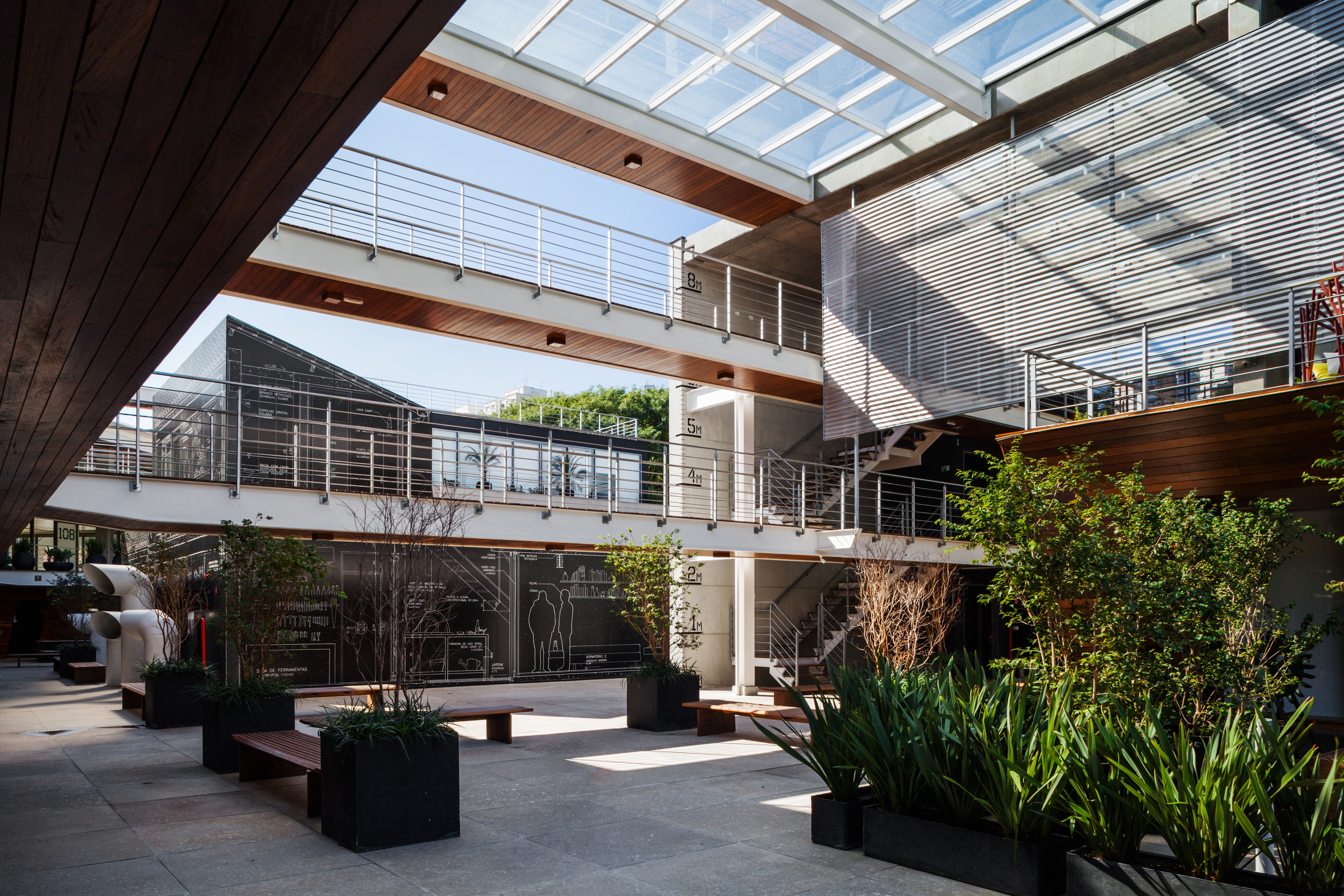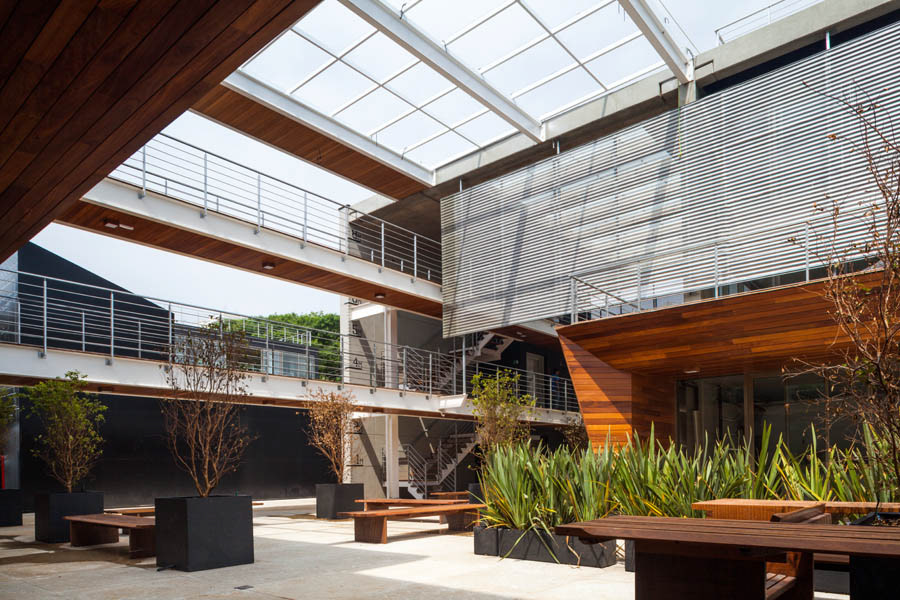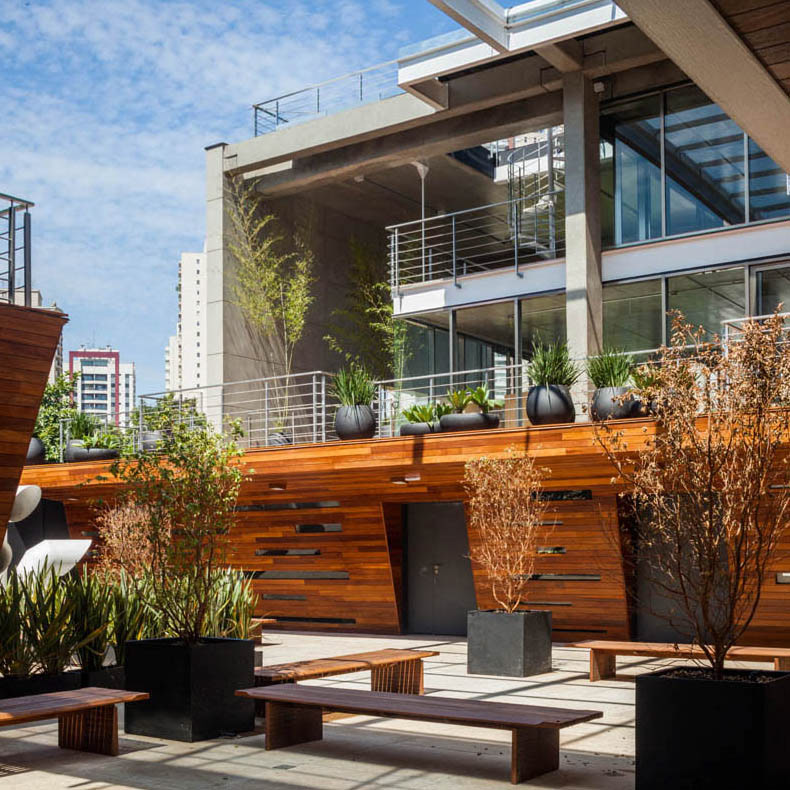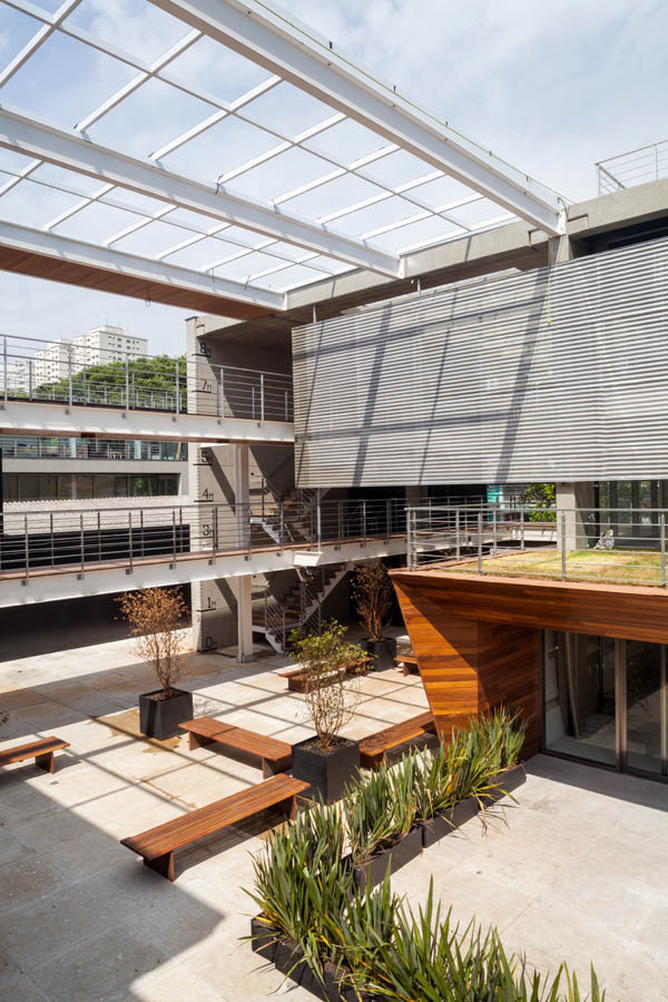 The mechanisms and organization described above allowed their very spatiality, rare in offices buildings in São Paulo. That spatiality seems to us extremely appropriate to the climate of São Paulo and particularly to the location, a bohemian and cultural neighborhood of Vila Madalena, in which the pedestrian scale and the act of living together among people is in the foreground. Aiming to reinforce theses issues, in the building there are many living areas, bicycle racks, common changing rooms and even a Café so that the users can meet each other and also work in the common areas, almost creating a micro-community. It is completely the opposite of modern office buildings, which highly segregate their users from each other.
