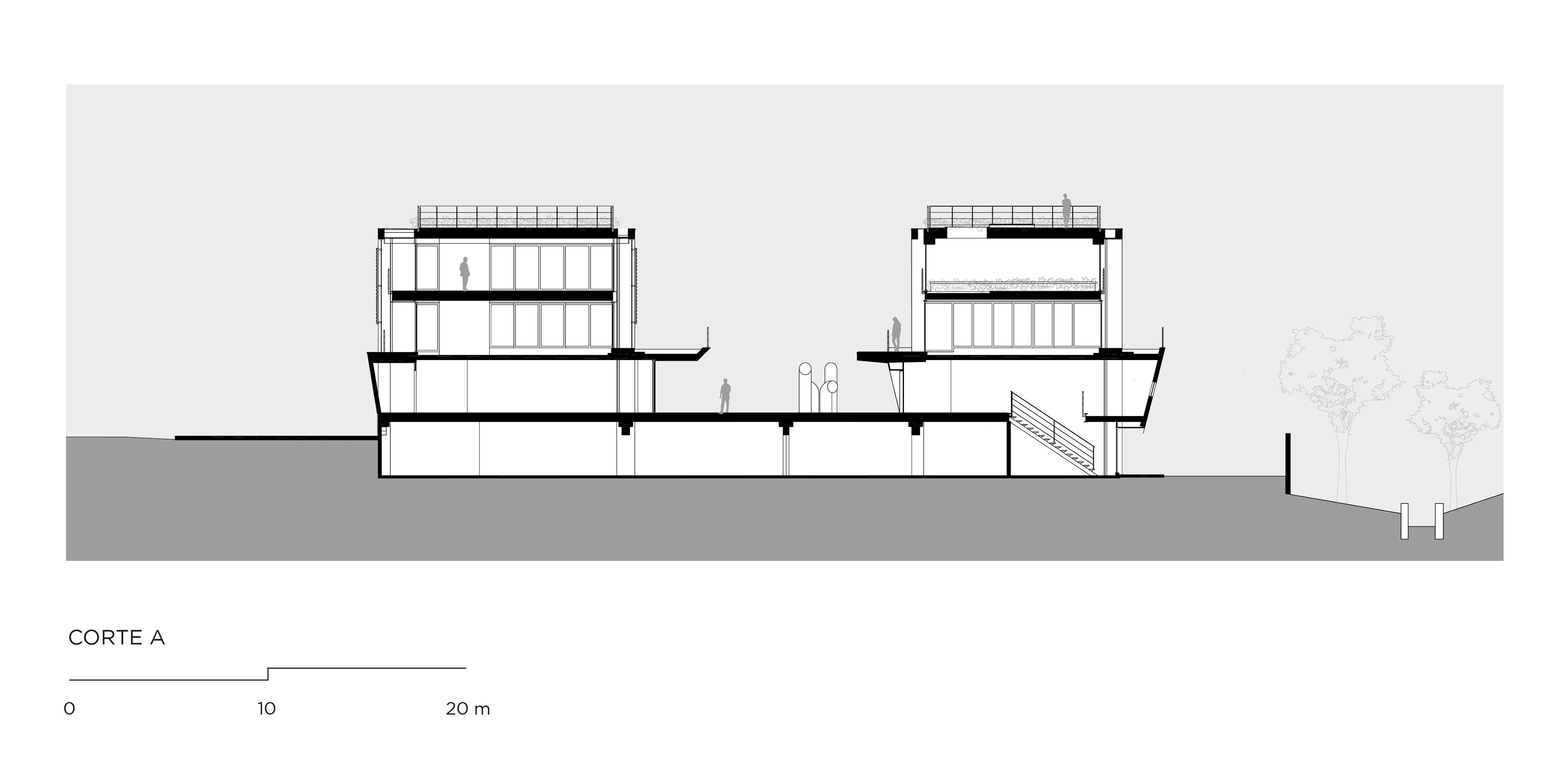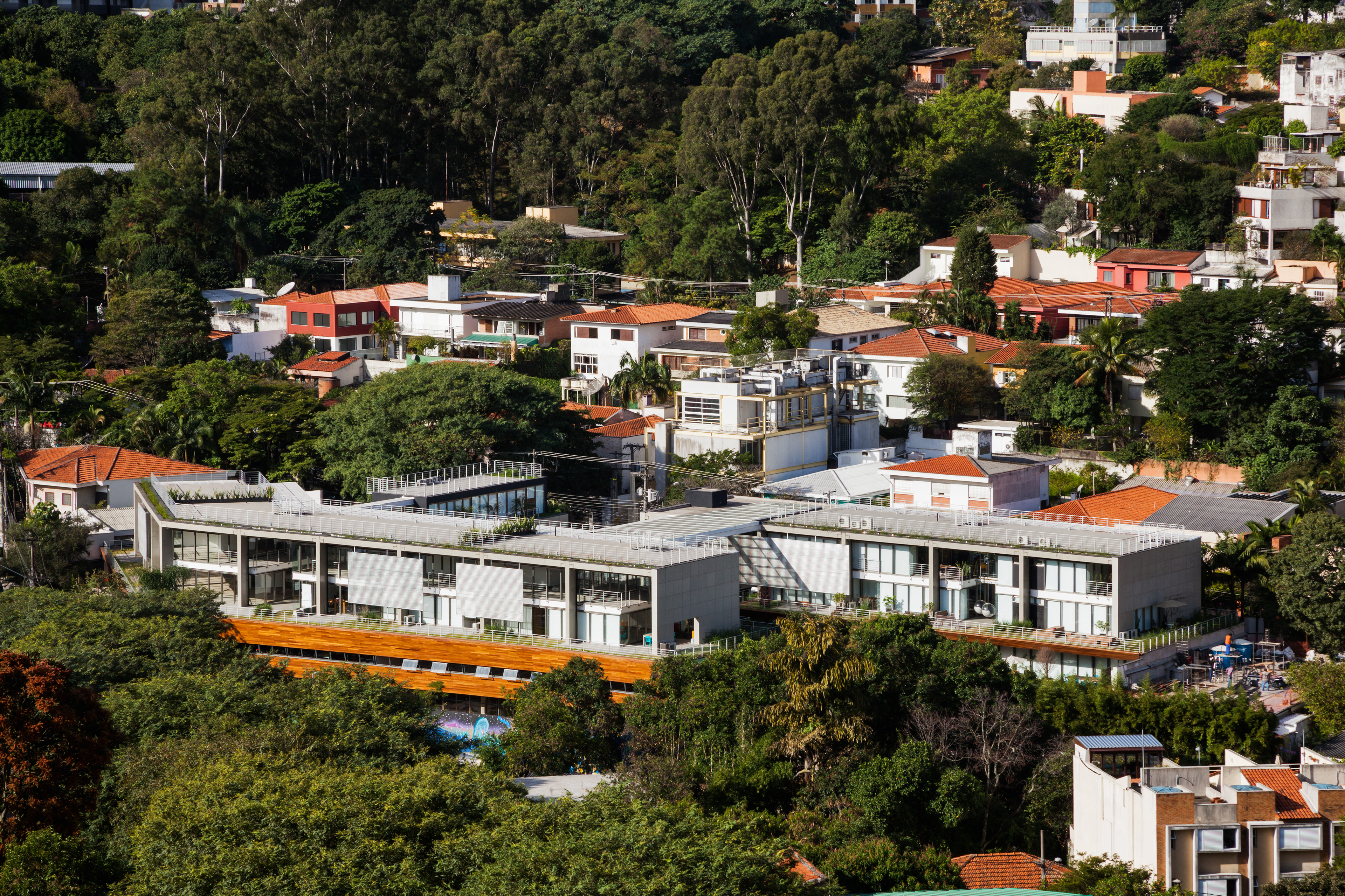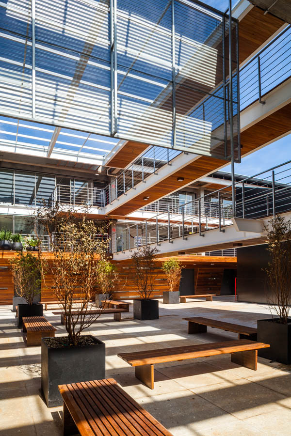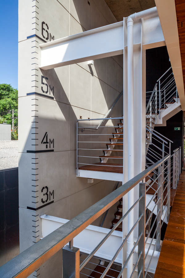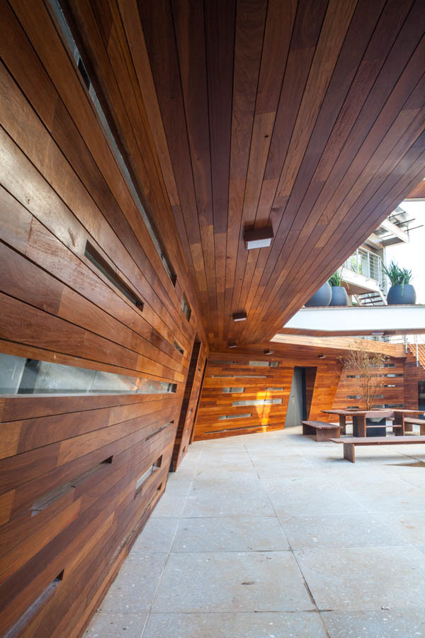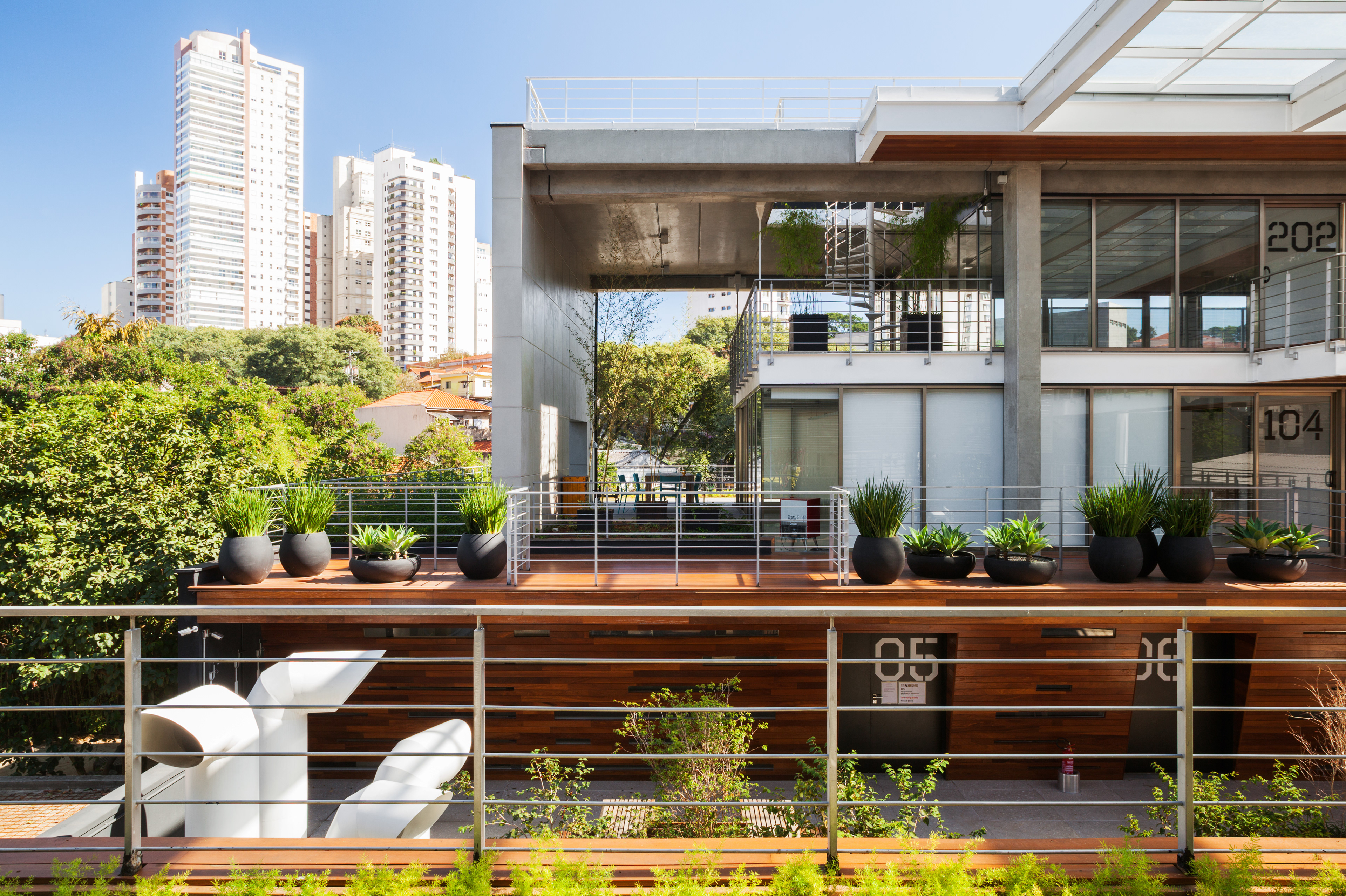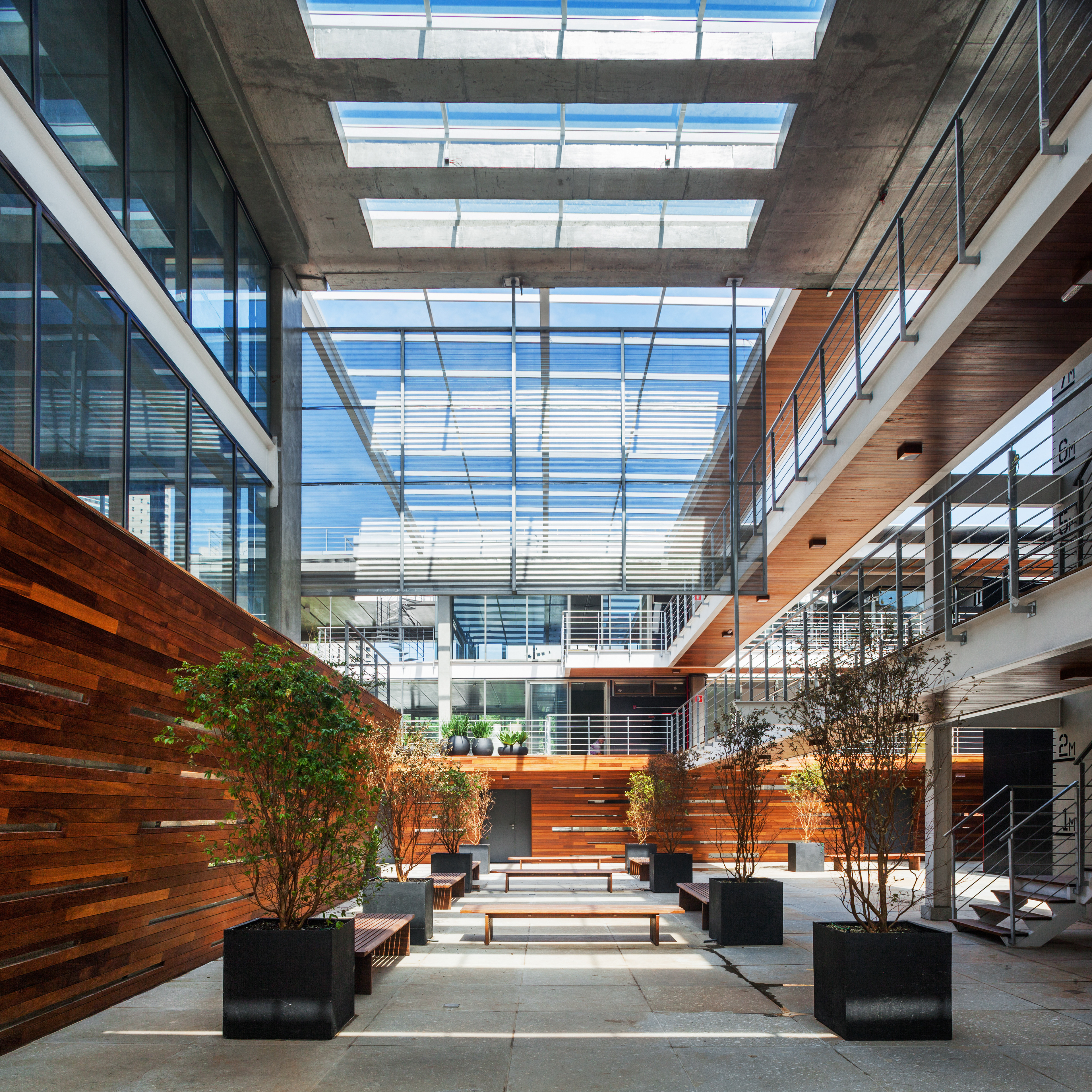 The mechanisms and organization described above allowed their very spatiality, rare in offices buildings in São Paulo. That spatiality seems to us extremely appropriate to the climate of São Paulo and particularly to the location, a bohemian and cultural neighborhood of Vila Madalena, in which the pedestrian scale and the act of living together among people is in the foreground. Aiming to reinforce theses issues, in the building there are many living areas, bicycle racks, common changing rooms and even a Café so that the users can meet each other and also work in the common areas, almost creating a micro-community. It is completely the opposite of modern office buildings, which highly segregate their users from each other.