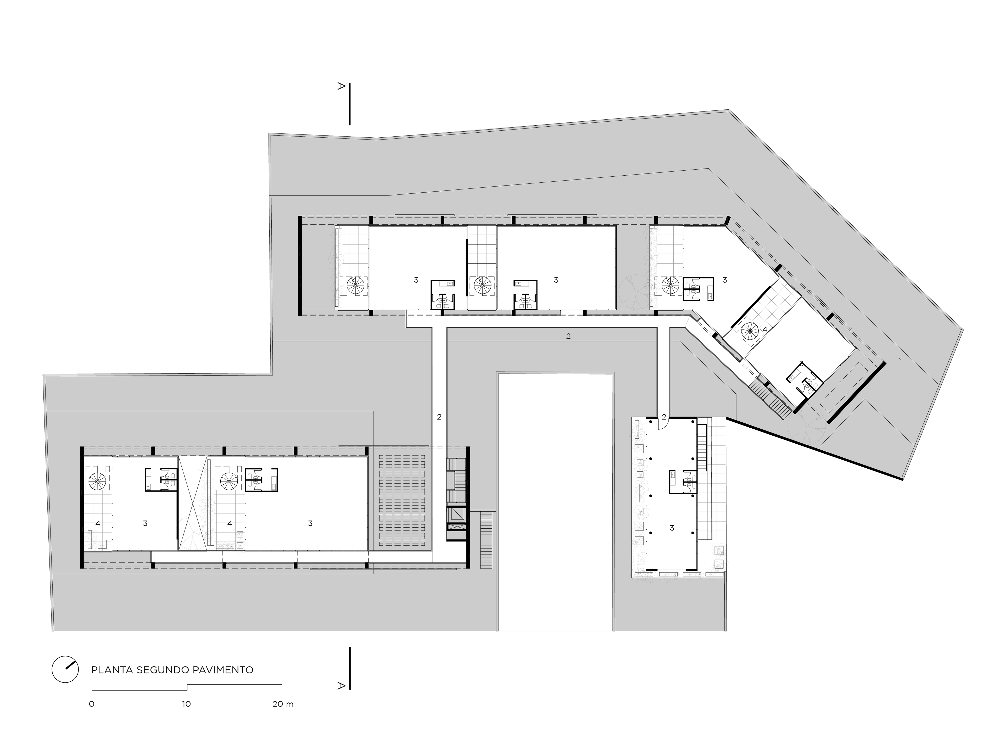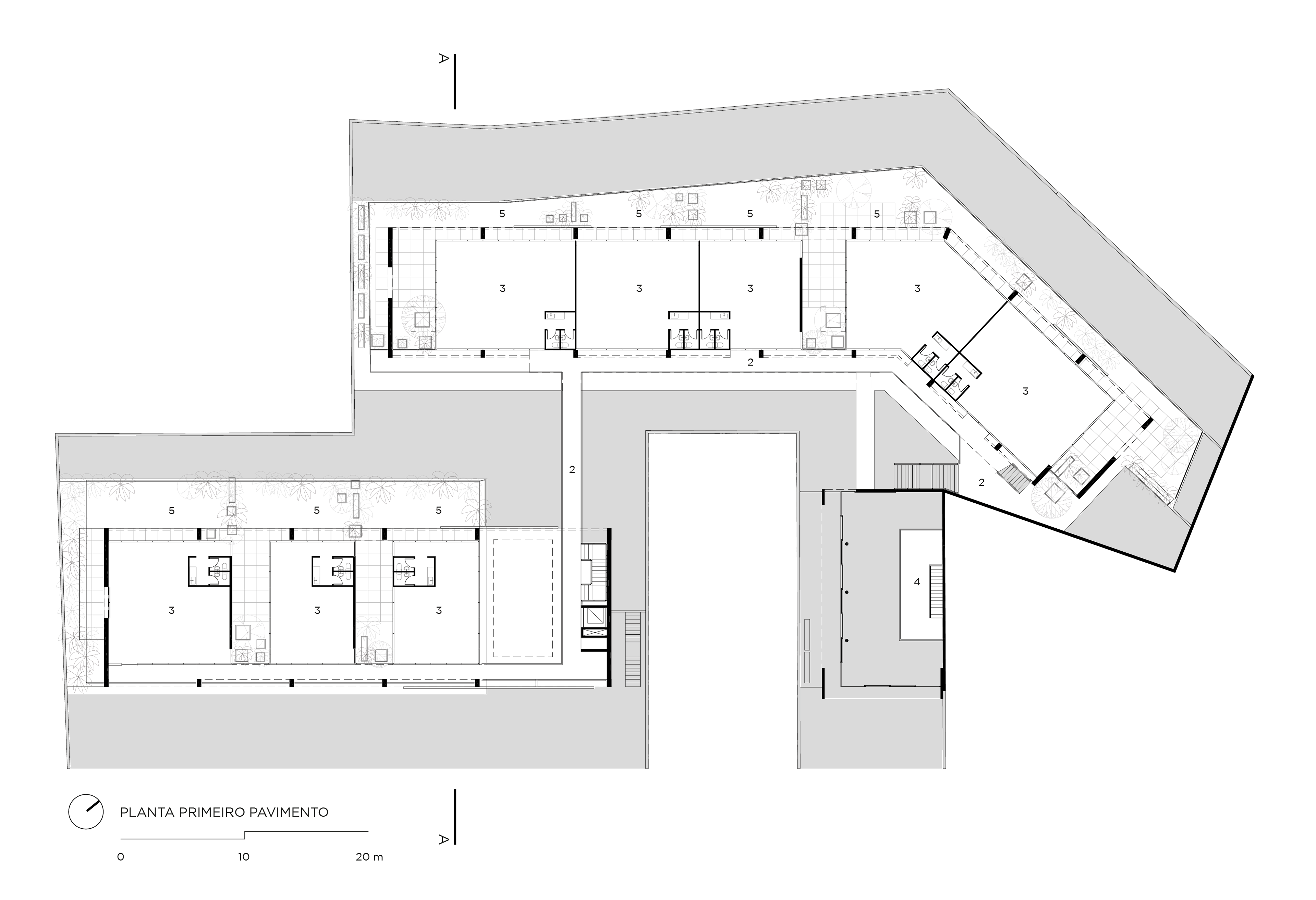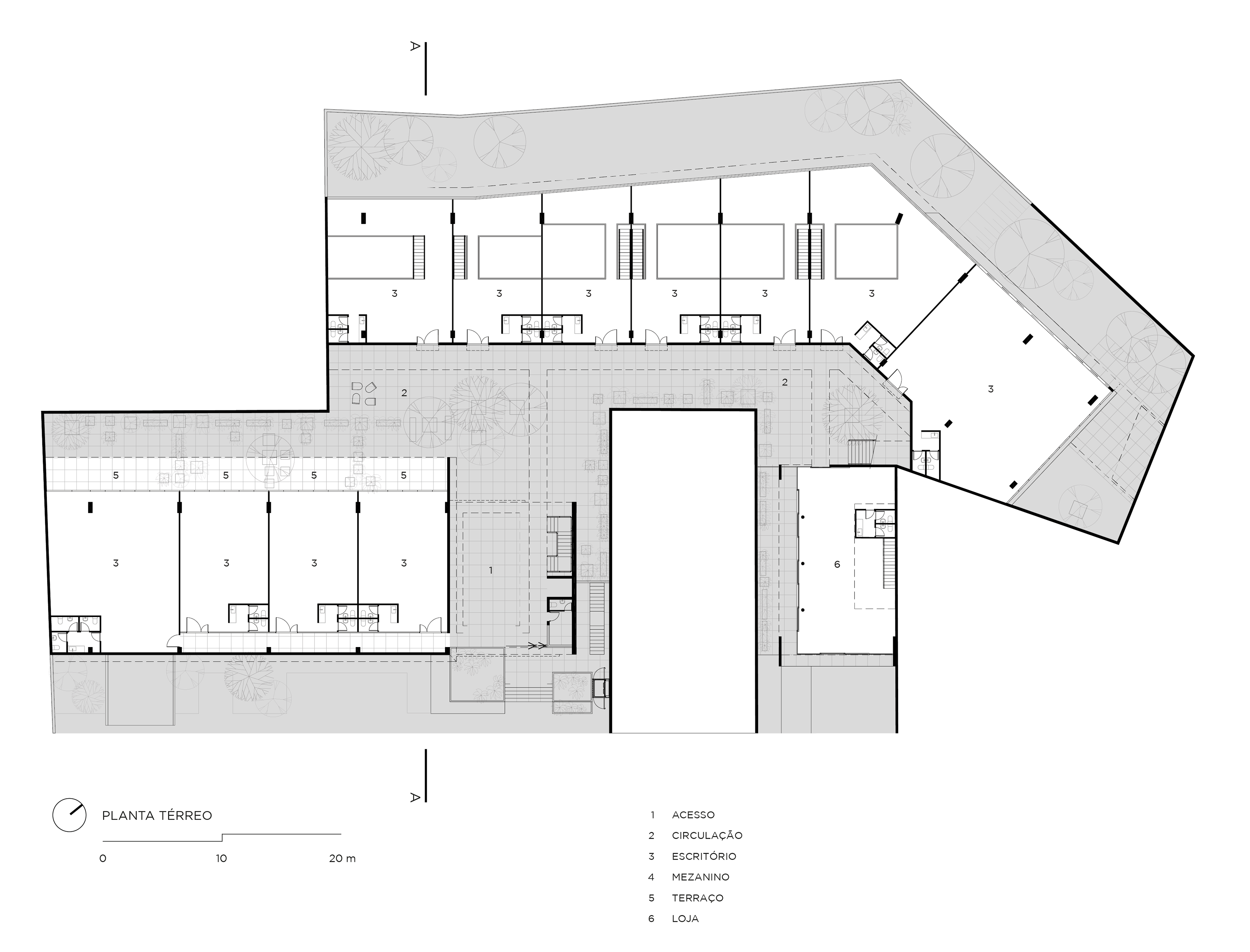 The height limit of buildings in the location, of only nine meters, led us to a horizontal solution, and the shape of the plot led us to split the building into two, frontal and posterior. The starting point of the project came up with the desire of creating an architecture which would enable the offices to have, besides their closed areas, generous porched spaces for outdoor meetings, and their own private gardens.