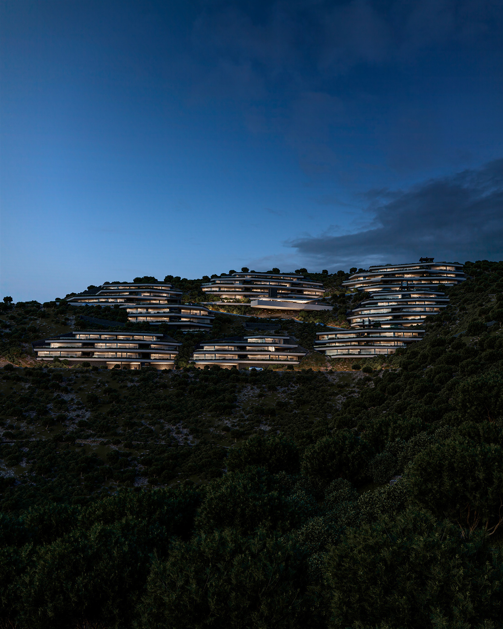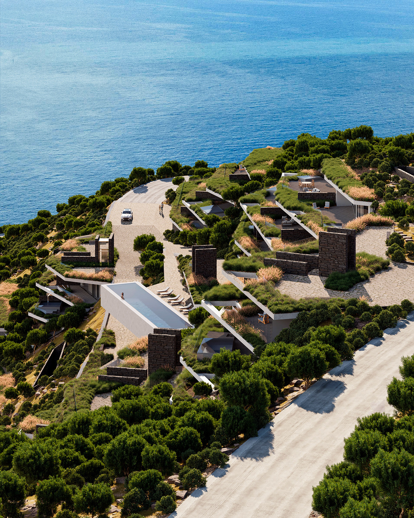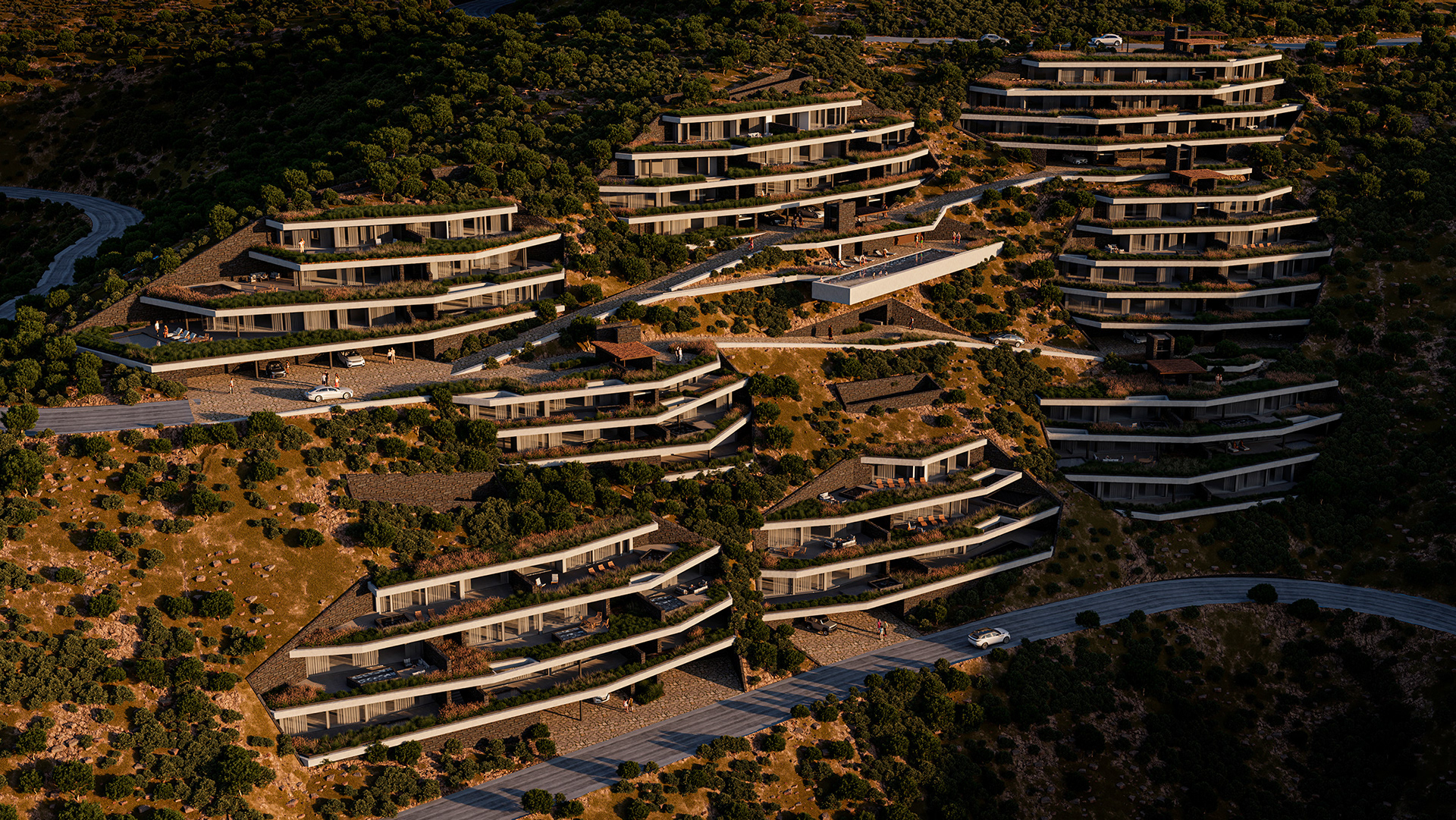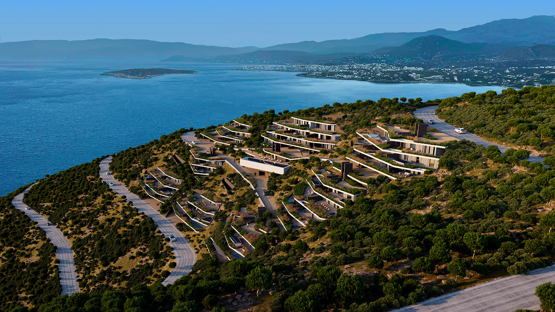 .On the steep slopes of Elounda, along the northern coast of the island of Crete, Greece, this apartment complex is inserted in a very particular way.