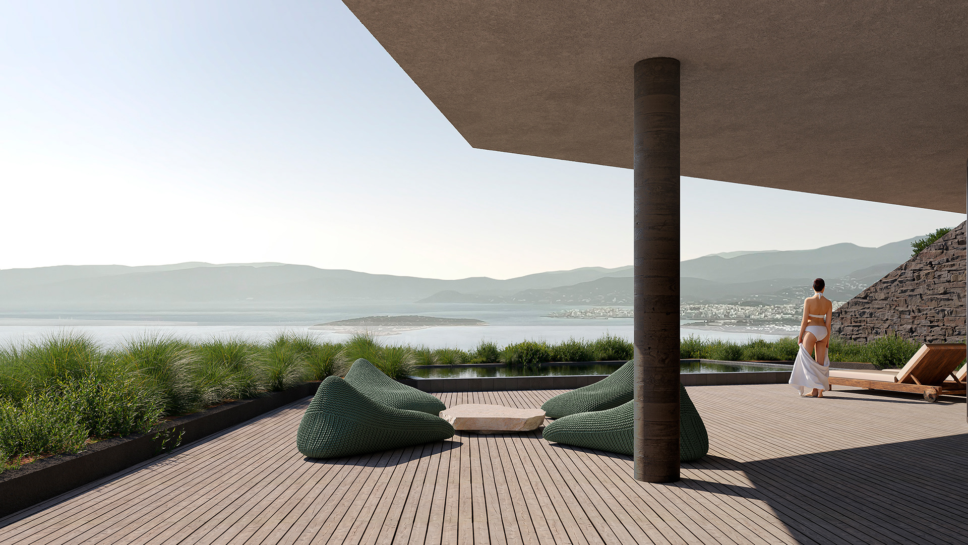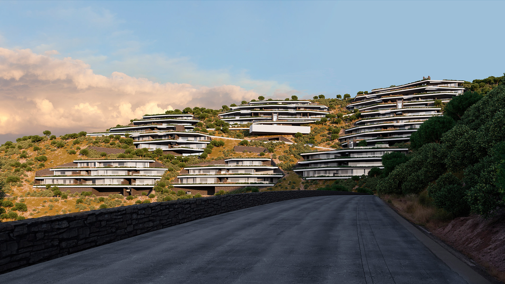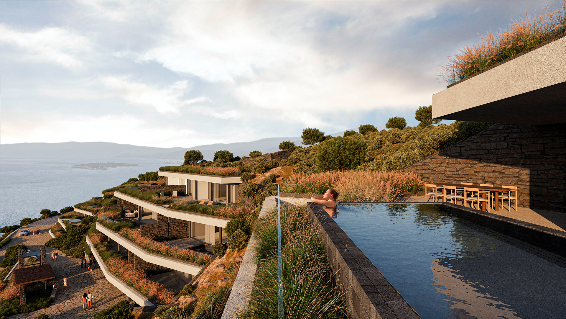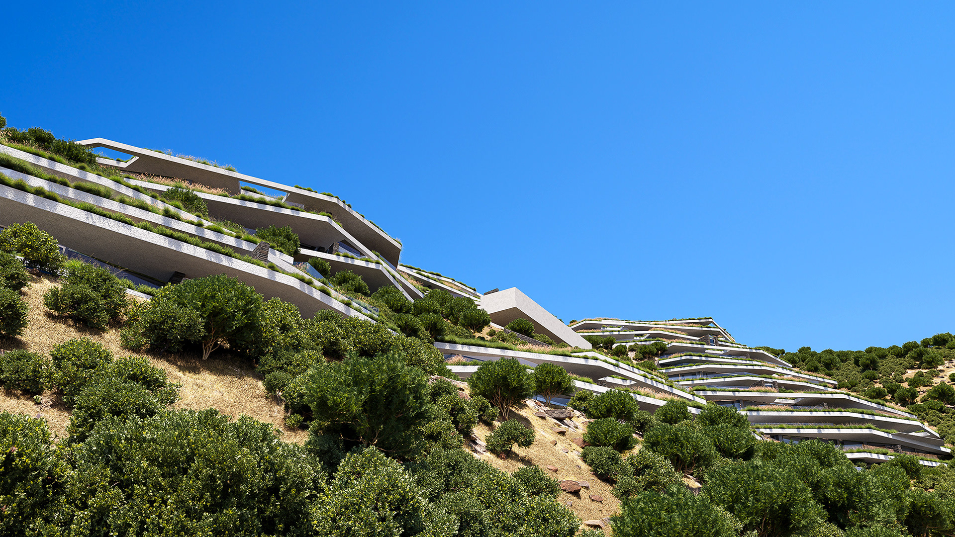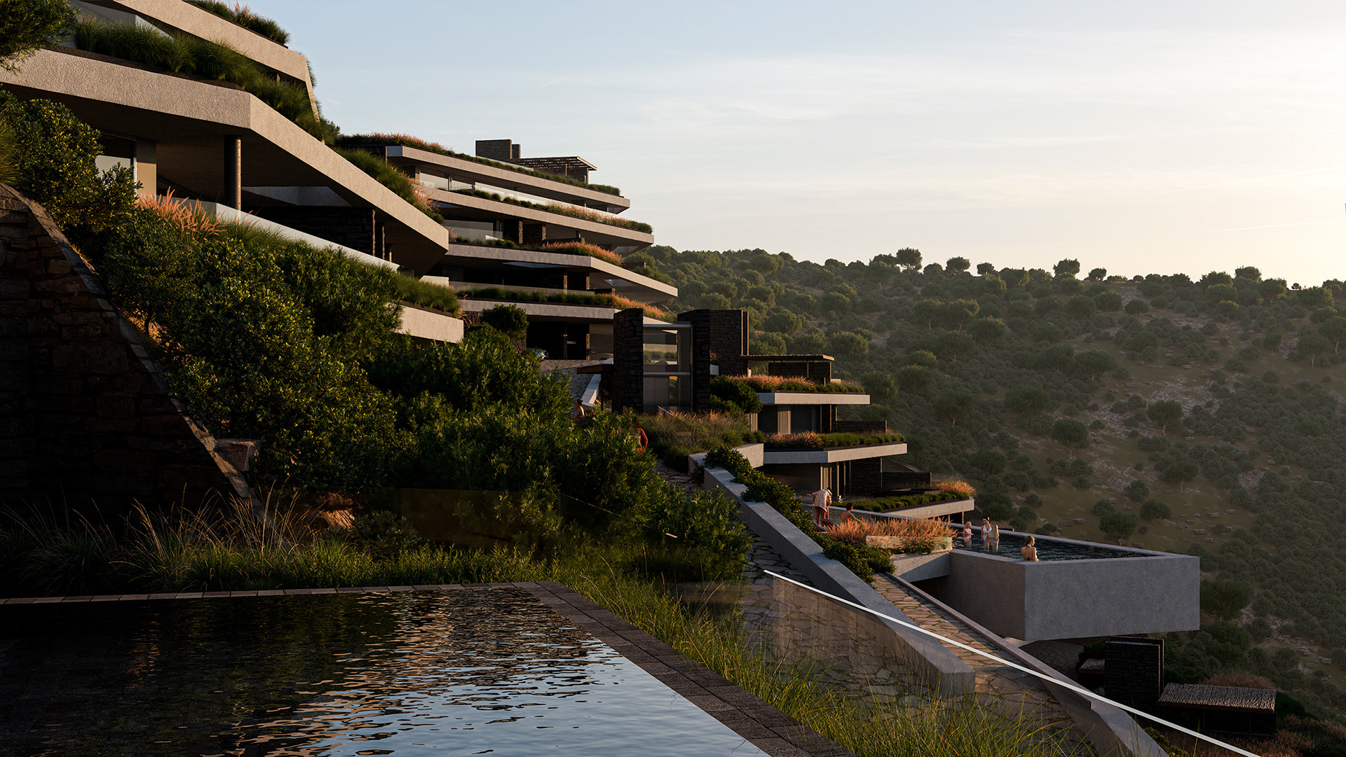 .On the steep slopes of Elounda, along the northern coast of the island of Crete, Greece, this apartment complex is inserted in a very particular way.