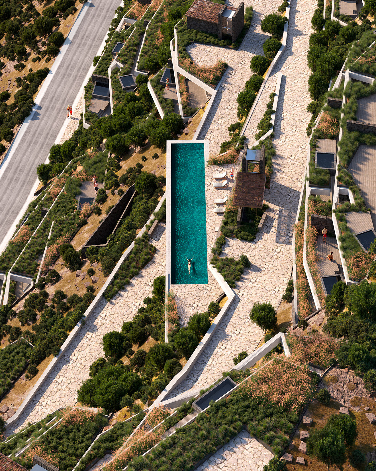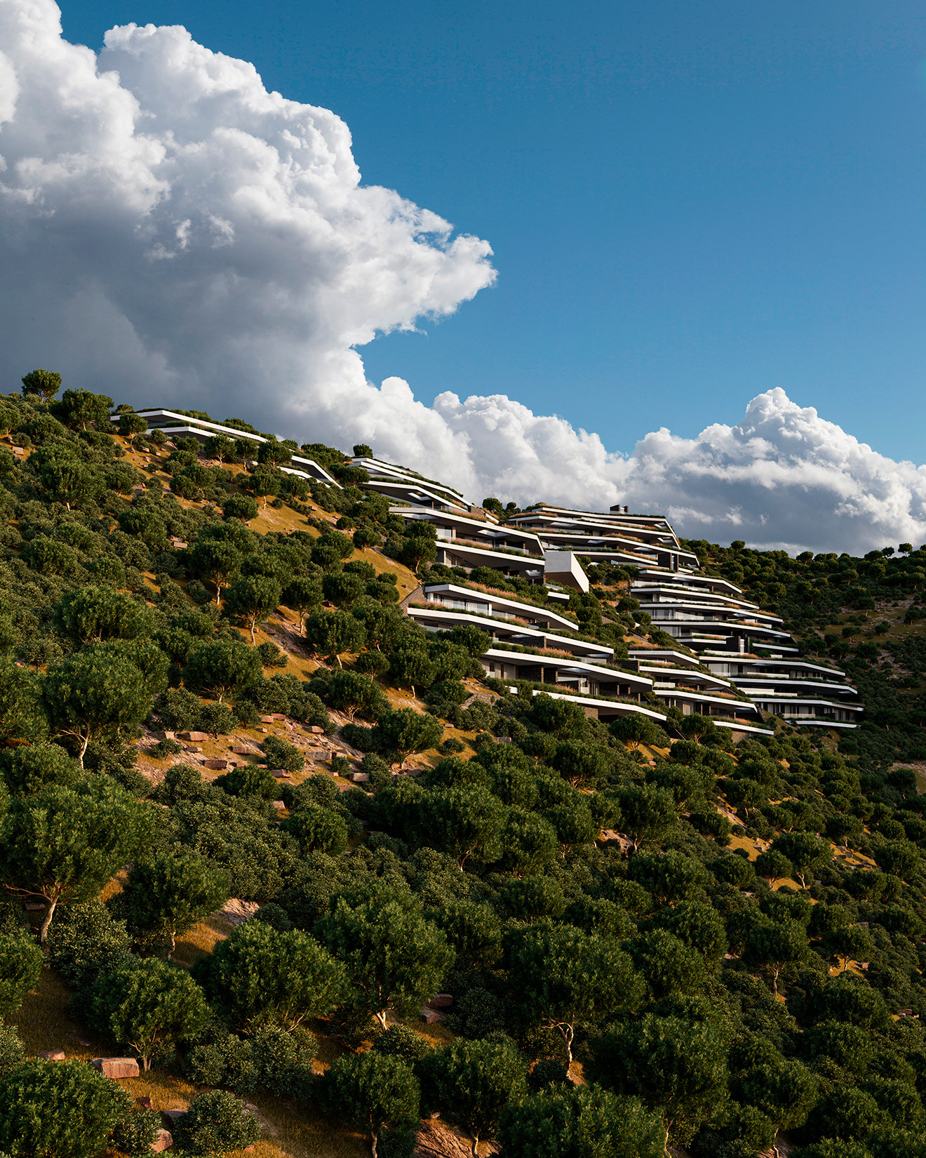 These eight independent clusters adapt to the topography in an efficient yet intriguing way: instead of treating each building as an object placed on top of the terrain, we chose to excavate and merge them into the rock. As if carved out with a giant “scoop,” each hollow created accommodates one cluster of apartments. The exposed rock, forming the rear boundary of the small buildings, becomes an integral part of the construction.