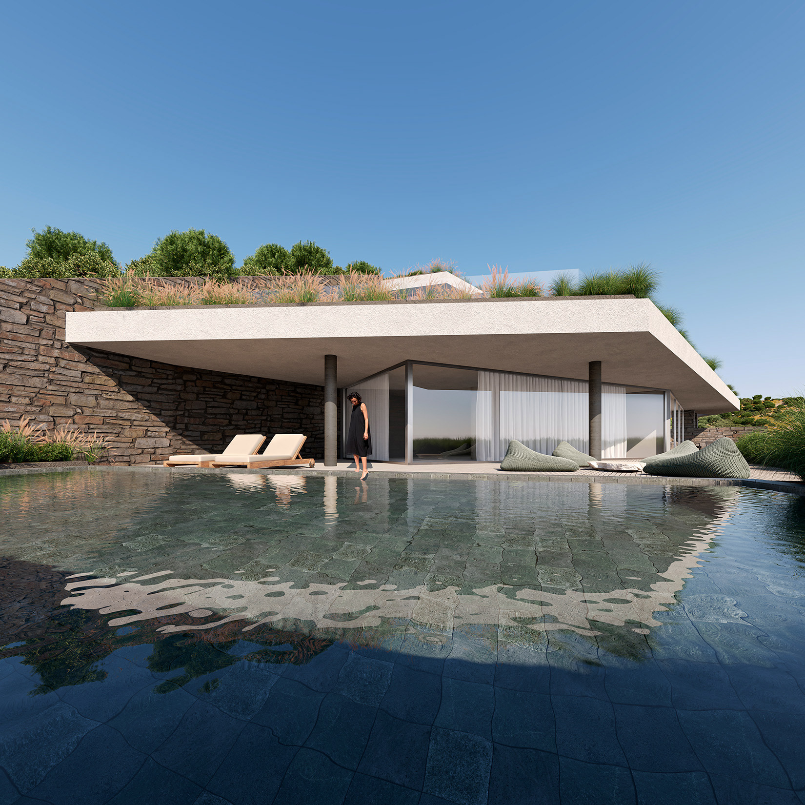 These flat, white elements adjust to each niche carved into the rock and are the main visible feature from the outside—yet, when seen from the apartments, they virtually disappear among the vegetation. Different in size, number, and shape, the slabs give each cluster its uniqueness while still belonging to the whole. Between them, the original terrain with its exposed stones and arid vegetation plays the same role as the excavated rock: building and landscape form an inseparable whole.