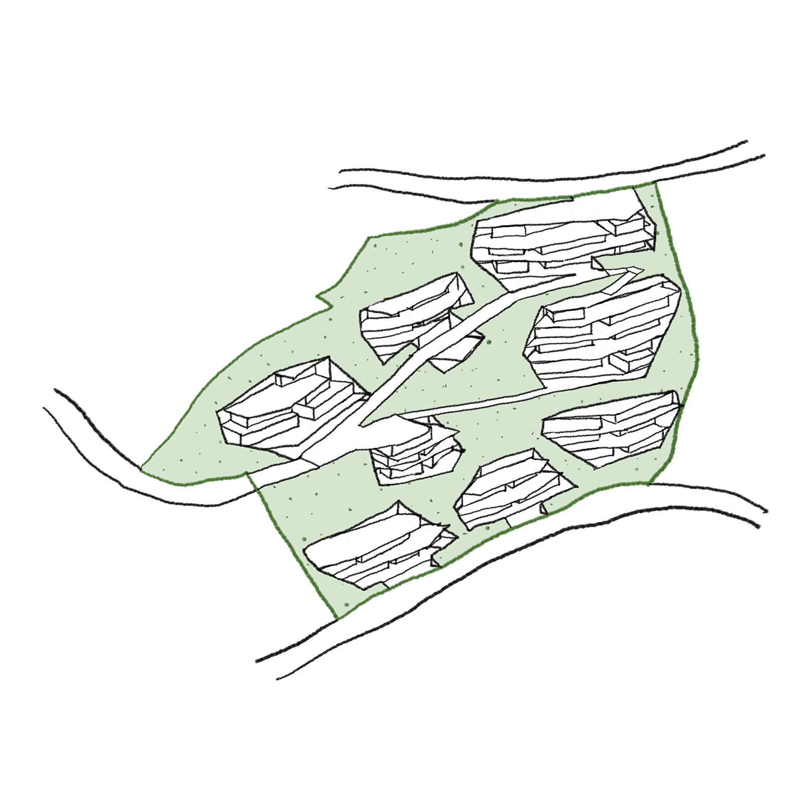 Seeking to avoid the construction of a single large building housing the 41 planned units, while also meeting the challenge of complying with the maximum building height of 10.75m, the main concept was to organize the apartments into separate clusters. Beyond establishing a gentler relationship with the site, this also provided a solution for the vertical circulation within each cluster.