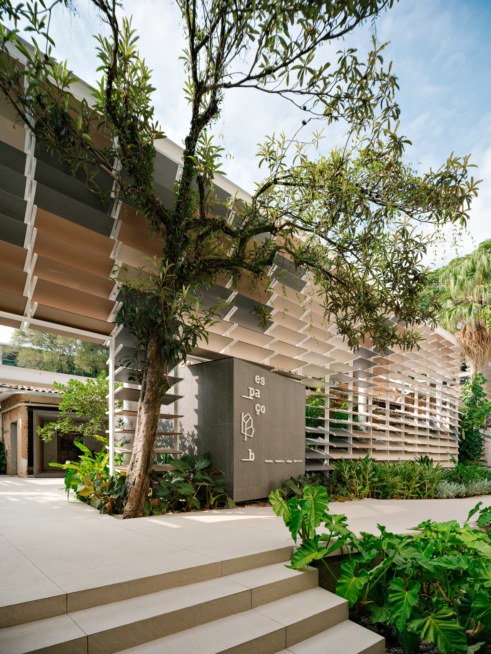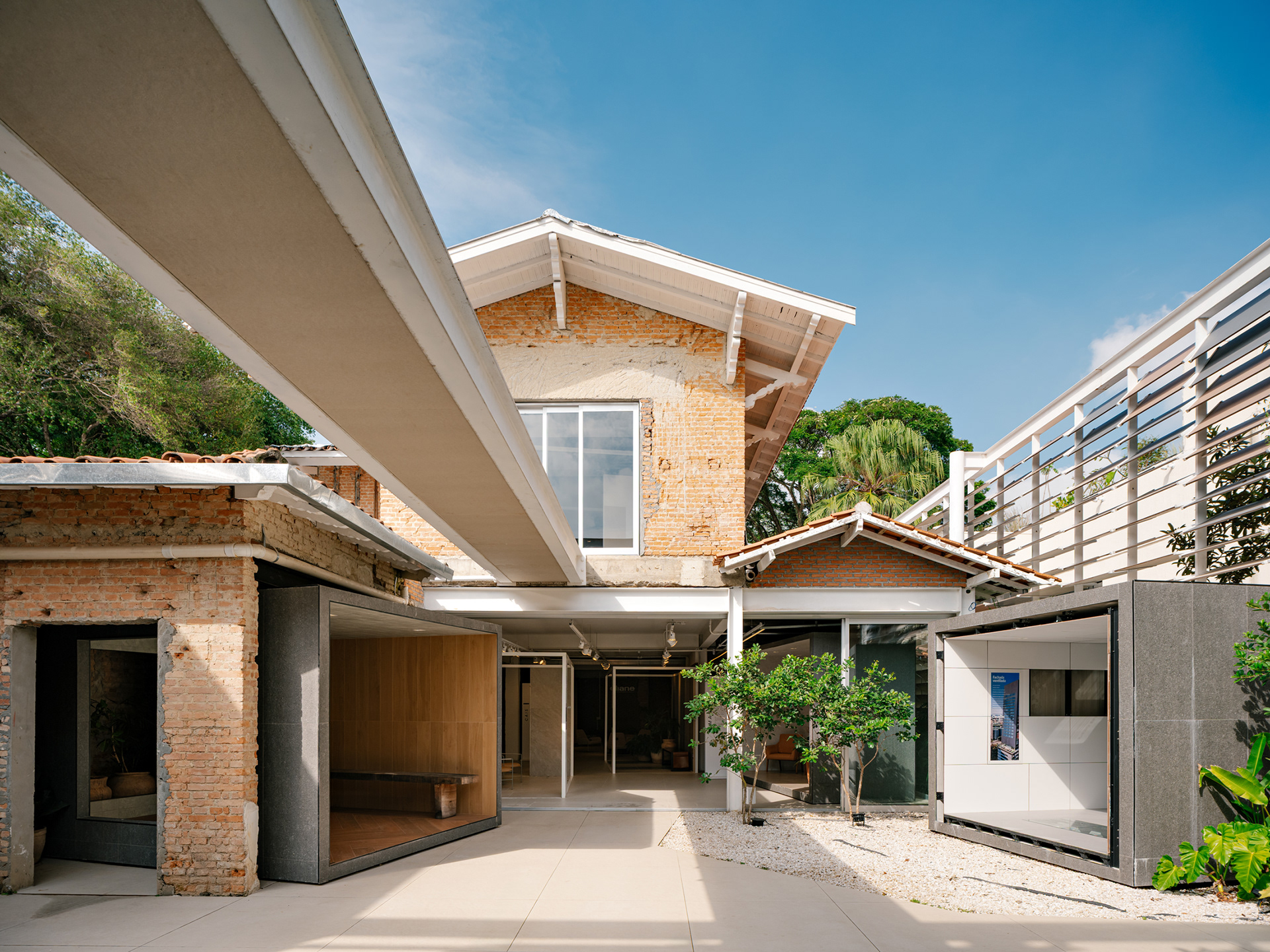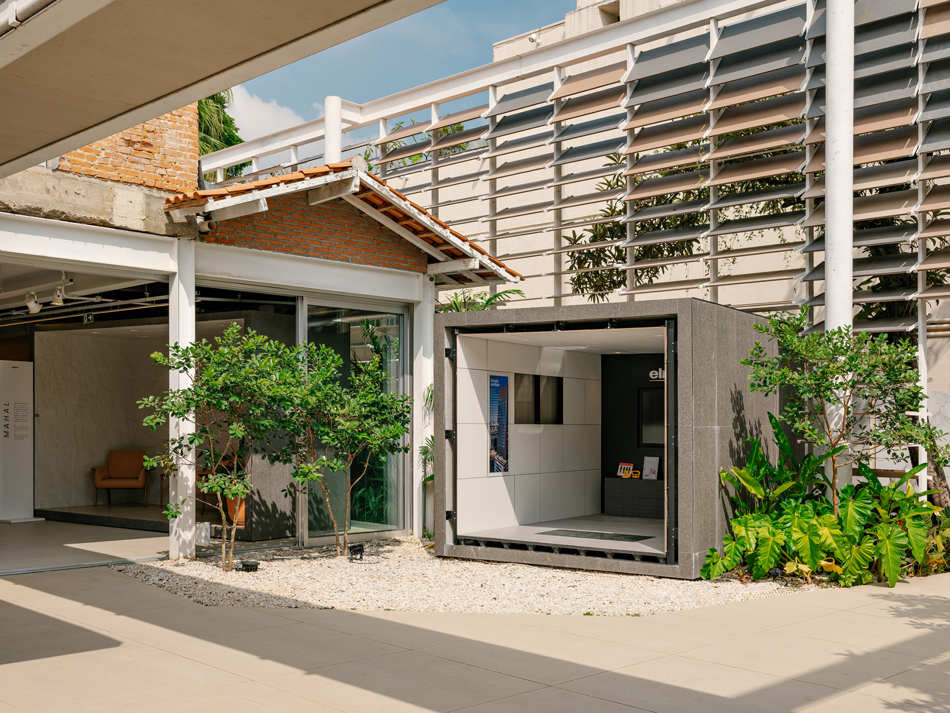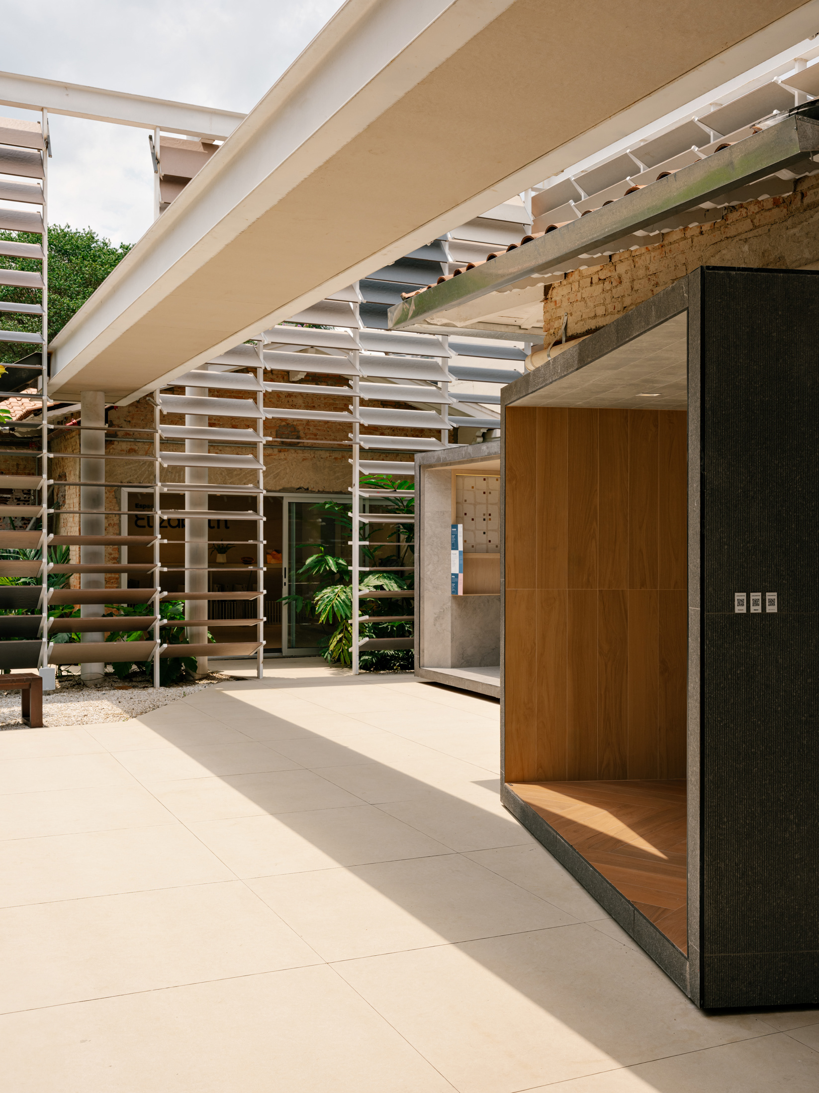 To enhance this approach of reclaiming and valuing the old, a large rear patio was created, and monumental porcelain brise-soleils were installed, reaching 7 meters in height. Composed of hundreds of angled pieces in colors reminiscent of a macaw, the brise envelops the entire structure, separating the annex—used for business—from the rest of the ensemble. Made using pieces from the Sílica collection, developed in collaboration between FGMF and Eliane, this architectural element explores the use of porcelain beyond floors and walls, showcasing its aesthetic and functional versatility.