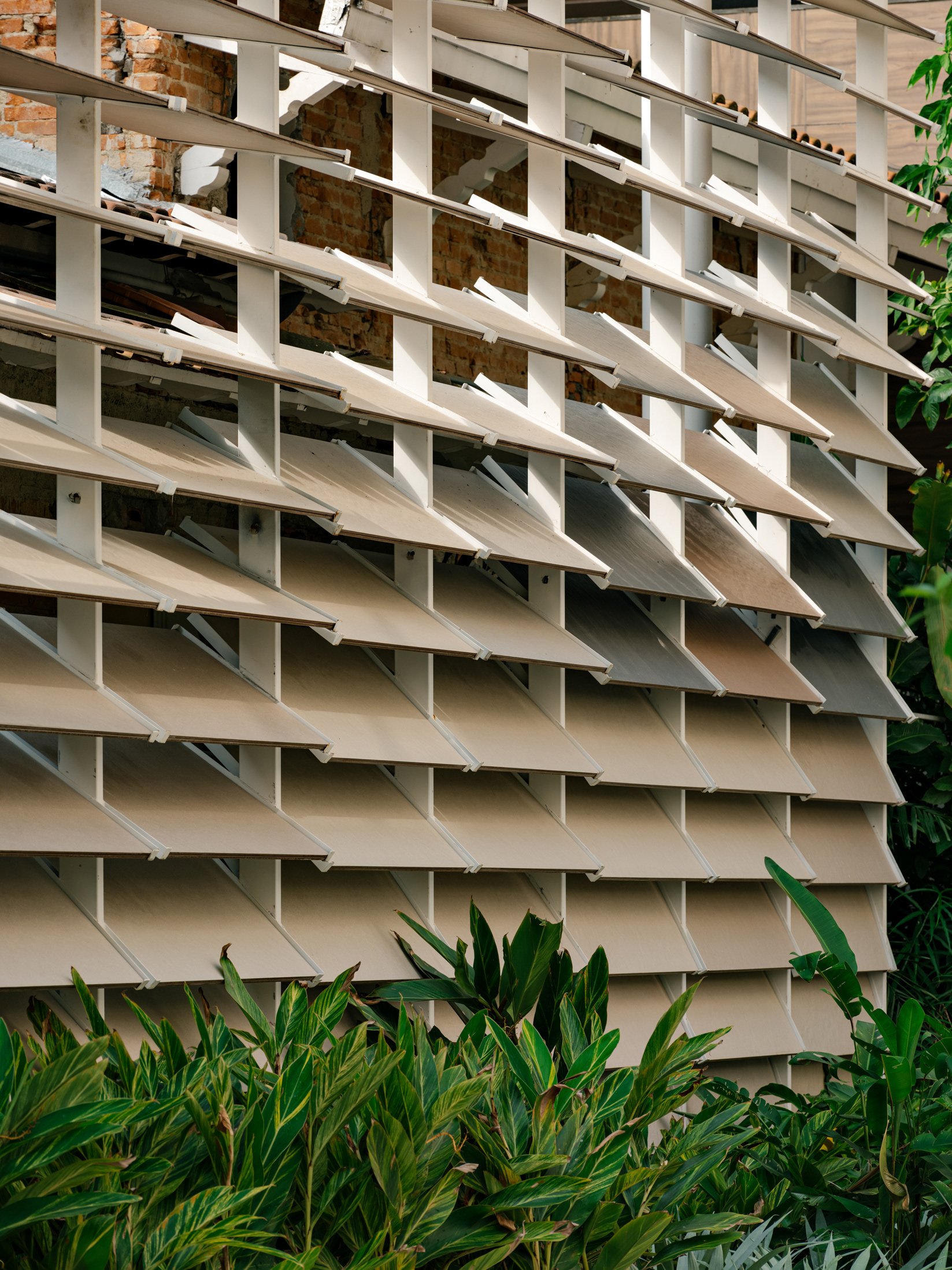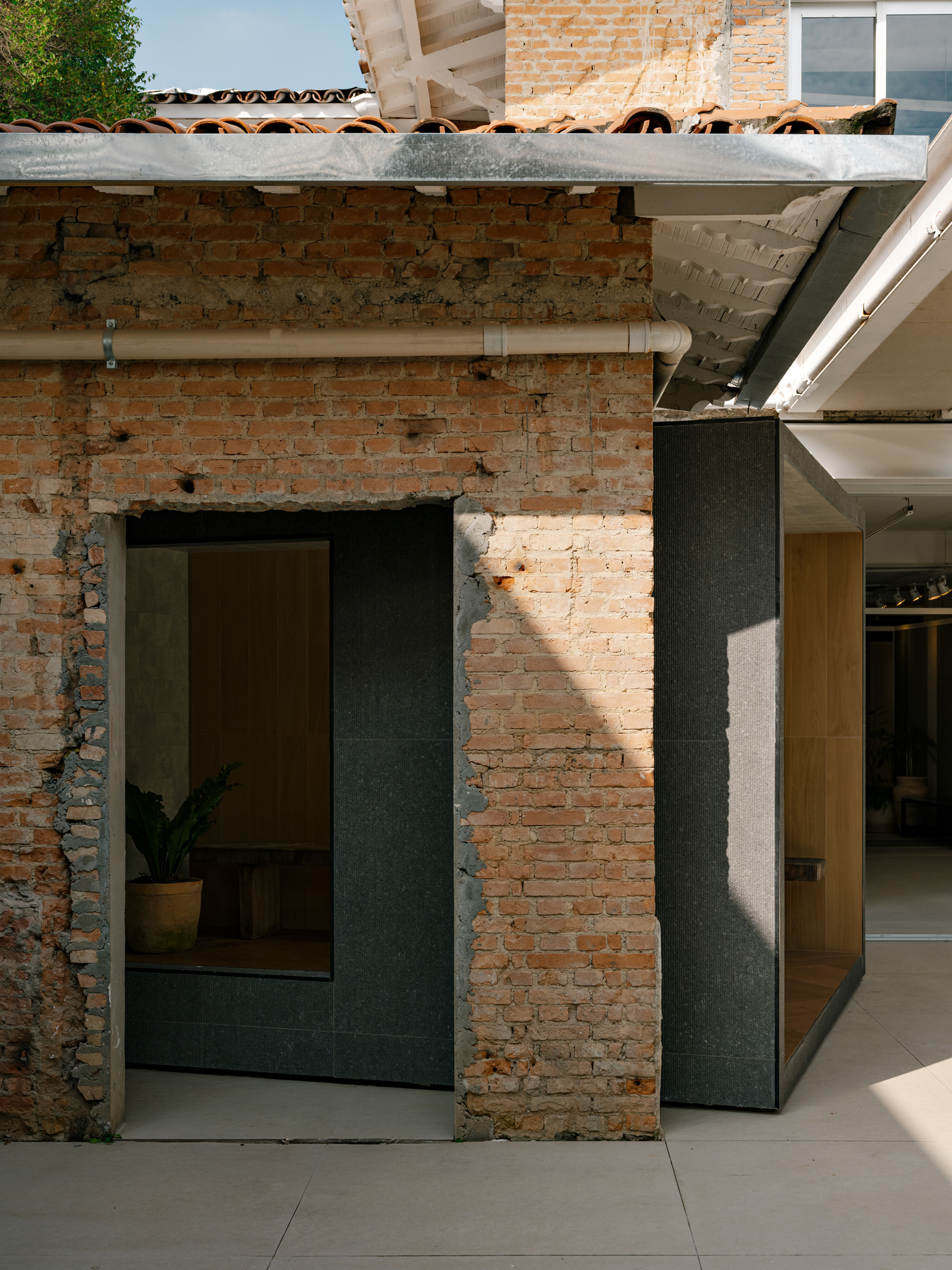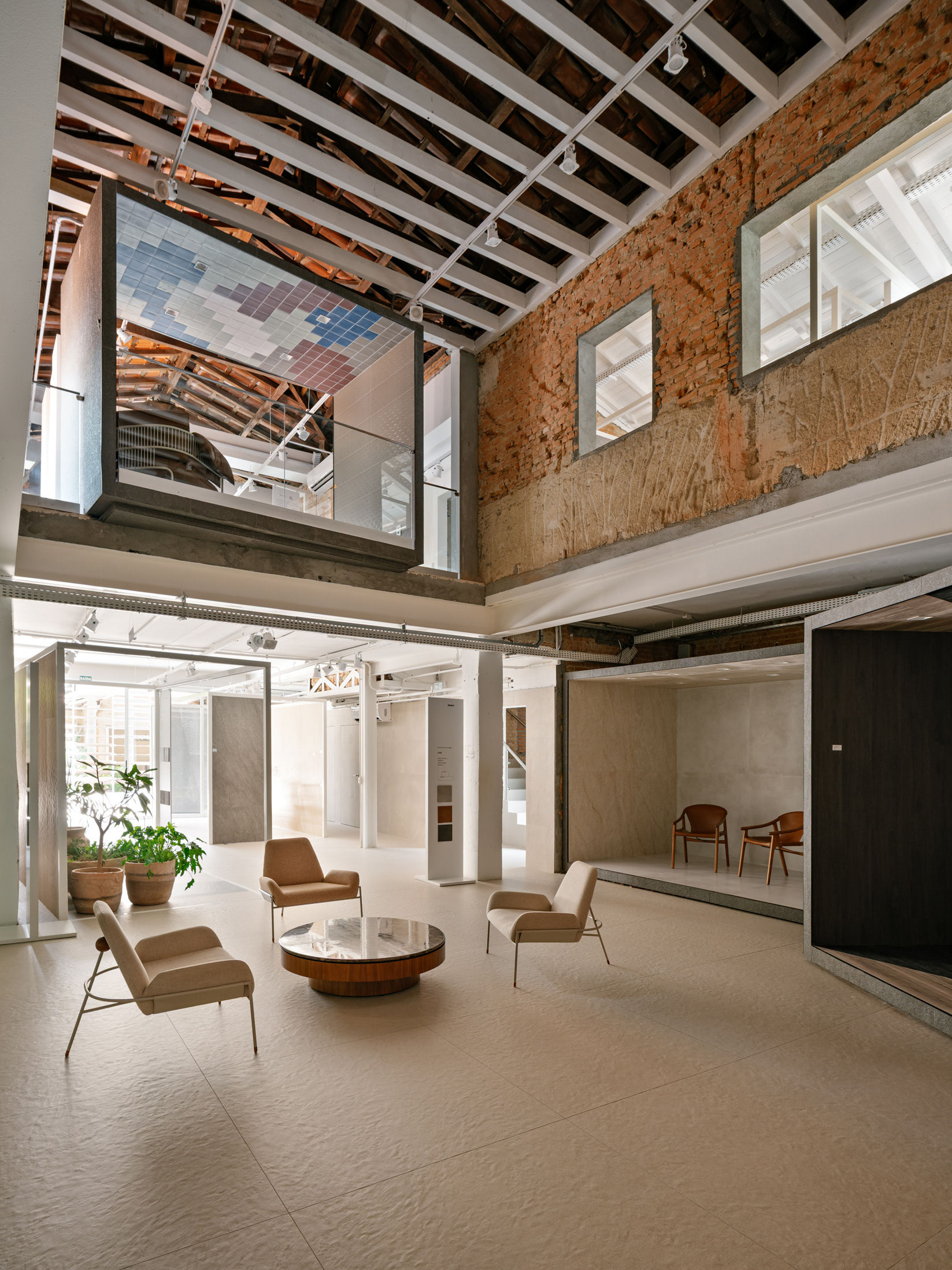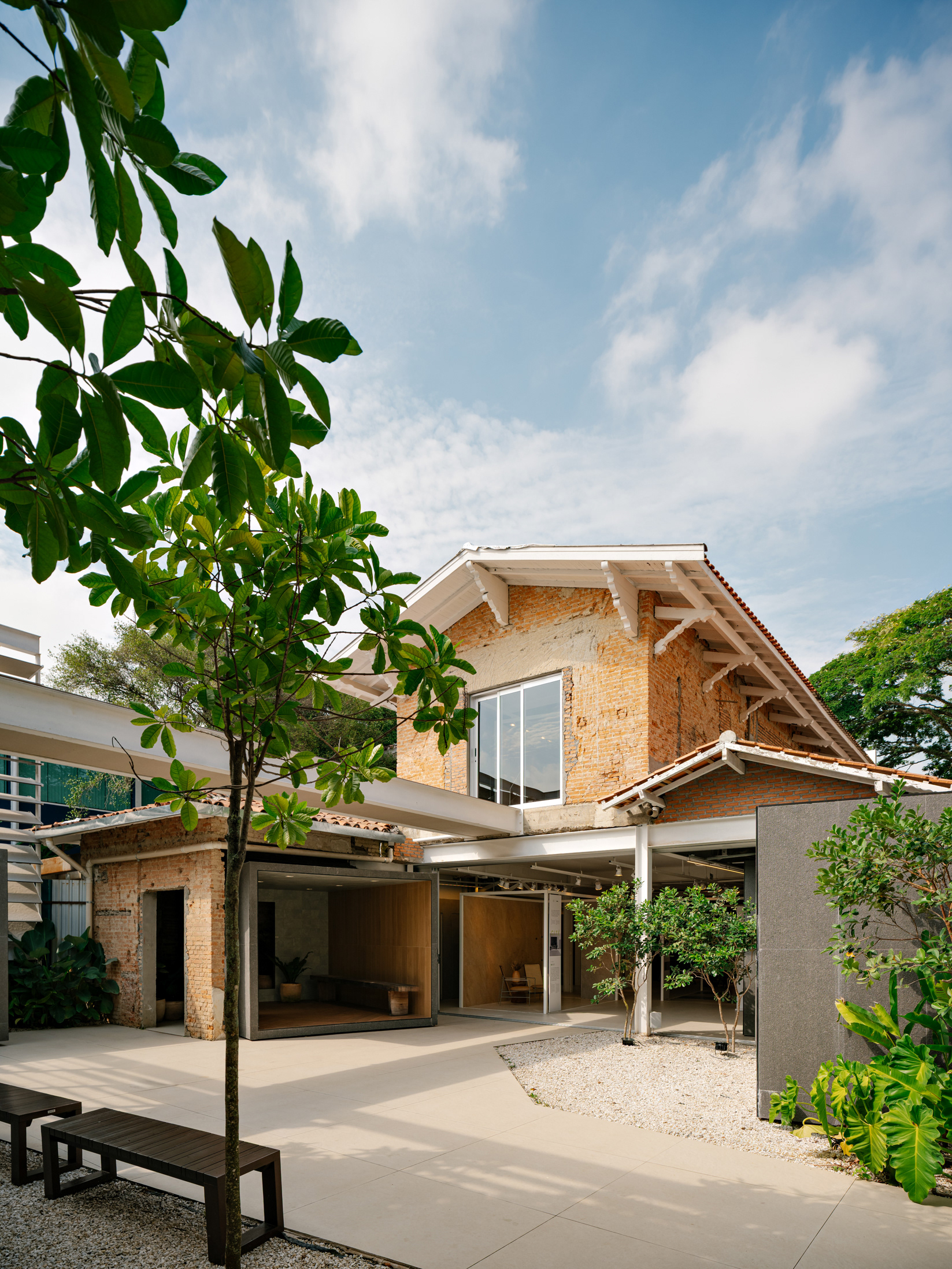 To enhance this approach of reclaiming and valuing the old, a large rear patio was created, and monumental porcelain brise-soleils were installed, reaching 7 meters in height. Composed of hundreds of angled pieces in colors reminiscent of a macaw, the brise envelops the entire structure, separating the annex—used for business—from the rest of the ensemble. Made using pieces from the Sílica collection, developed in collaboration between FGMF and Eliane, this architectural element explores the use of porcelain beyond floors and walls, showcasing its aesthetic and functional versatility.