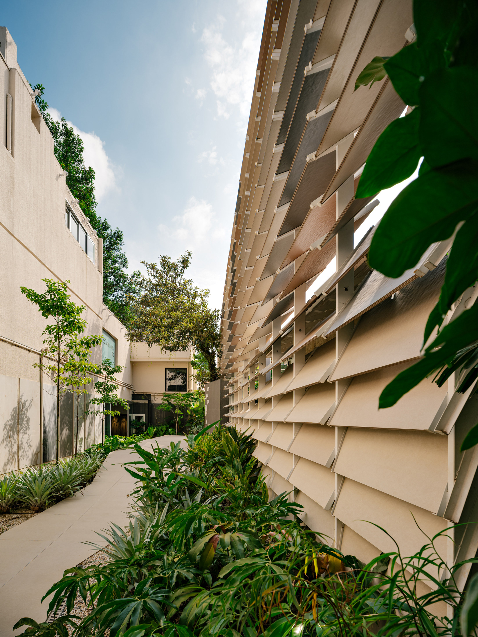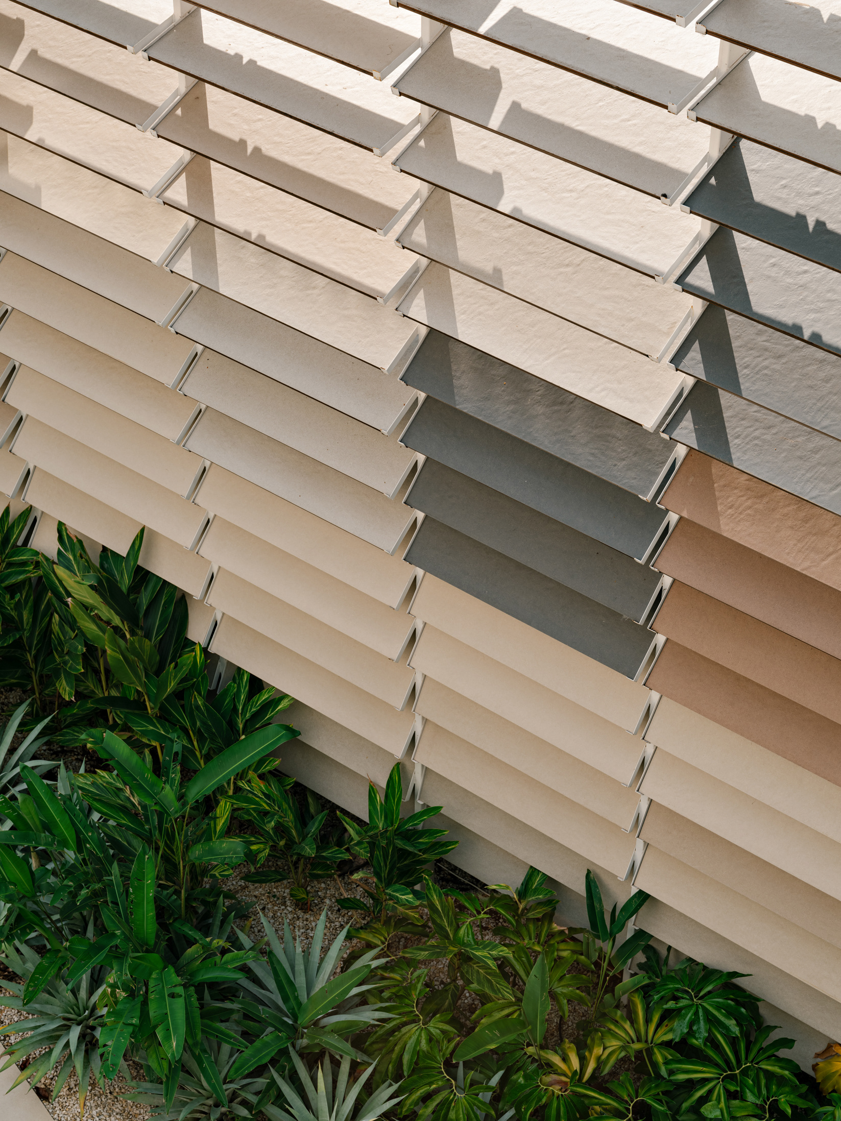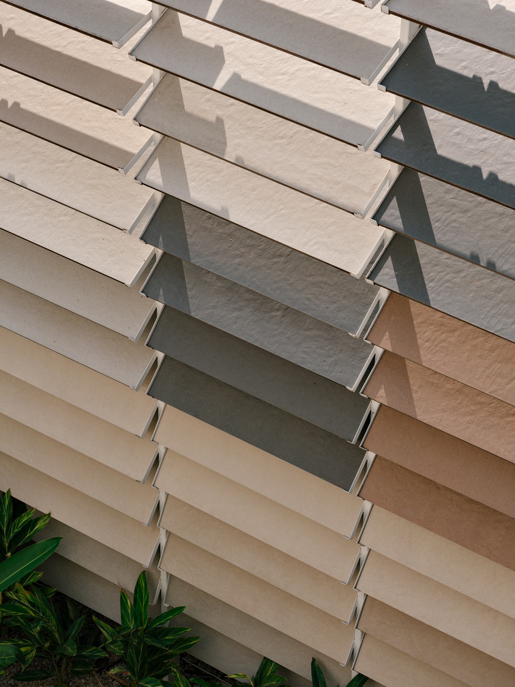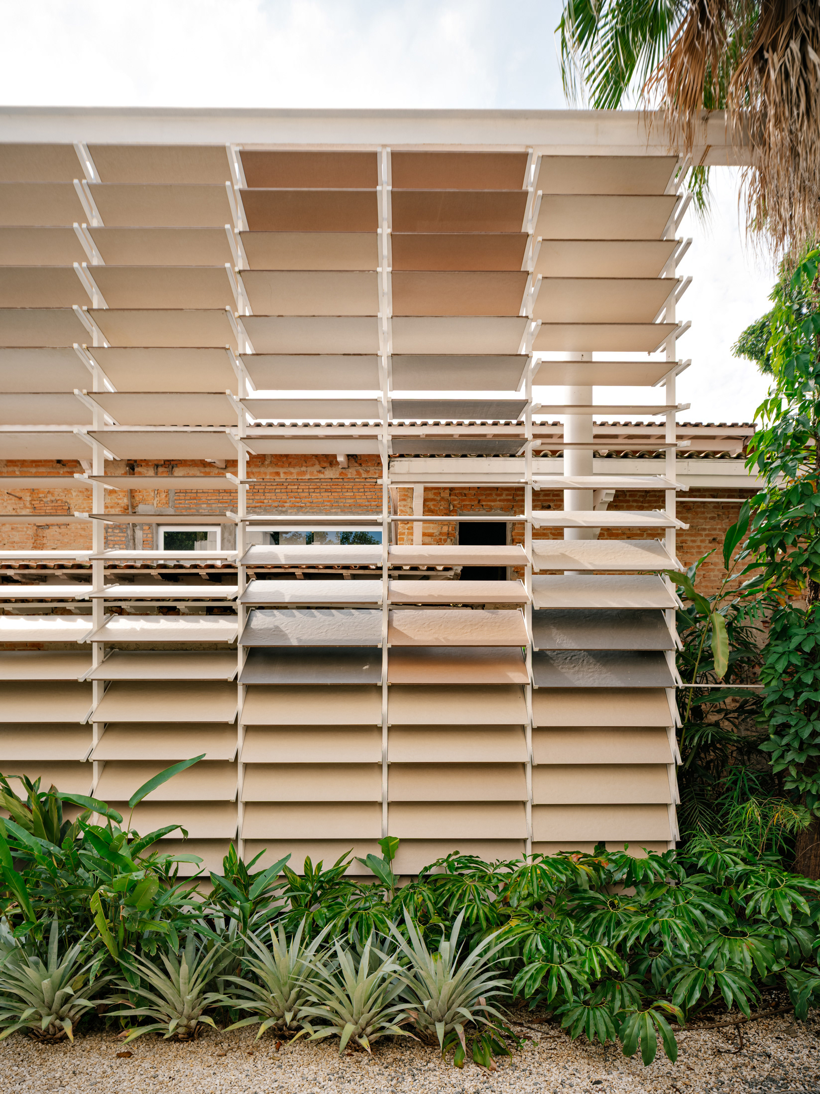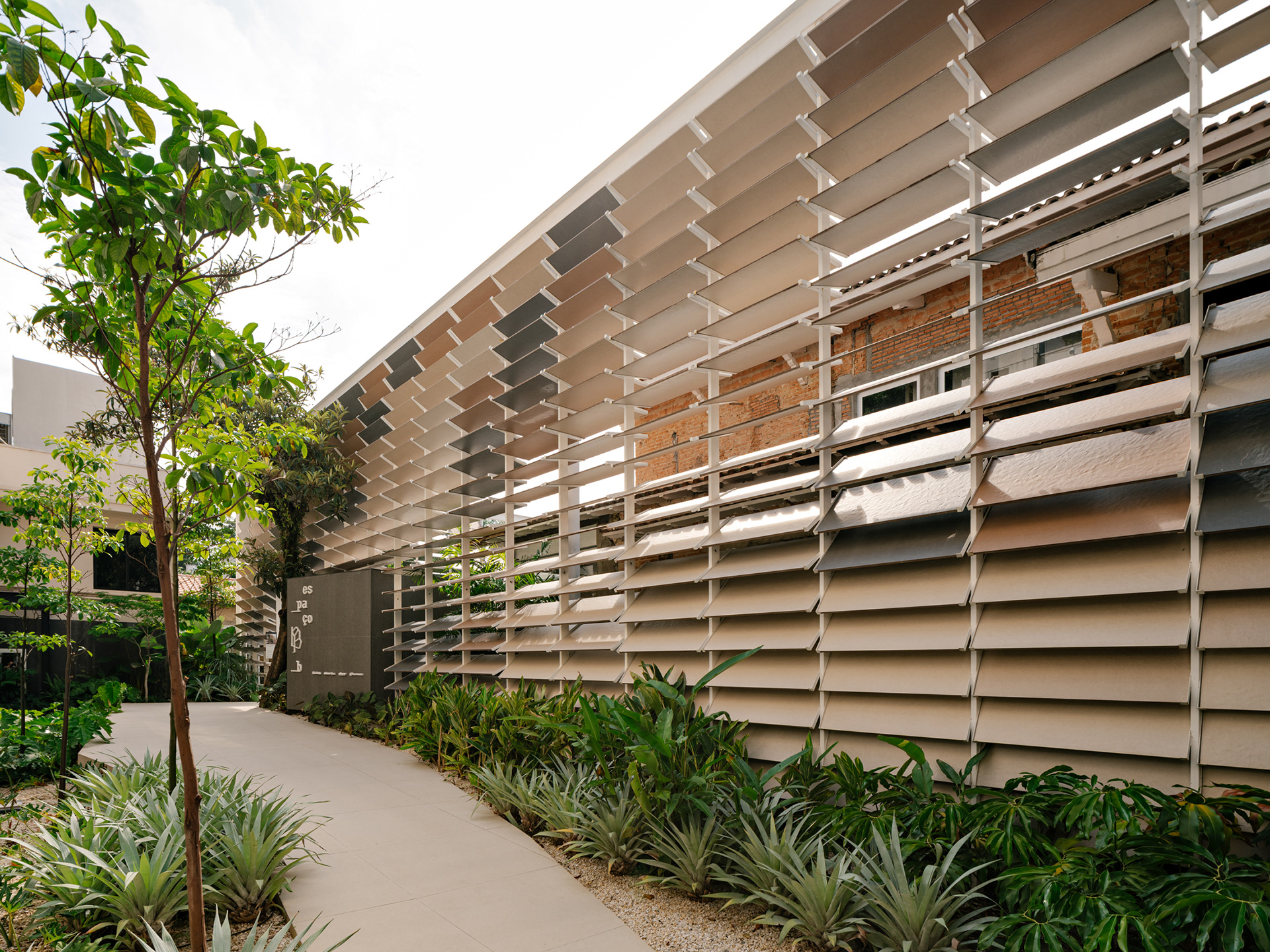 To enhance this approach of reclaiming and valuing the old, a large rear patio was created, and monumental porcelain brise-soleils were installed, reaching 7 meters in height. Composed of hundreds of angled pieces in colors reminiscent of a macaw, the brise envelops the entire structure, separating the annex—used for business—from the rest of the ensemble. Made using pieces from the Sílica collection, developed in collaboration between FGMF and Eliane, this architectural element explores the use of porcelain beyond floors and walls, showcasing its aesthetic and functional versatility.