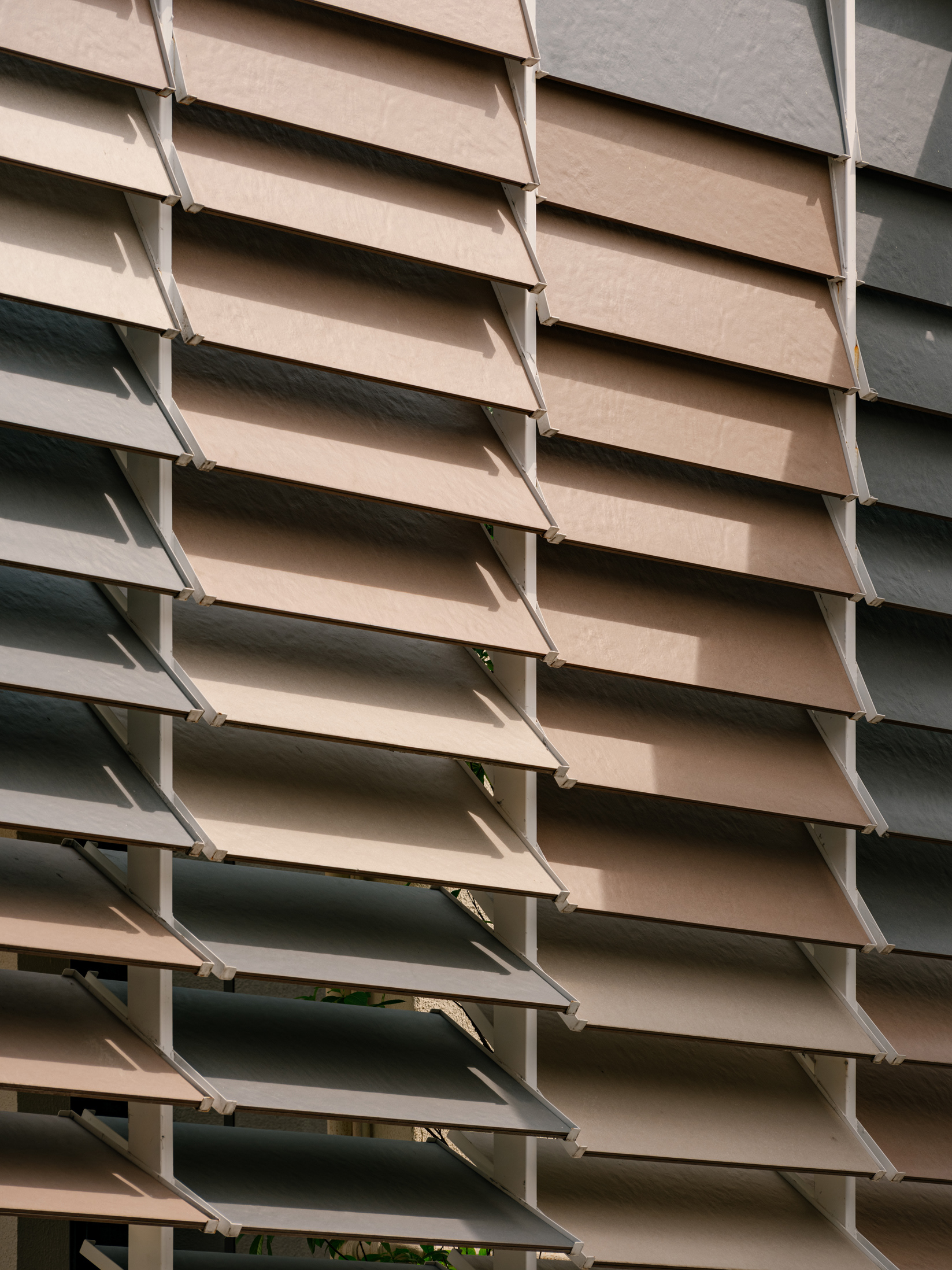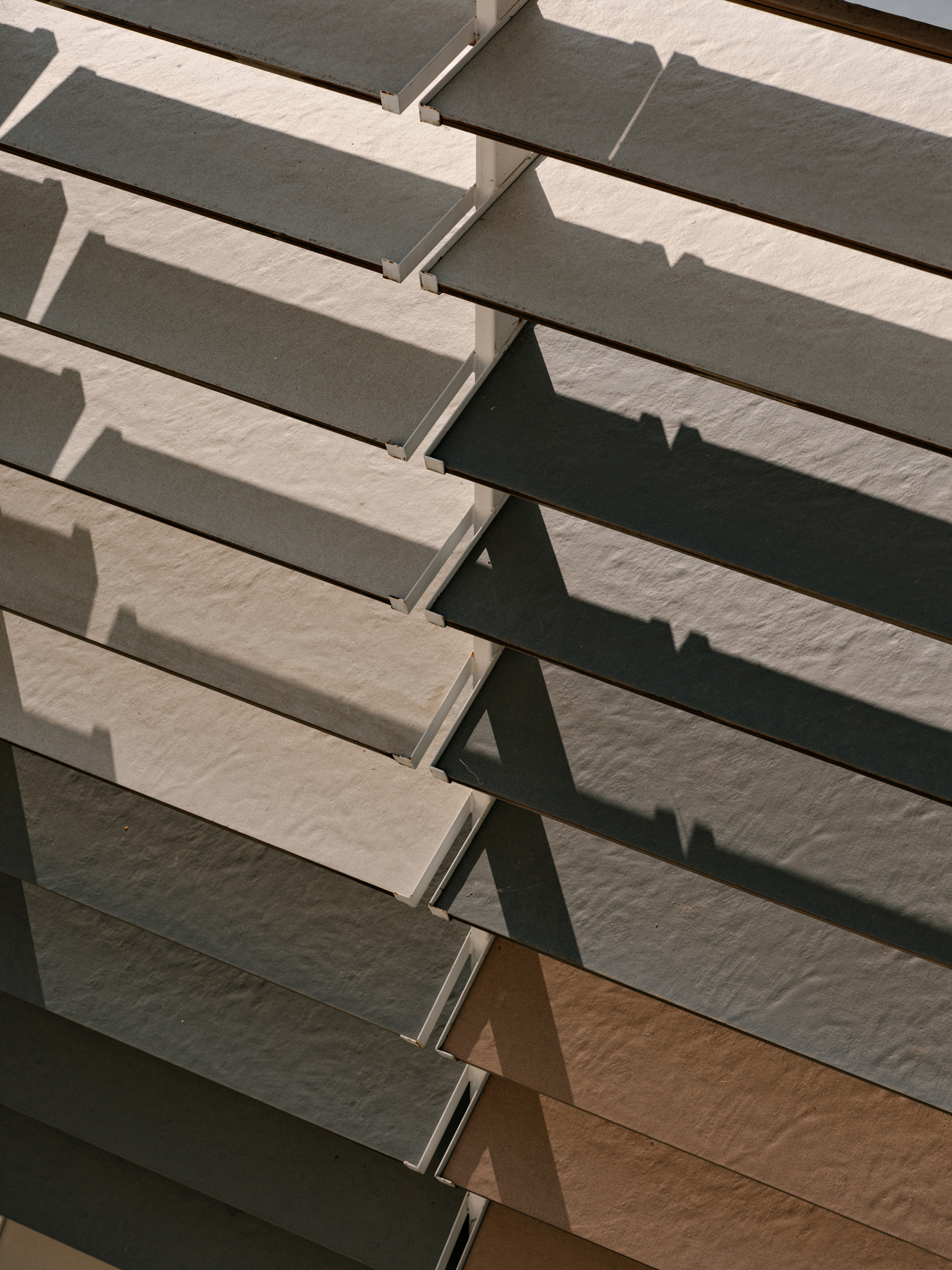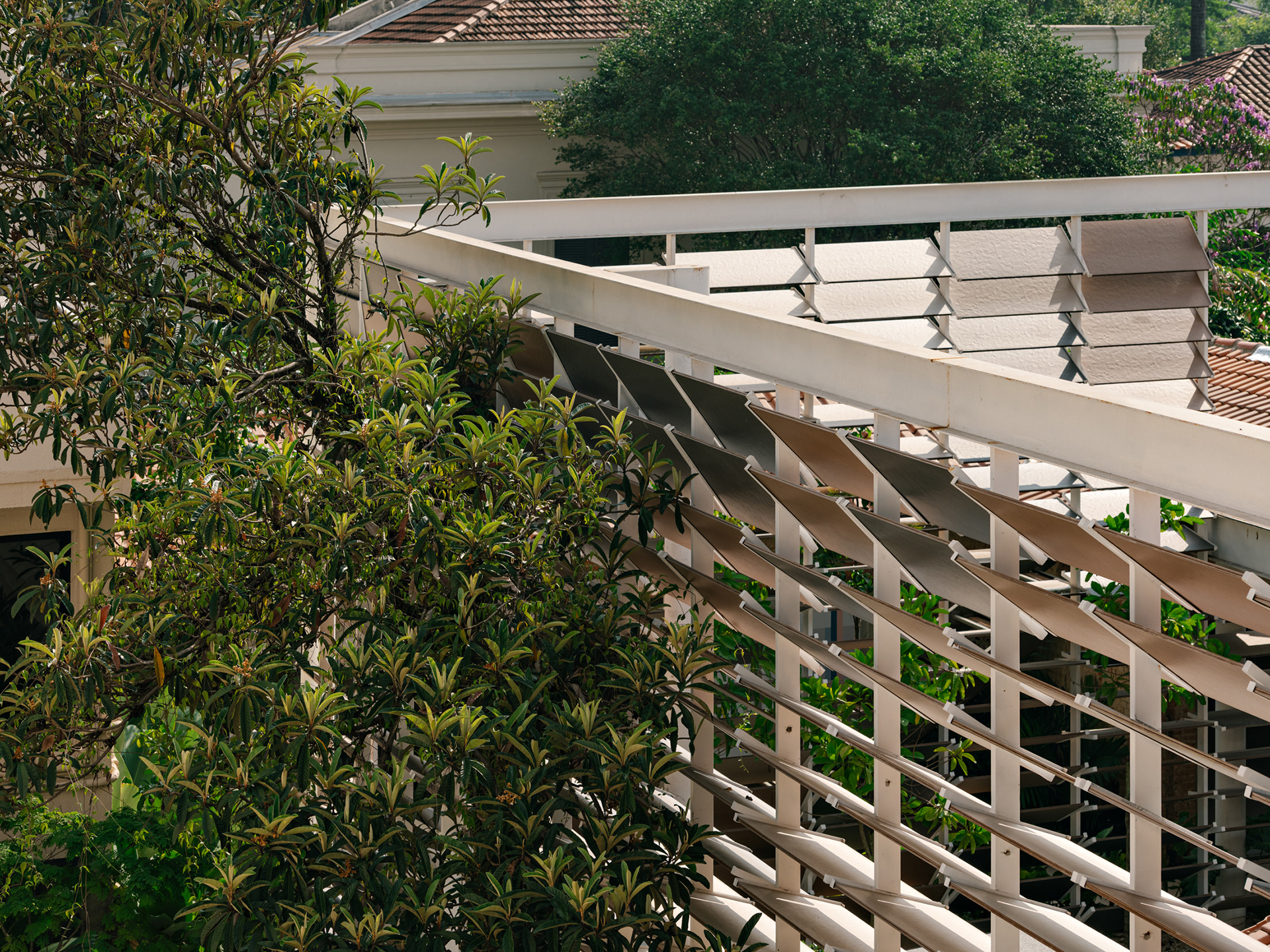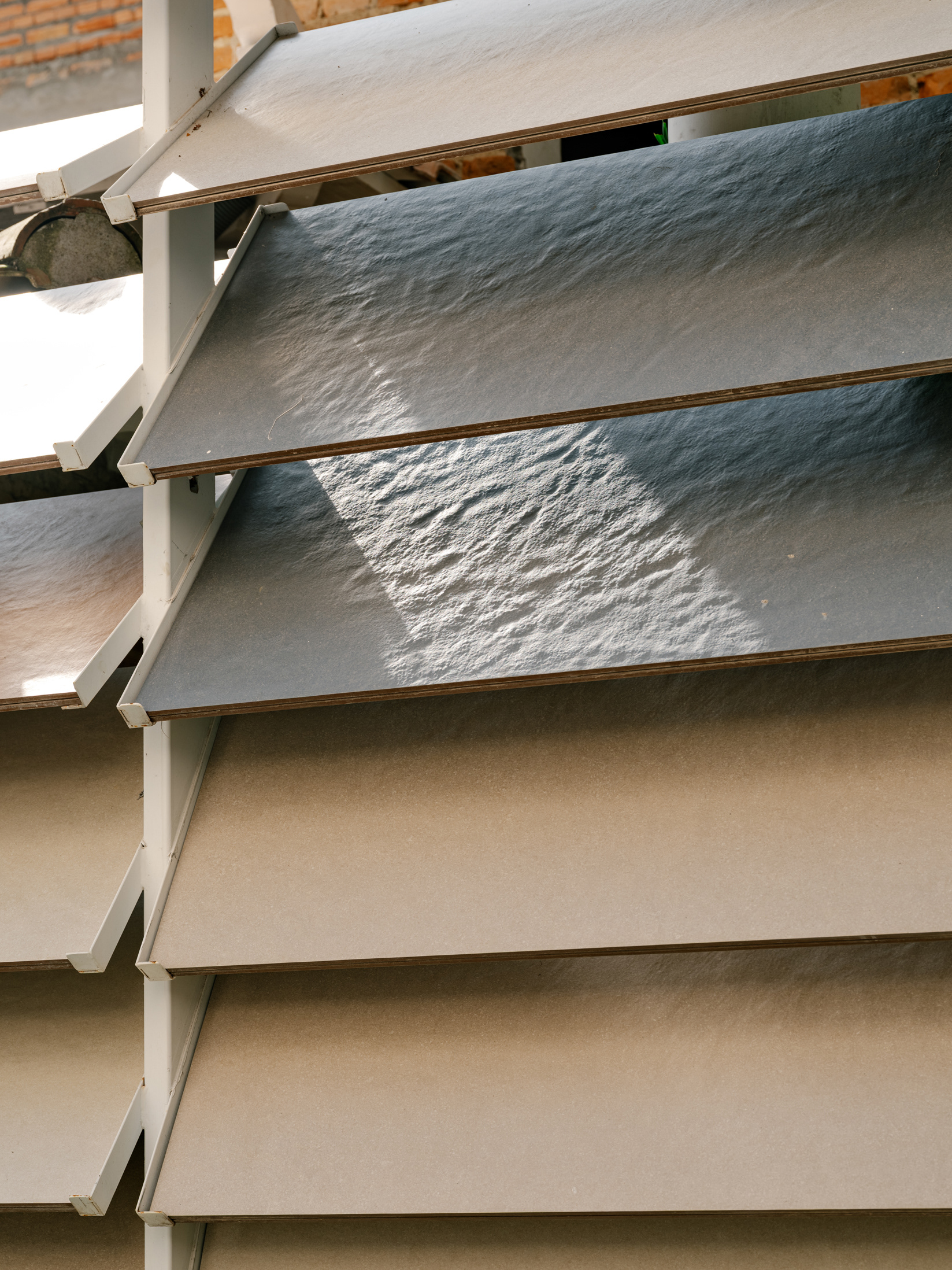 To enhance this approach of reclaiming and valuing the old, a large rear patio was created, and monumental porcelain brise-soleils were installed, reaching 7 meters in height. Composed of hundreds of angled pieces in colors reminiscent of a macaw, the brise envelops the entire structure, separating the annex—used for business—from the rest of the ensemble. Made using pieces from the Sílica collection, developed in collaboration between FGMF and Eliane, this architectural element explores the use of porcelain beyond floors and walls, showcasing its aesthetic and functional versatility.