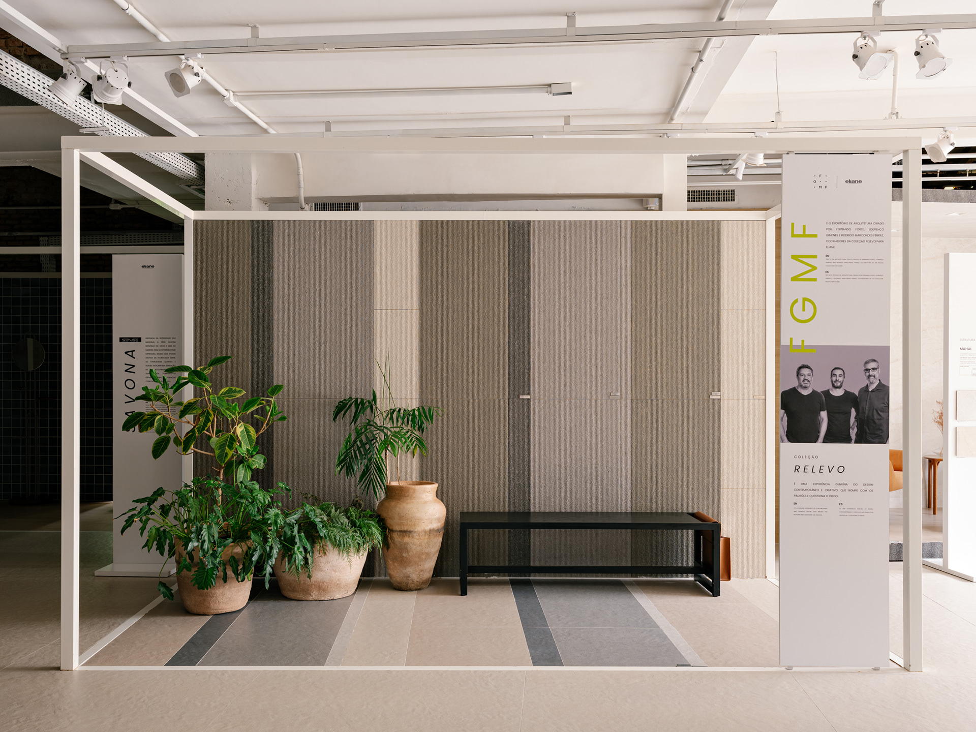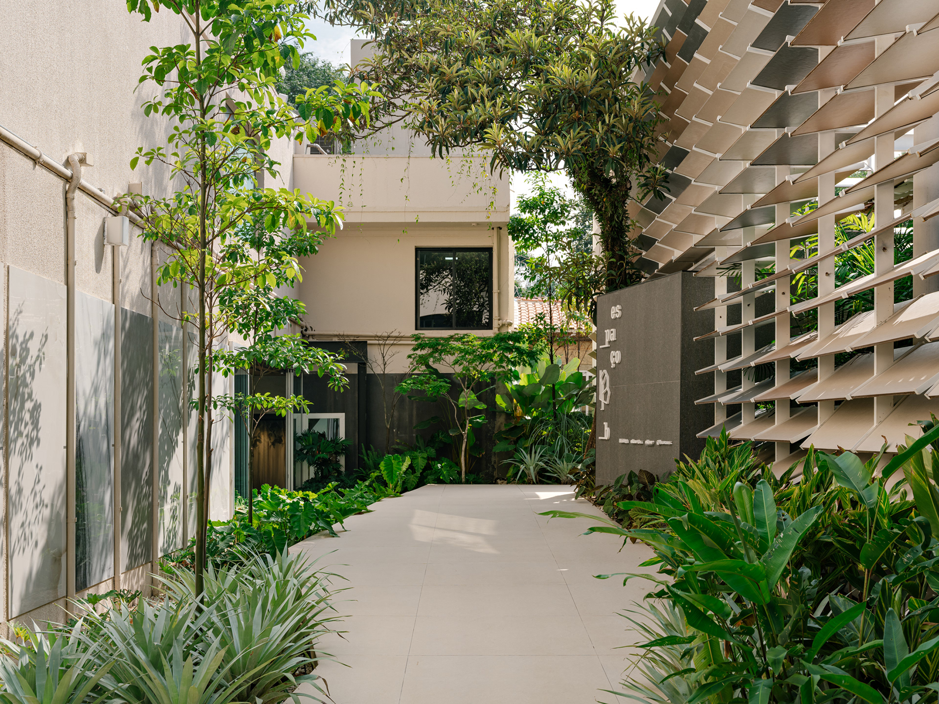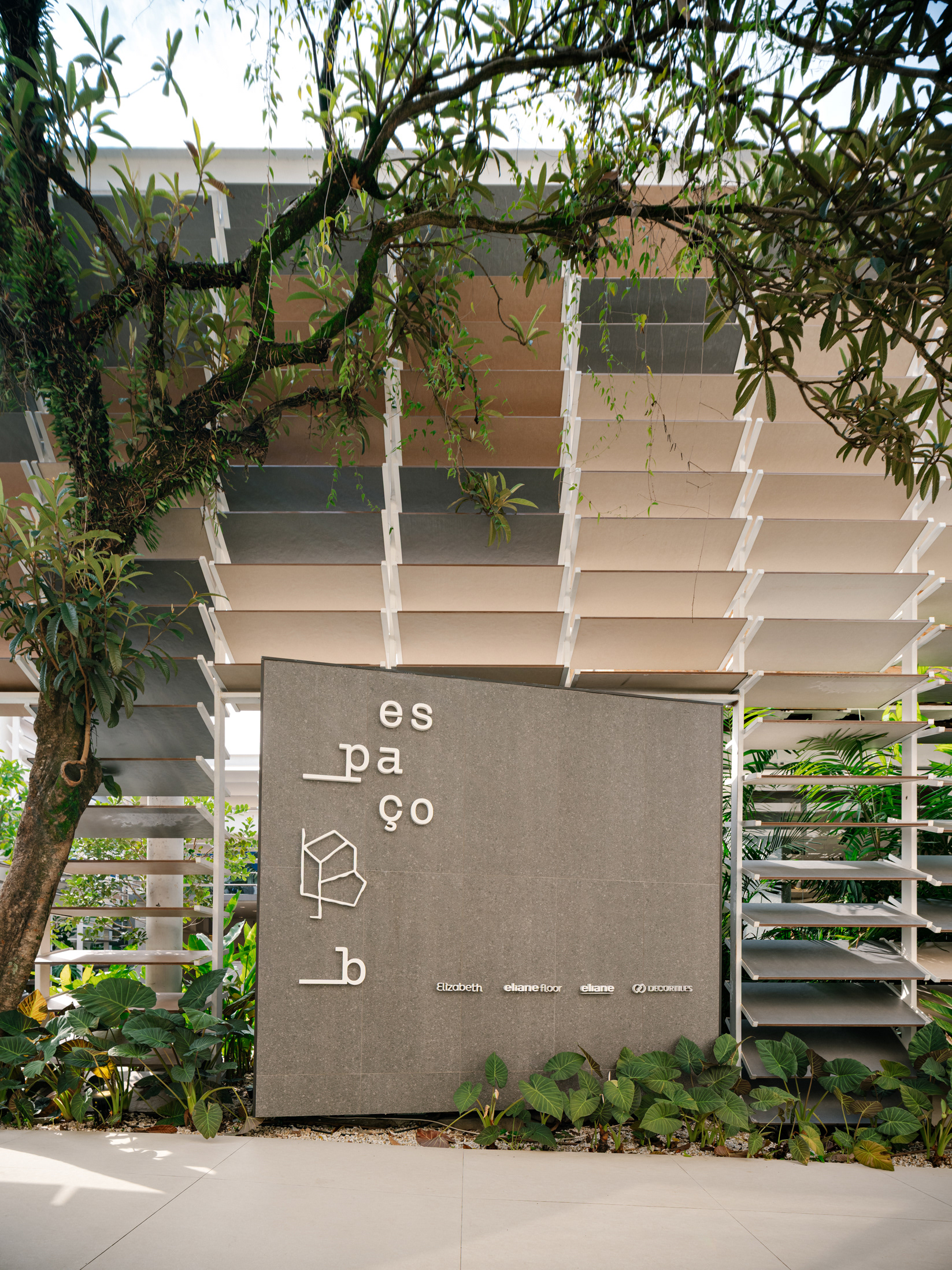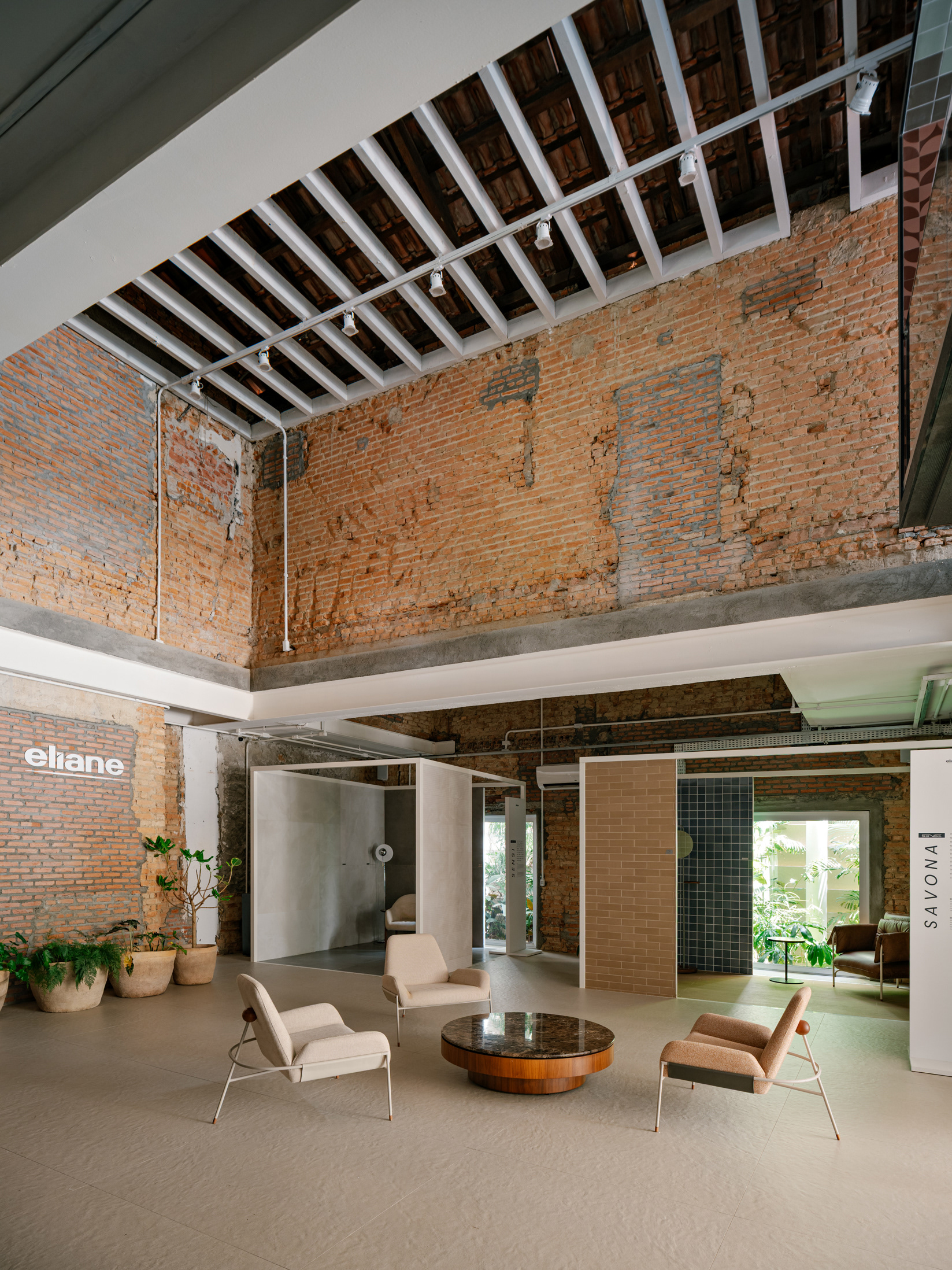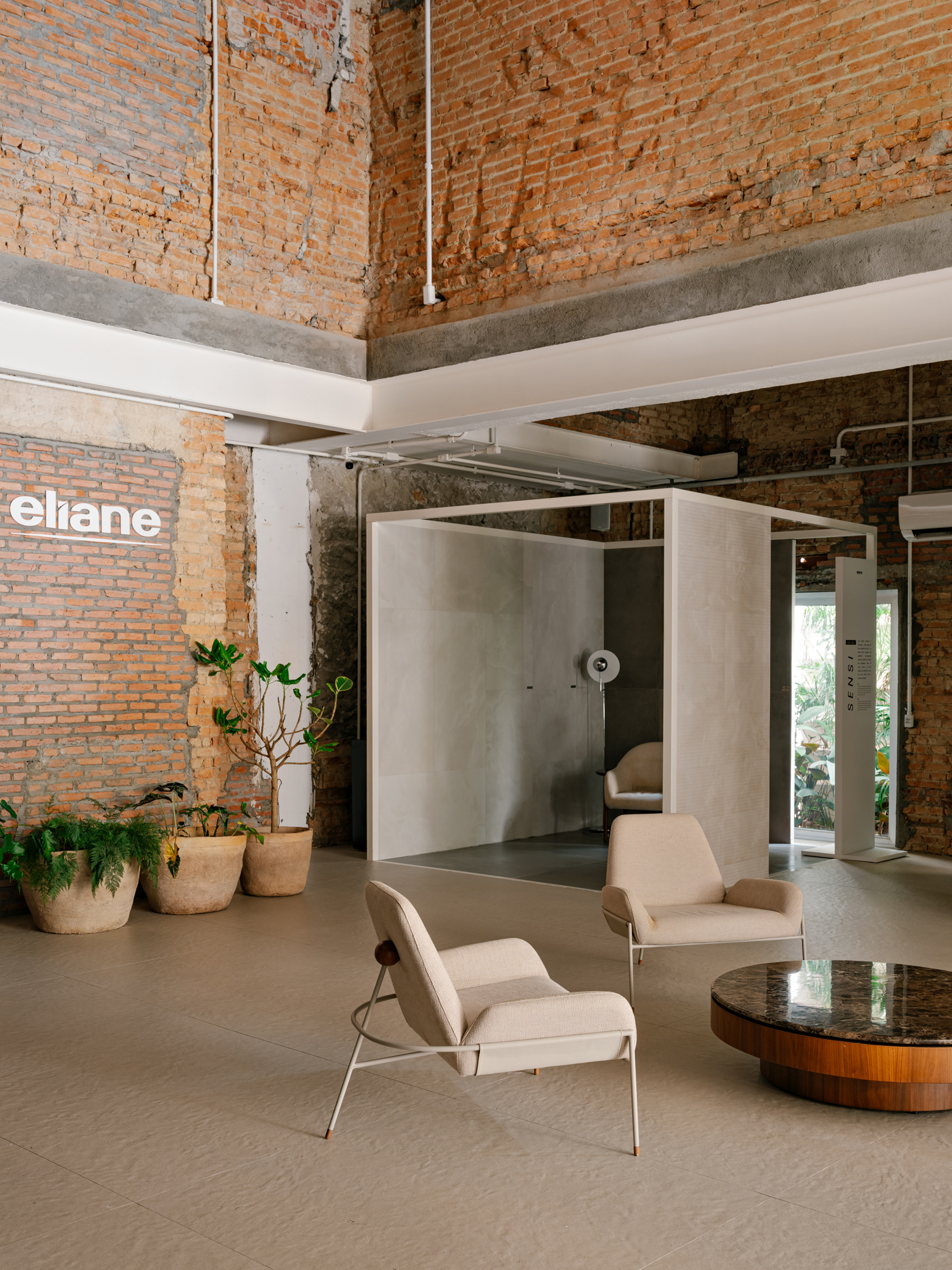 Espaço B, by Eliane, emerged from a complex challenge, despite its apparent simplicity. The proposal was to connect Eliane’s existing showroom to a new adjacent space, overcoming a significant level difference between the two. The solution was to create a subtle access point within the setback of the original showroom, via a ramp integrated into a garden—a path of discovery that leads the visitor through a continuous circuit, connecting the spaces with walkways and stairs in a fluid route that flows through both environments.