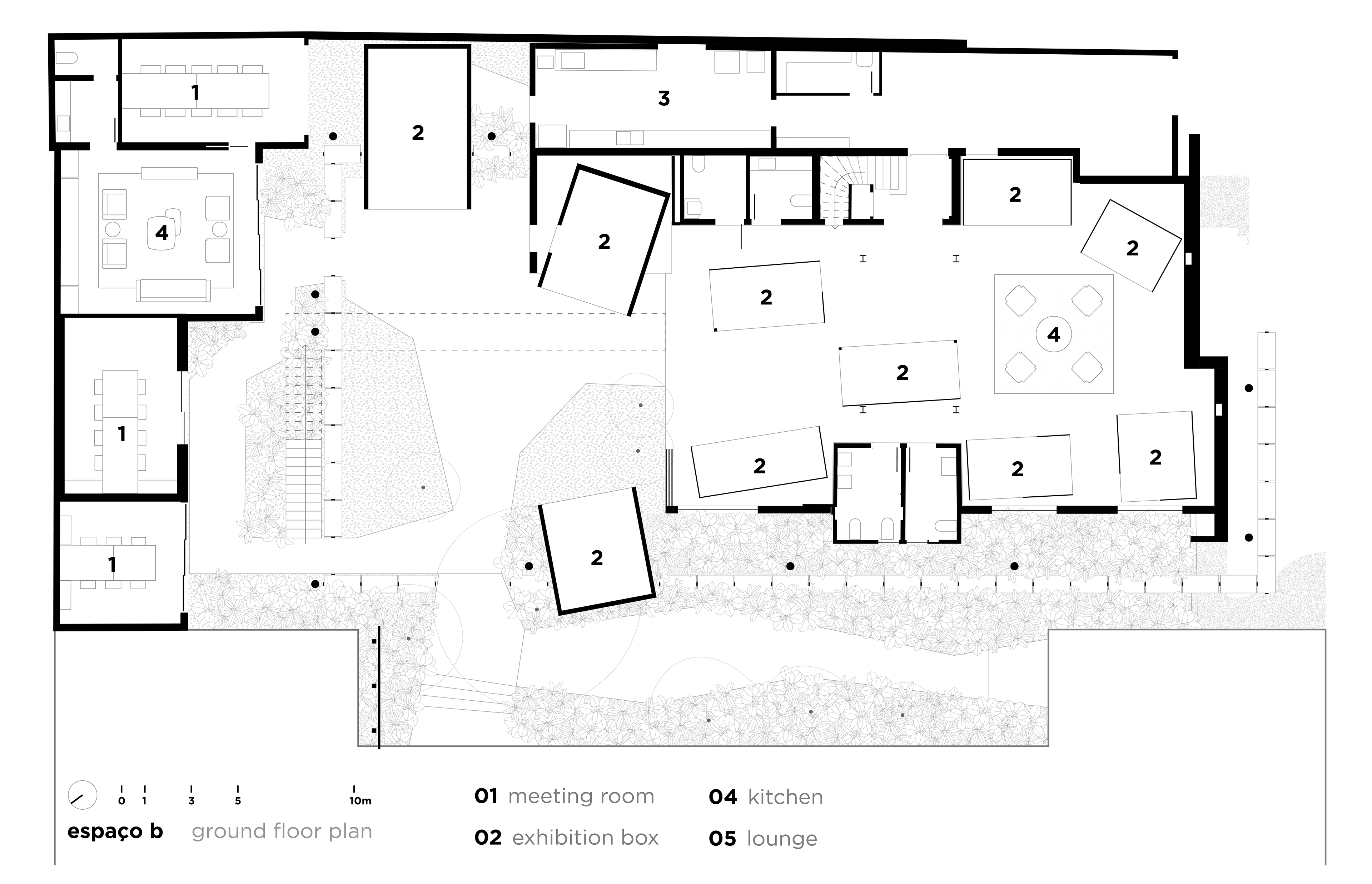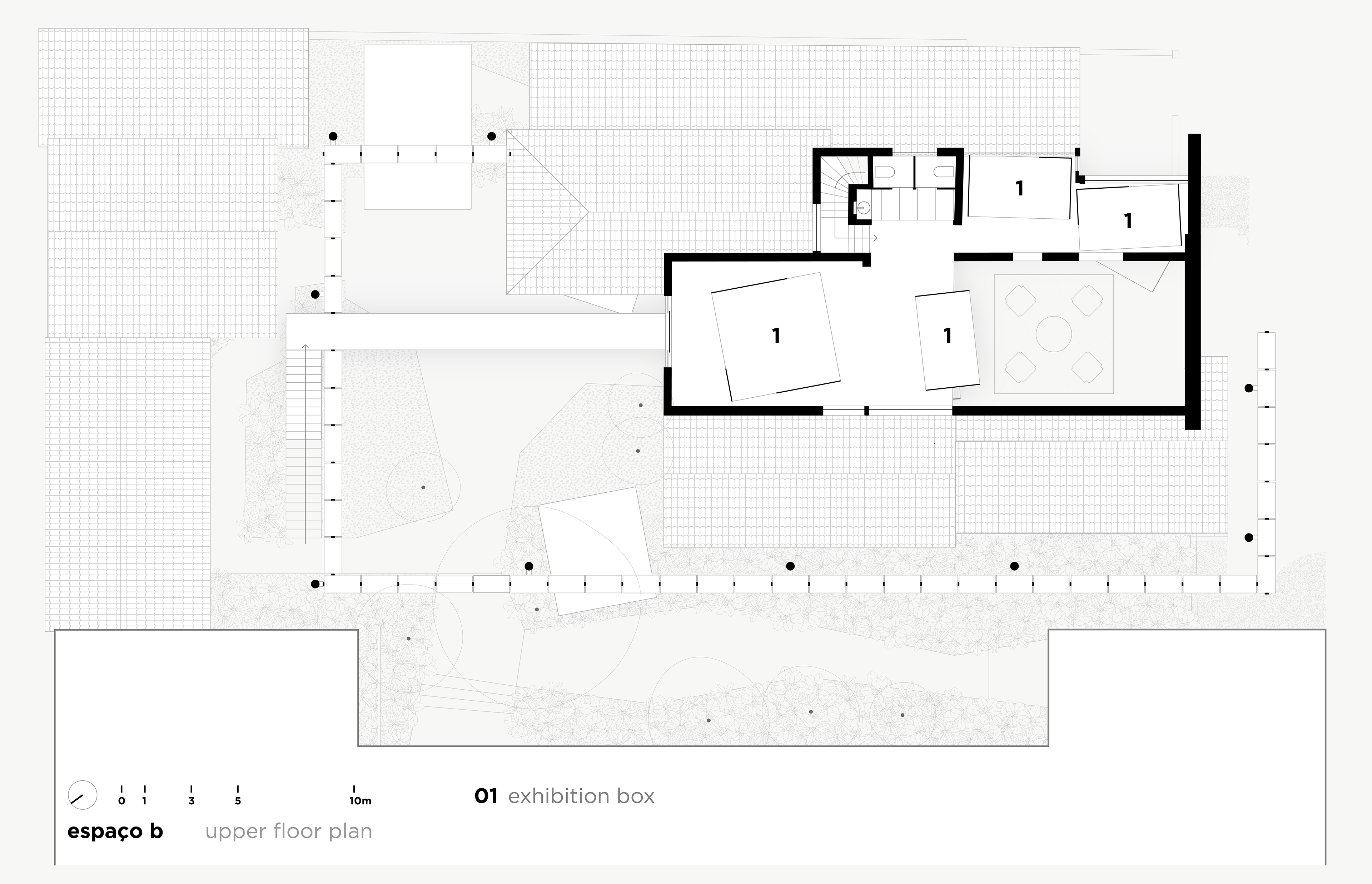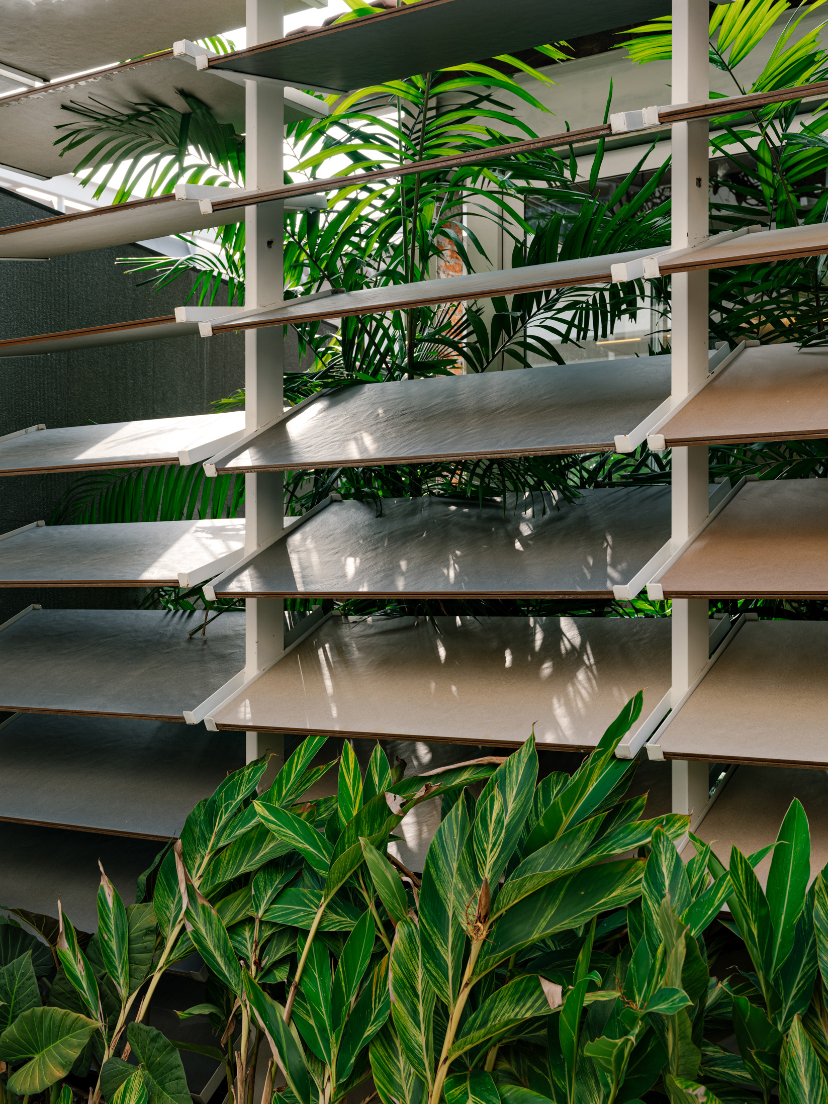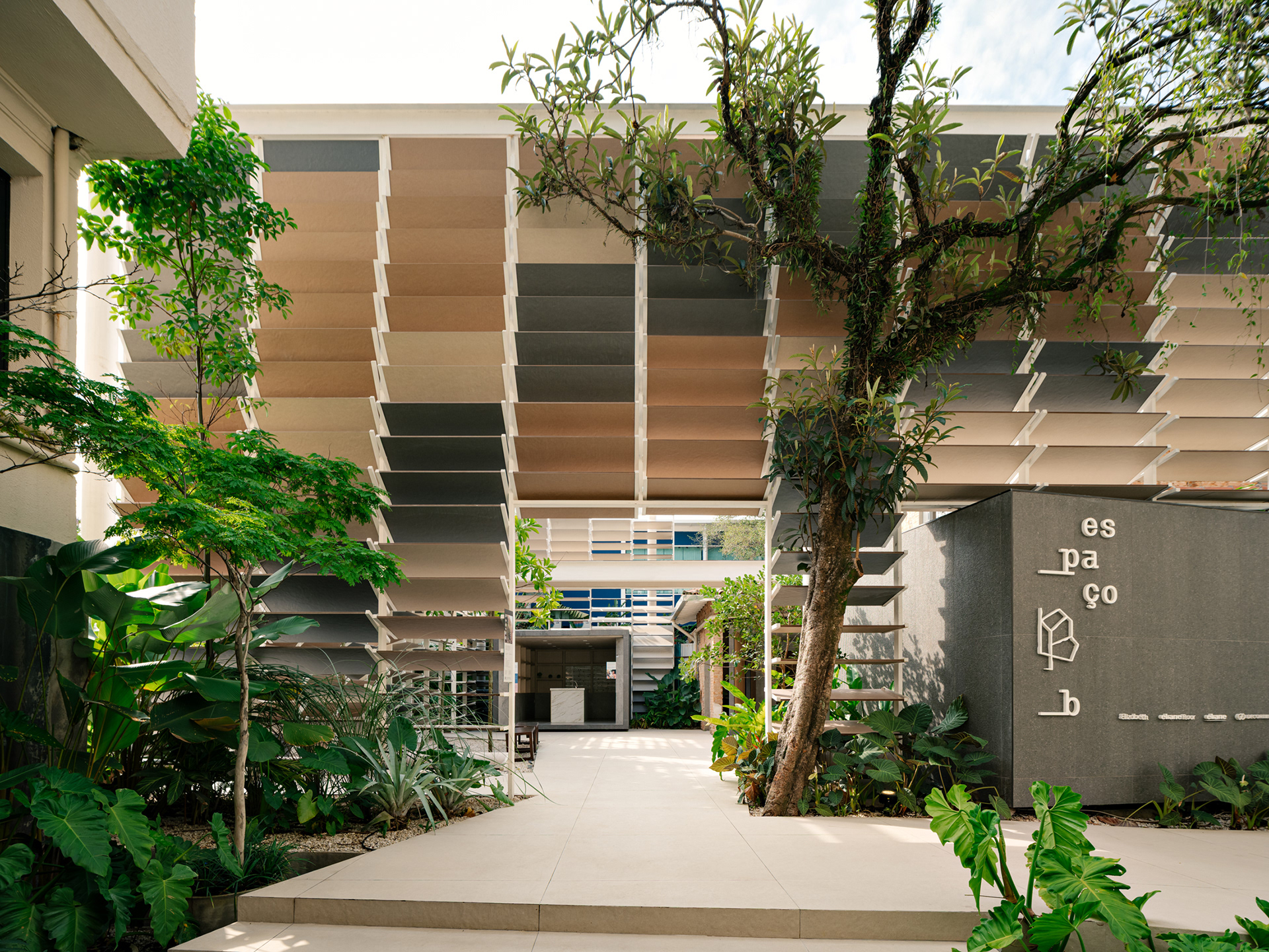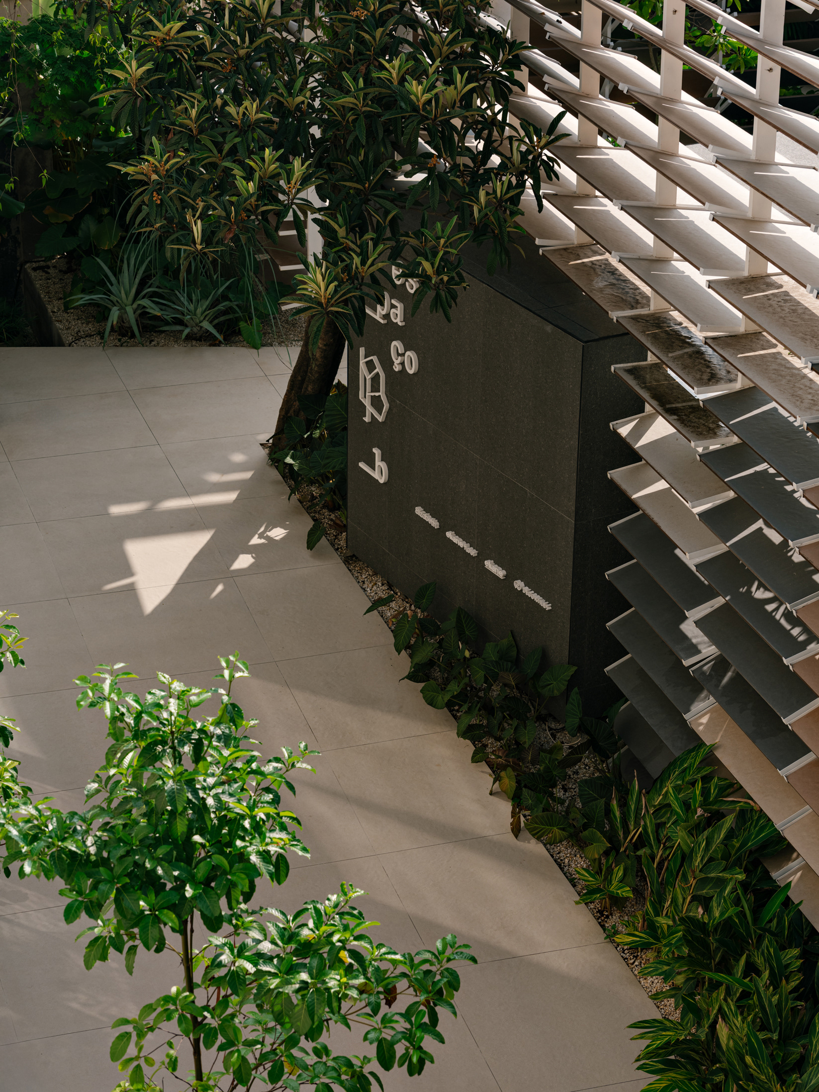 Espaço B, by Eliane, emerged from a complex challenge, despite its apparent simplicity. The proposal was to connect Eliane’s existing showroom to a new adjacent space, overcoming a significant level difference between the two. The solution was to create a subtle access point within the setback of the original showroom, via a ramp integrated into a garden—a path of discovery that leads the visitor through a continuous circuit, connecting the spaces with walkways and stairs in a fluid route that flows through both environments.