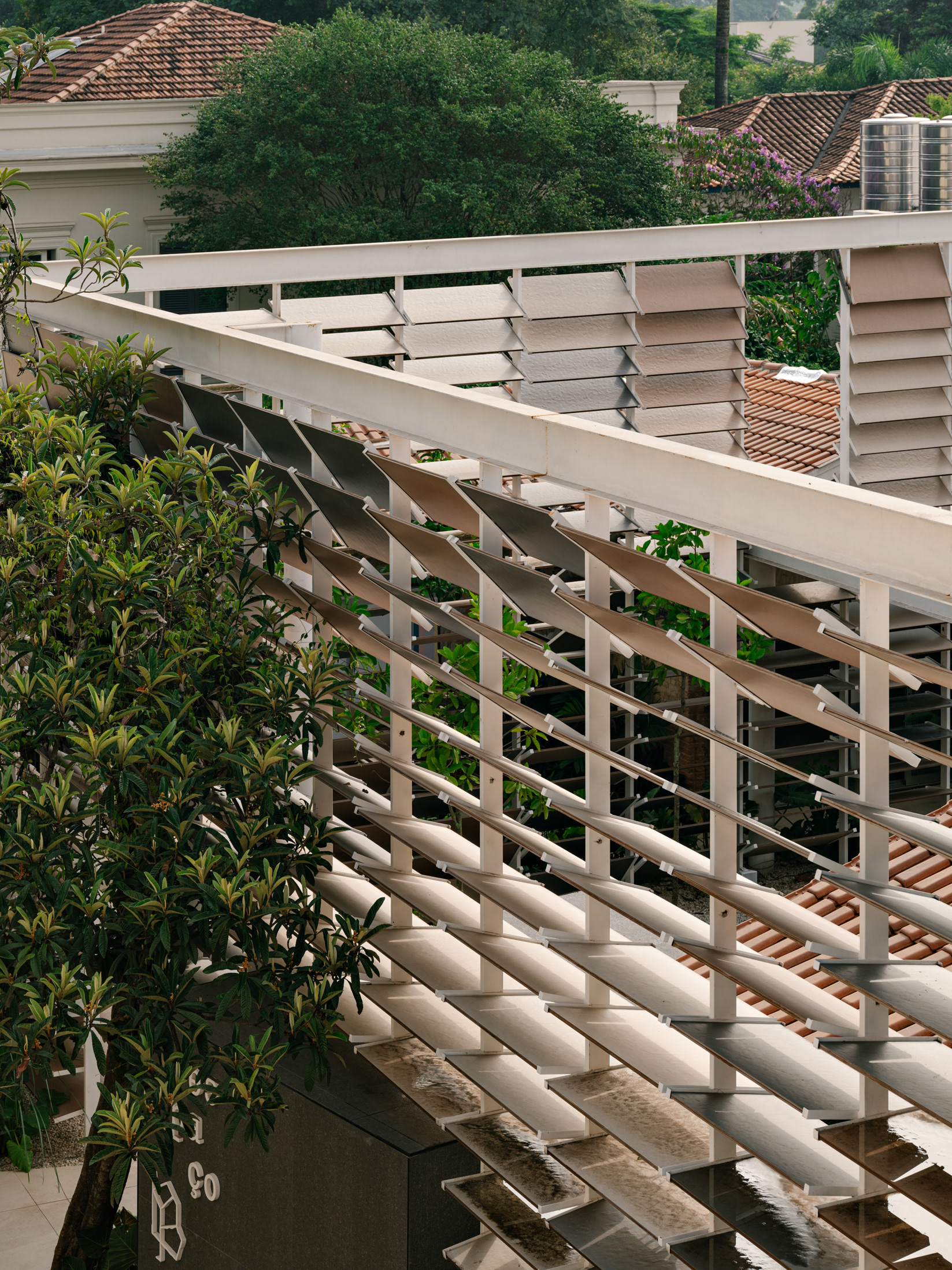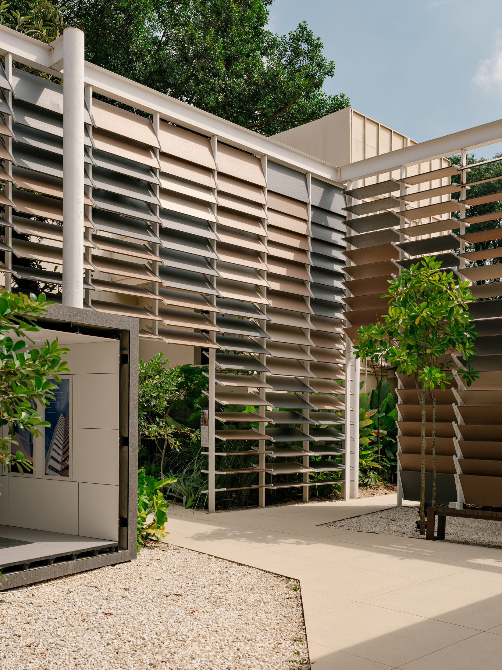 Another highlight of the project is the elevated walkway that passes through the brise-soleils, crosses the garden, and leads to a rear staircase. This solution creates a sequential experience for the visitor, who can explore the spaces interactively: entering, walking through the area, ascending, observing the products from a different angle, crossing the walkway, and returning to the original showroom—completing a circular and inviting journey.