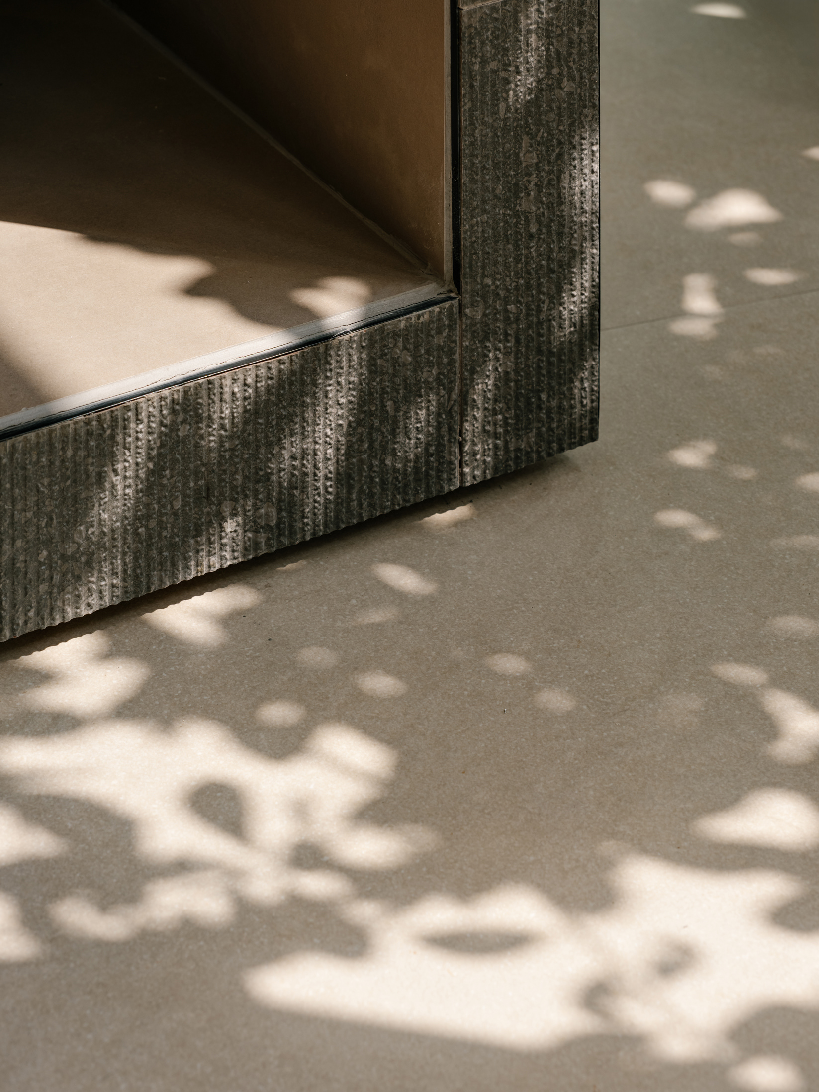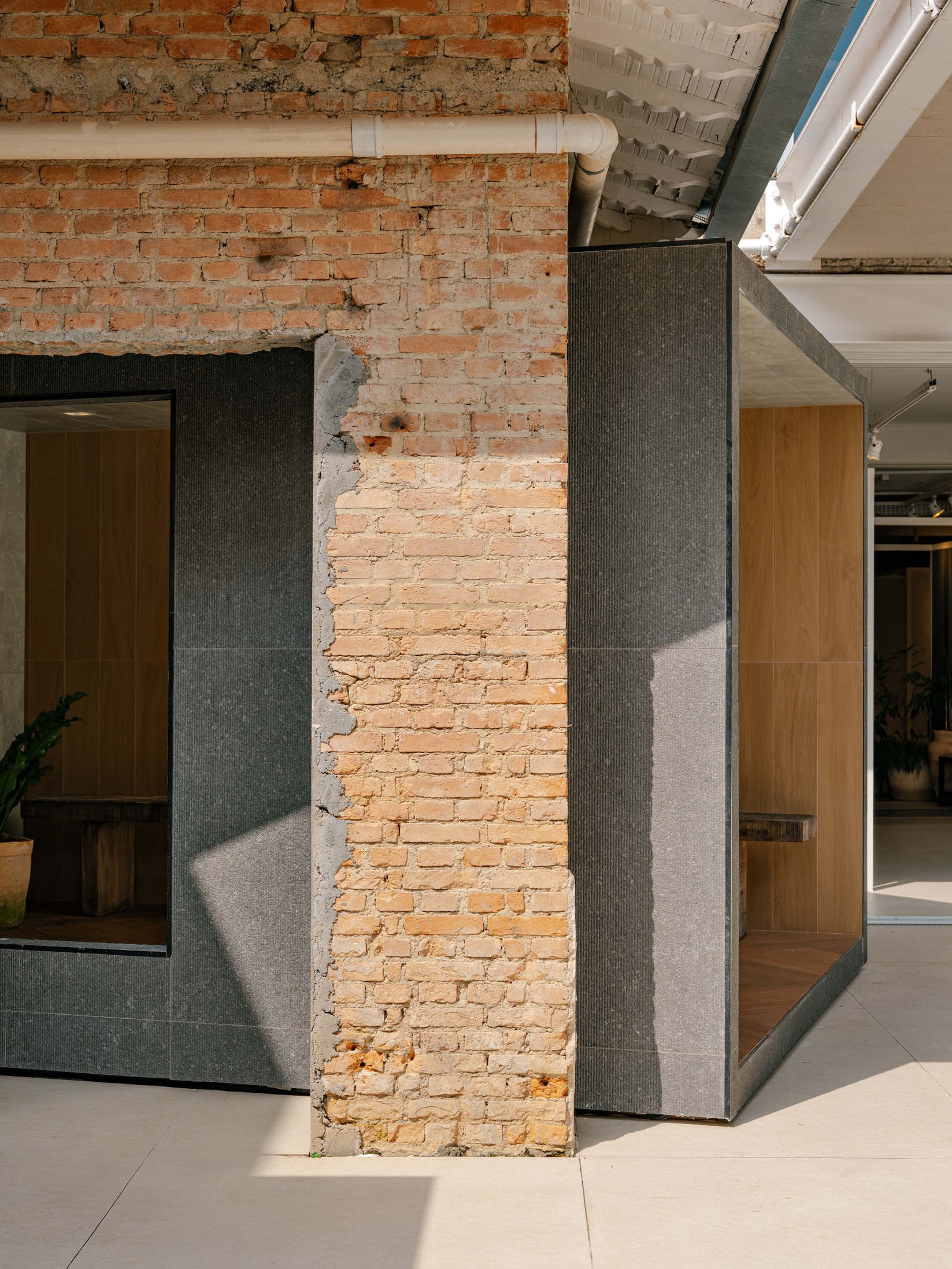 The project is deeply permeated by gardens and landscaping, which frame the house and the patio. We also introduced exhibition volumes clad in the Risca line, which blend into the garden and existing architecture. Inside, the displays were designed as movable frames, offering flexibility in product curation without compromising the spatial reading of the original architecture.