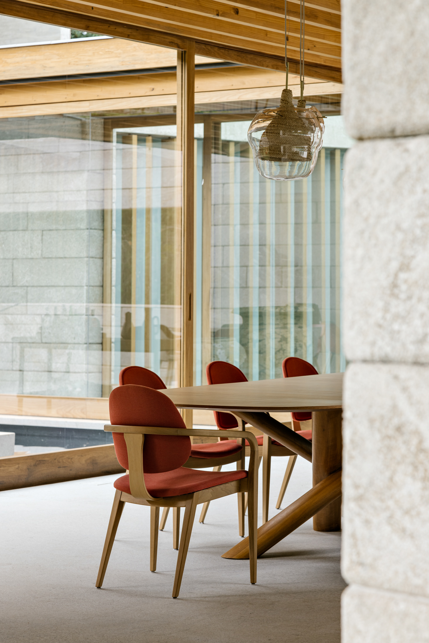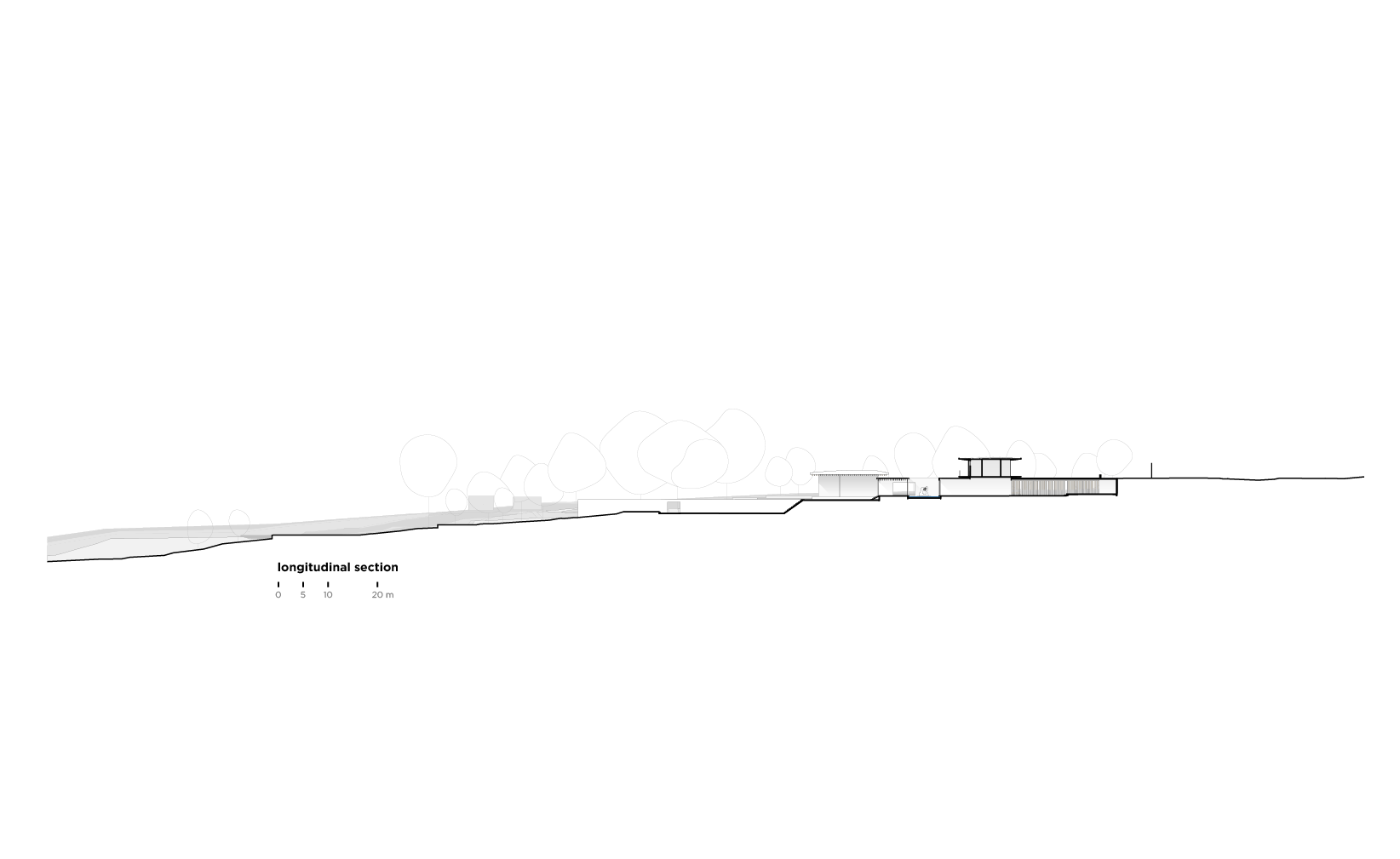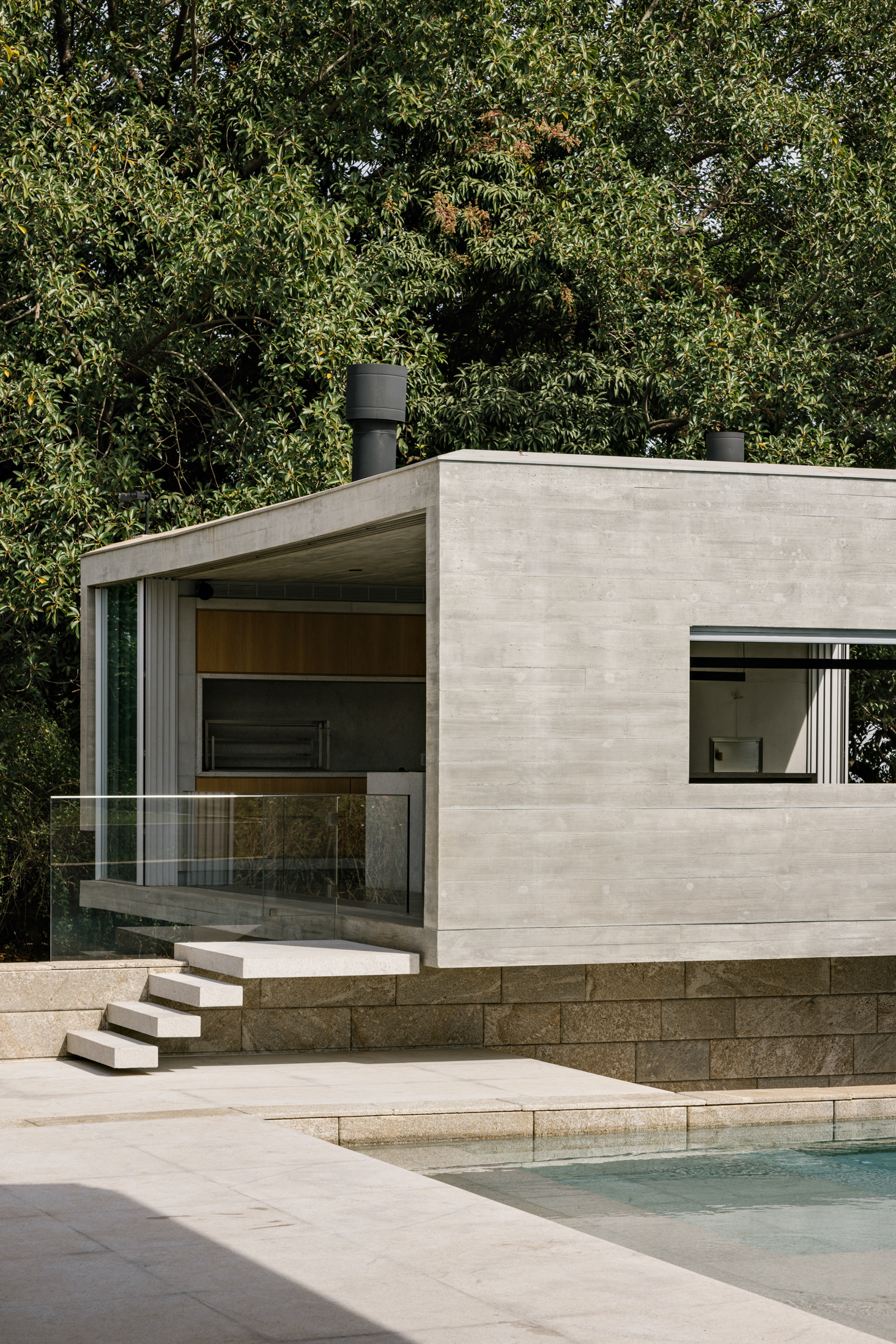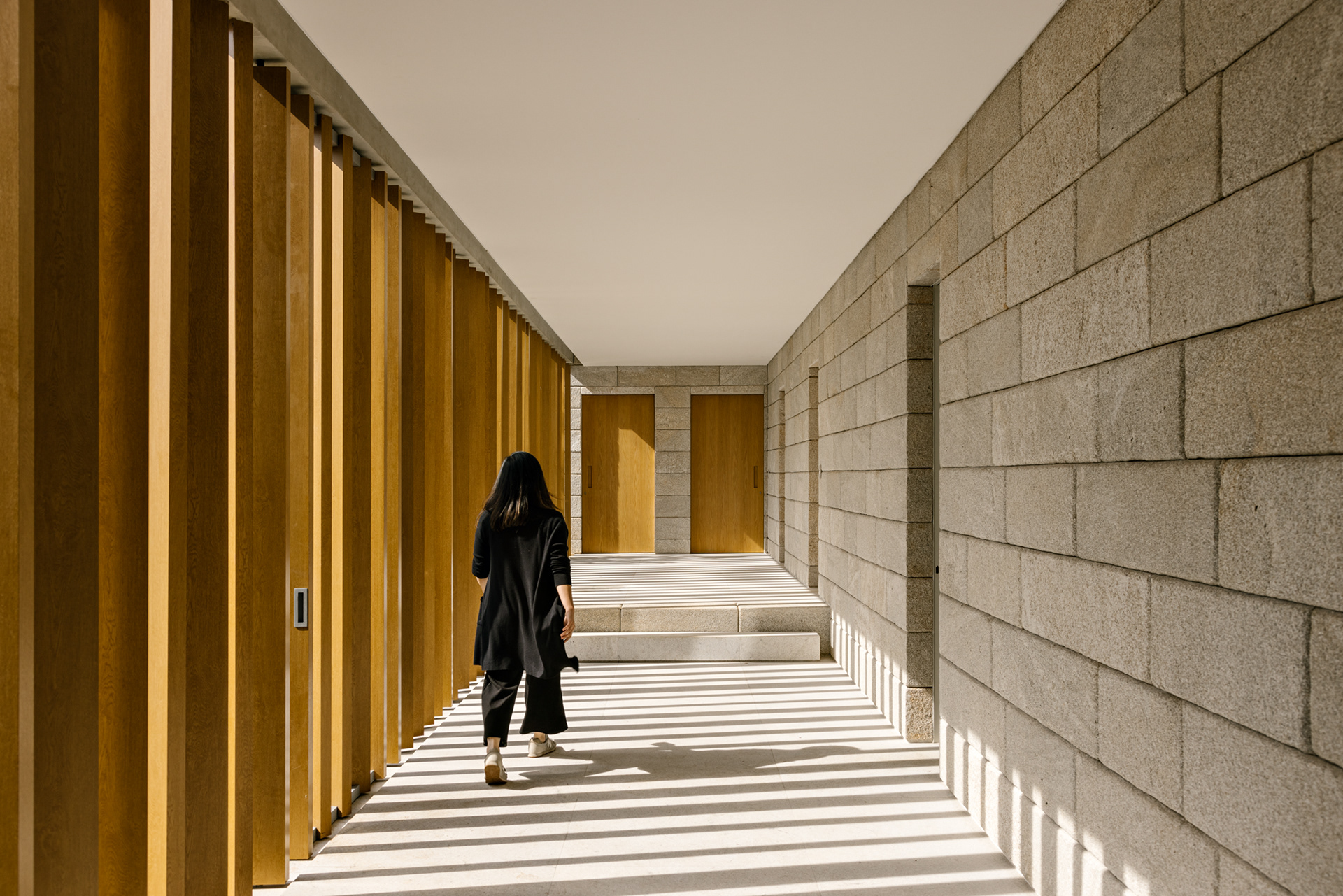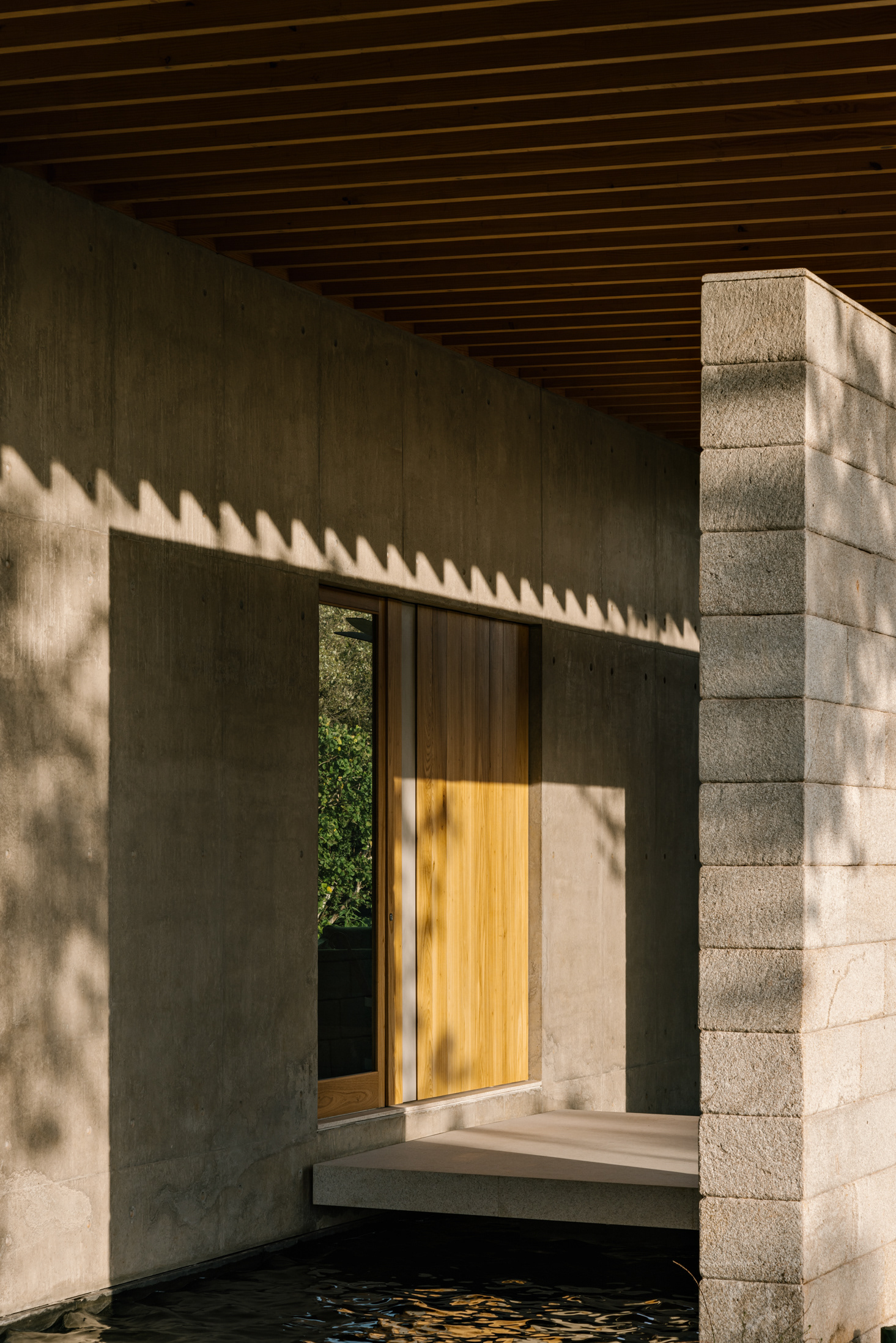 The wood, a third material, is added as a great covering plan. The wood, concrete and stone are gently separated from each other, reinforcing gaps through which one can pass or see between them.