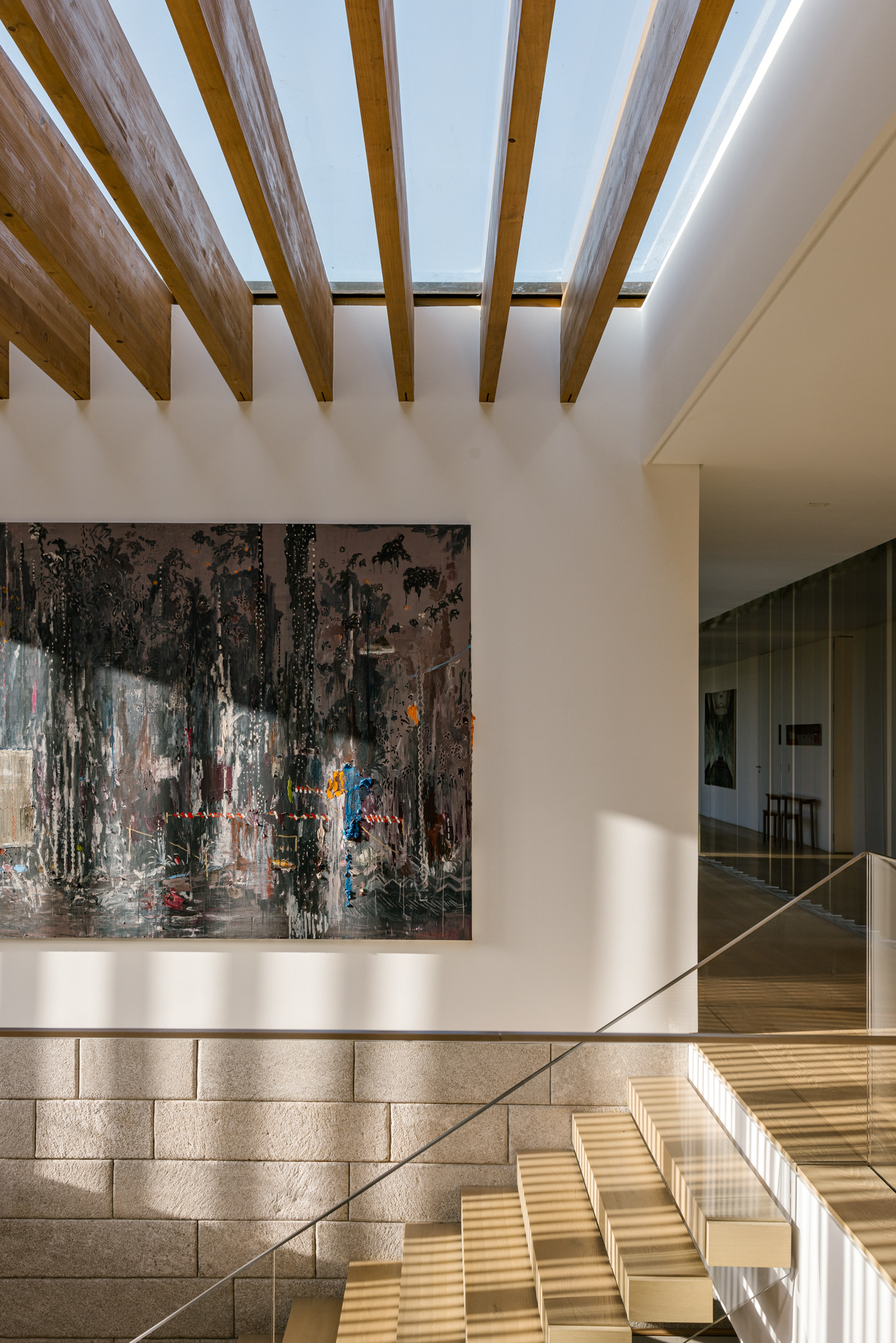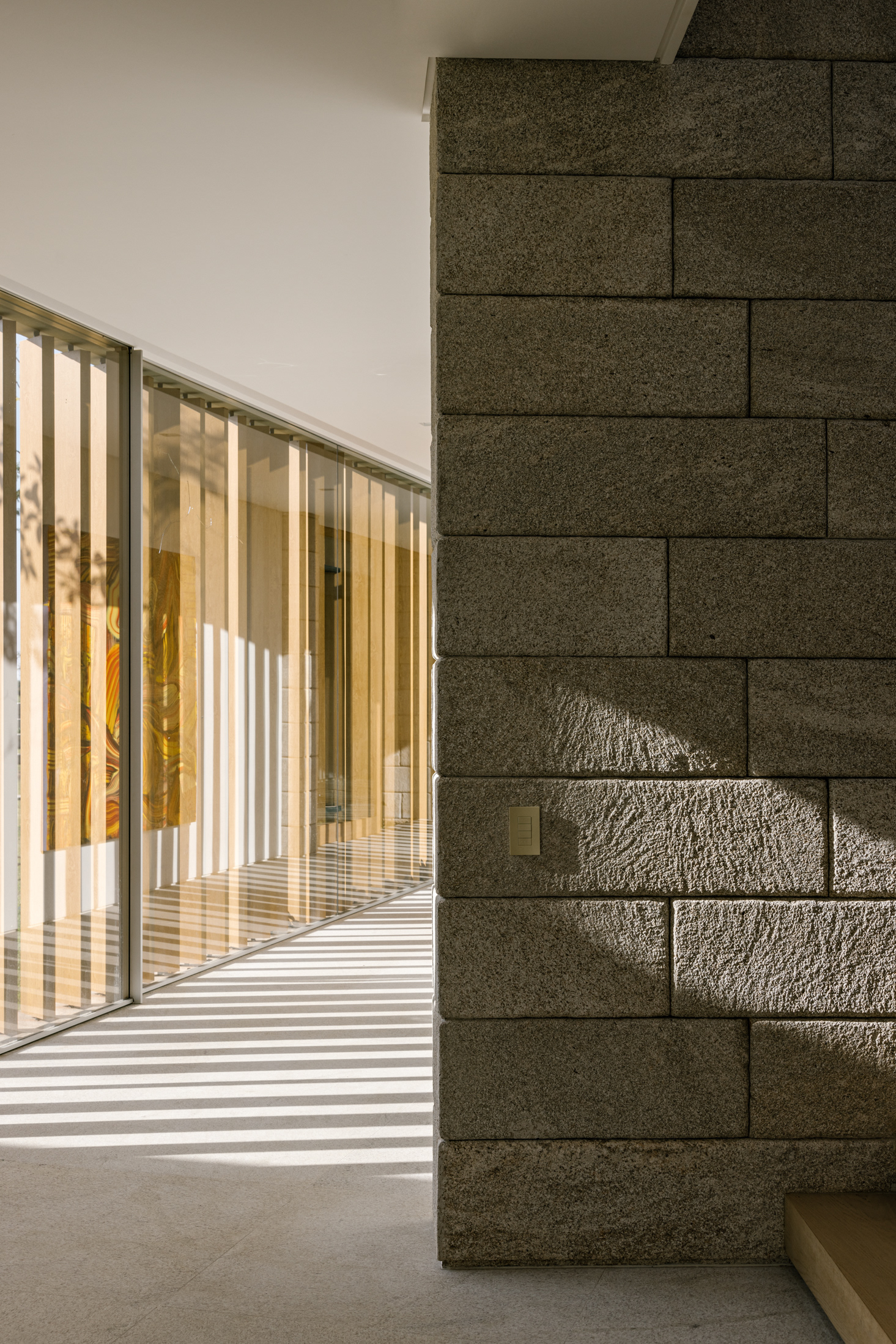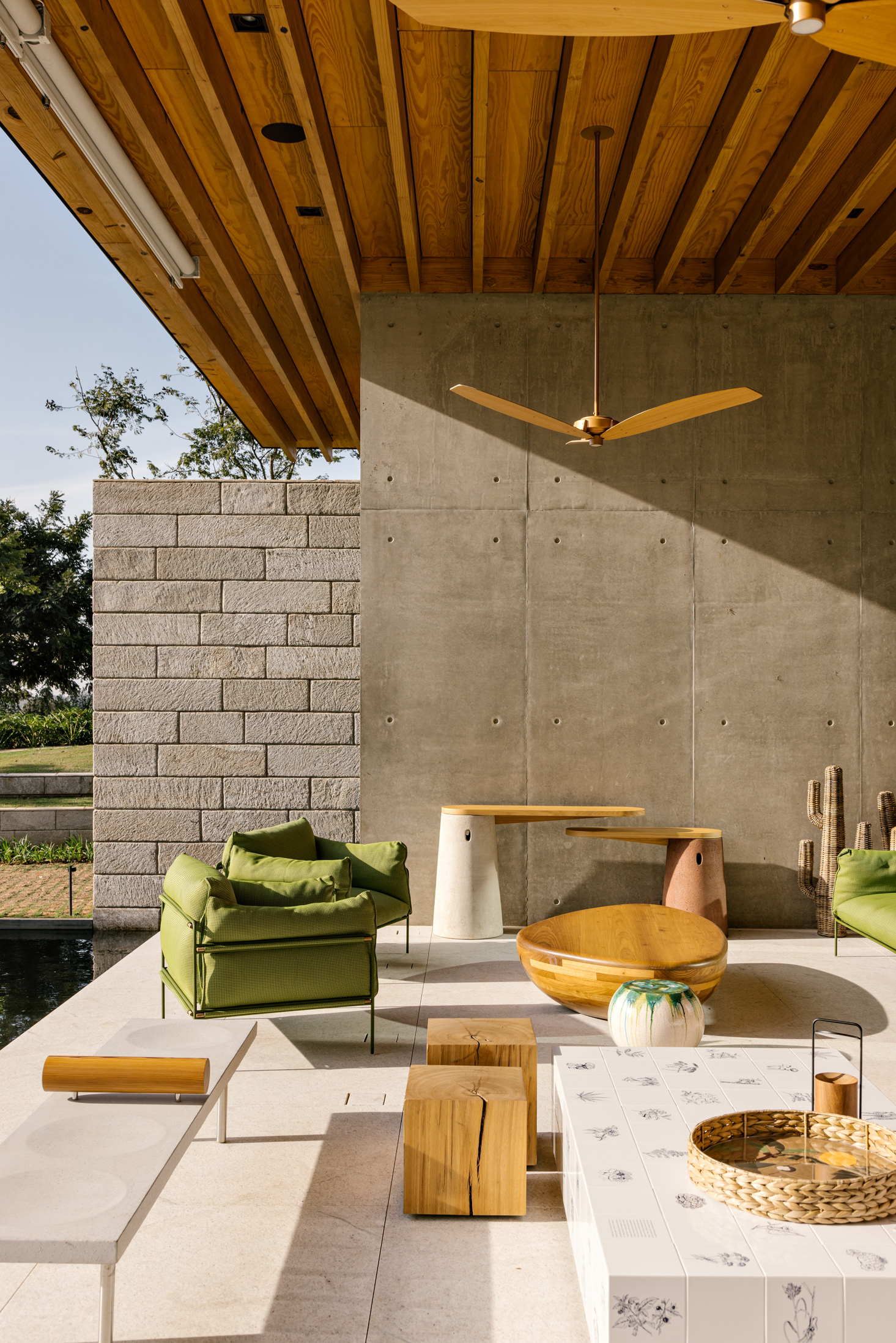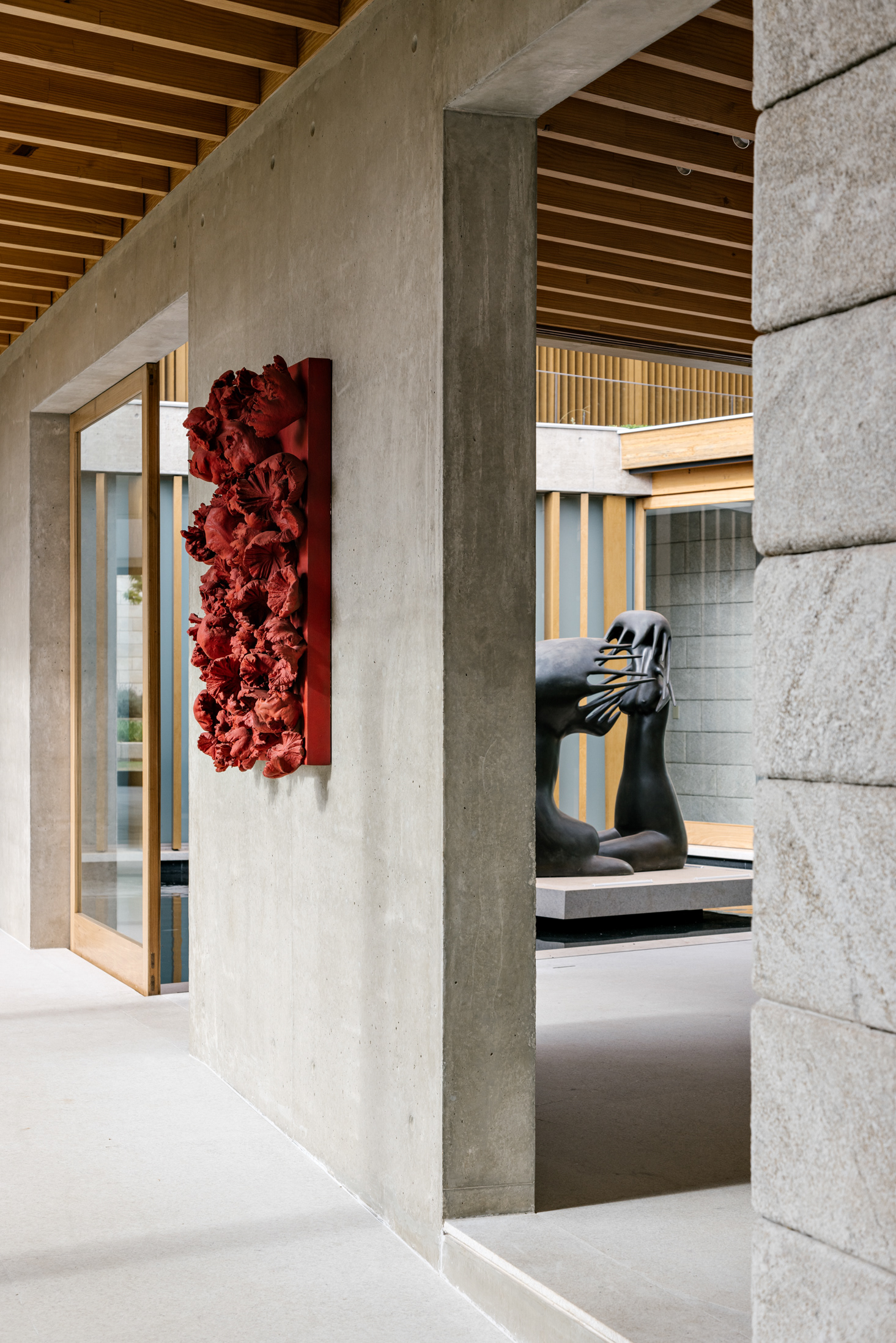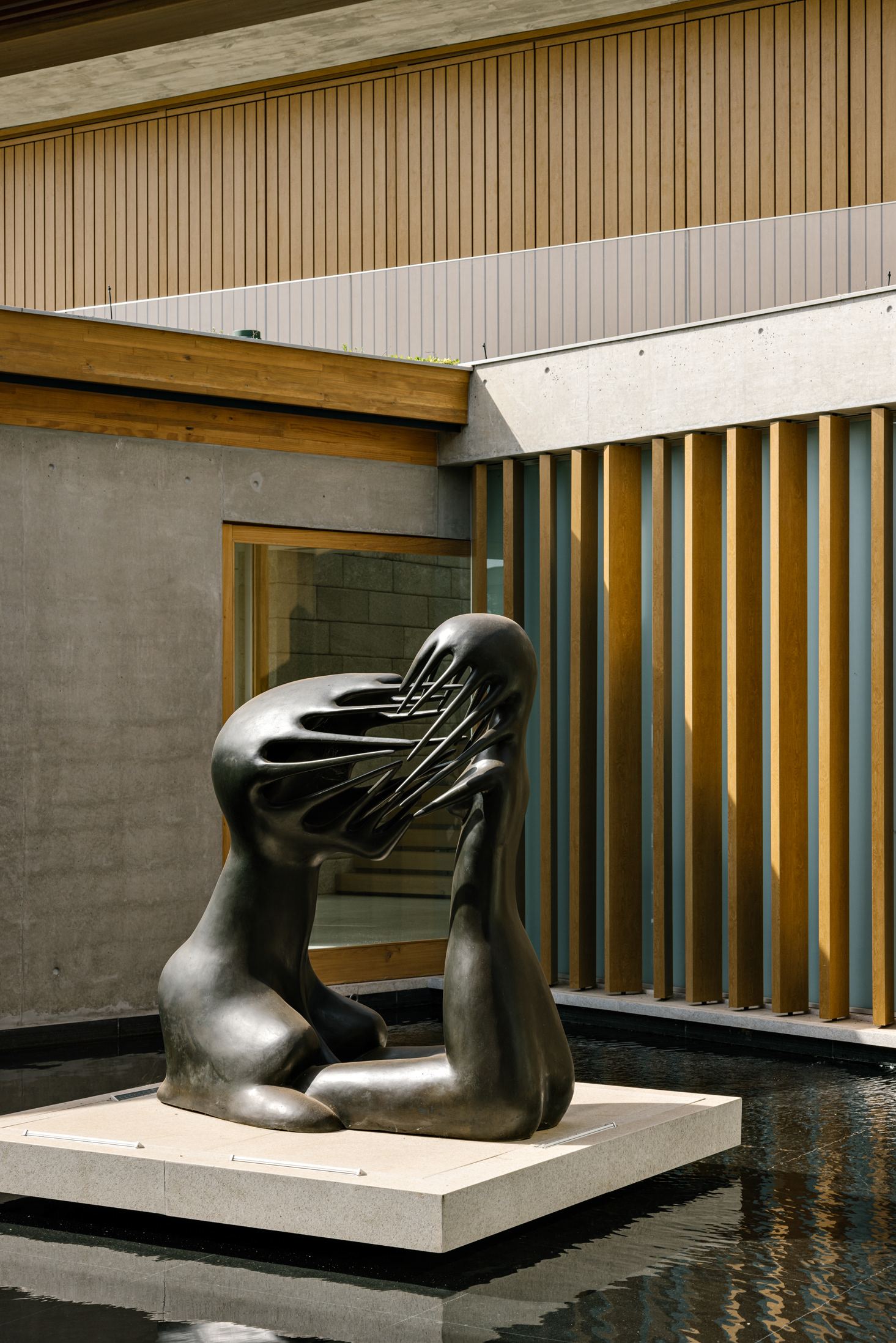 The wood, a third material, is added as a great covering plan. The wood, concrete and stone are gently separated from each other, reinforcing gaps through which one can pass or see between them.