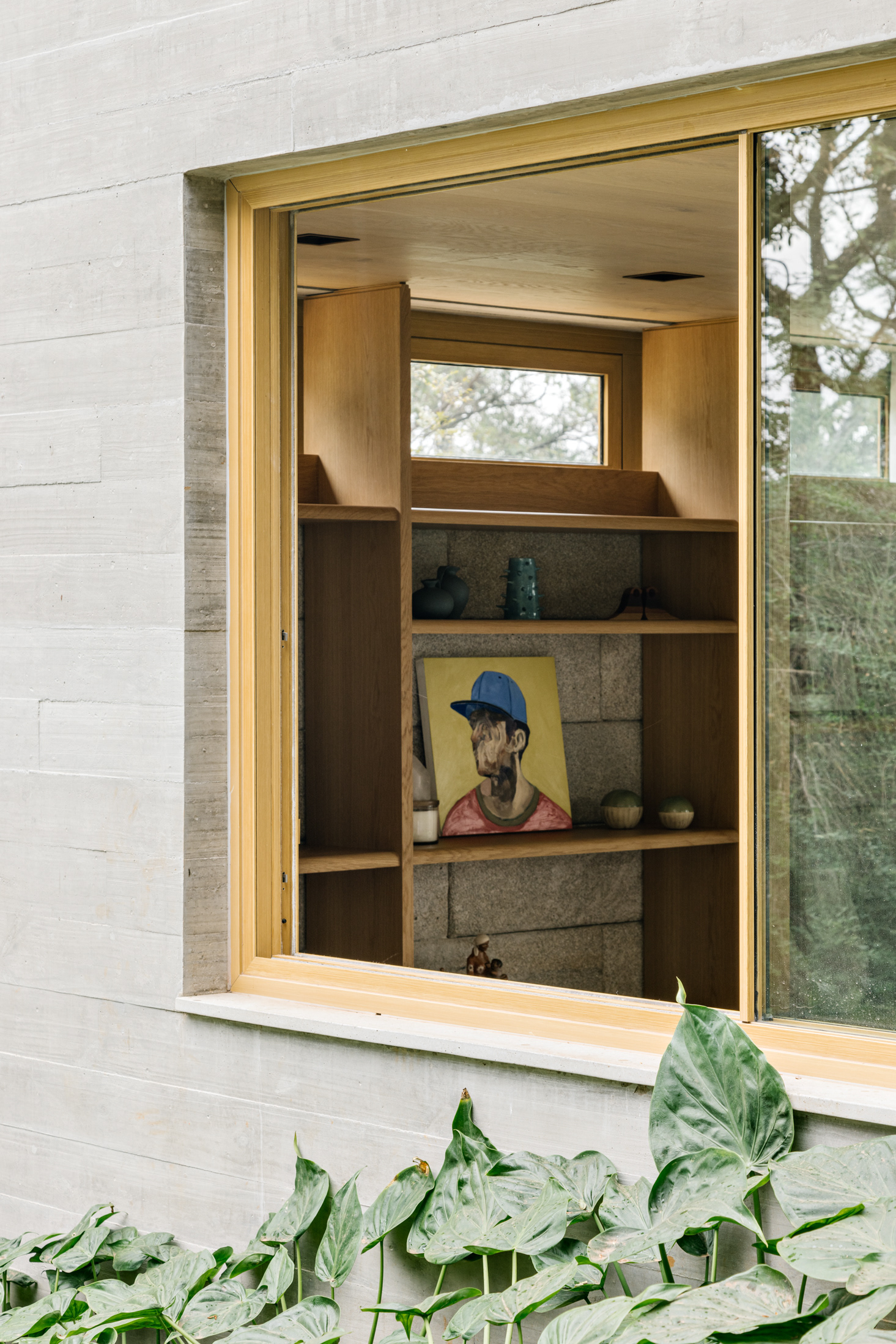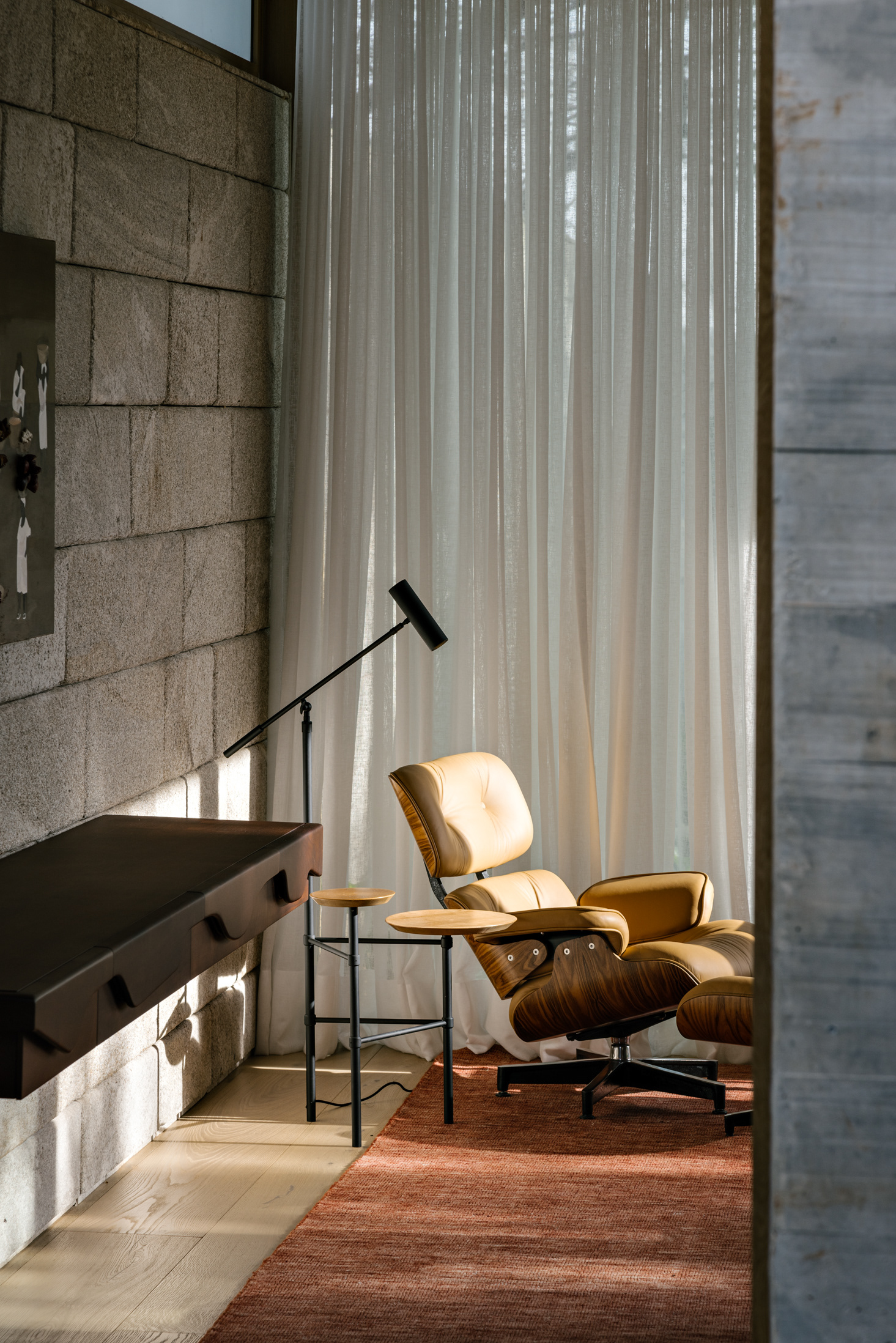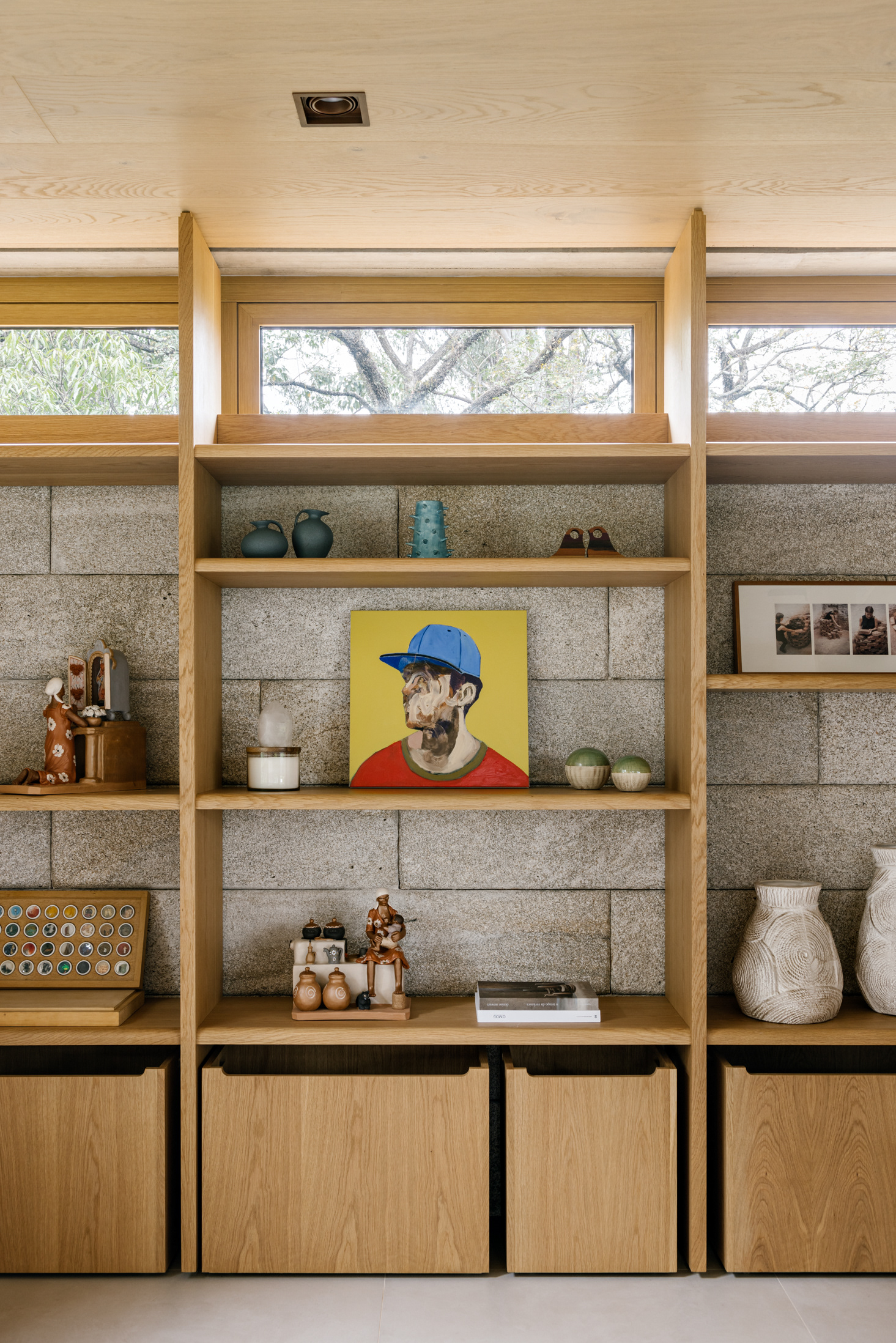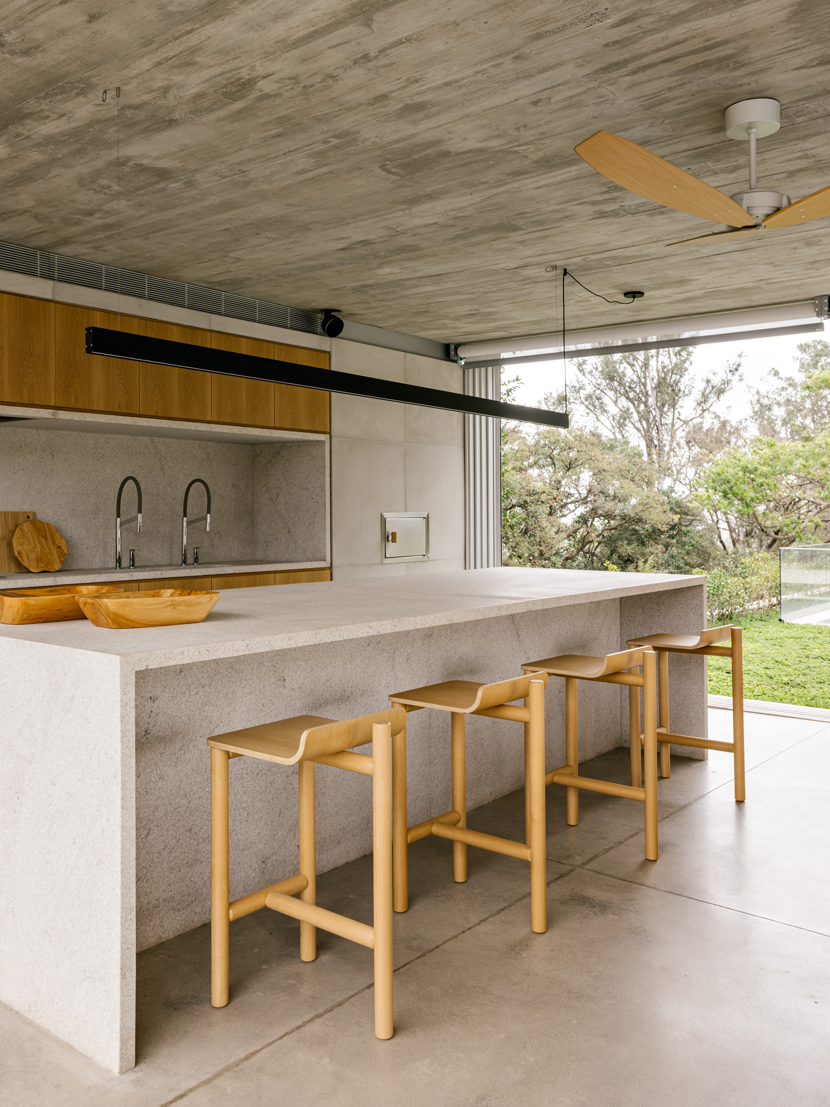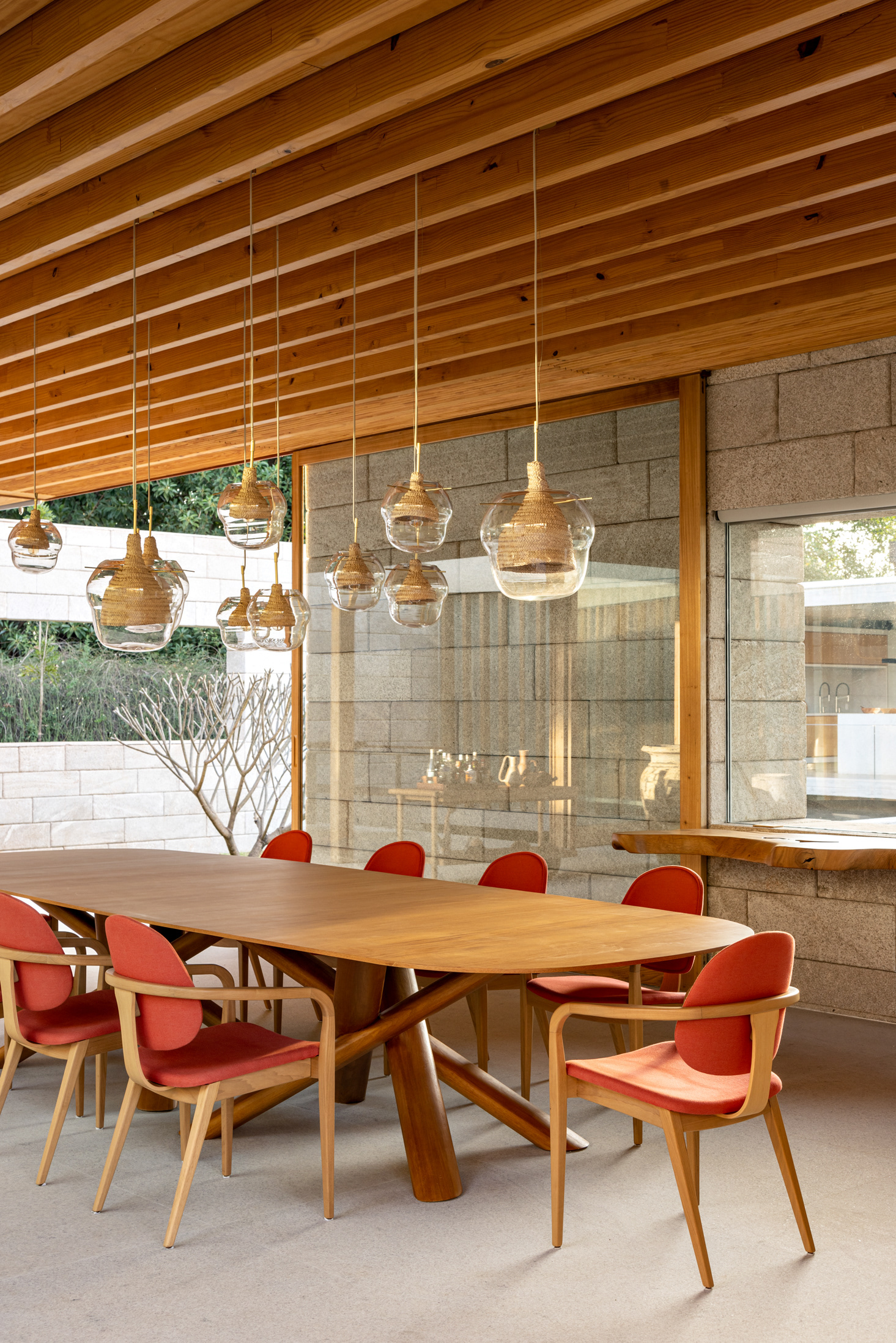 The wood, a third material, is added as a great covering plan. The wood, concrete and stone are gently separated from each other, reinforcing gaps through which one can pass or see between them.