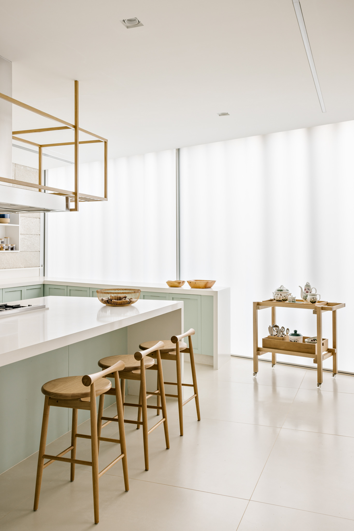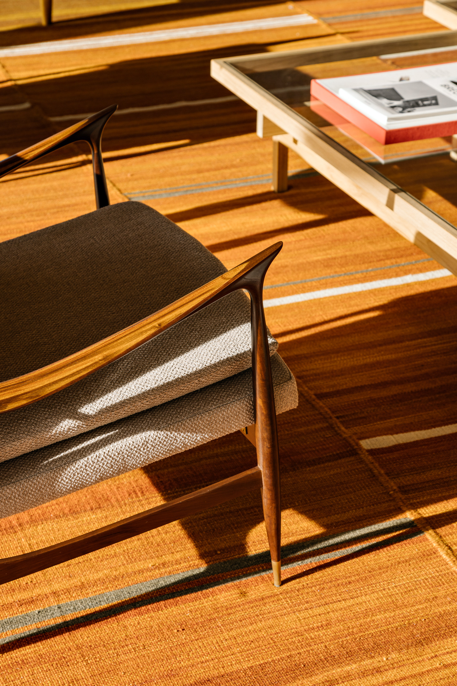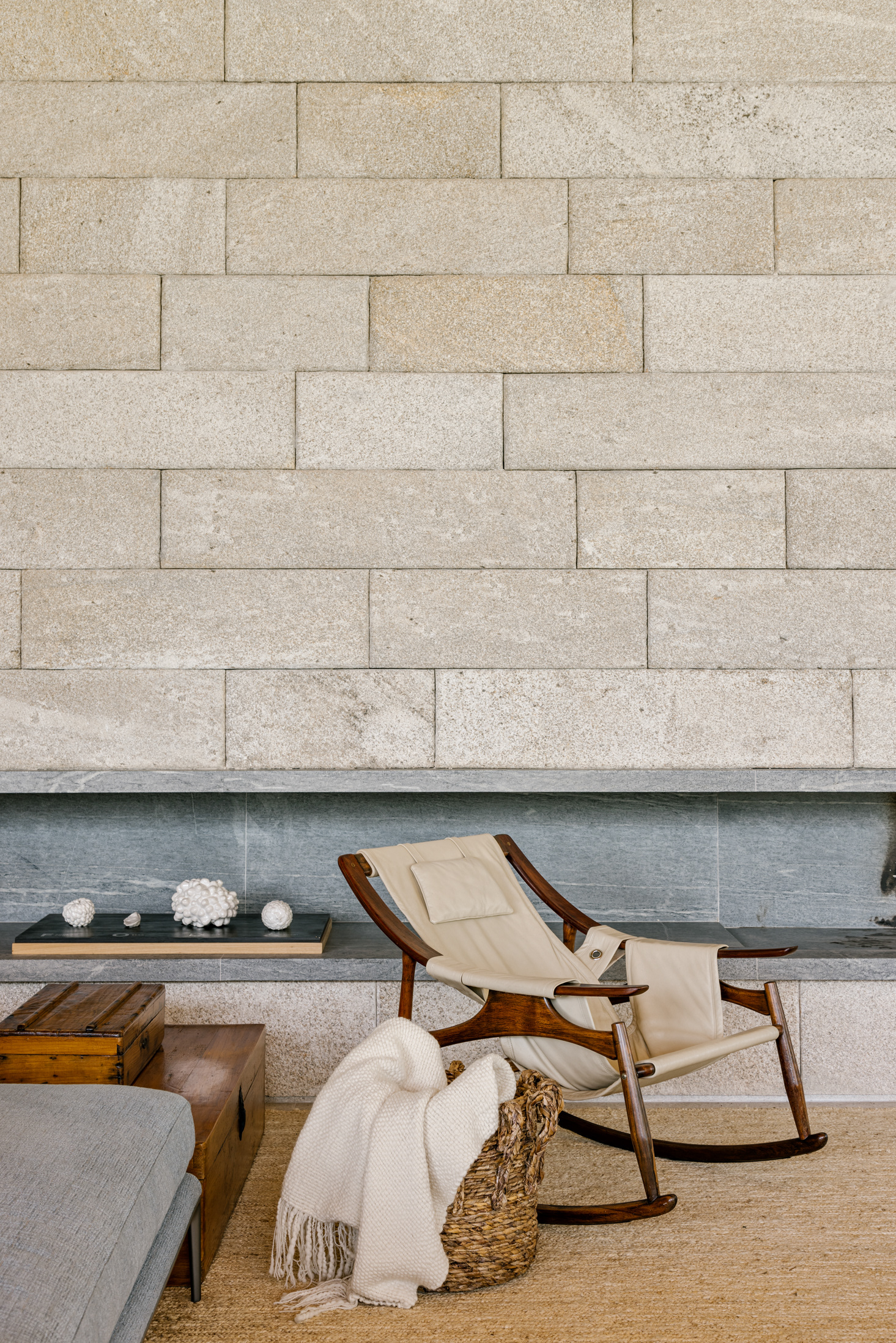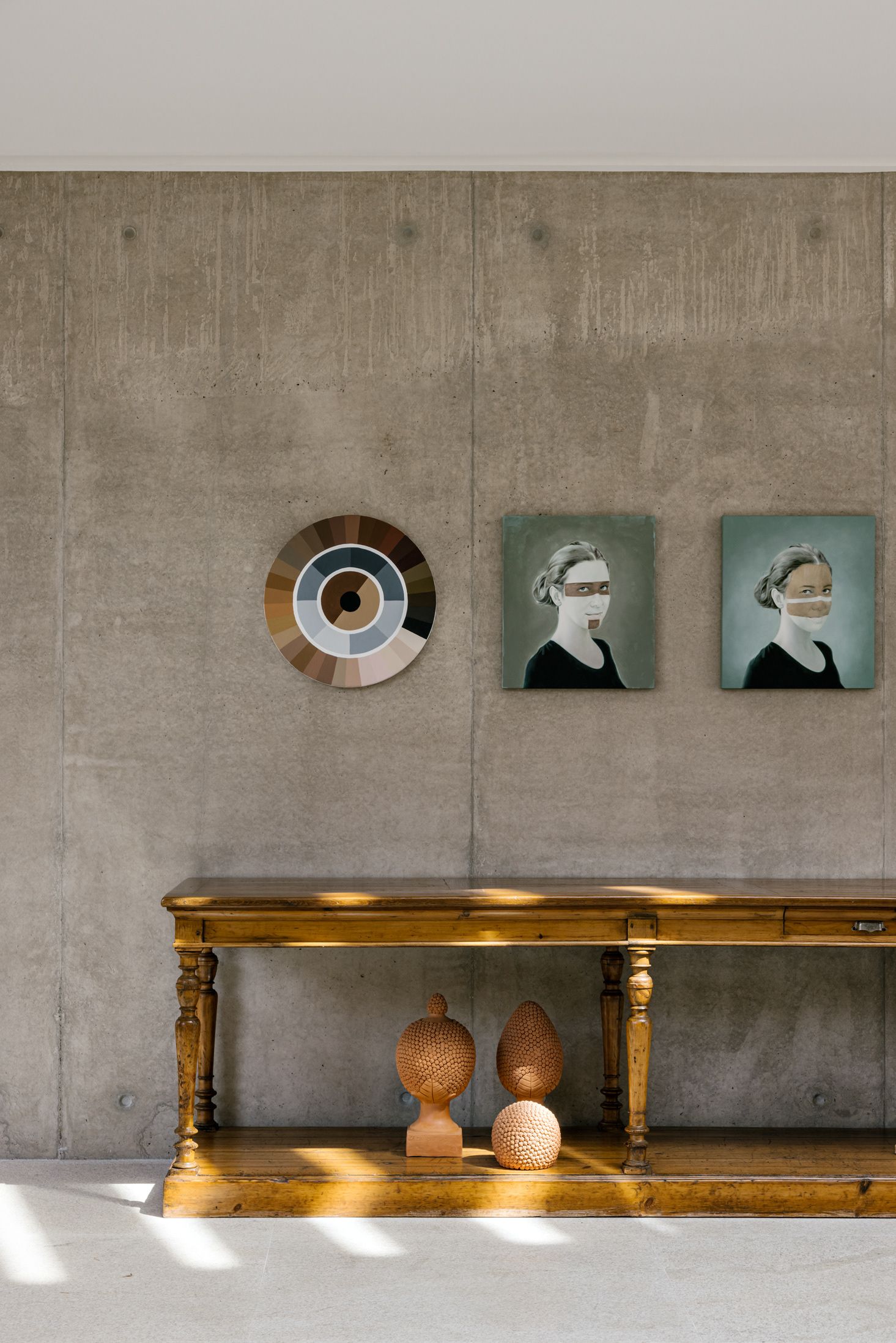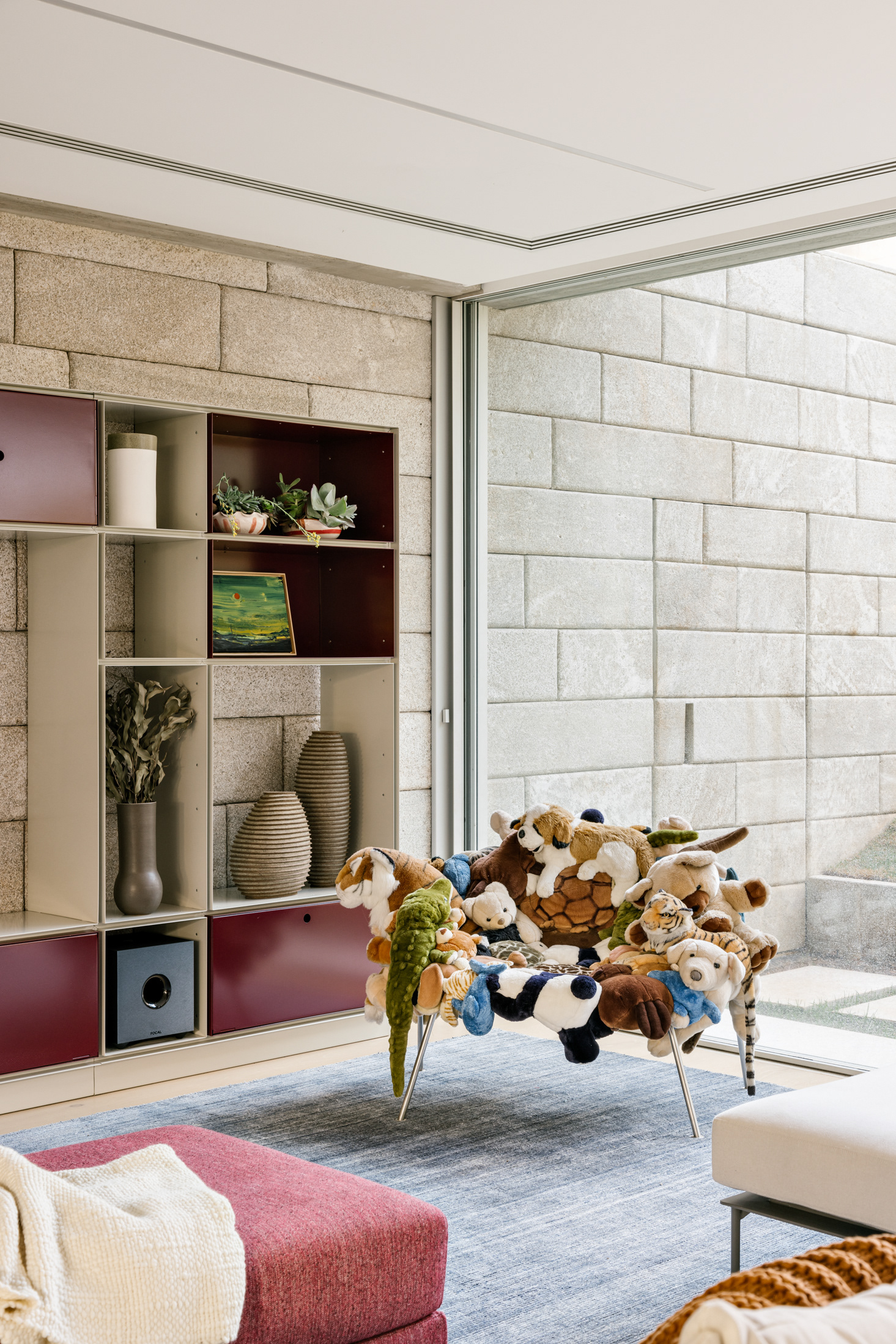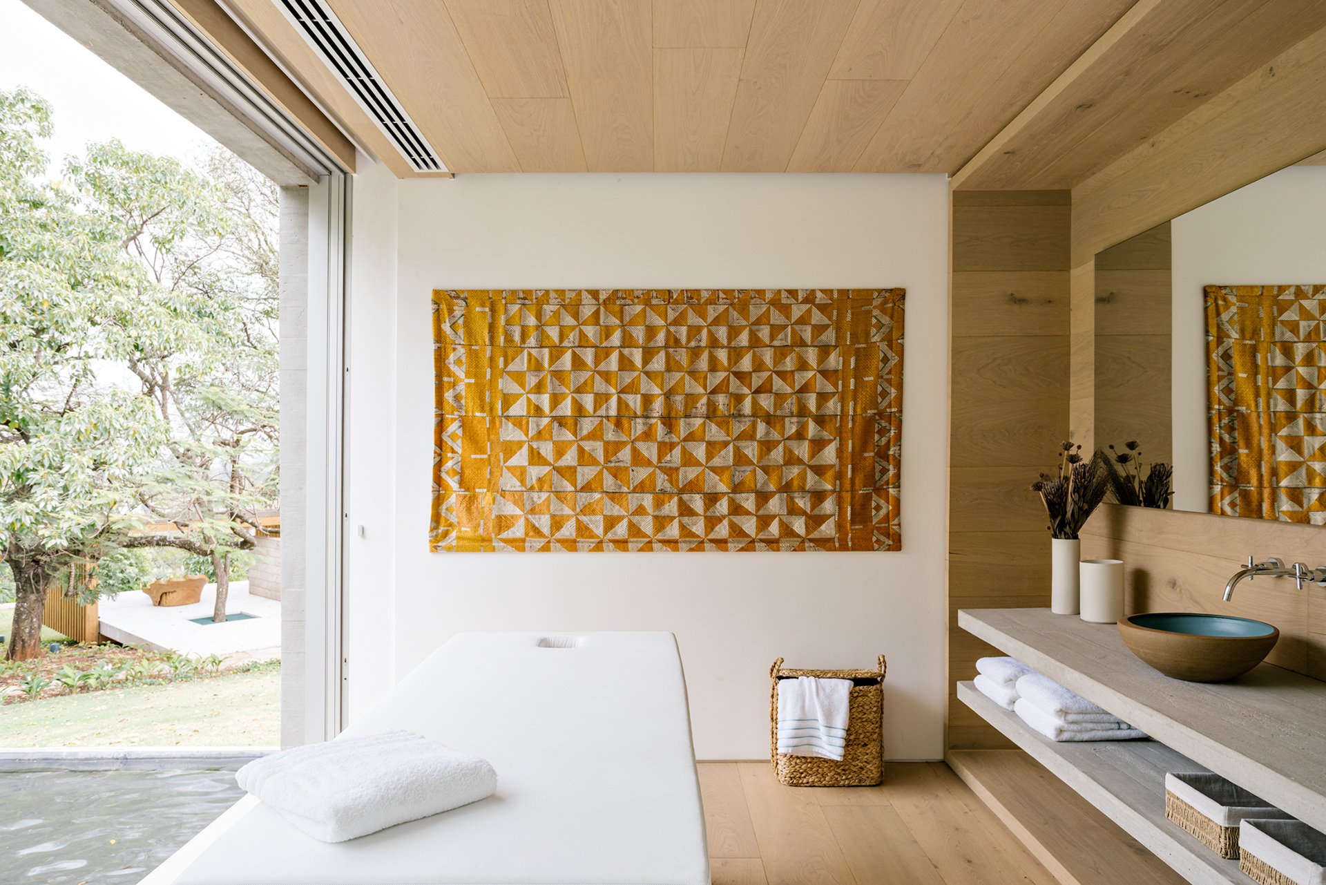 The wood, a third material, is added as a great covering plan. The wood, concrete and stone are gently separated from each other, reinforcing gaps through which one can pass or see between them.