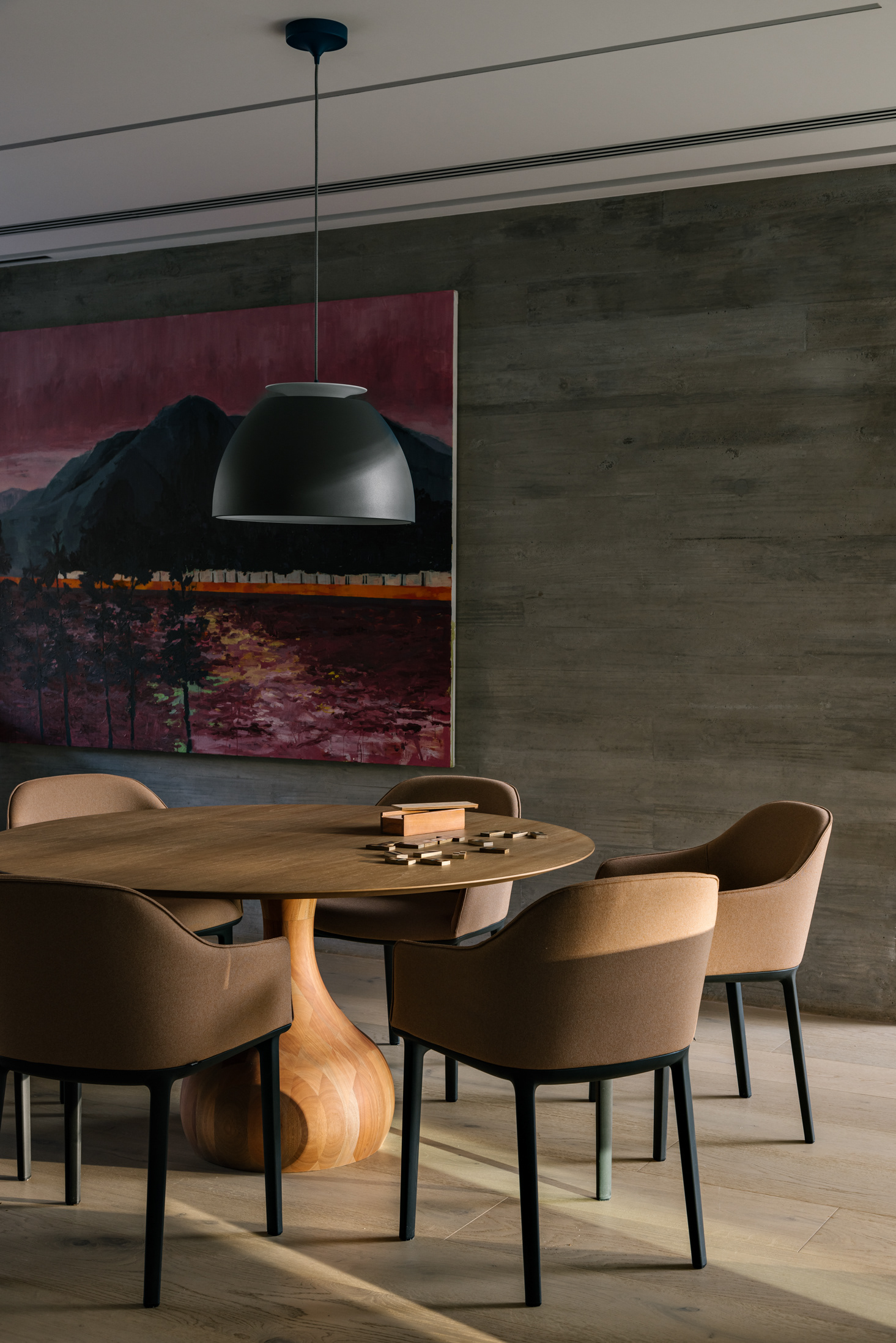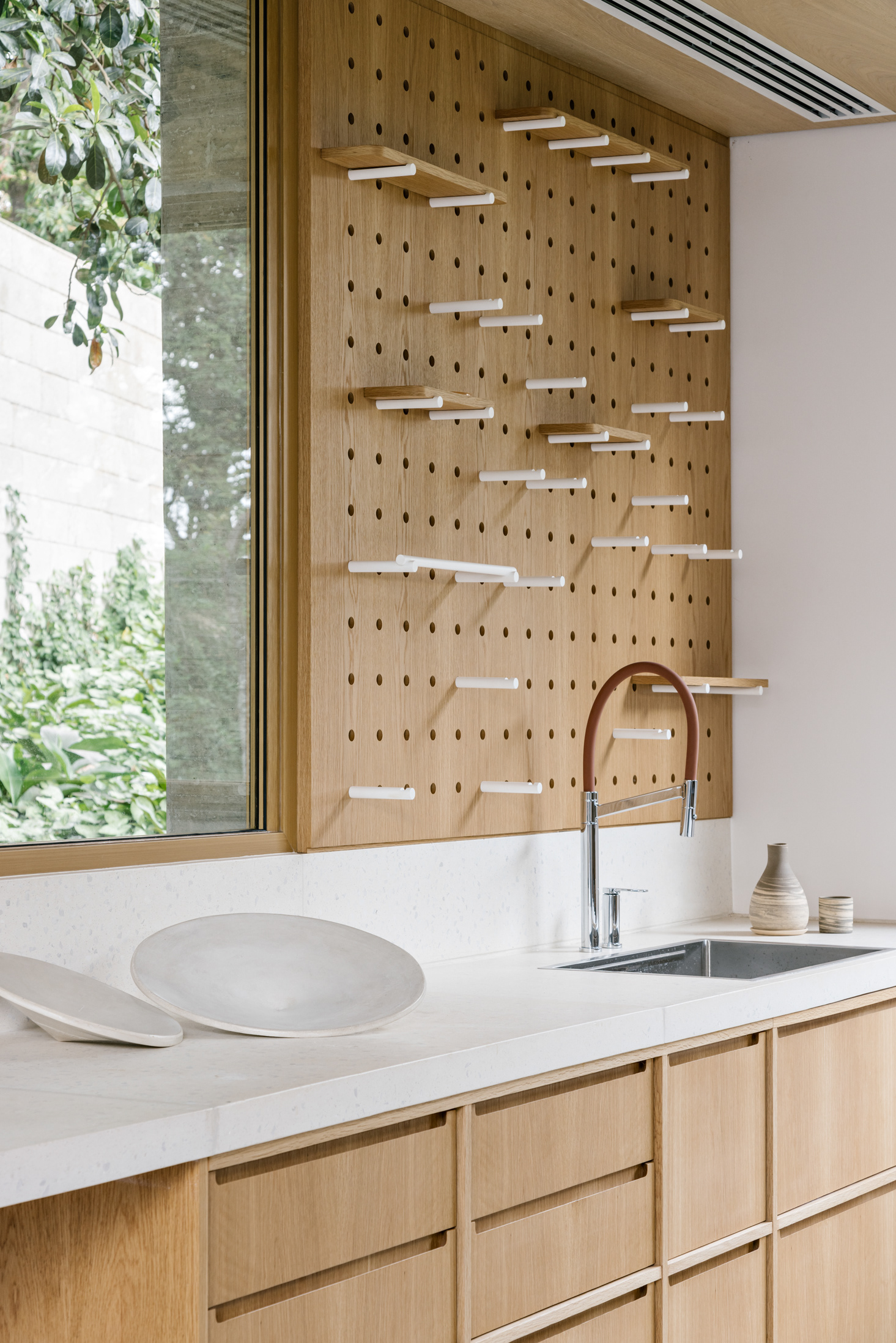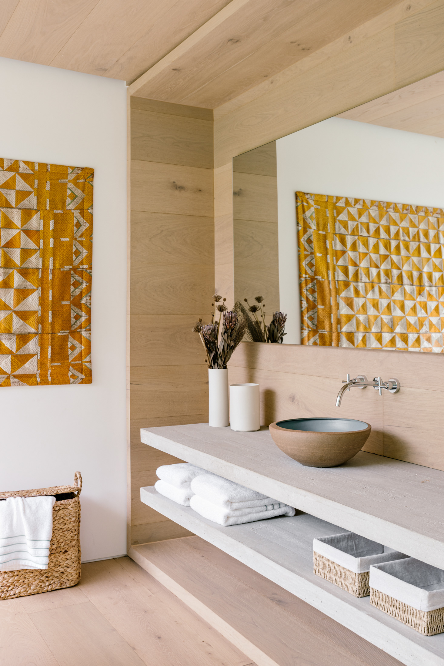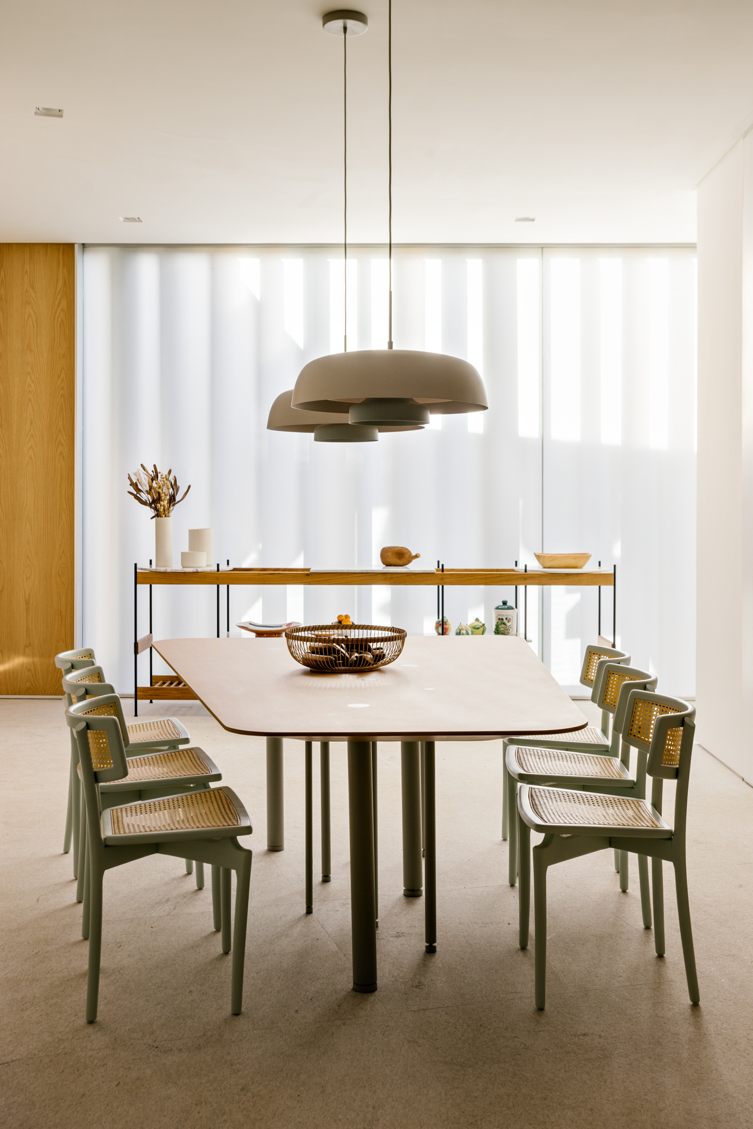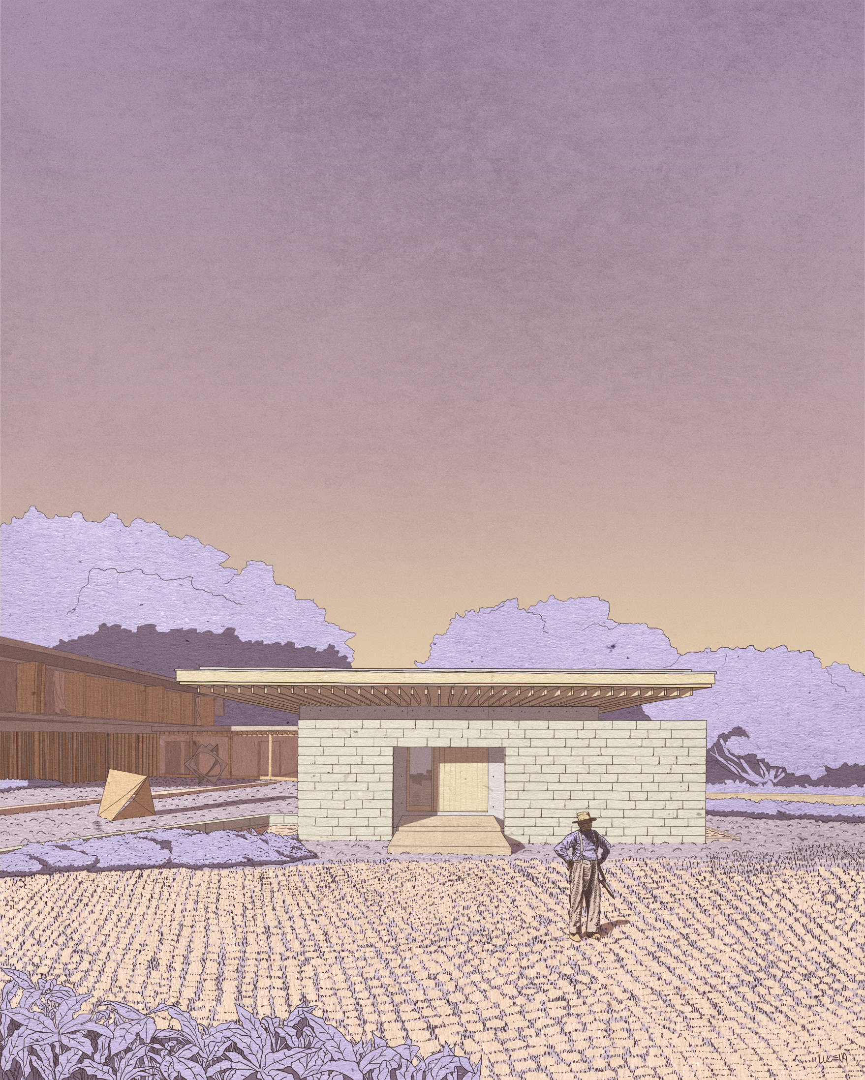 The wood, a third material, is added as a great covering plan. The wood, concrete and stone are gently separated from each other, reinforcing gaps through which one can pass or see between them.