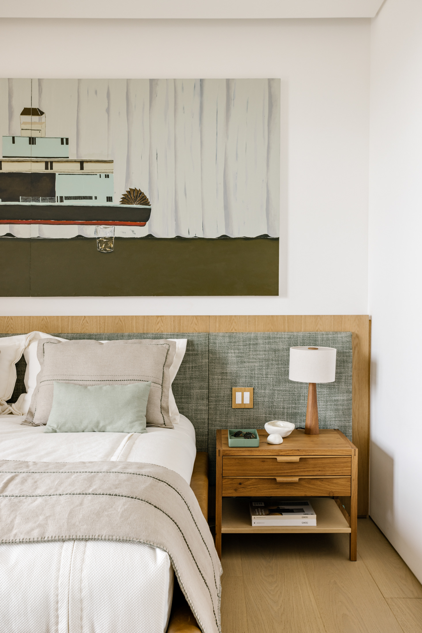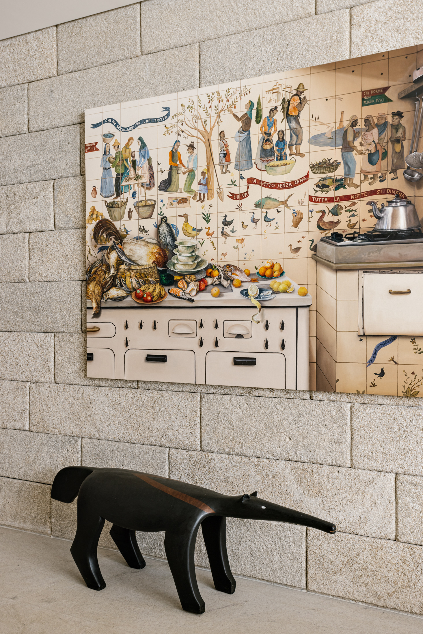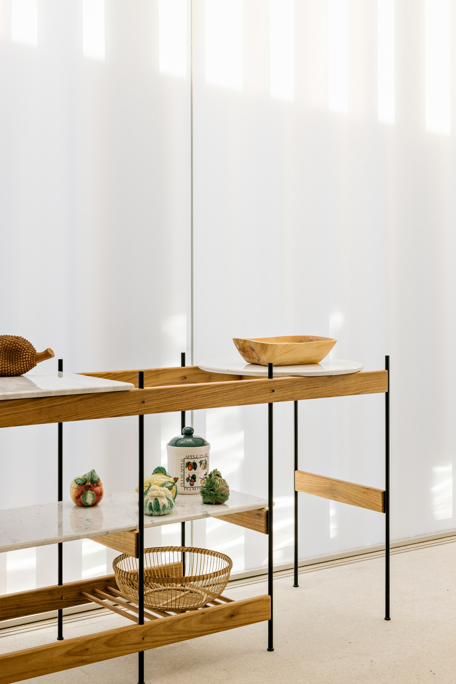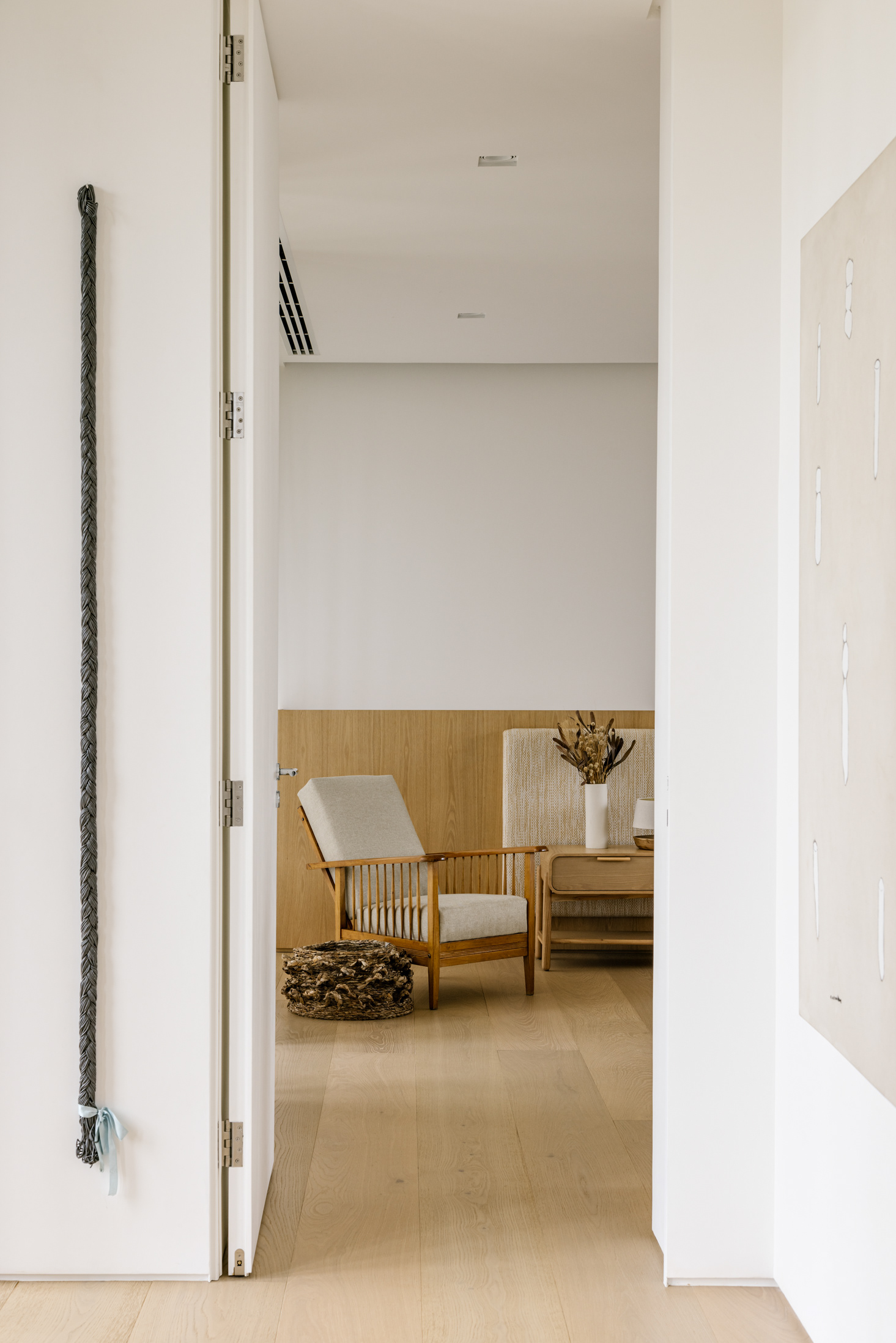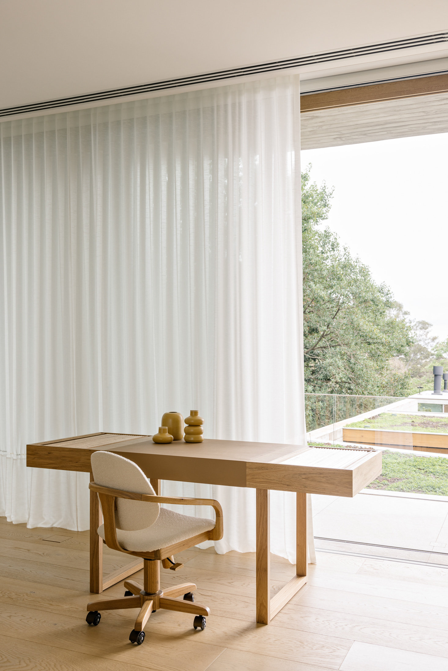 The wood, a third material, is added as a great covering plan. The wood, concrete and stone are gently separated from each other, reinforcing gaps through which one can pass or see between them.
