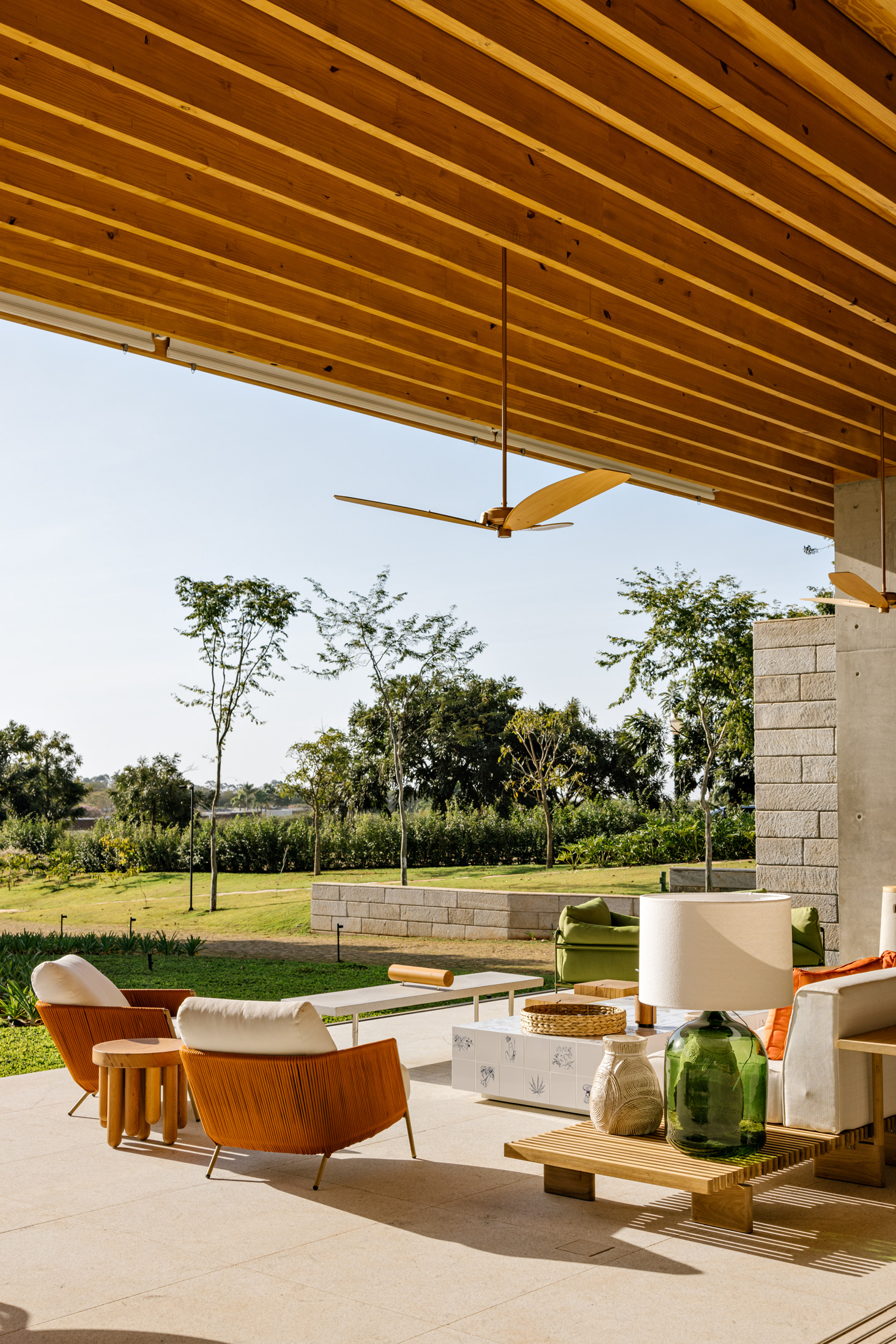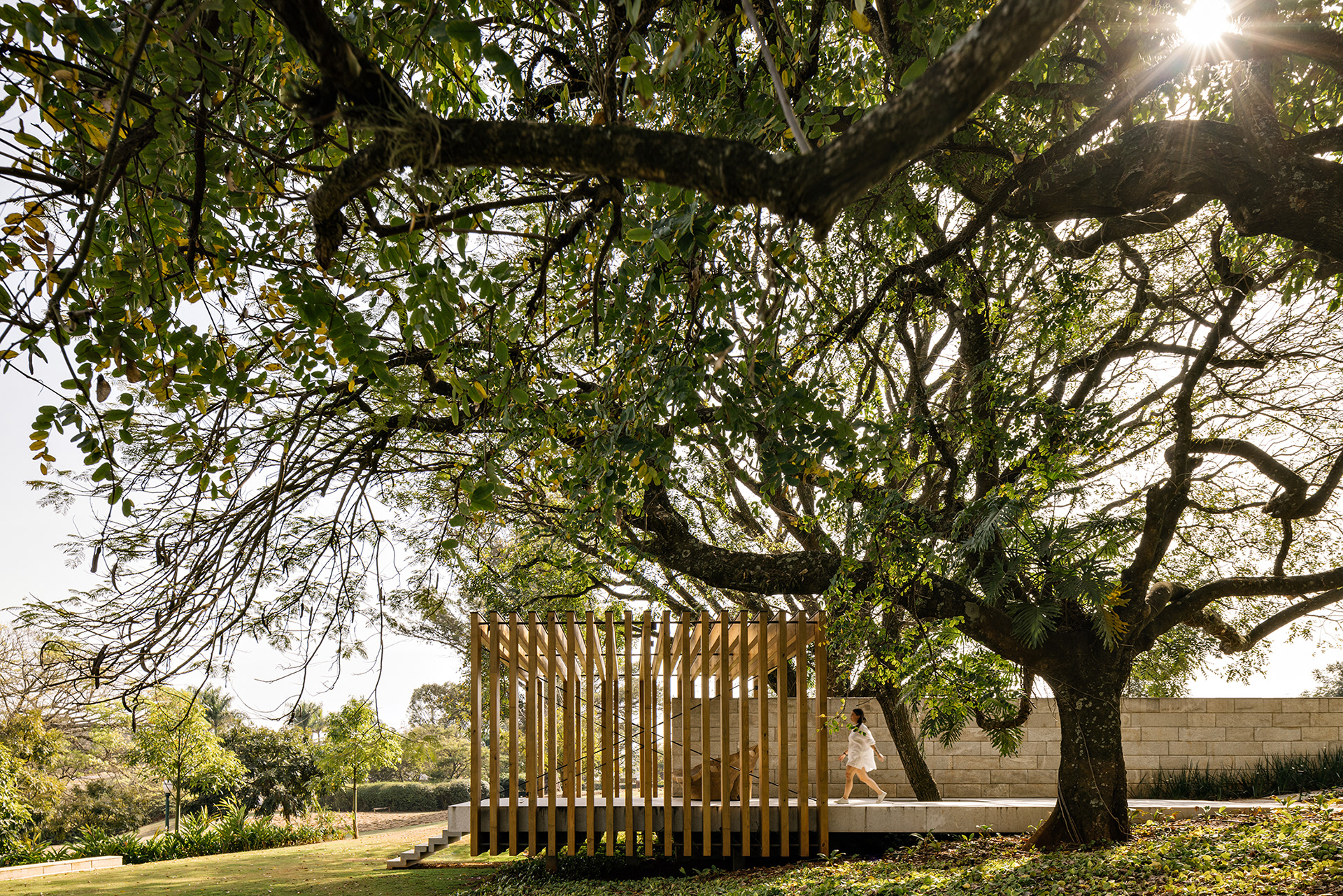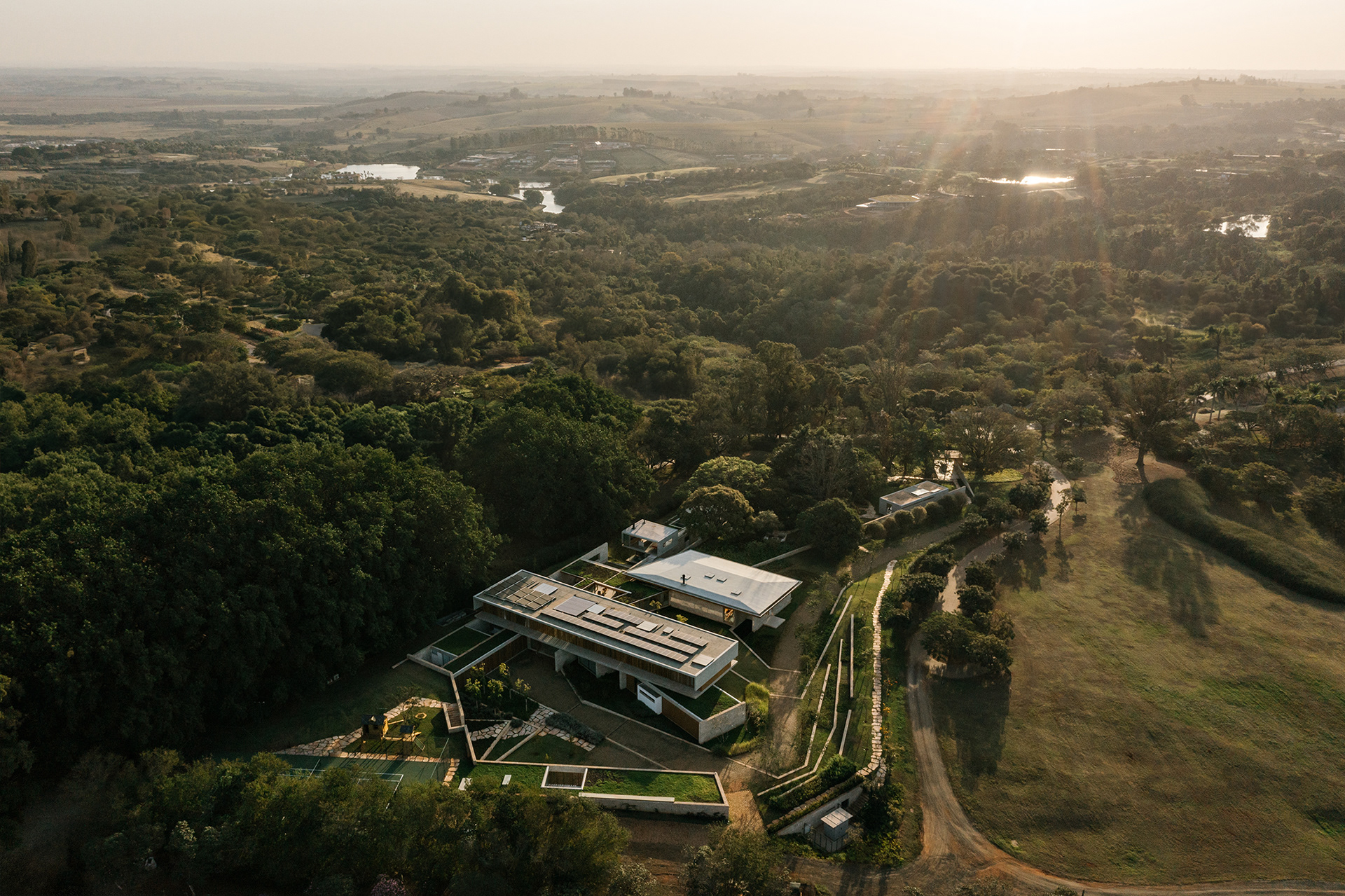 Adult and sculptural trees fill the central portion of this 14,000 m² plot of land in the Fazenda Boa Vista condominium, in the countryside of São Paulo. The drop, which at first glance is delicate, assumes important proportions when we consider the entire extension of the territory.
