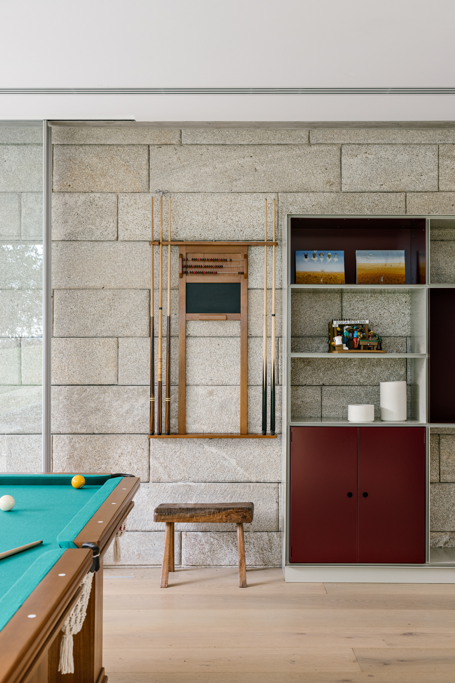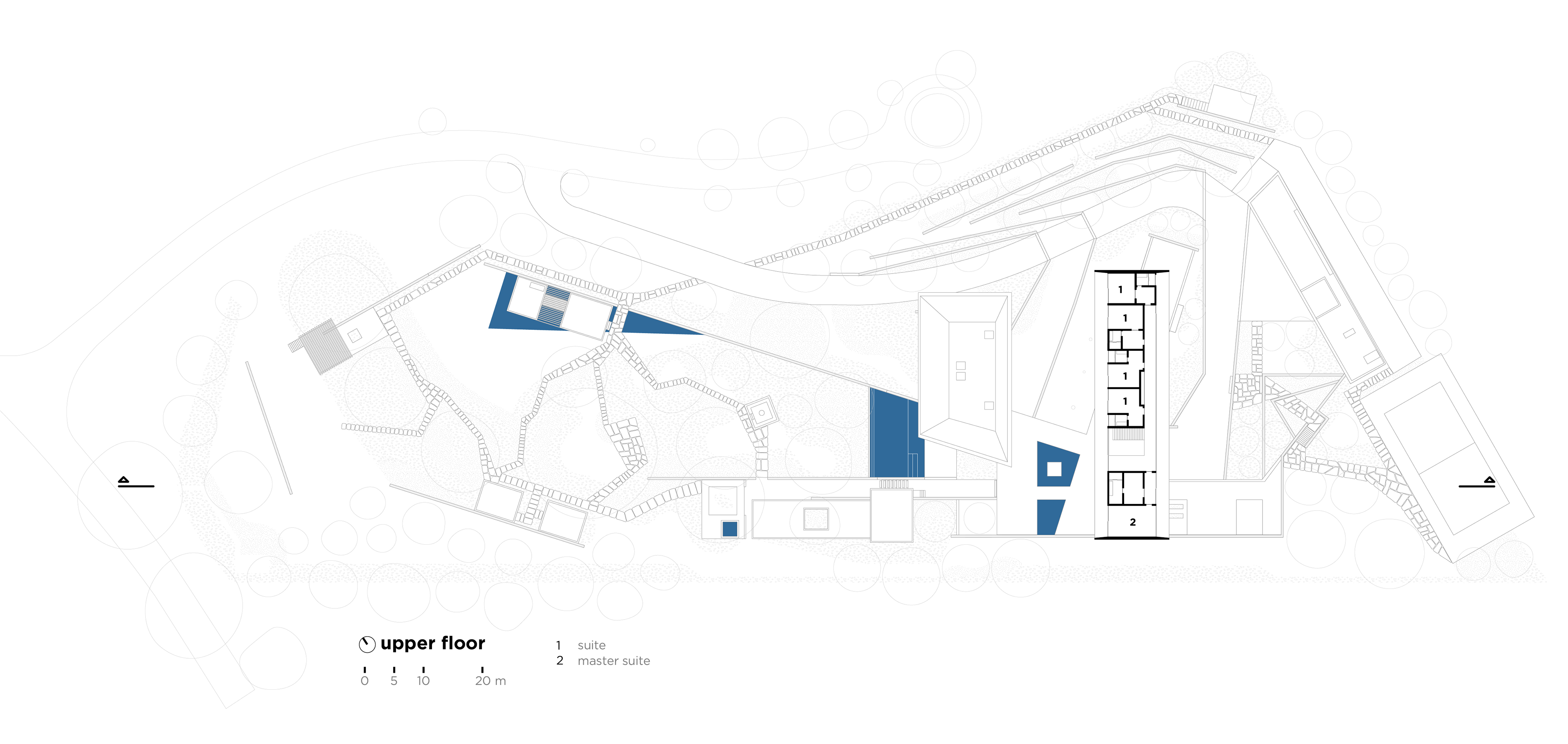 Eventually, besides the small pavilions distributed around the ground, next to the stone gables, a large pavilion perches above the main block, defining the upper floor with rooms. It is orthogonal, guided by the geometry of the gables to the point of forming an expressive overhang in the courtyard between the floor blocks of the house.