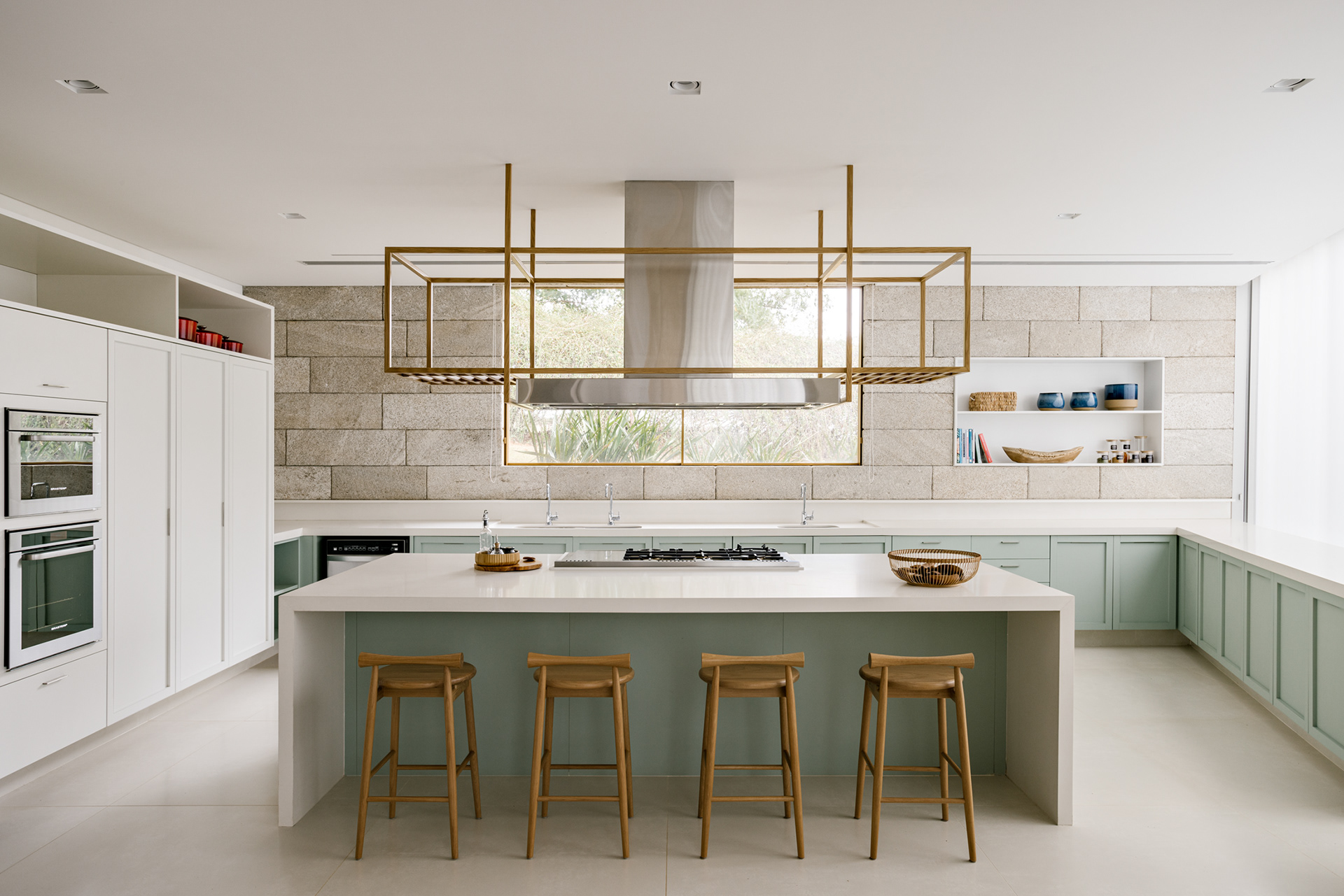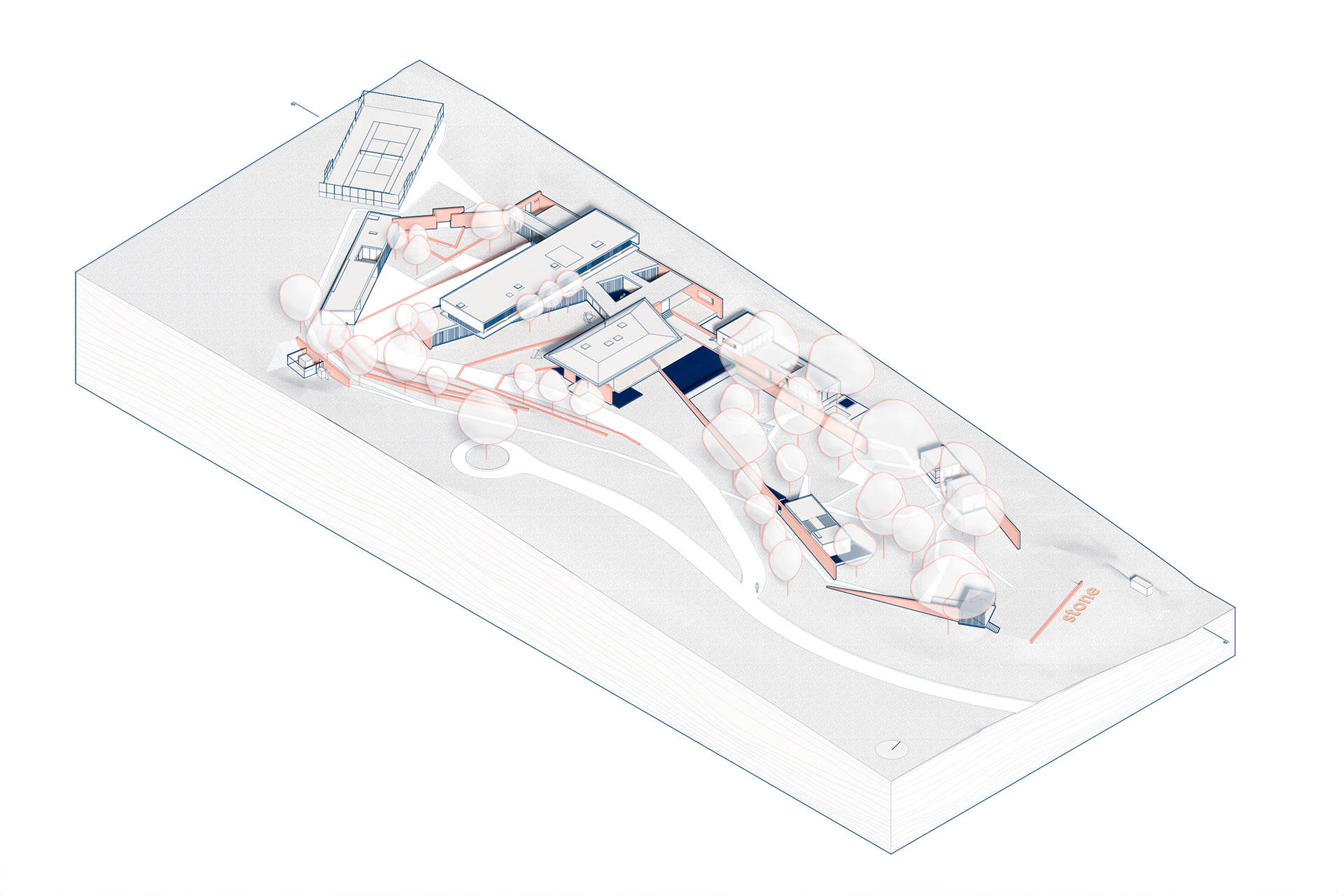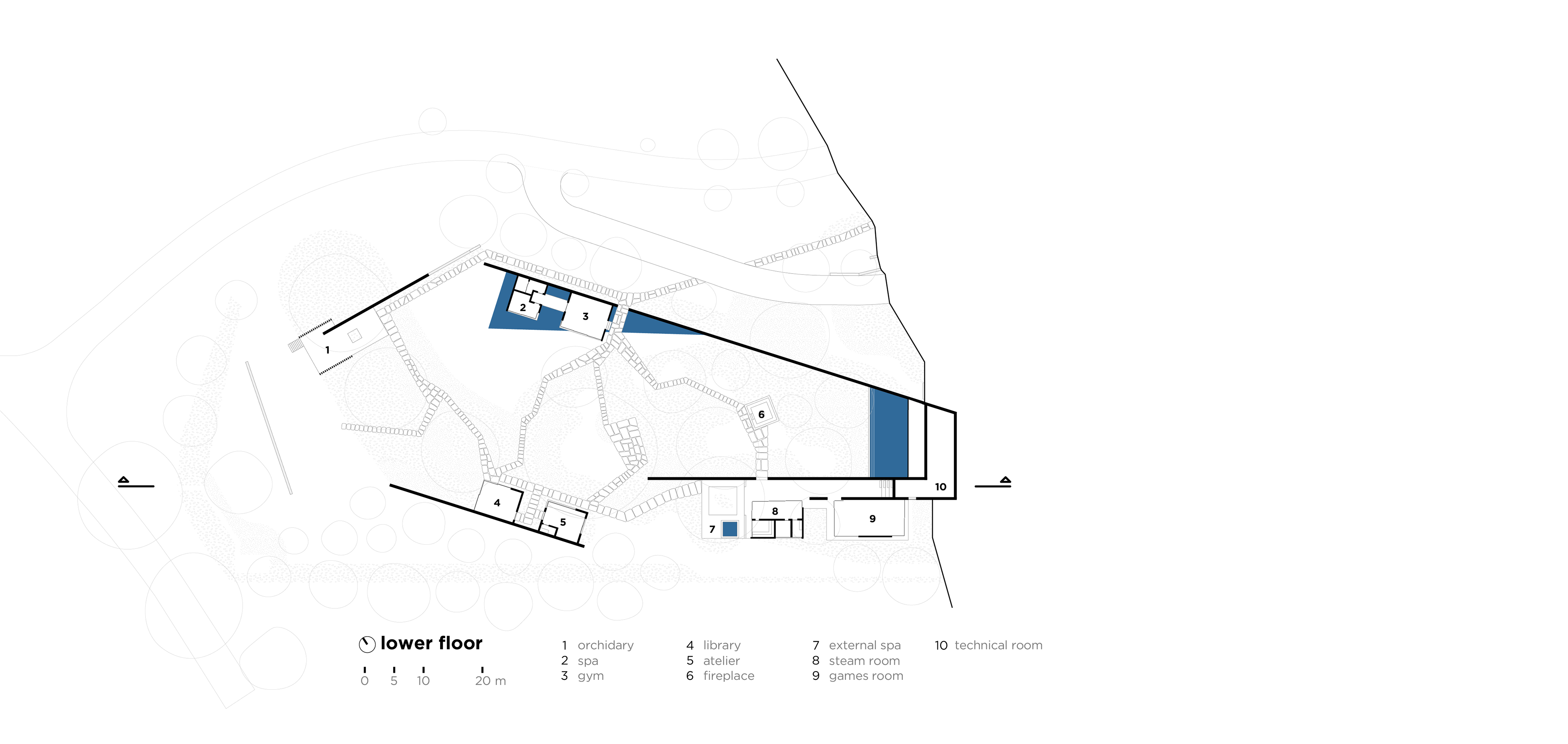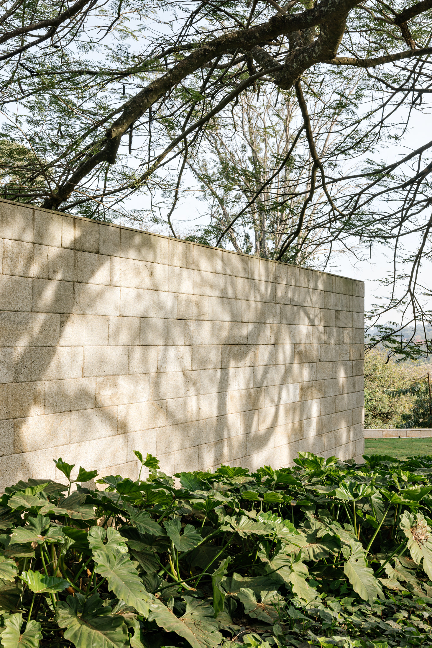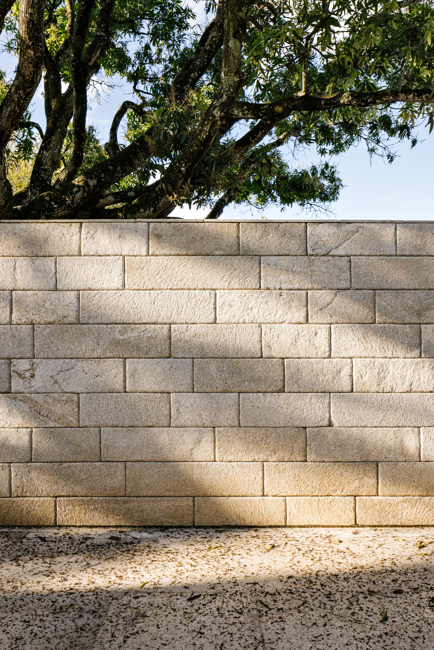 These two elements - the trees and the unevenness - are the basis of the lot occupation strategy. With an extensive program, the house spreads out over the space, embraces the vegetation and creates opportunities for diverse paths and landscapes. Straight lines run through the terrain and delimit a park in its core. The slope adds volume to these lines, which become stone gables that reveal the topography and support pavilions that are attached to them. These same stone gables, as they enter the main body of the house, provide continuity to the landscape design and help organize the program together with other complementary, exposed concrete plans.
