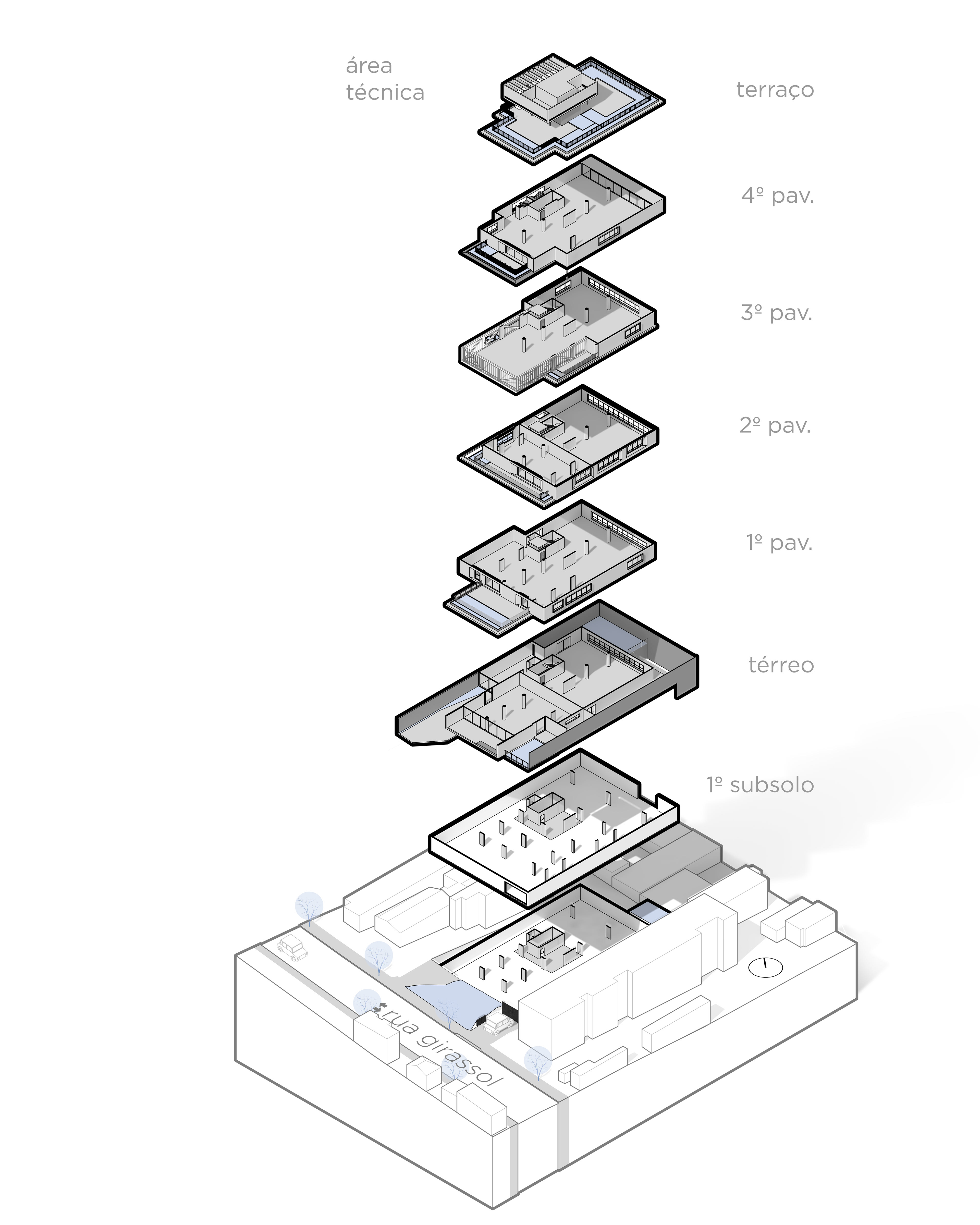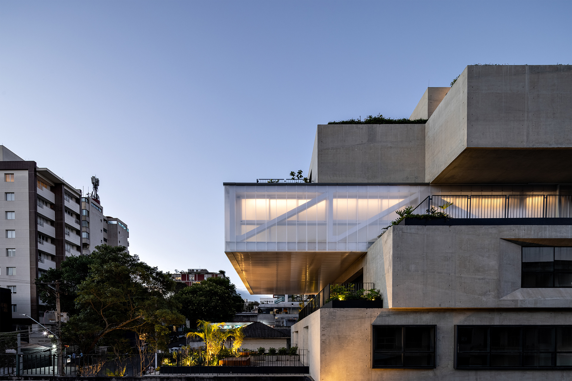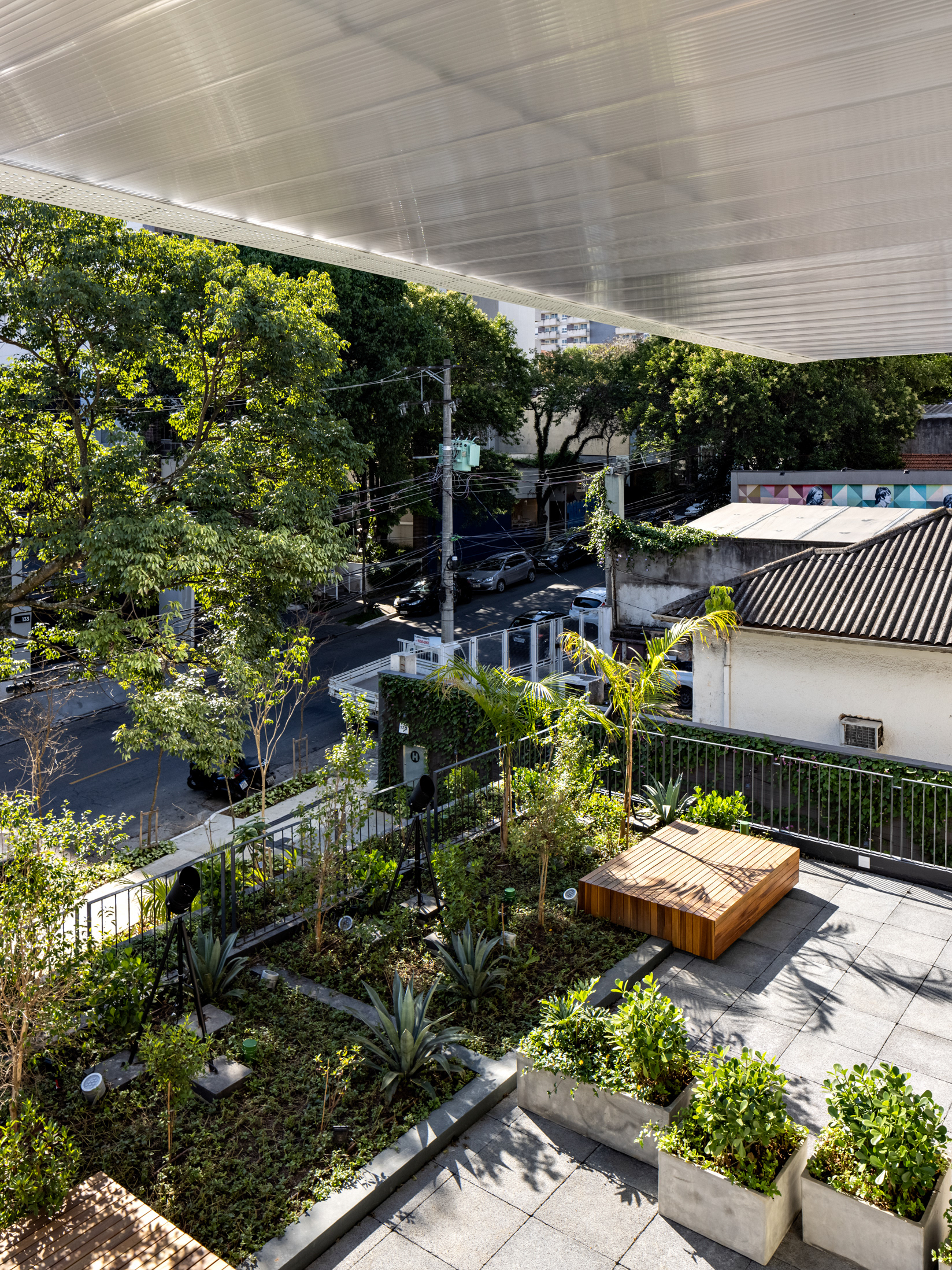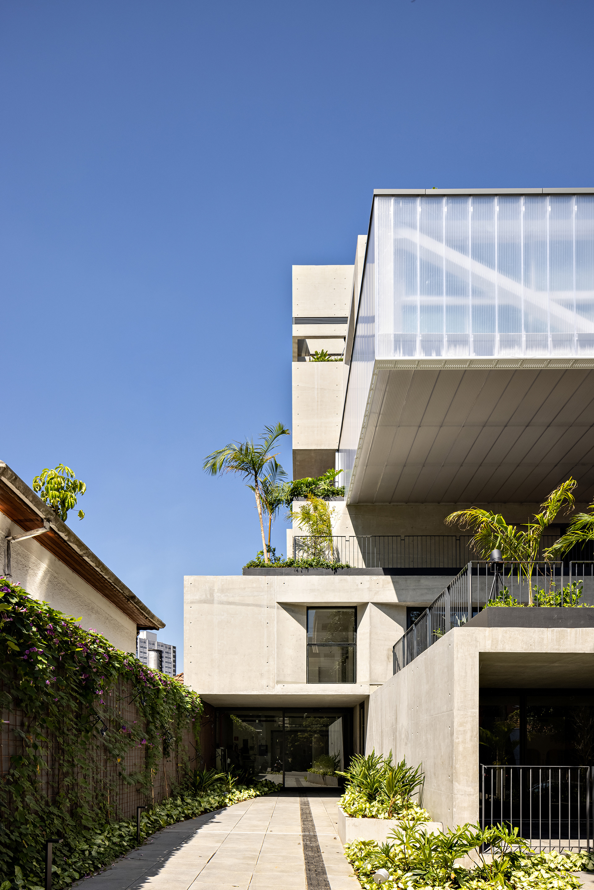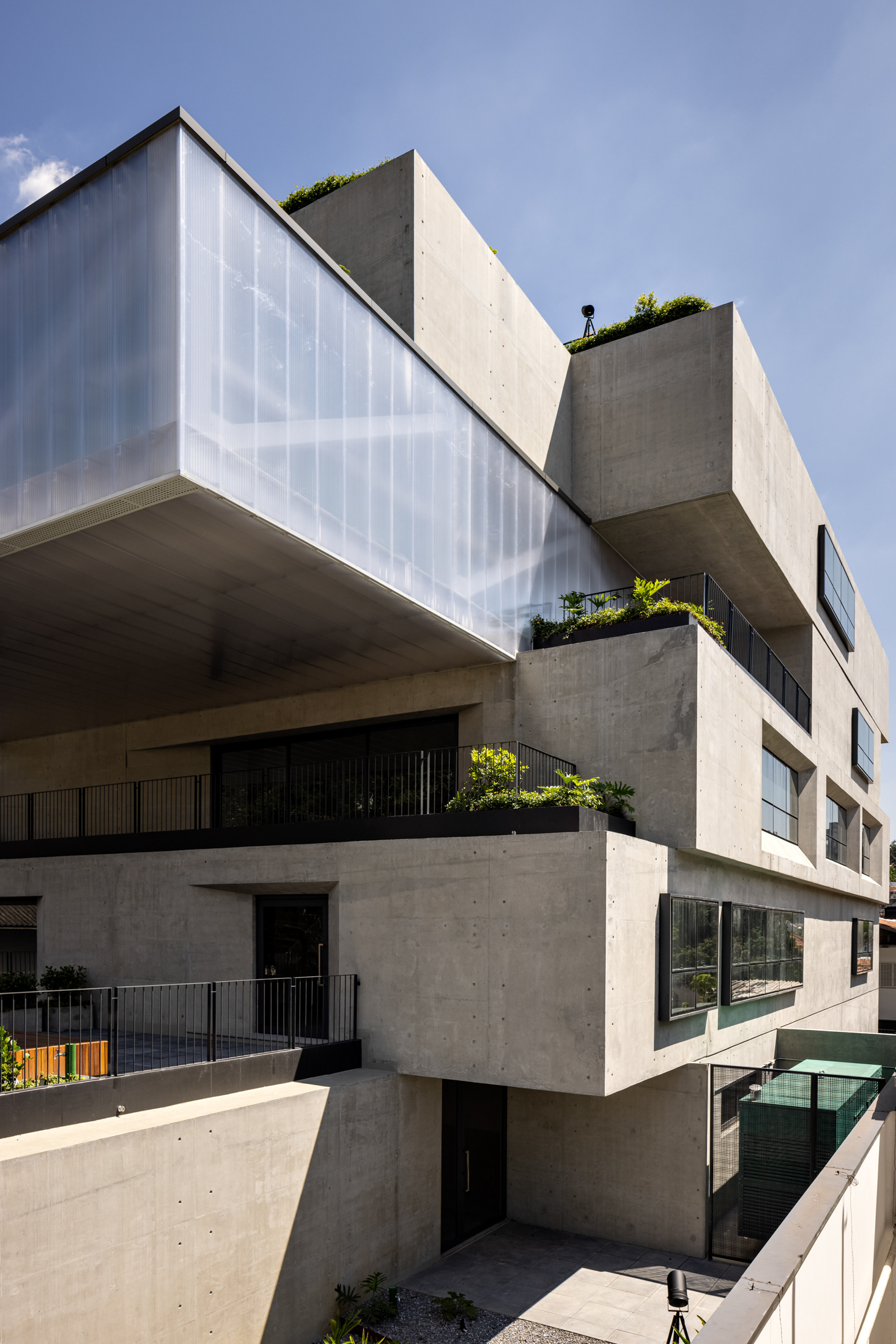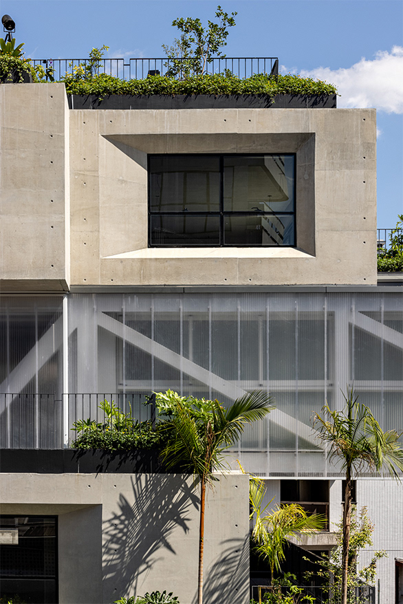 The building’s volumetric design was conceived using rectangles with either single or double heights, projecting outward as balconies, calculated according to regulations floor by floor. Above these balconies, extensive planters with large trees, designed by Rodrigo Oliveira, aim to integrate landscaping at various levels of the building while enhancing the greenery on Cardeal Arcoverde, which is quite sparse. The same balcony volumes, nearly zeroed out, are combined with window panels that either open like casement windows or slide open, contributing to the building’s overall appearance. On the ground floor, wide setbacks create necessary pedestrian space at this important corner, which currently suffers from minimal sidewalks.