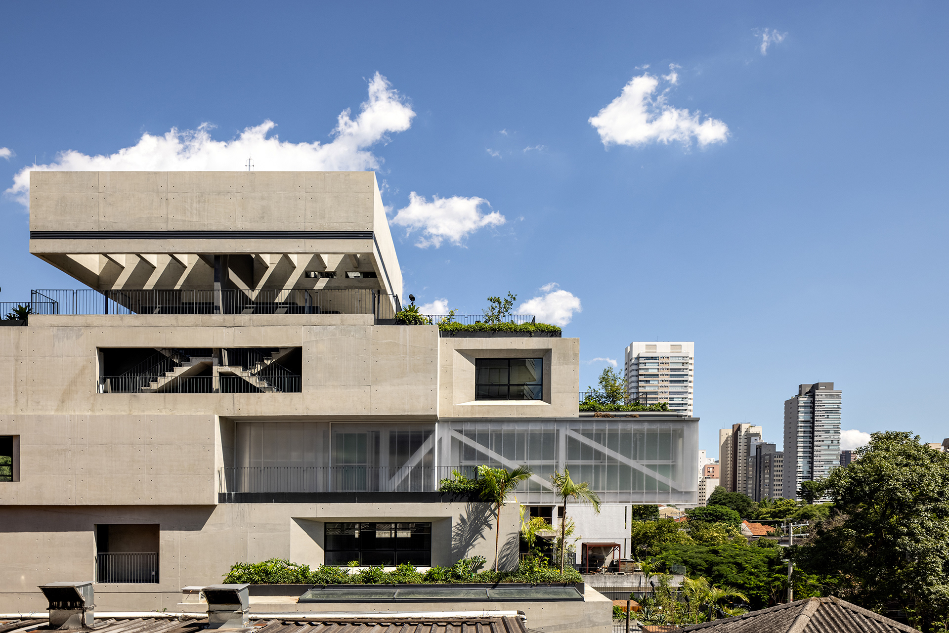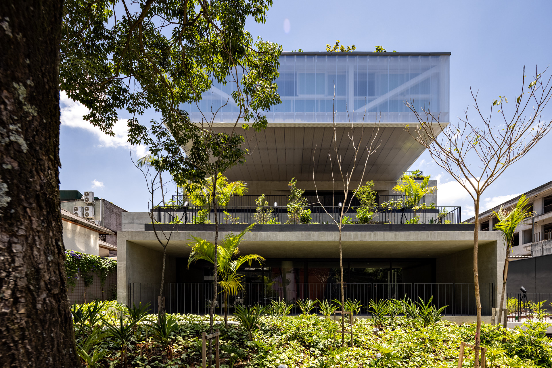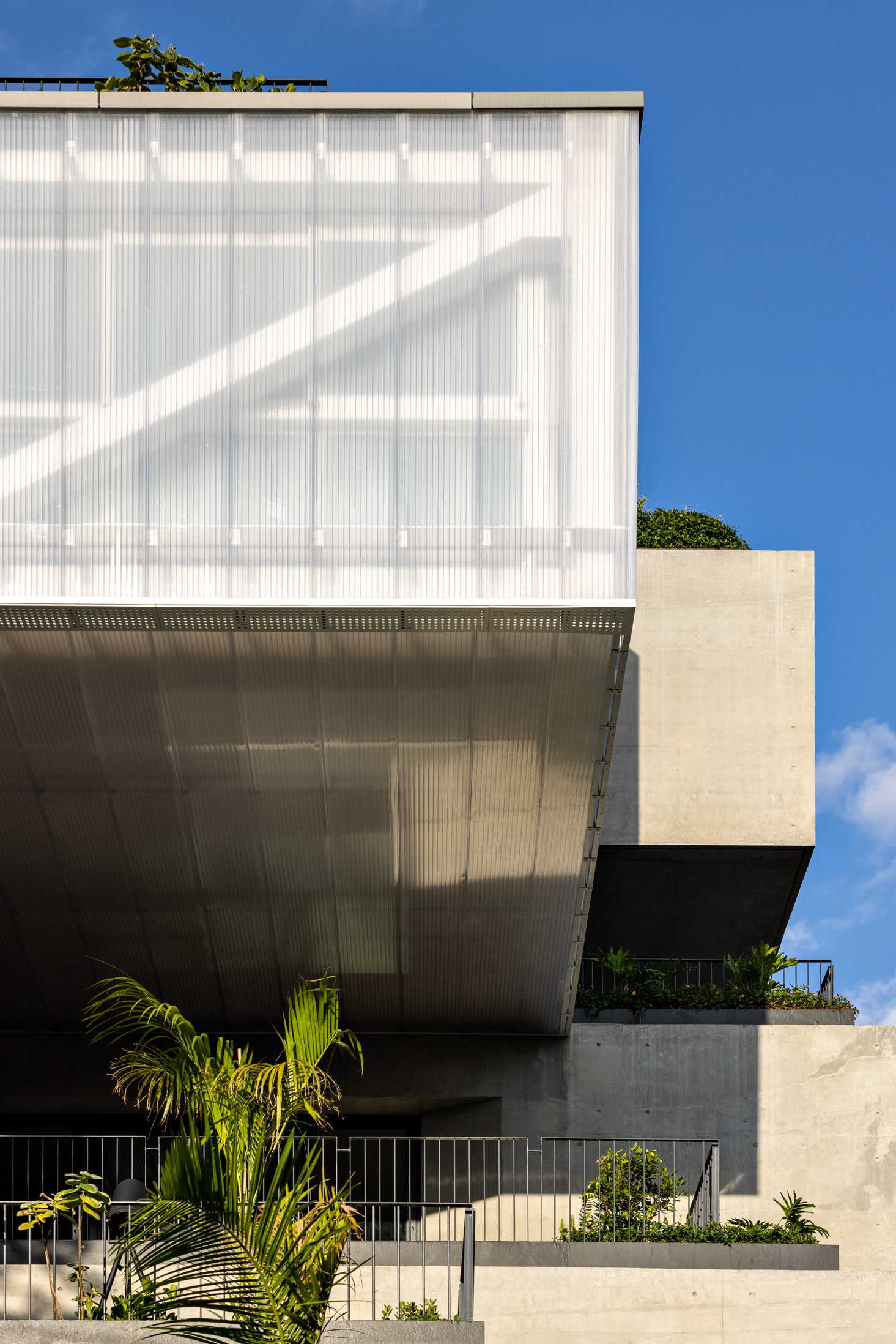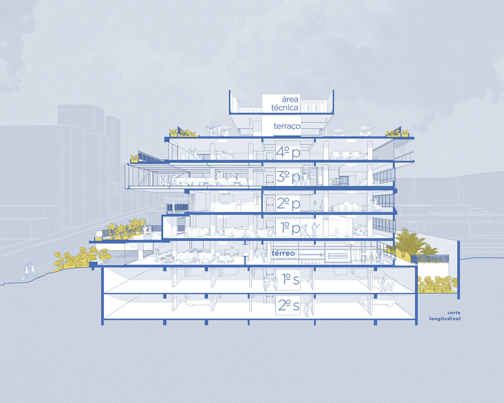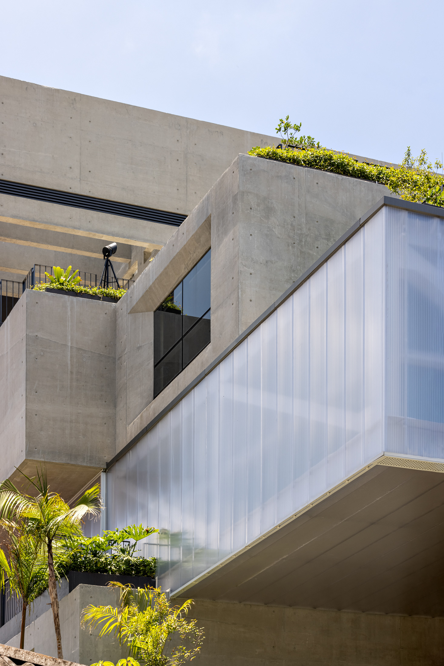 The building’s volumetric design was conceived using rectangles with either single or double heights, projecting outward as balconies, calculated according to regulations floor by floor. Above these balconies, extensive planters with large trees, designed by Rodrigo Oliveira, aim to integrate landscaping at various levels of the building while enhancing the greenery on Cardeal Arcoverde, which is quite sparse. The same balcony volumes, nearly zeroed out, are combined with window panels that either open like casement windows or slide open, contributing to the building’s overall appearance. On the ground floor, wide setbacks create necessary pedestrian space at this important corner, which currently suffers from minimal sidewalks.